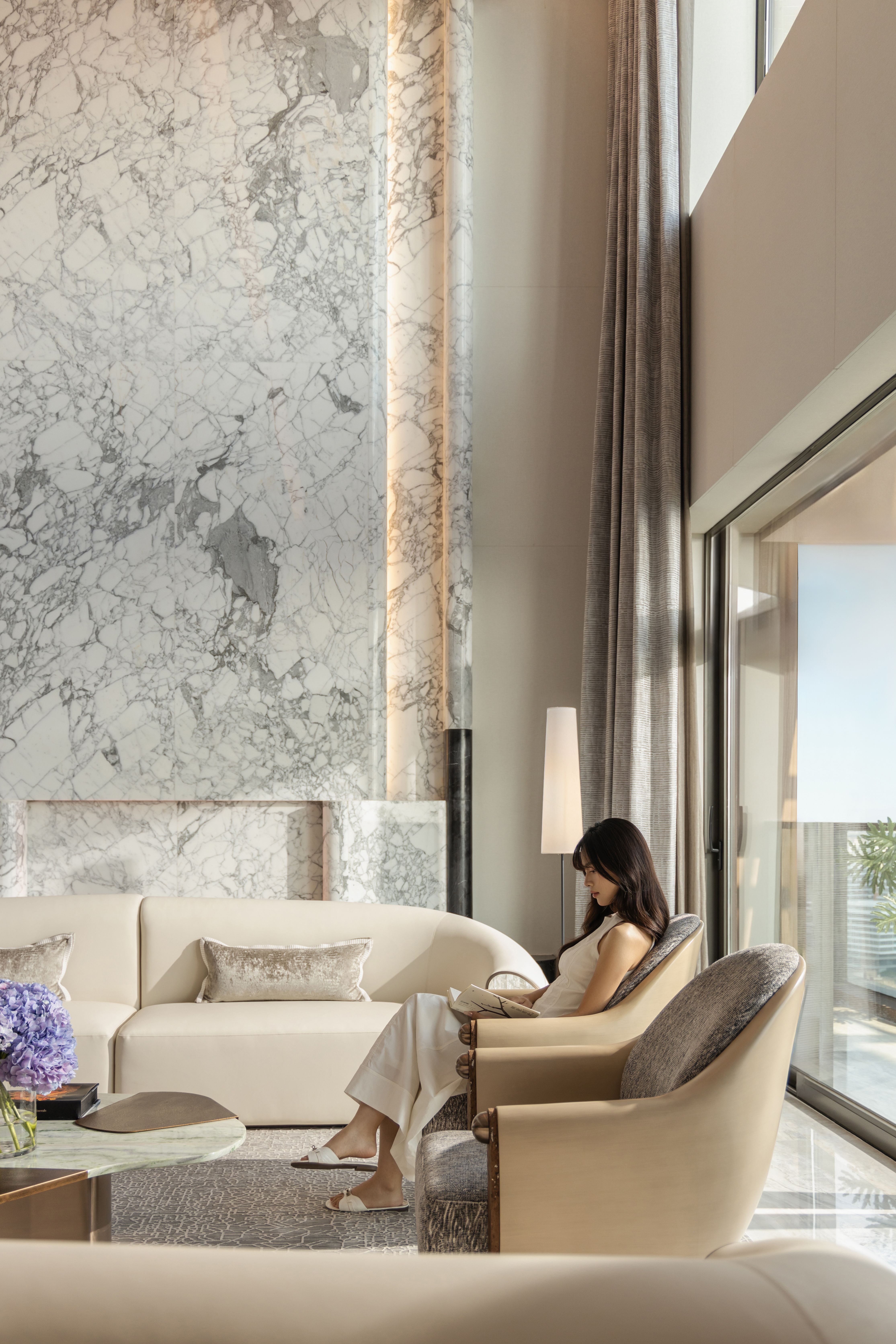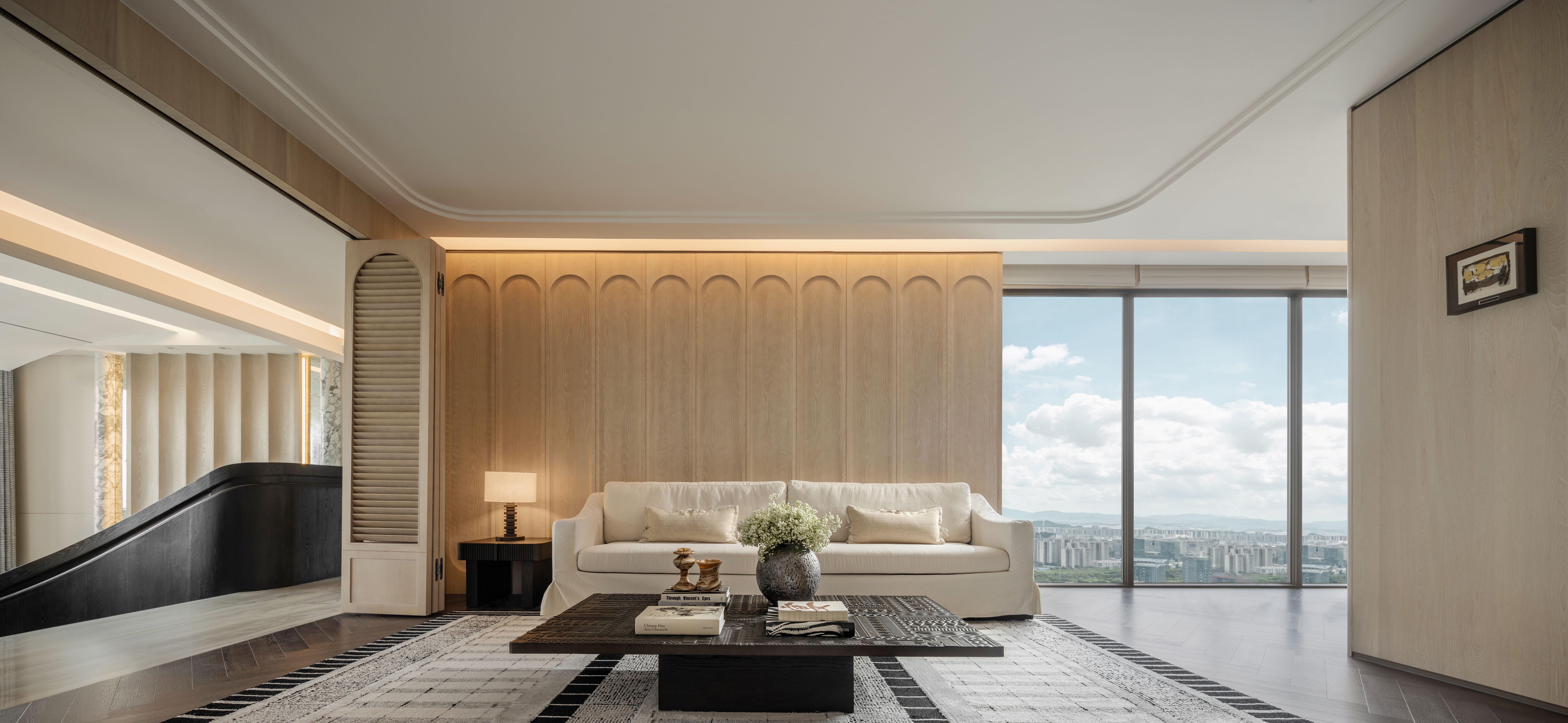 空间意境:项目在环境风格上的创新在于实现了自然景观与室内场景的无界融合与艺术化转译。设计利用270°的环幕湖景视野,让晨雾、湖光、夕阳成为空间动态的背景。室内通过极简弧形天井、光影交互等手法,将东方哲思与现代美学结合,使客厅在特定时刻化身为“与湖共生的光影美术馆”,让居住者真正“栖居于湖光之中”。