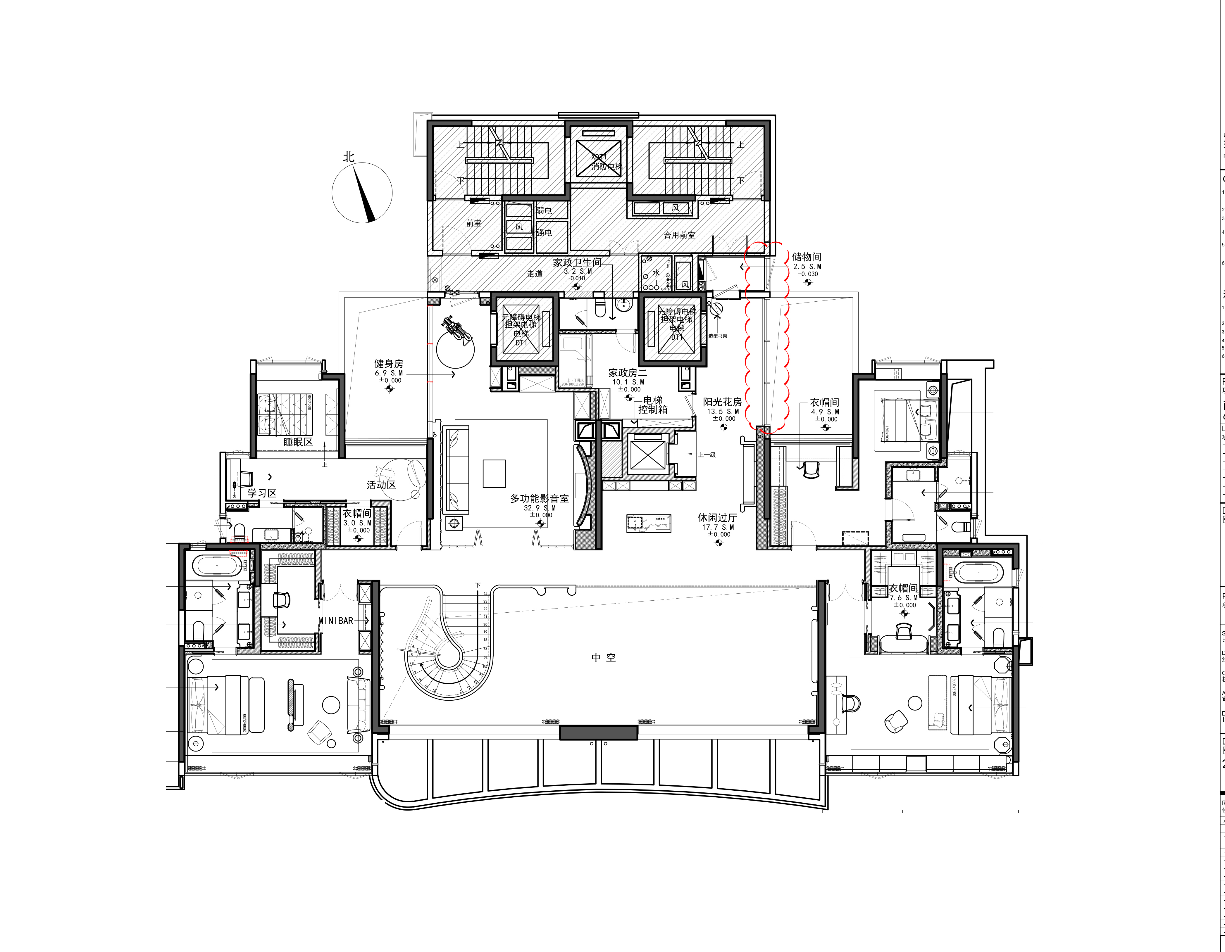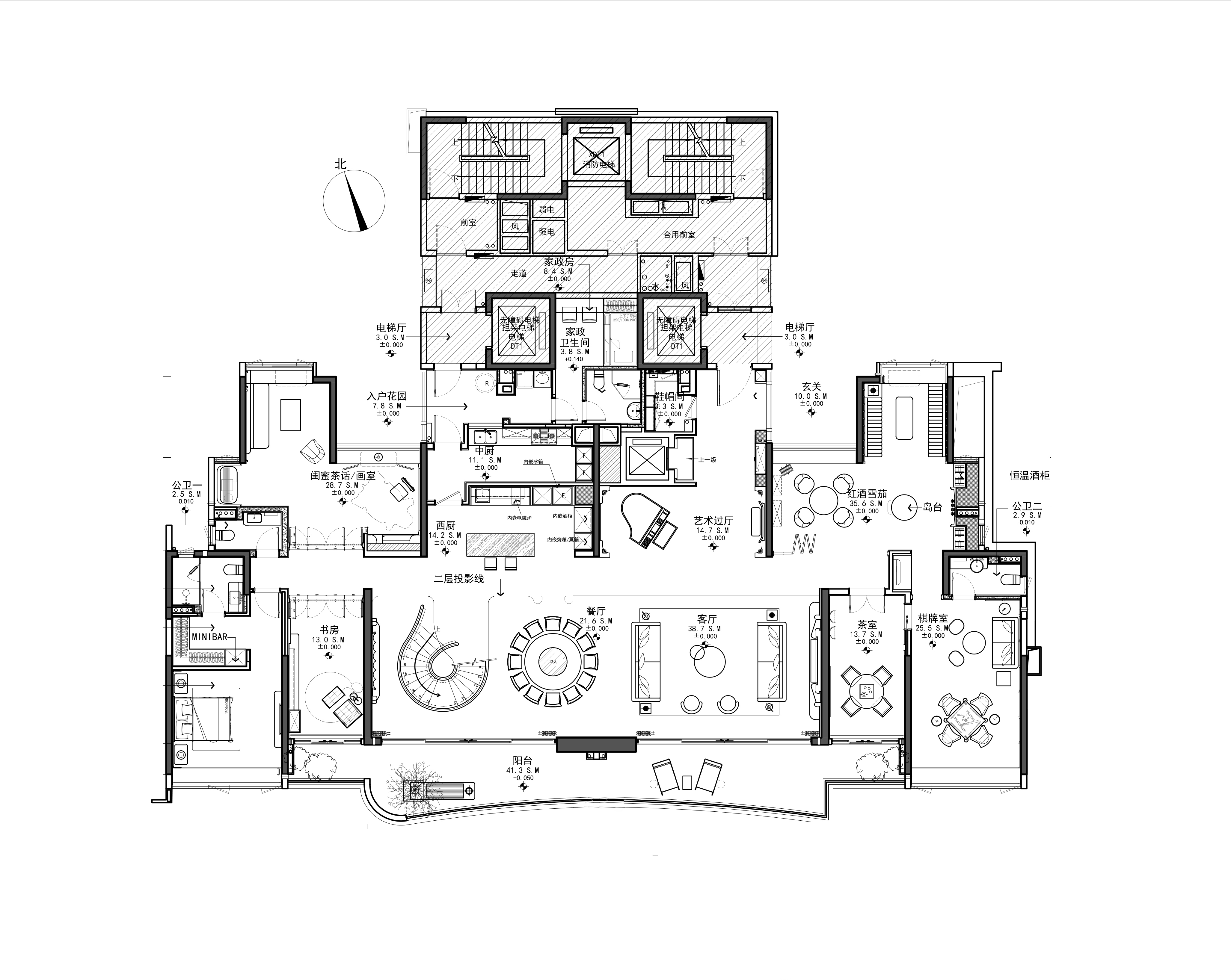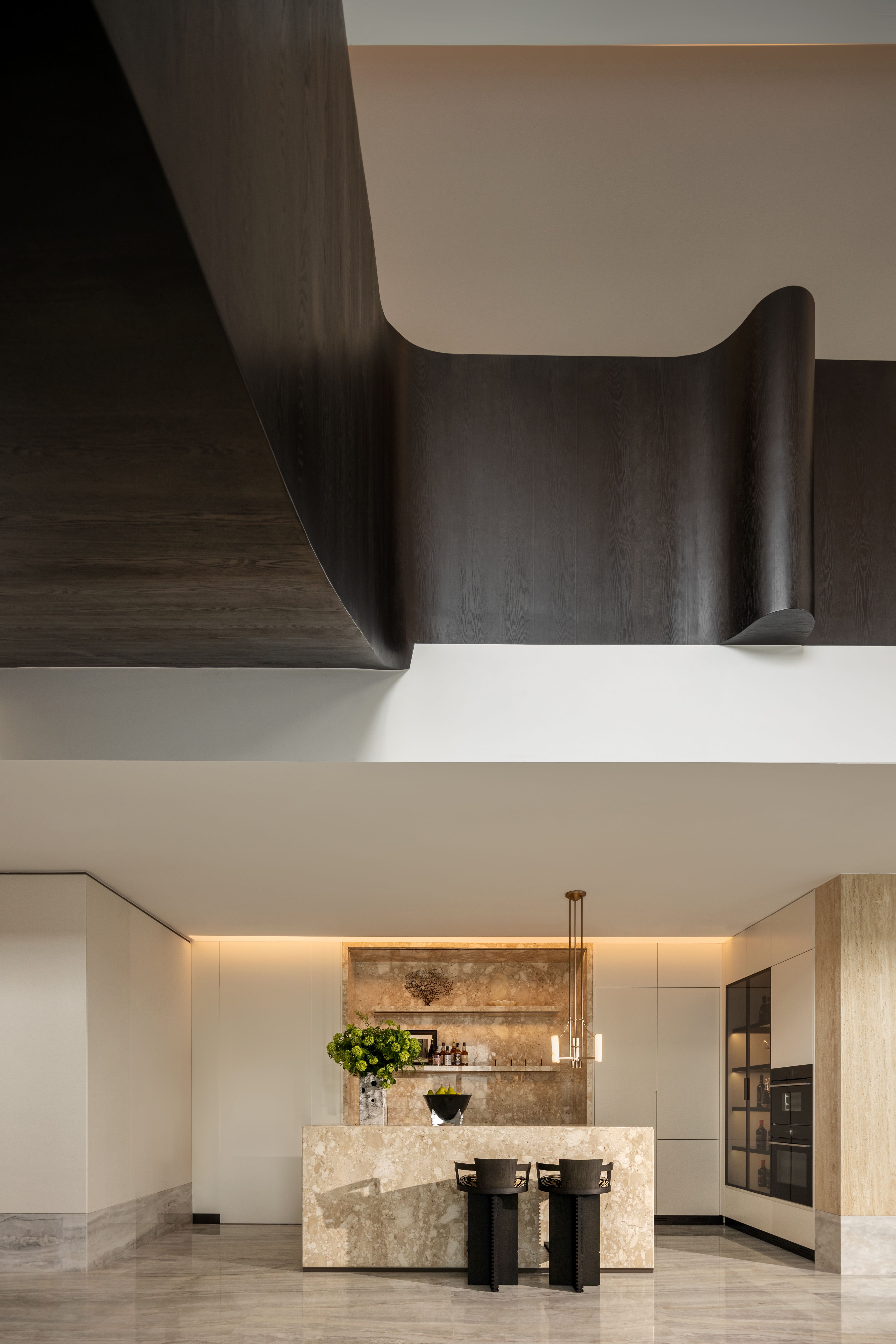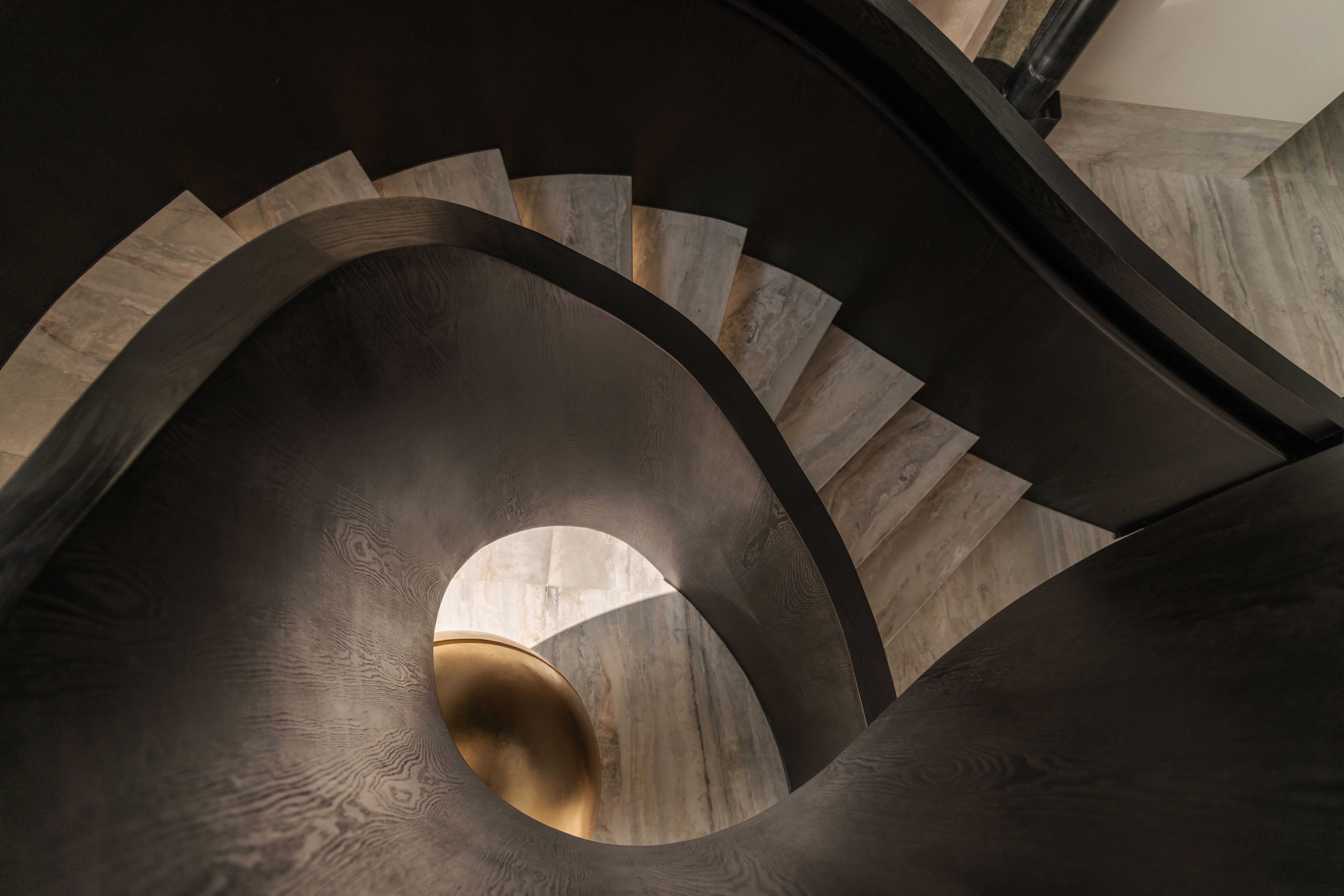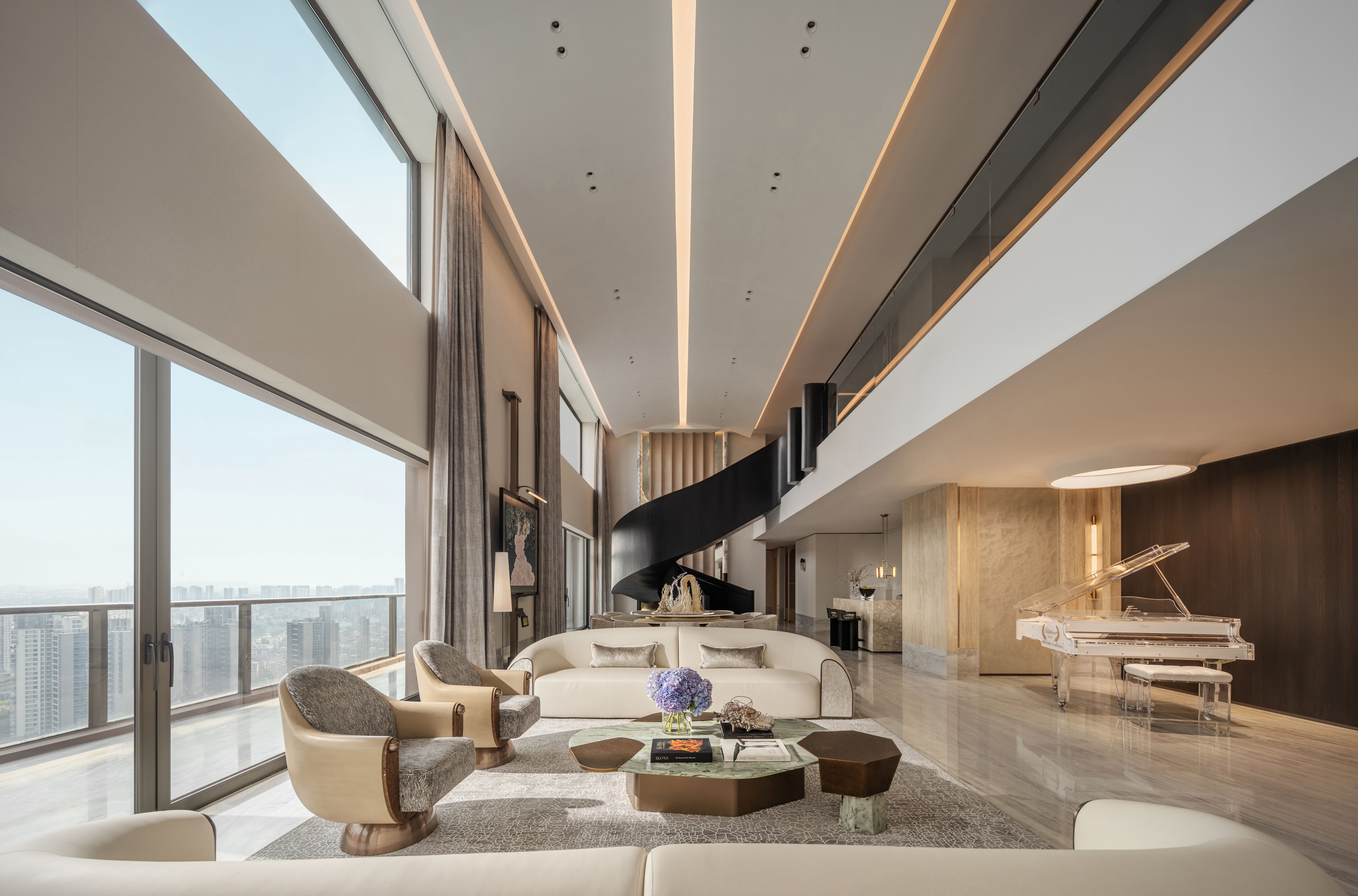 空间布局:空间布局的创新点在于打破传统功能隔阂,依据生活动线进行“超级界面”重组。一层被定义为“家庭社交中枢”,各功能区都成为“景观发生器”。核心的雕塑感旋转楼梯不仅是交通纽带,更是激荡空间艺术张力的焦点。二层采用酒店式全套房设计,每间套房配套完善,并通过“隐藏式”收纳系统维系了空间的纯粹与开阔。