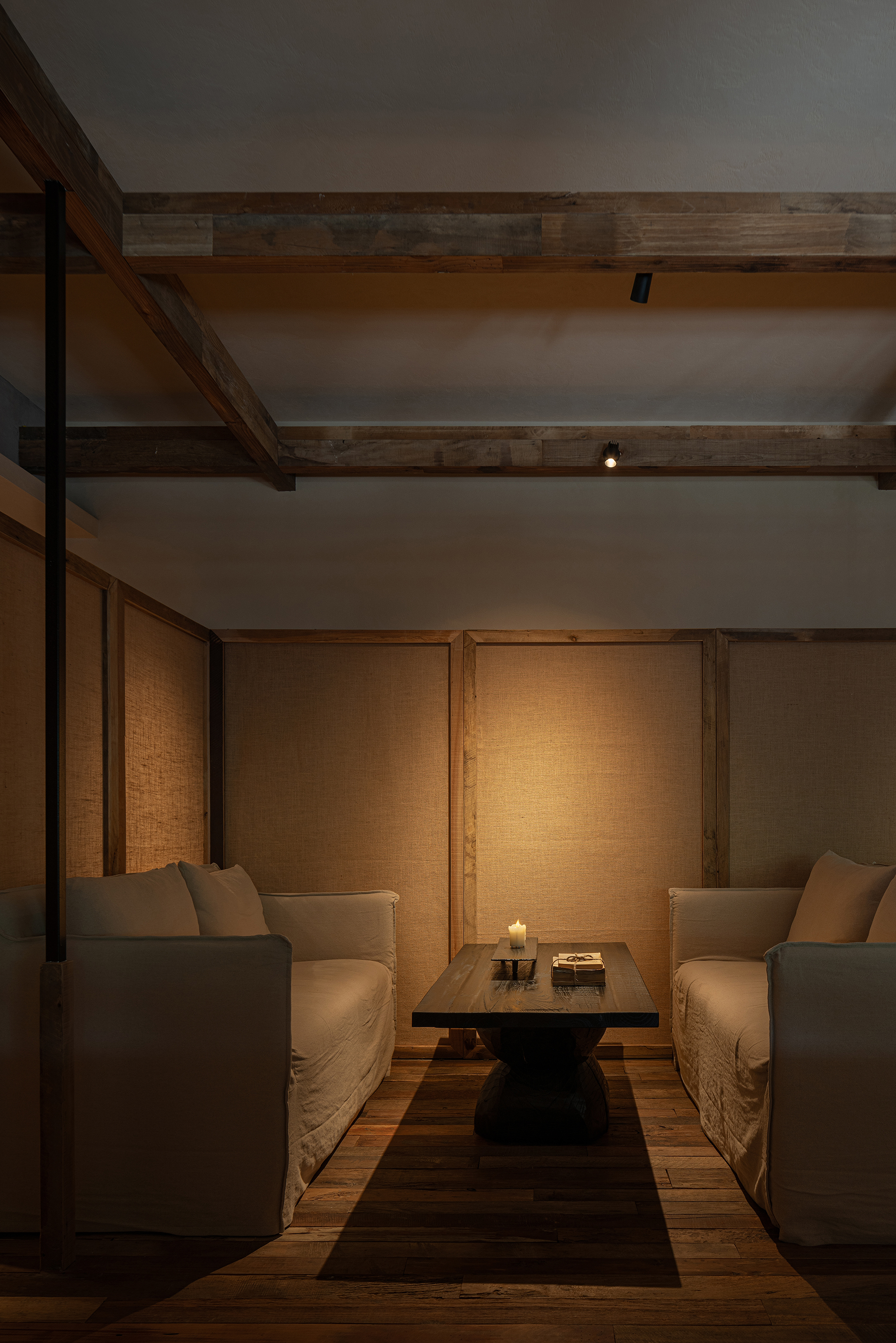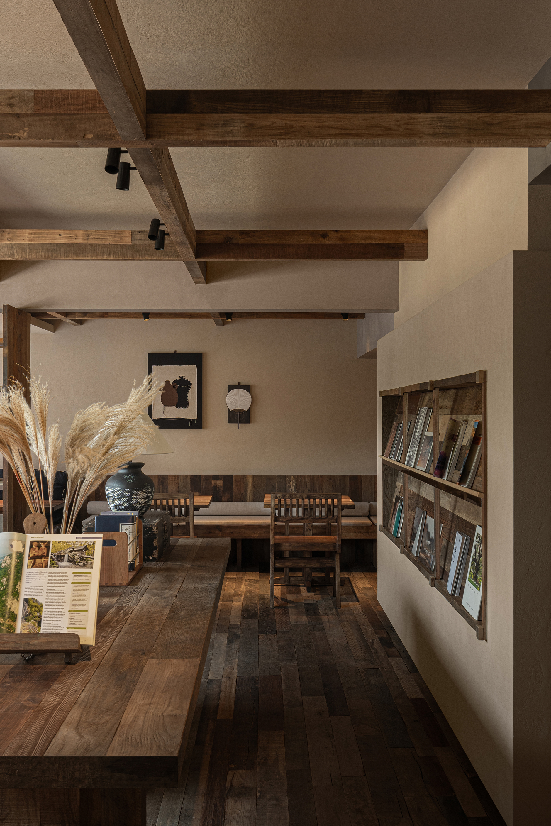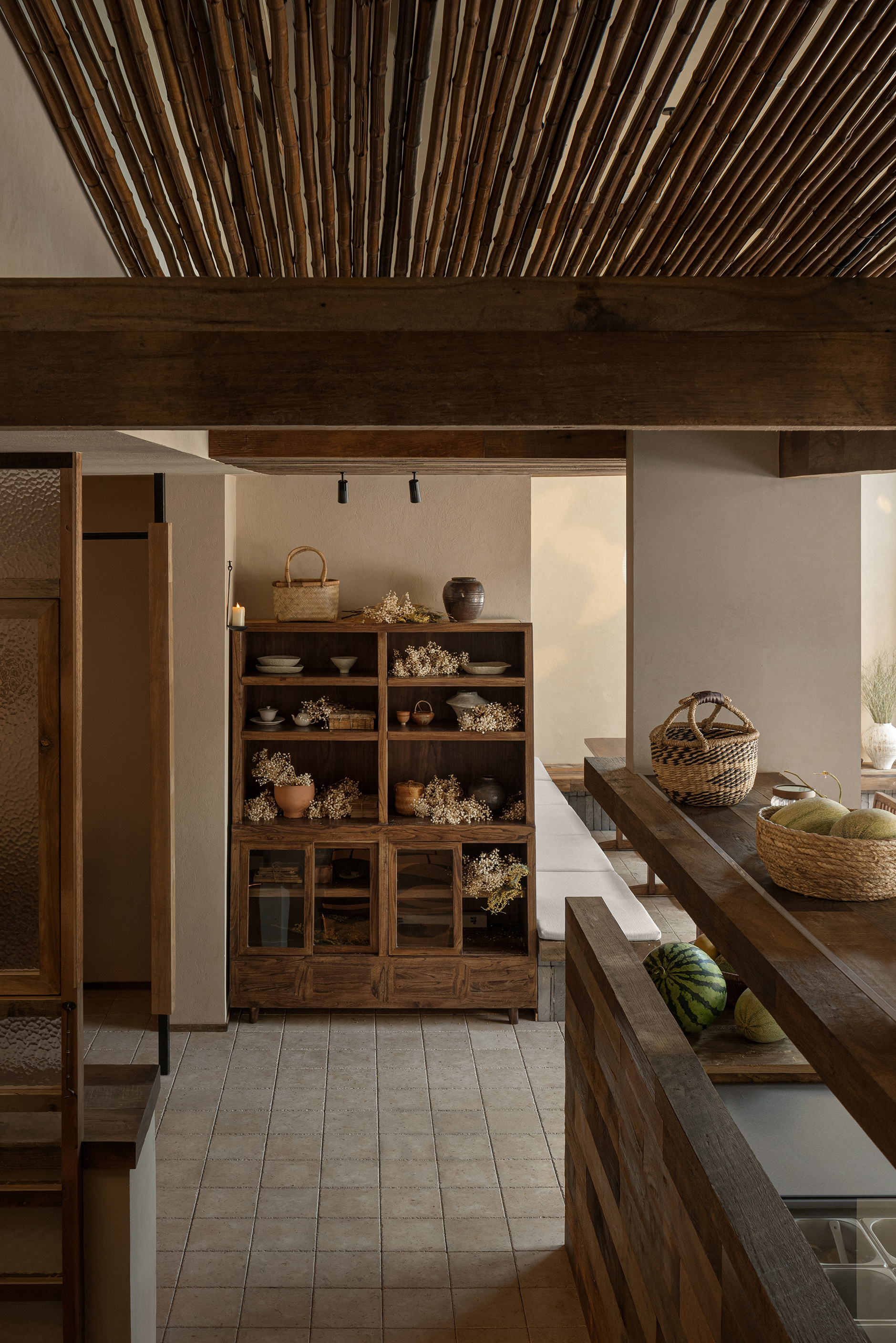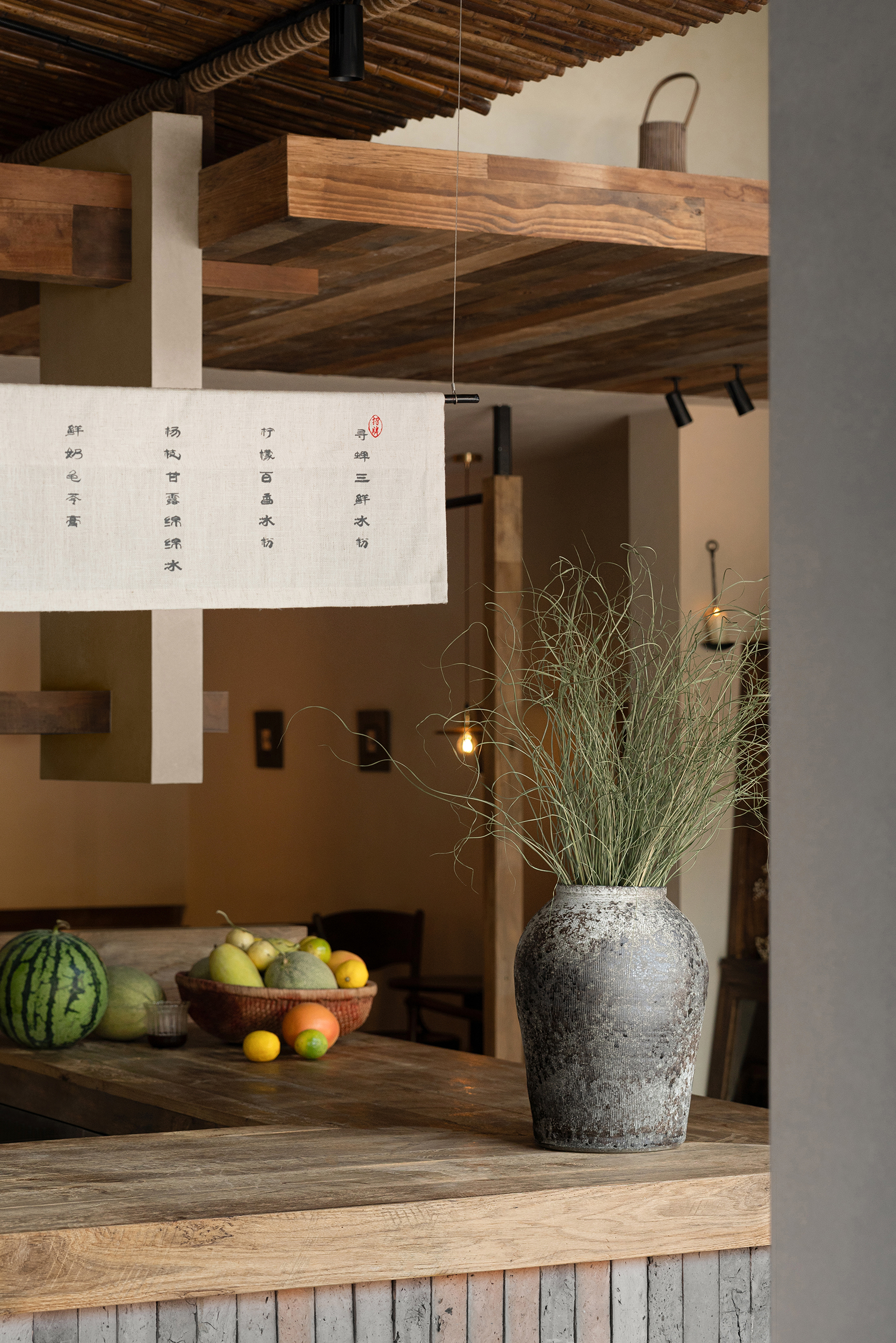 设计选材:设计选材上以老木、莱姆石、青砖、温润的艺术涂料为主,这些材料都是具有时光印记的材料,它们的质感天生能为人们带来一种亲切、温暖感,也为本案呈现出一种日常,轻声的心灵田园生活