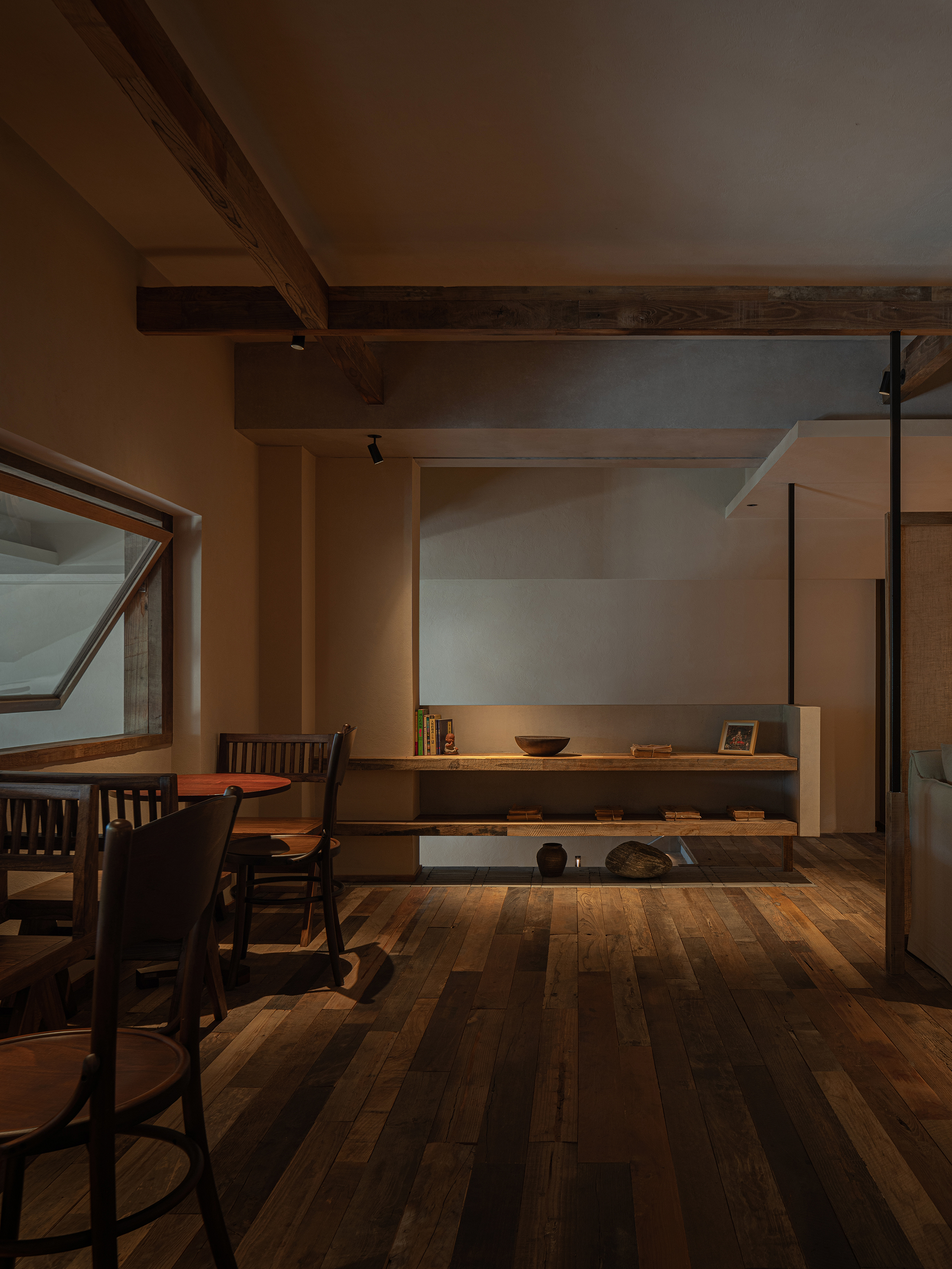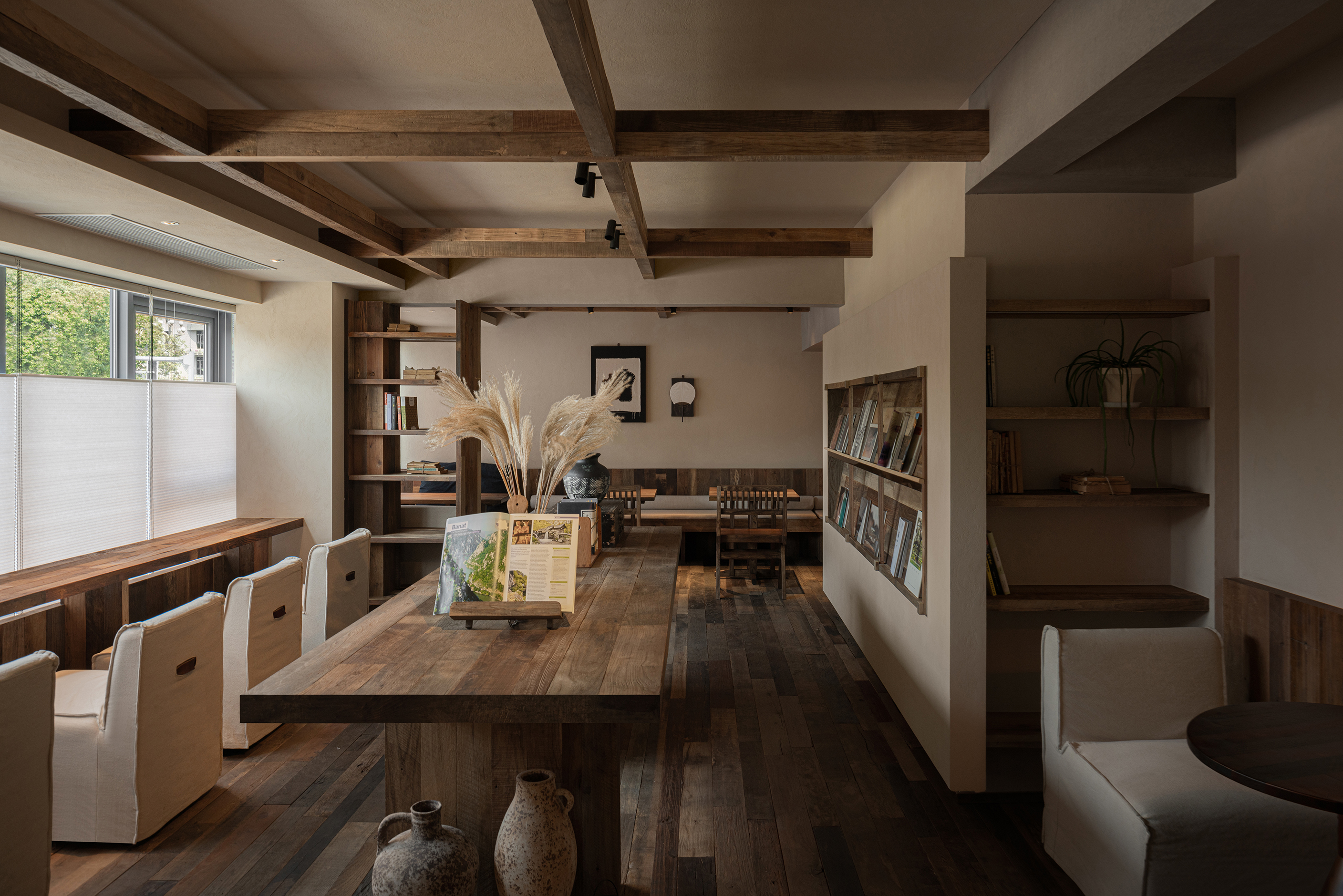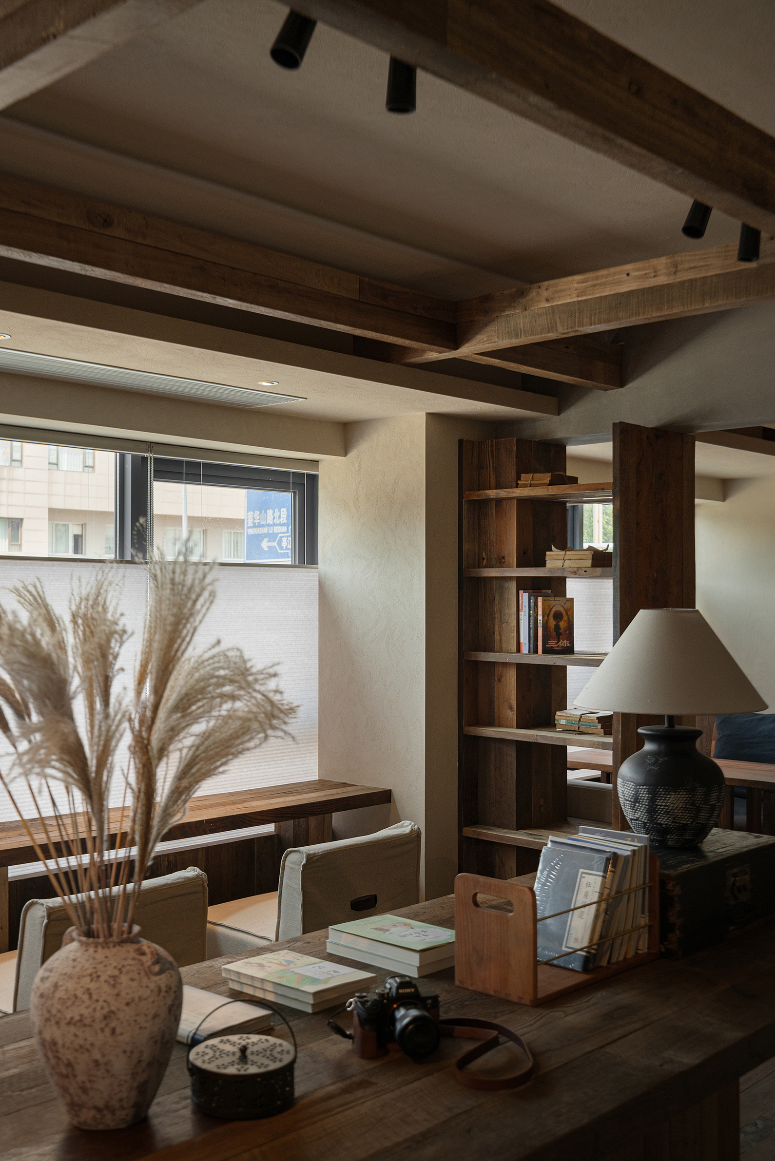 空间布局:本案空间分为两层,一层为售卖吧台和散座区,二层则为舒适的卡座沙发及阅读区。整个空间布局疏朗通透,让光影得以自由流淌,氛围呈现“静”与“凉”。一楼的深挑的檐模糊了内与外的界限,形成一片开放的“灰空间”,孩童在此躲闪夏日急雨,老人倚坐闲话家常,一个有温度的设计从入口就开始呈现。二楼,如同被光影与书架包裹的静谧角落,整面书墙围合出轻阅读的氛围,舒适的沙发对窗而座,成为凭窗远眺的舒适据点。孩子们沉浸绘本,大人享用糖水,邻座间轻声交流,再熟悉的窗景与文字间,共度一段慢时光。