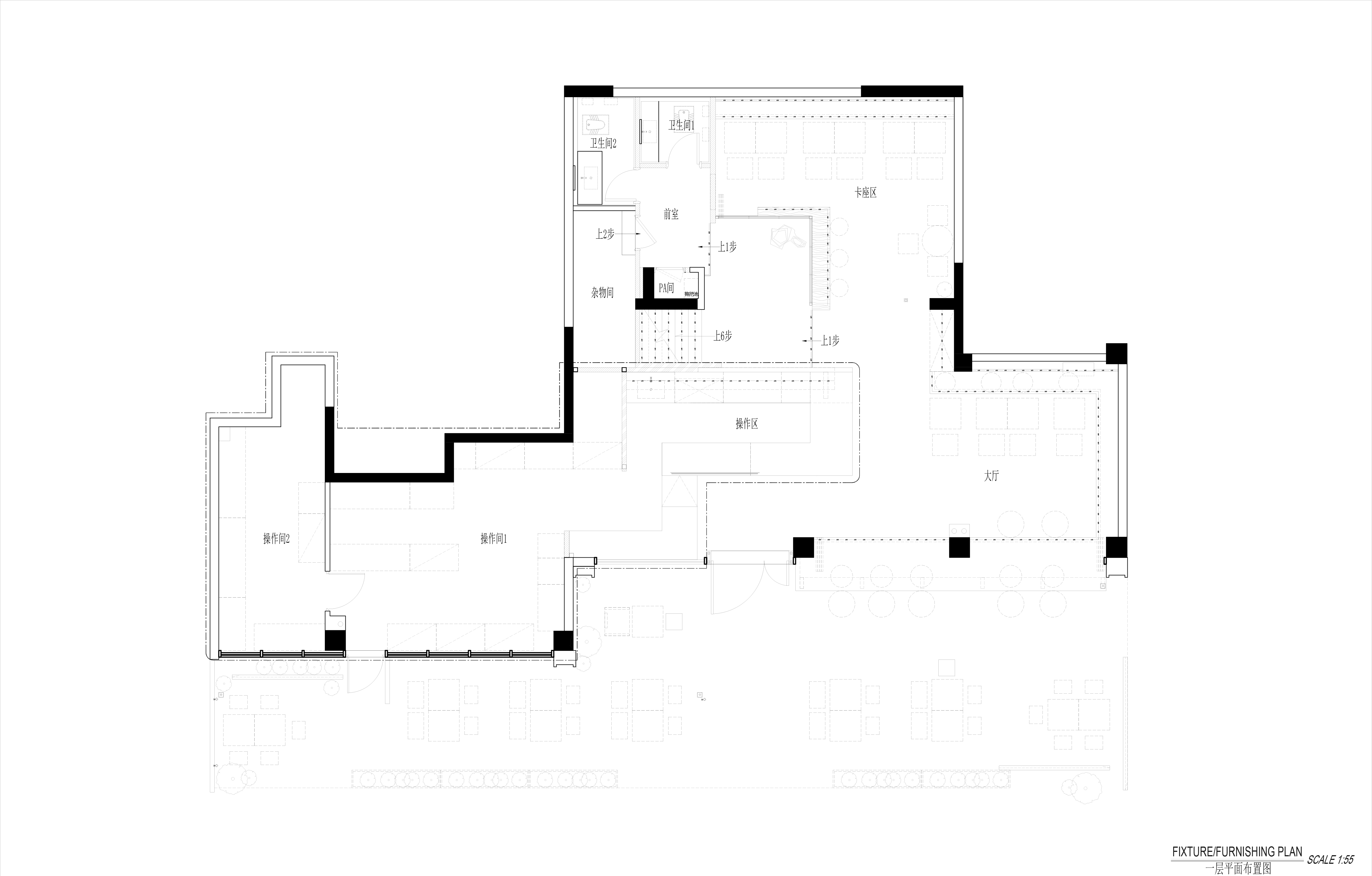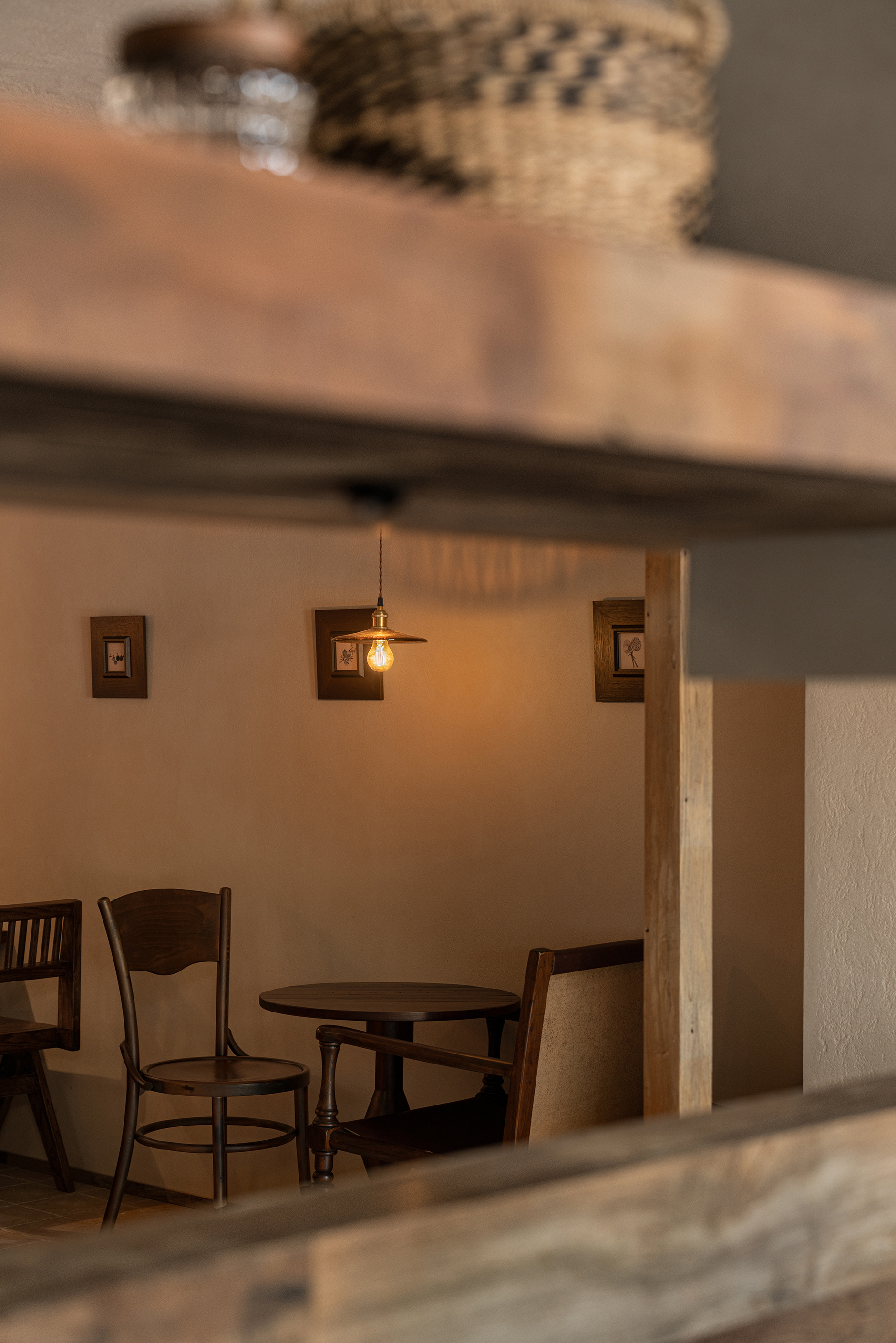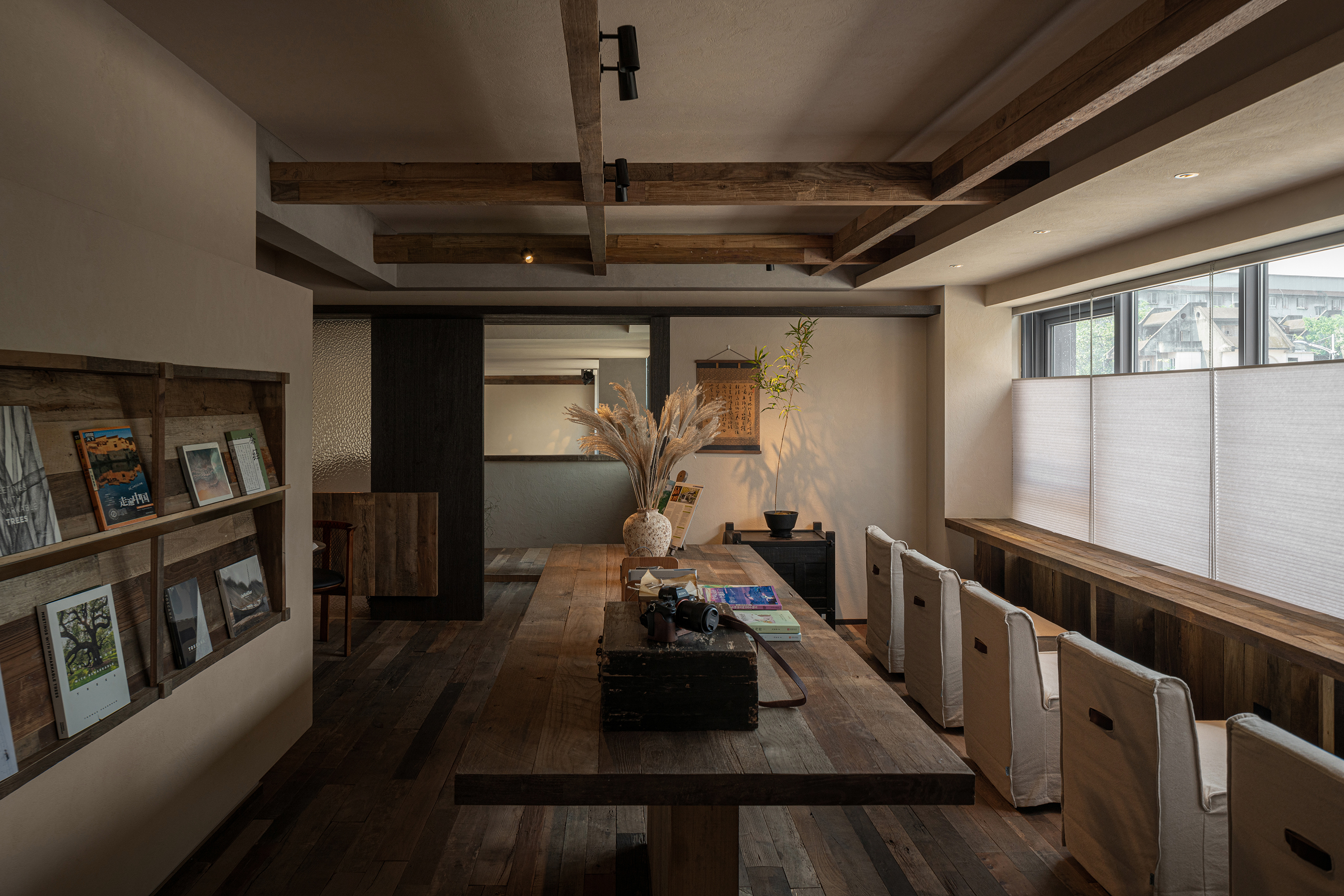 空间布局:本案空间分为两层,一层为售卖吧台和散座区,二层则为舒适的卡座沙发及阅读区。整个空间布局疏朗通透,让光影得以自由流淌,氛围呈现“静”与“凉”。一楼的深挑的檐模糊了内与外的界限,形成一片开放的“灰空间”,孩童在此躲闪夏日急雨,老人倚坐闲话家常,一个有温度的设计从入口就开始呈现。二楼,如同被光影与书架包裹的静谧角落,整面书墙围合出轻阅读的氛围,舒适的沙发对窗而座,成为凭窗远眺的舒适据点。孩子们沉浸绘本,大人享用糖水,邻座间轻声交流,再熟悉的窗景与文字间,共度一段慢时光。