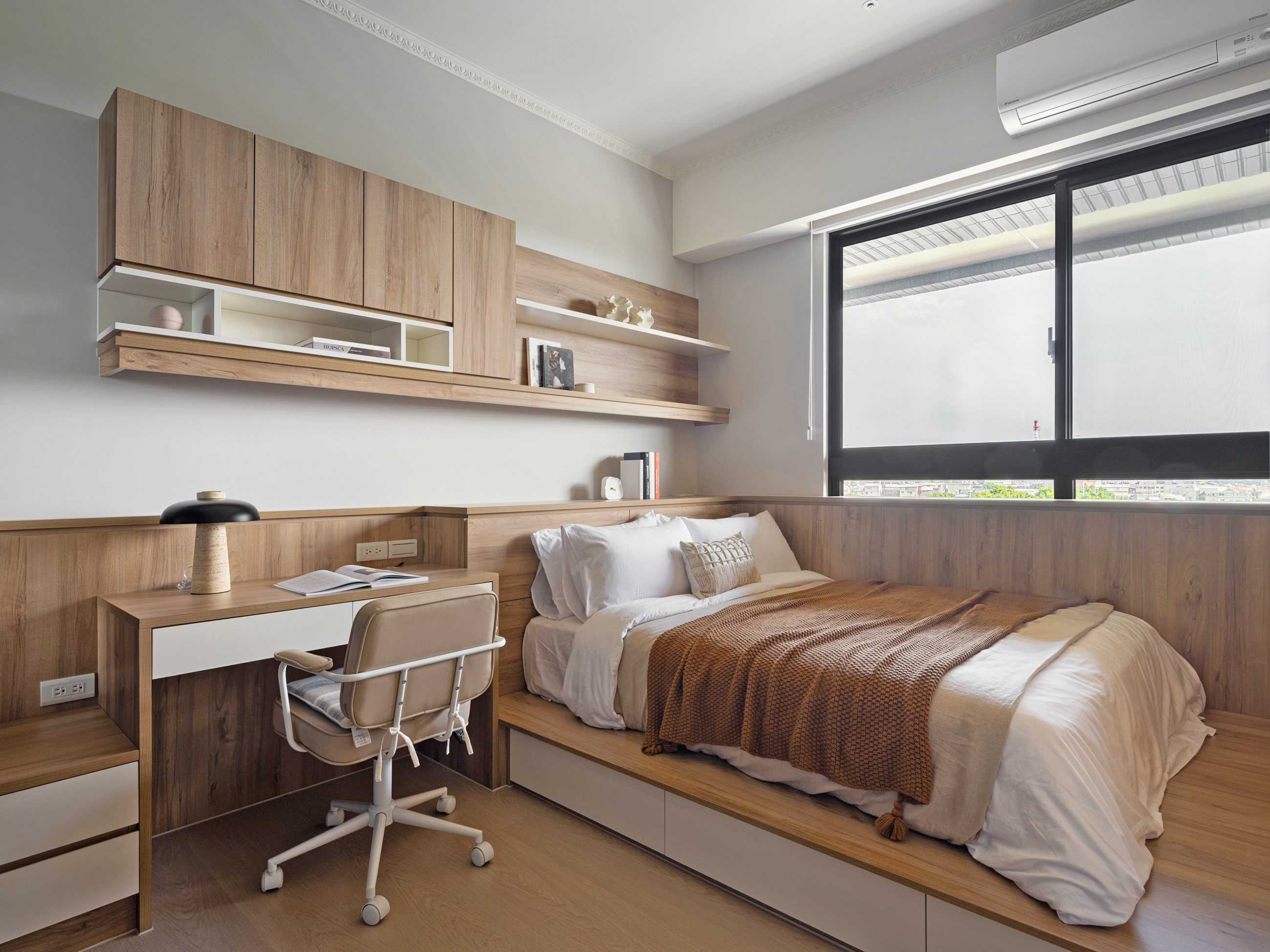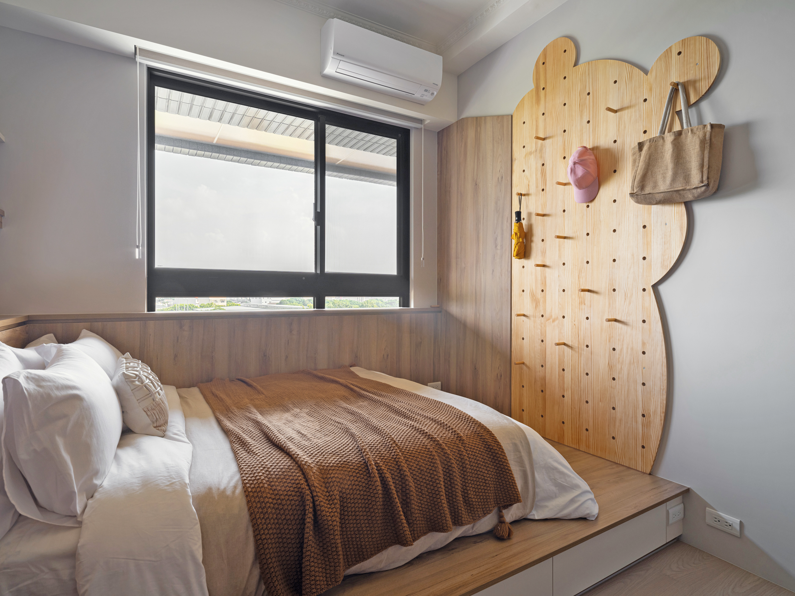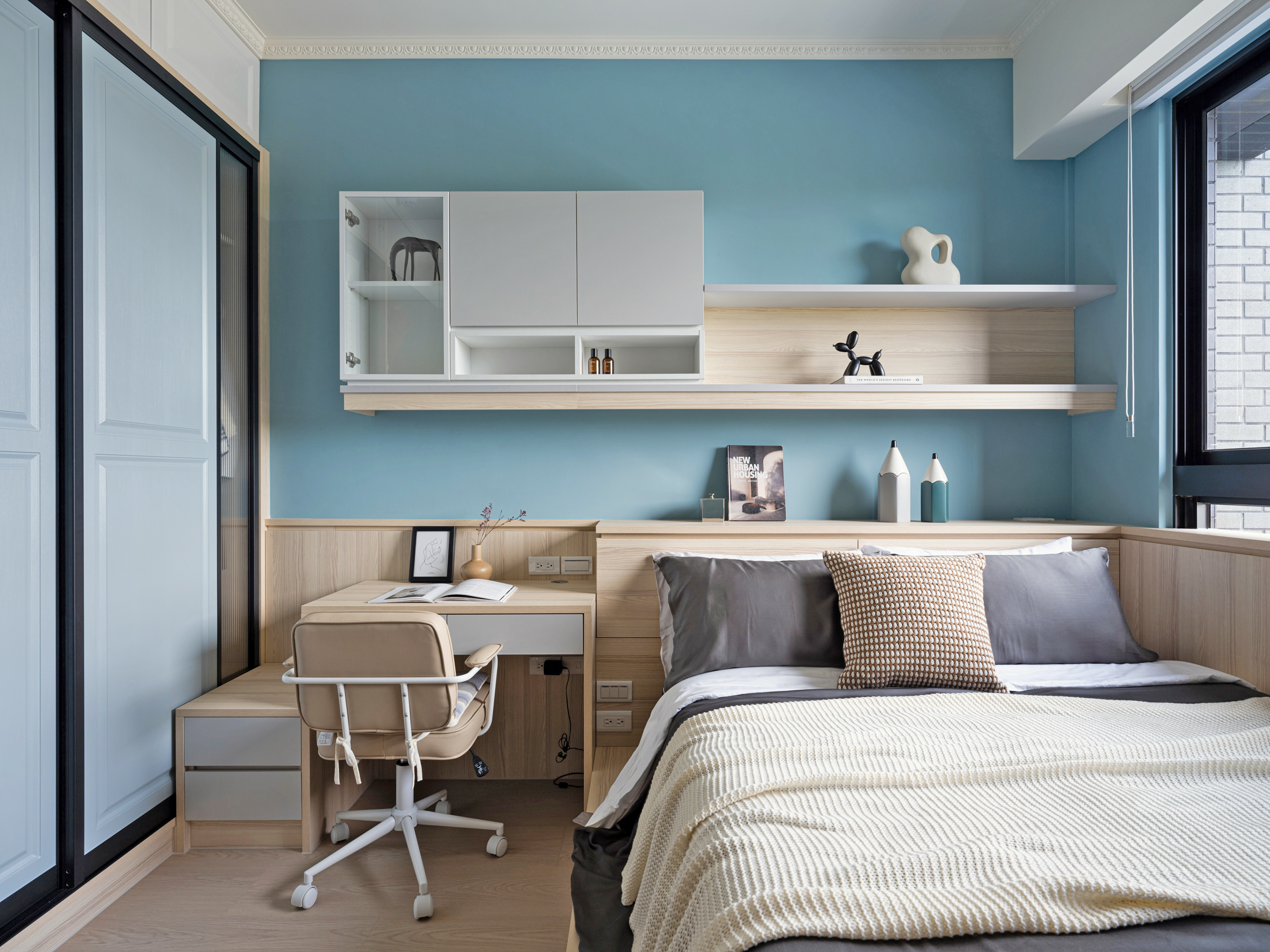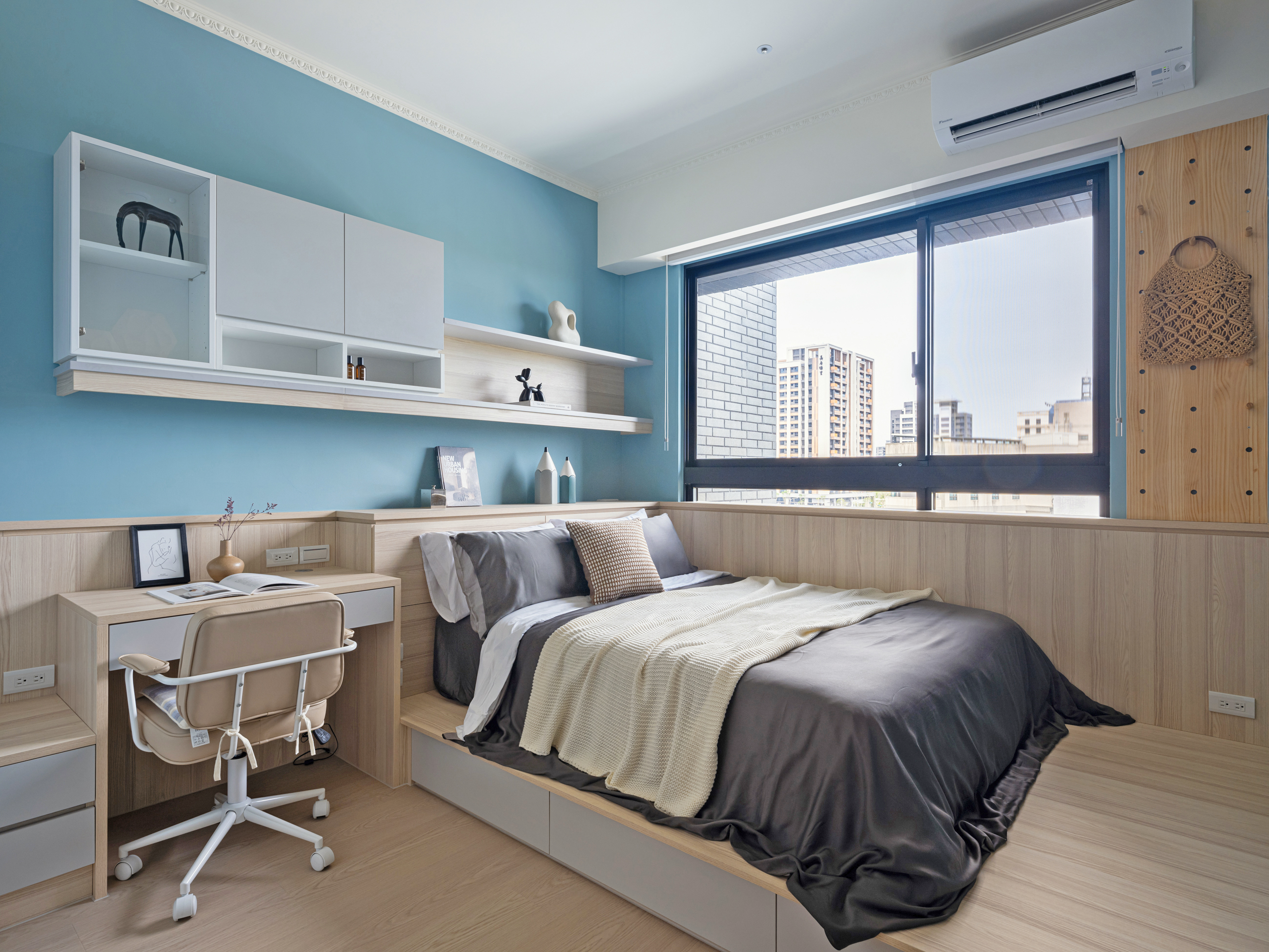 小女兒的房間以清新藍為主調搭配淺色木紋,輕盈的色彩組合讓整個房間明亮而舒適,增添了自然溫暖的氛圍,並在床尾加入了簡約的圖案裝飾,增加了趣味性也不失童趣與溫馨