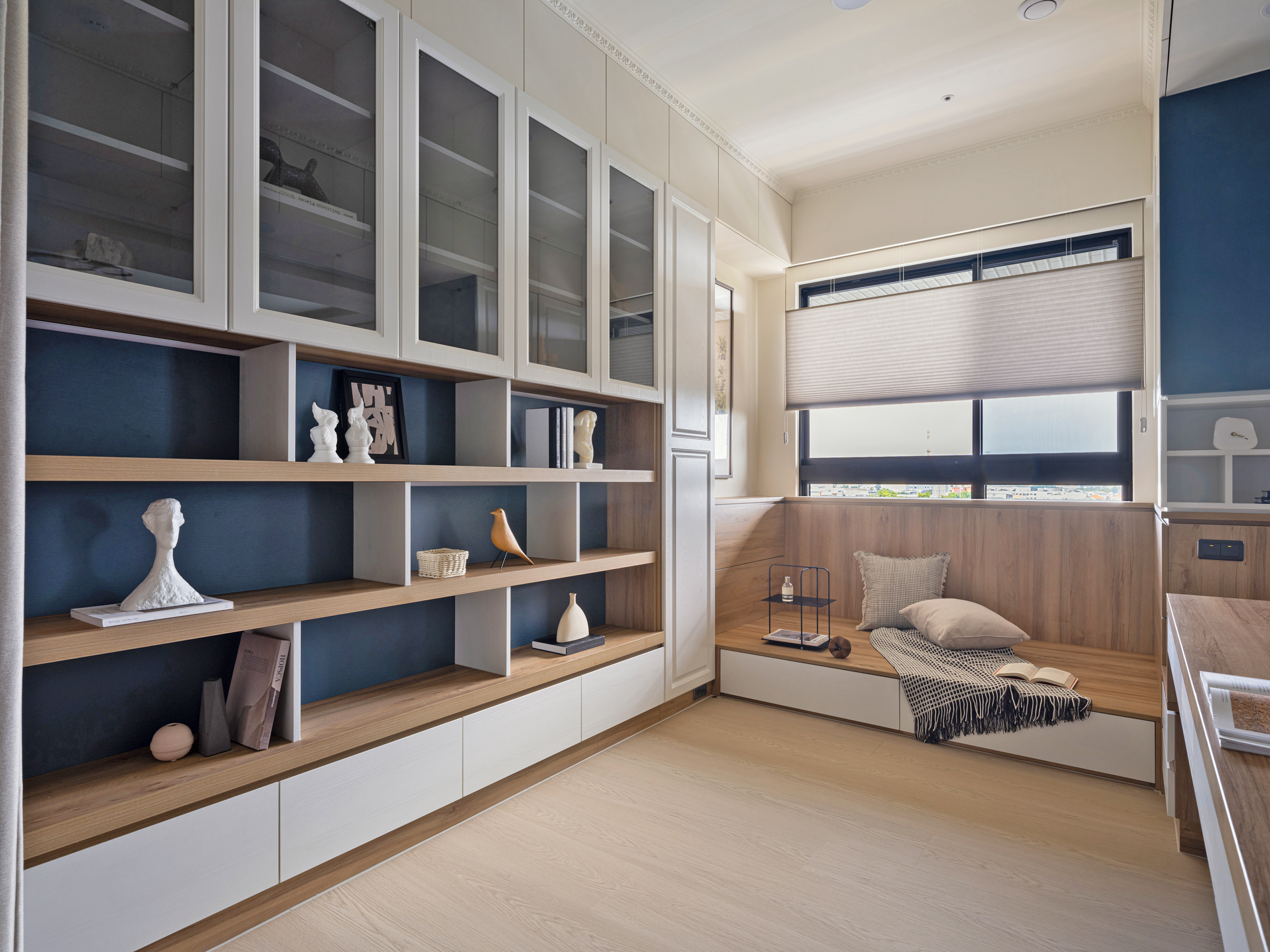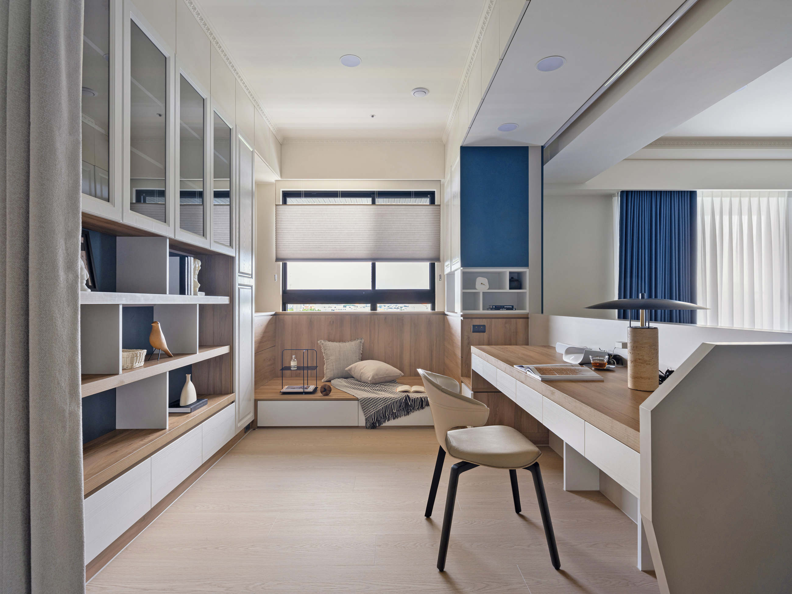 開放式書房延伸客廳開闊視野,在書房後方規劃大面落地書櫃,細心收納屋主珍貴收藏與家人的回憶,並透過捲簾彈性利用劃分出書房的獨立性,自由定義空間機能