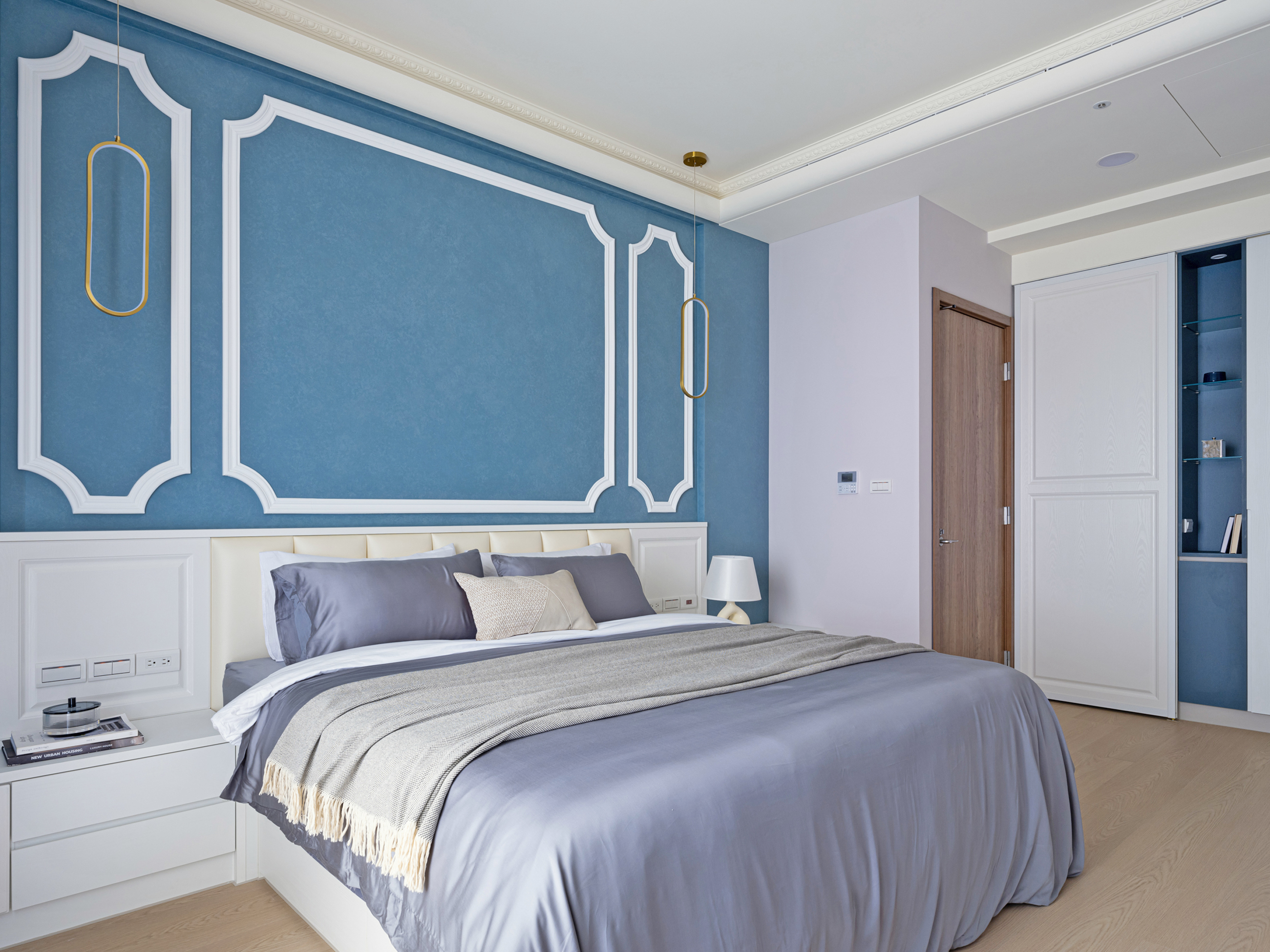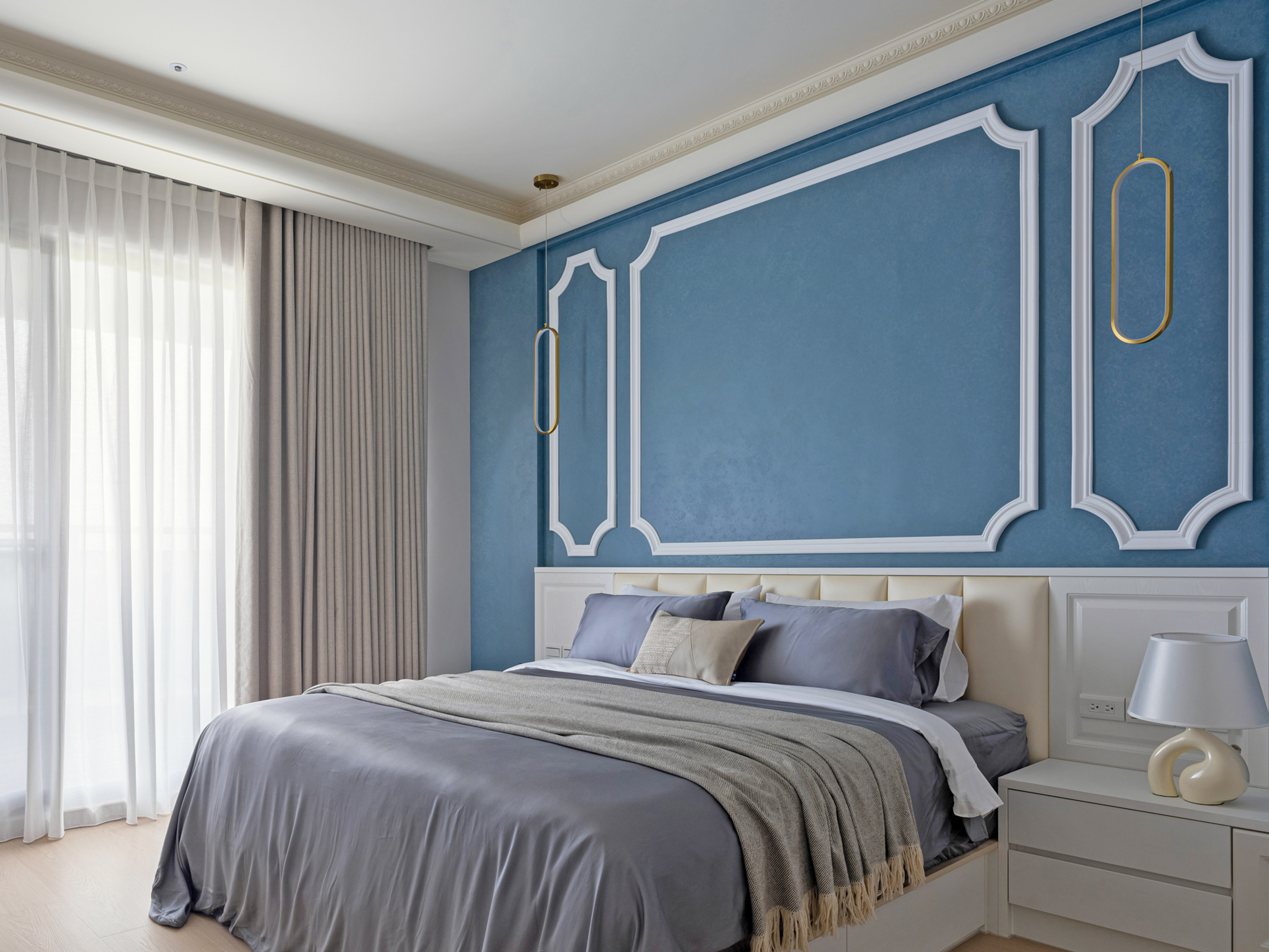 主臥空間以古典藍為基底,為屋主夫妻塑造一個放鬆且靜心的休憩空間。牆面的古典藍色以藝術塗料紋理呈現,不僅突顯出法式風格的高雅,也讓整個空間顯得沉穩、柔和。