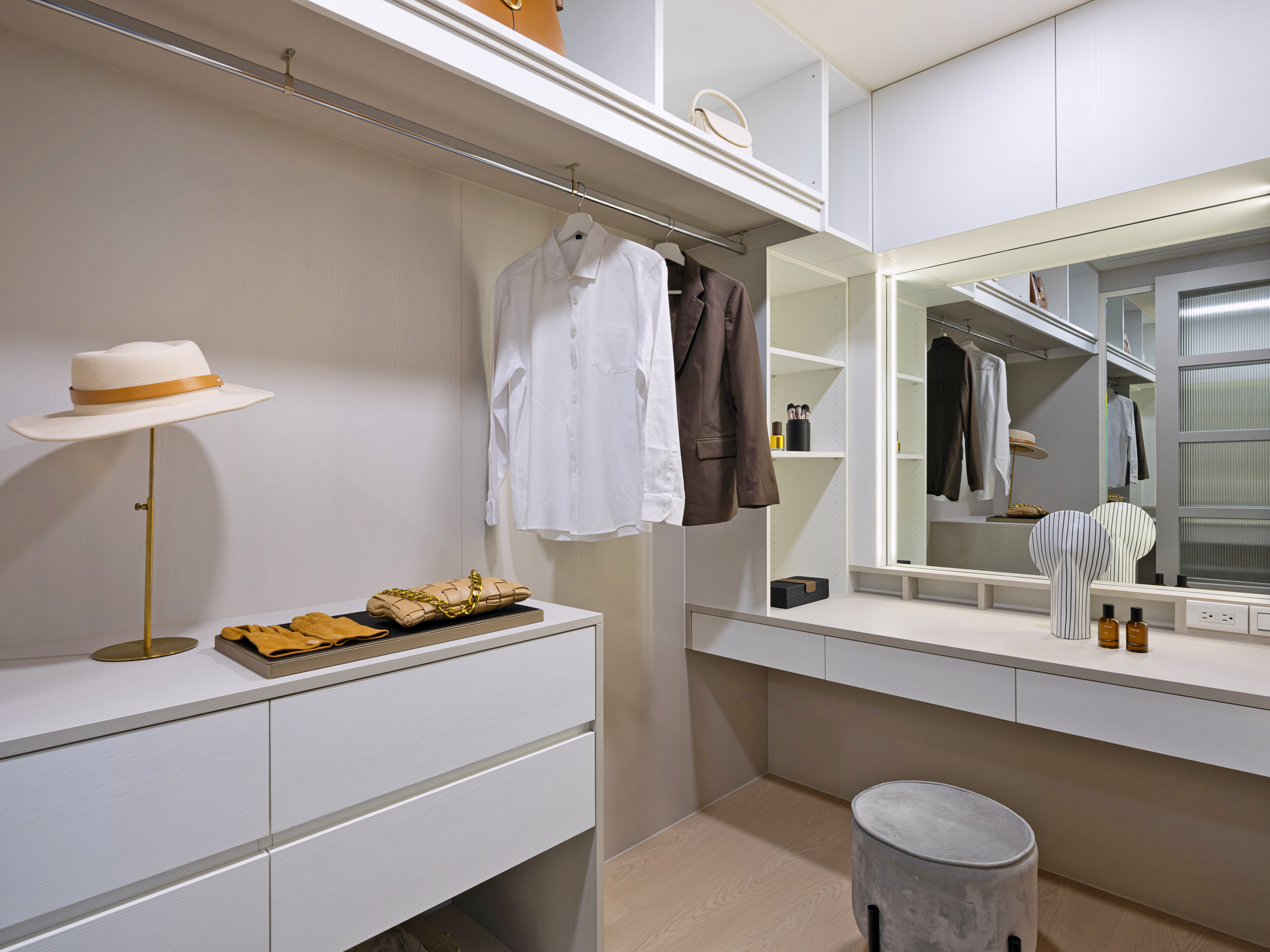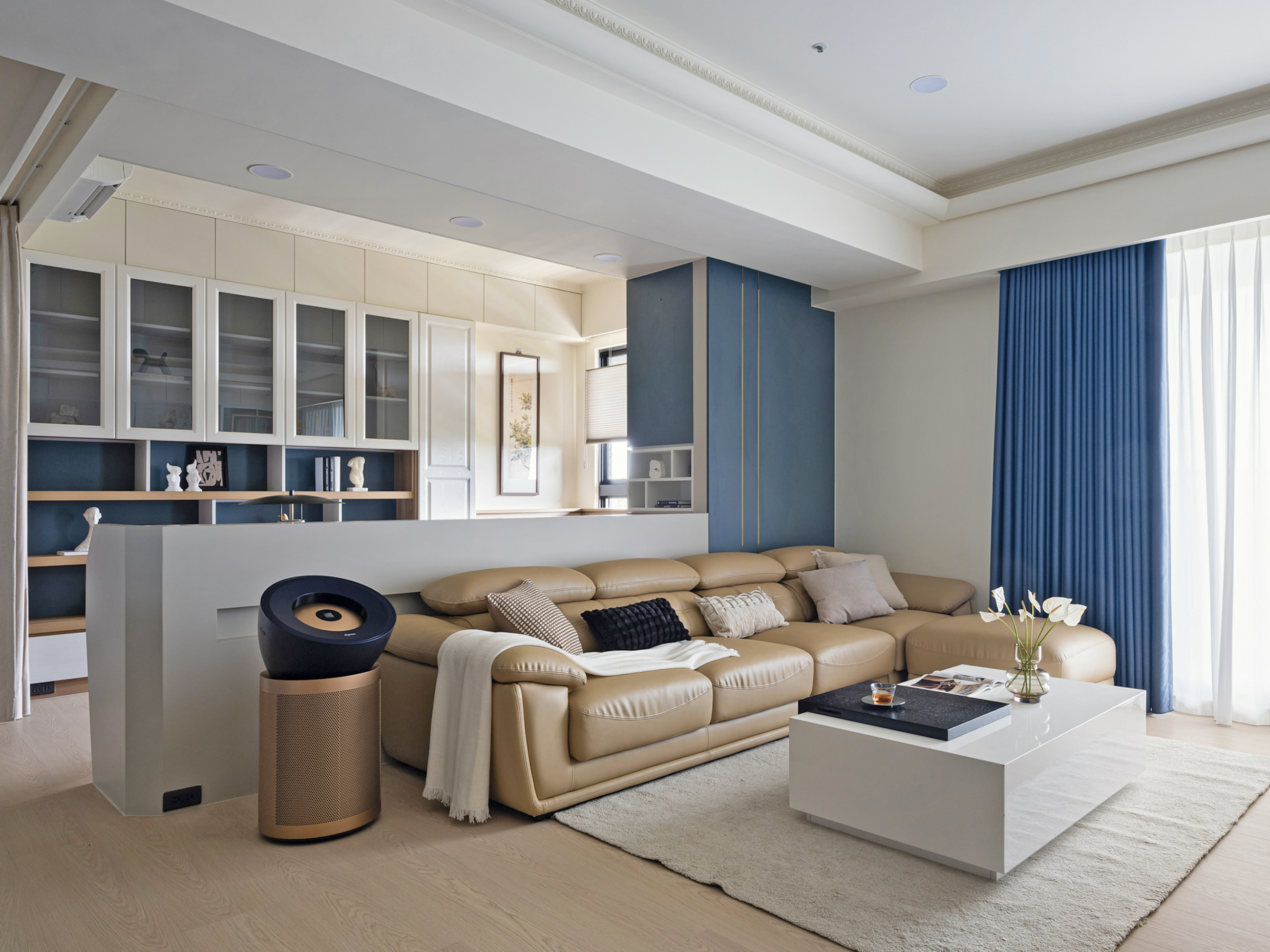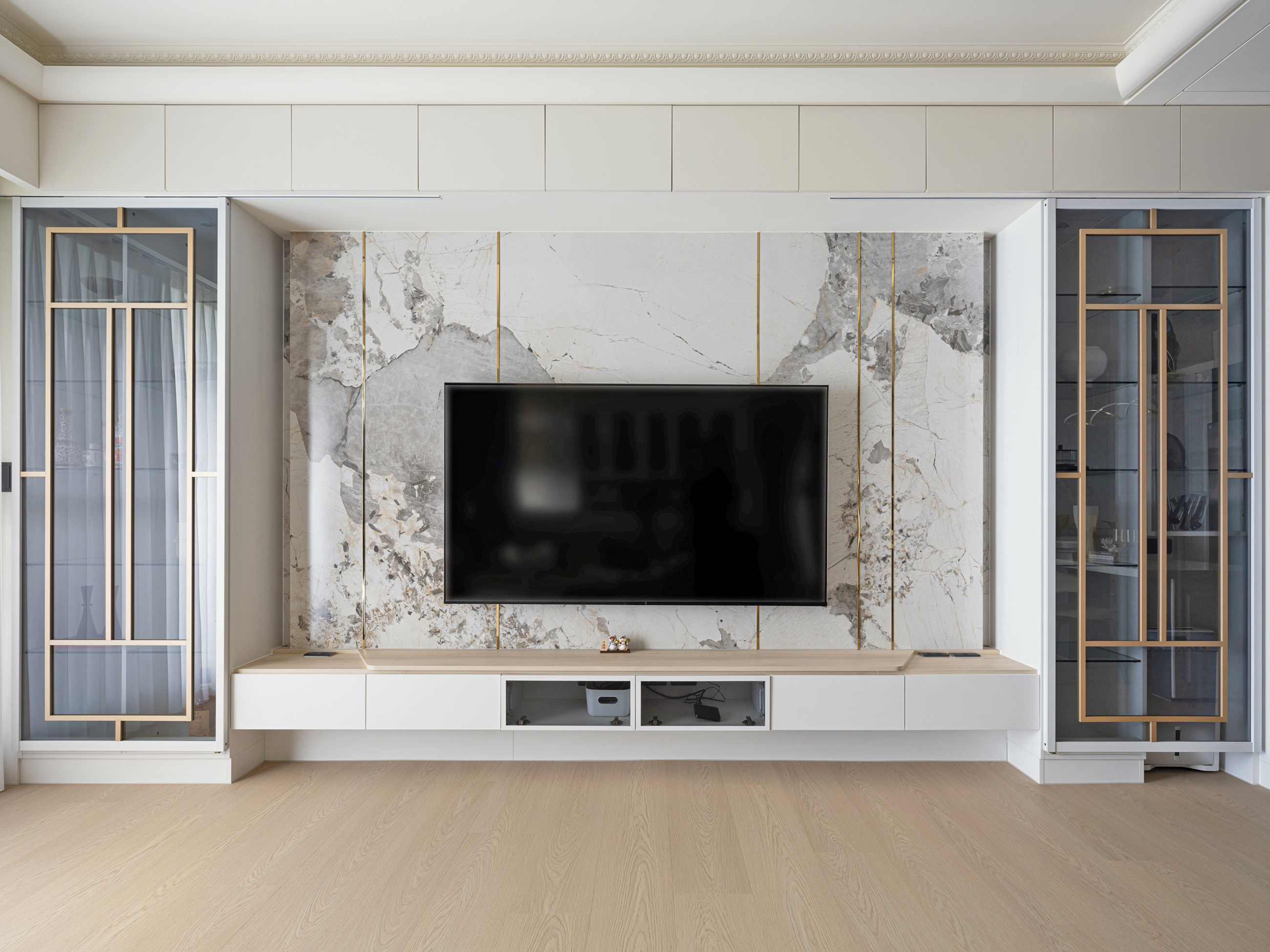 客廳內採開放式設計引導視線,以簡潔白色電視牆作為視覺焦點,透過光與影的交織,醞釀出優雅安定的生活氛圍,且將原本的高櫃上封轉為大量收納空間,在營造法式輕奢的精緻同時完善屋主所需收納機能。