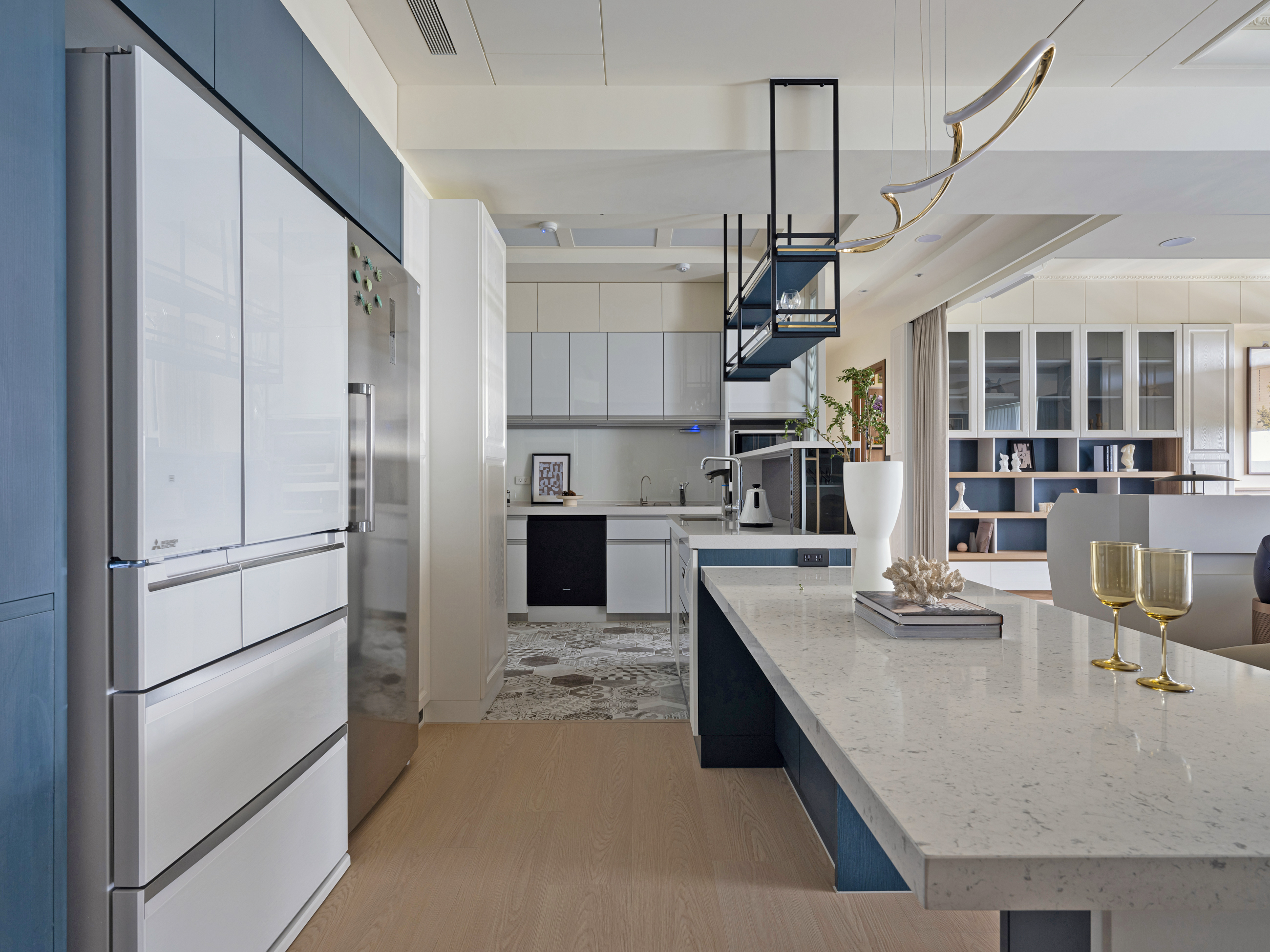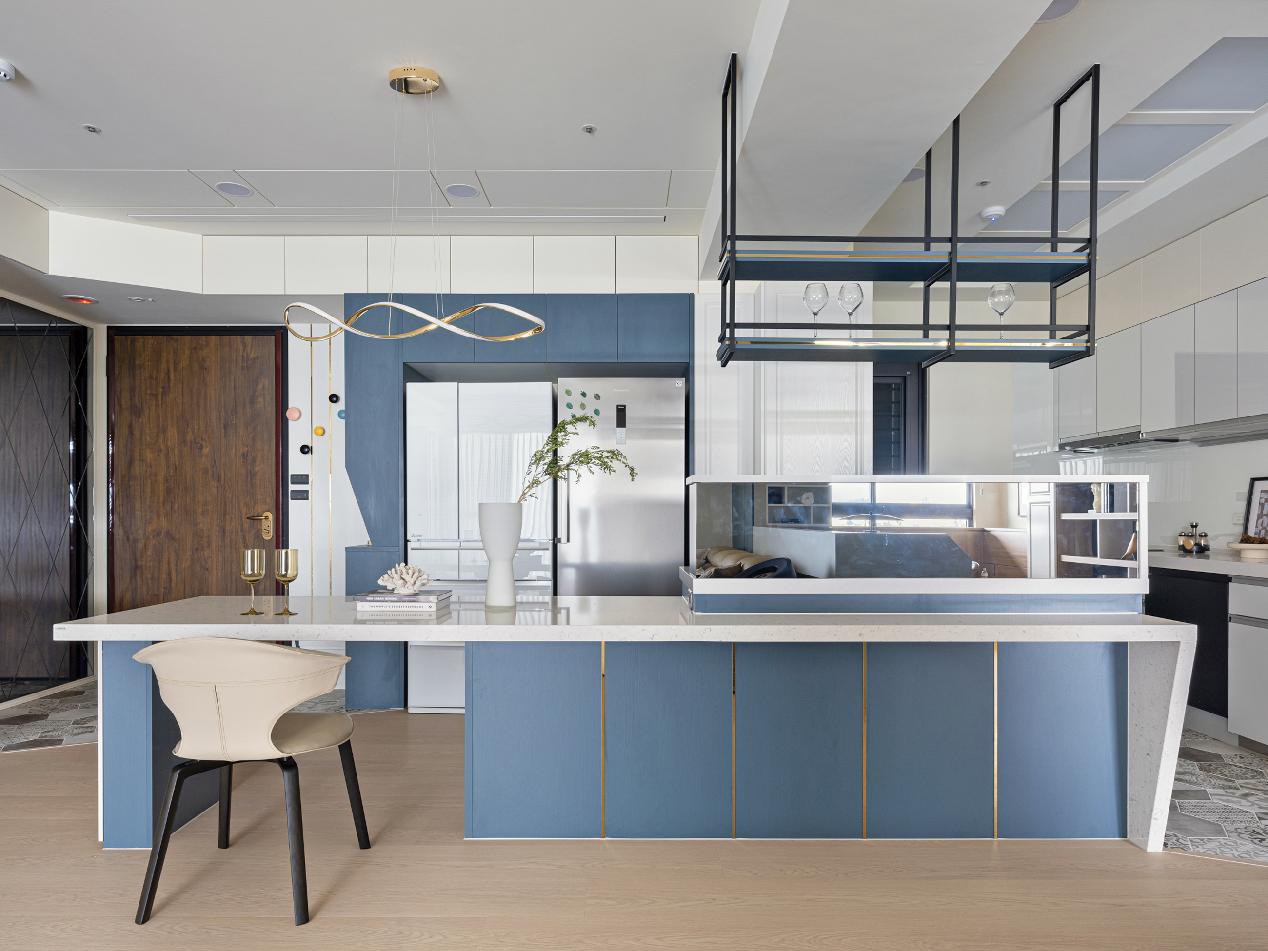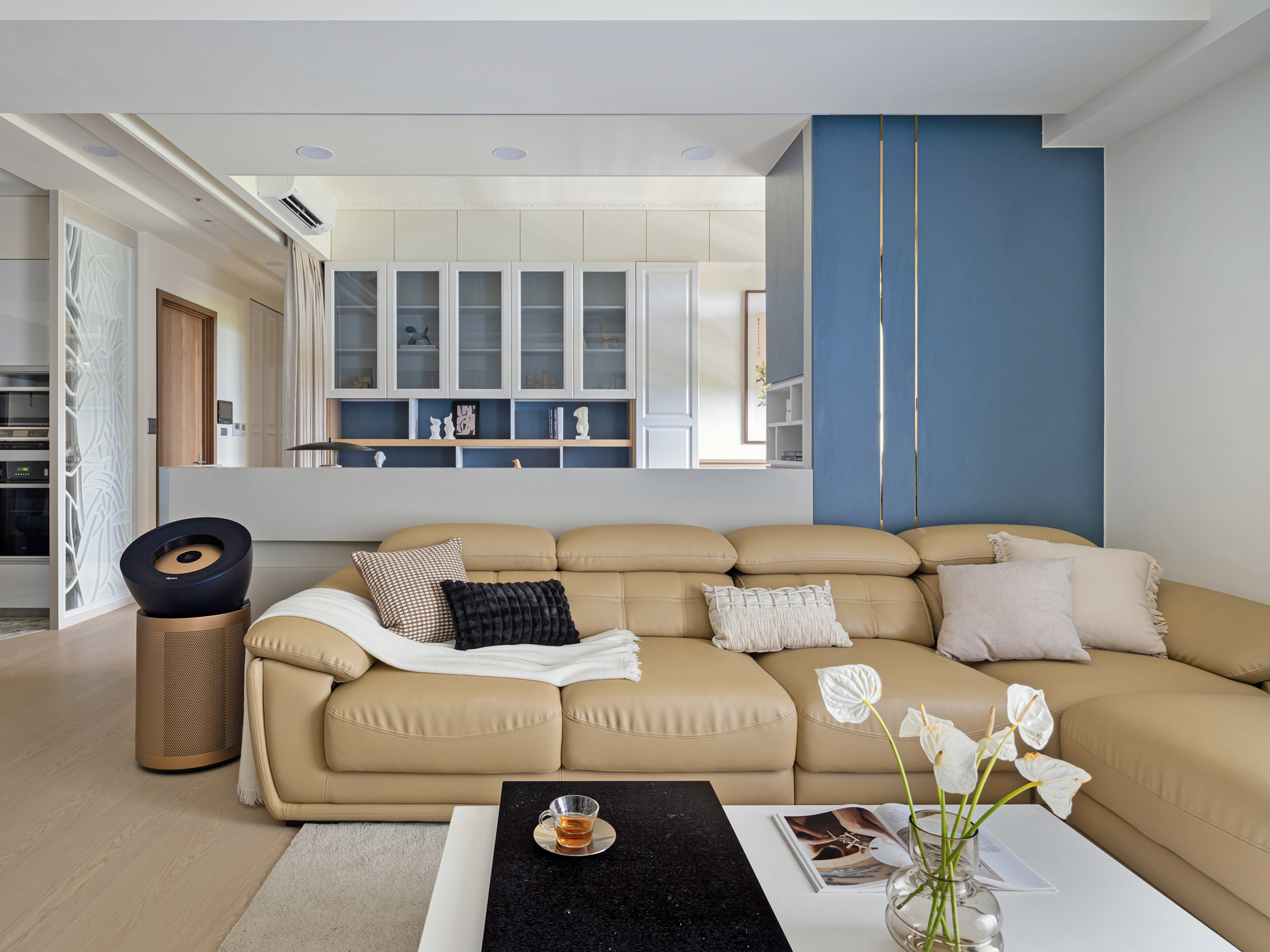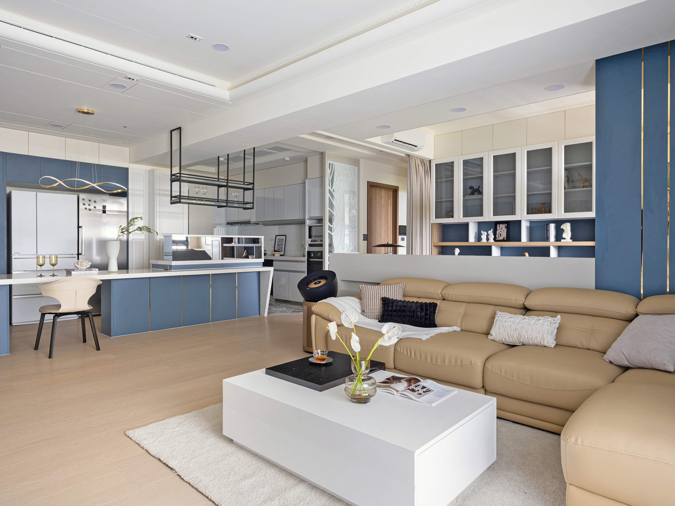 设计选材:透過金屬元素與精緻線條造型巧妙結合,搭配柔和舒適的奶茶色調與優雅清新的藍色,賦予整體空間優雅的法式輕奢風格,讓寧靜淡雅的生活氣息充滿在每個角落。