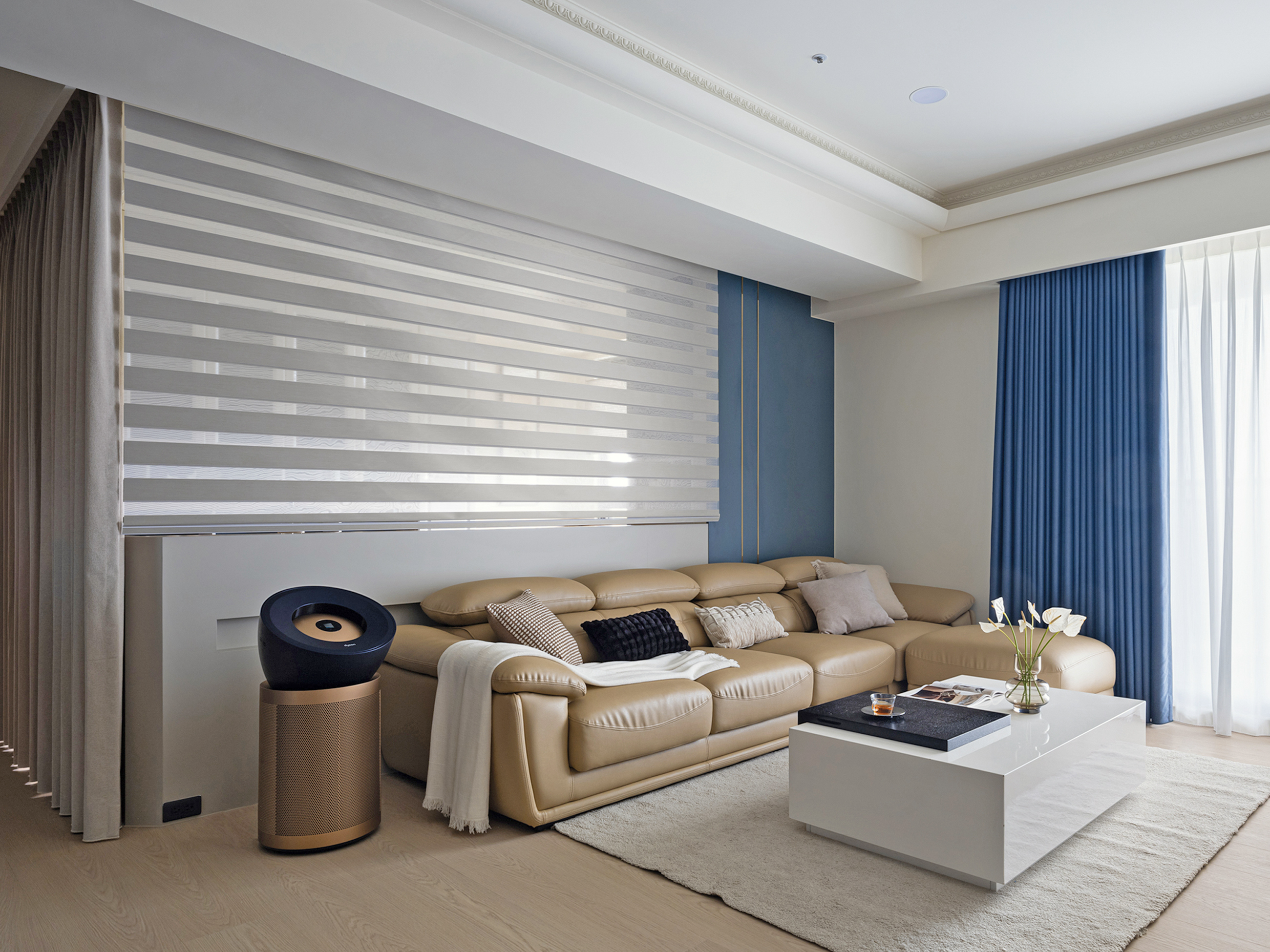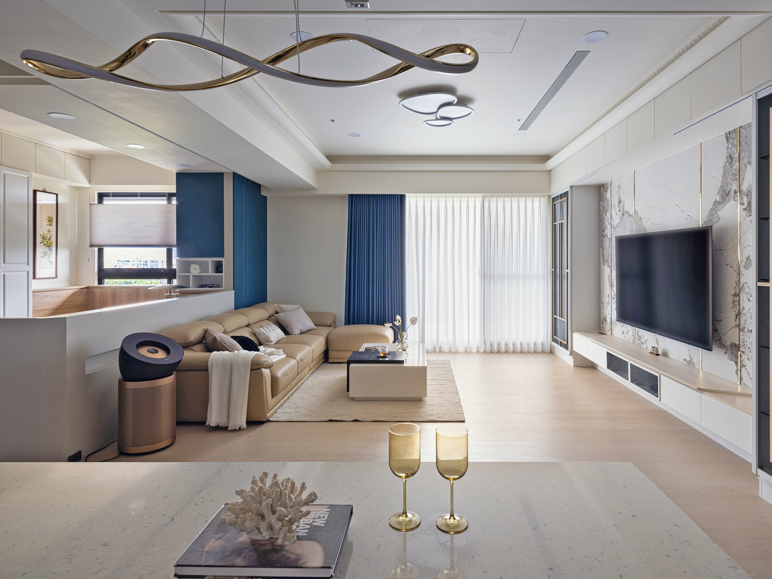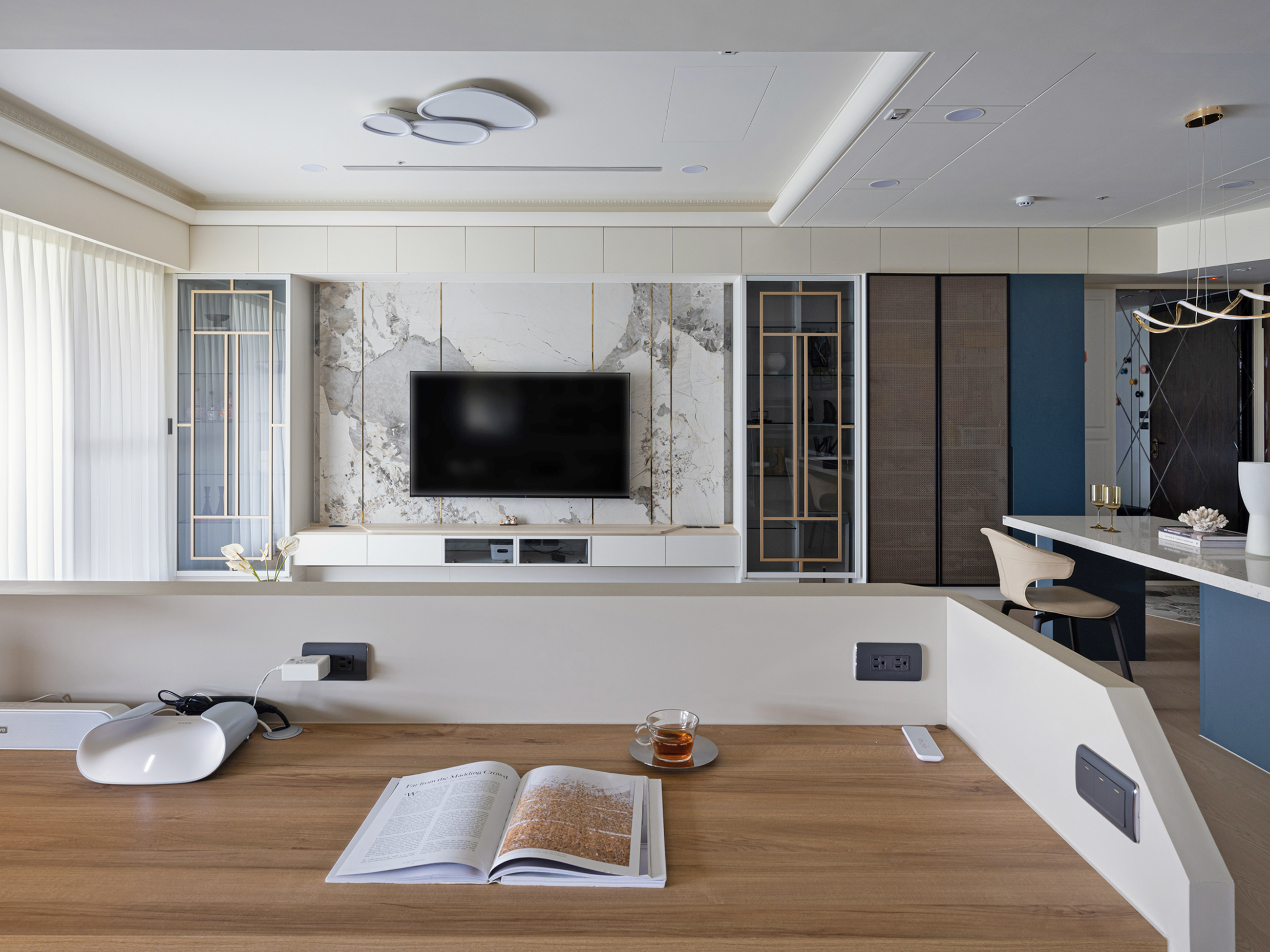 以簡潔白色電視牆作為視覺焦點,透過光與影的交織,醞釀出優雅安定的生活氛圍