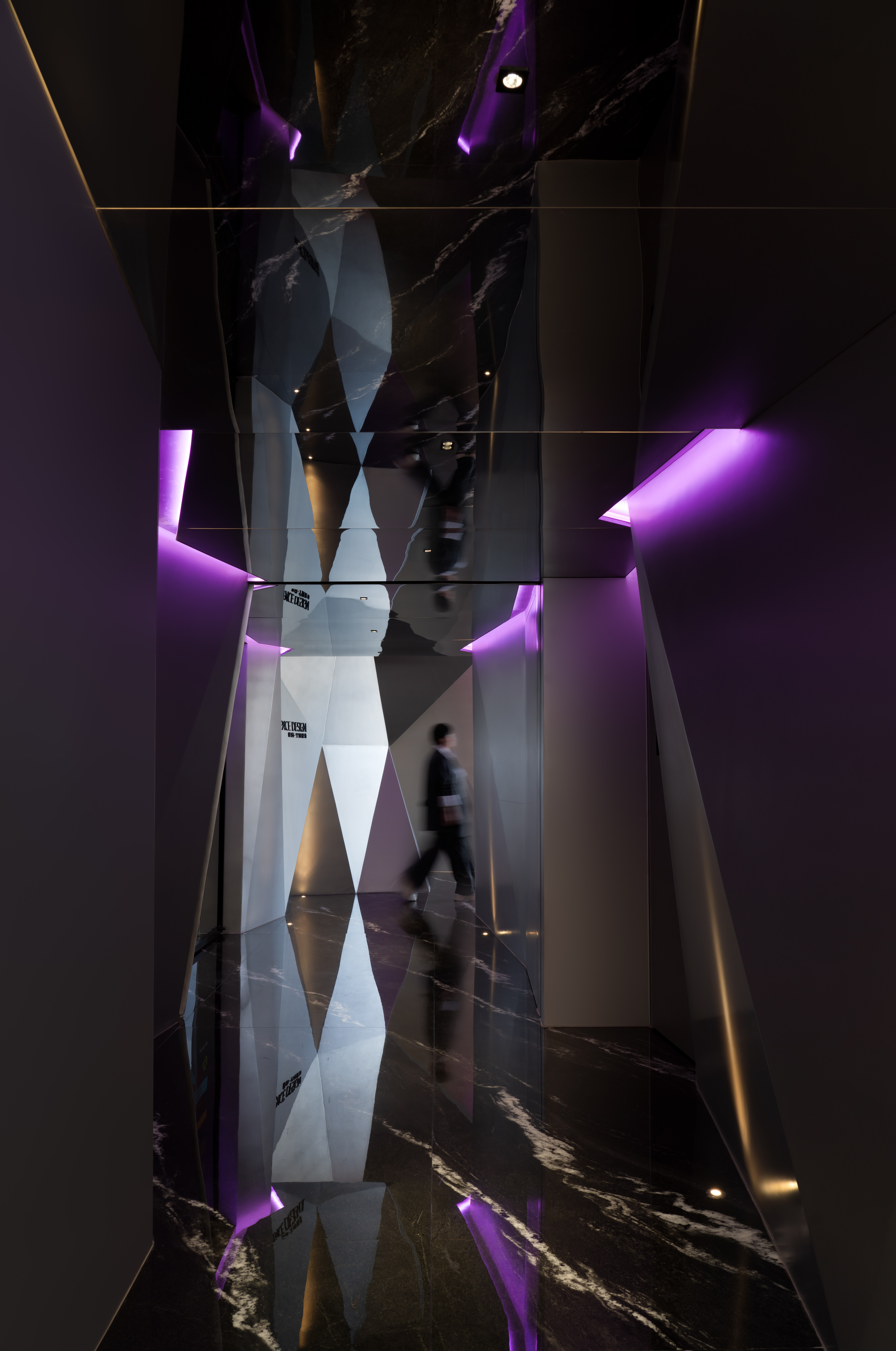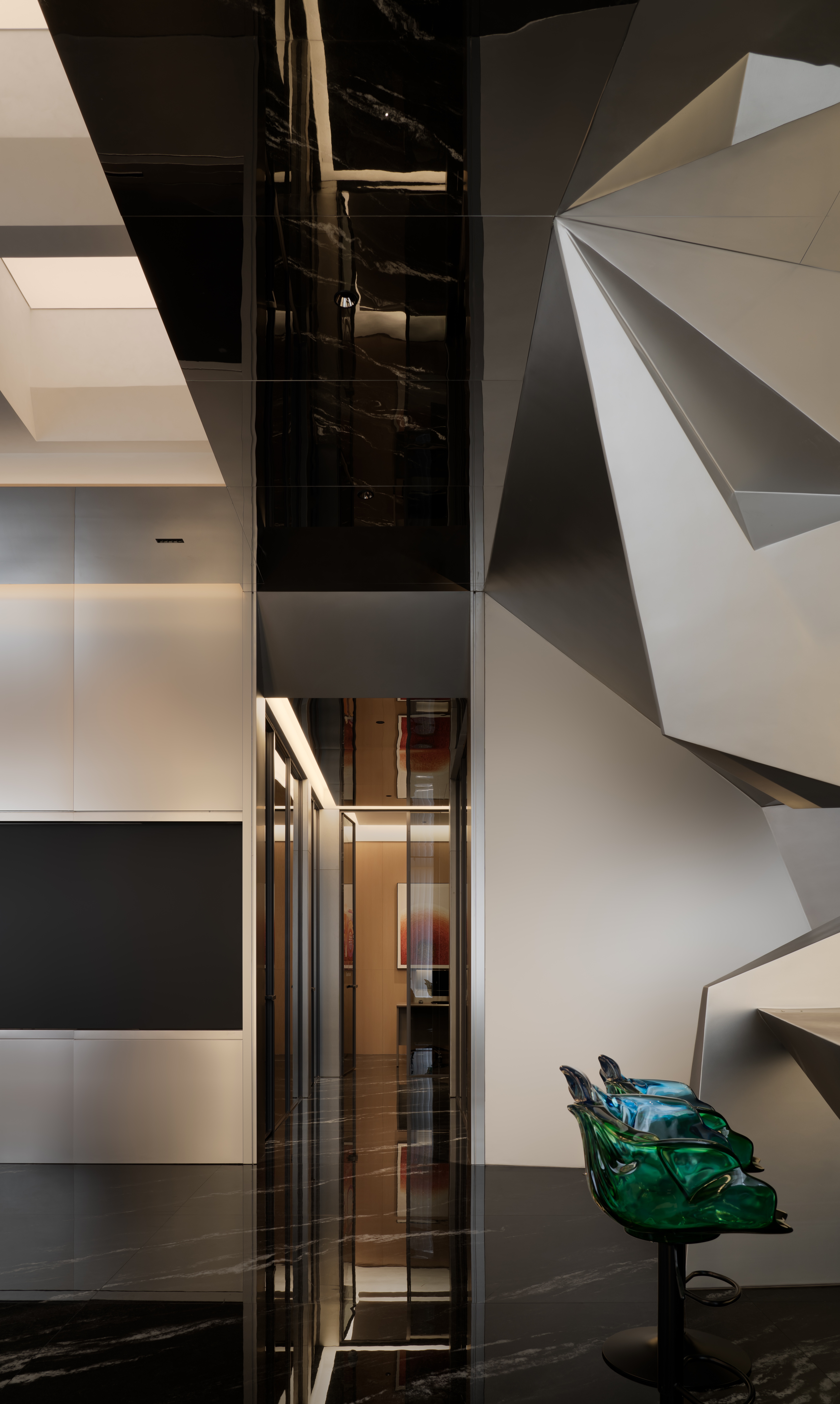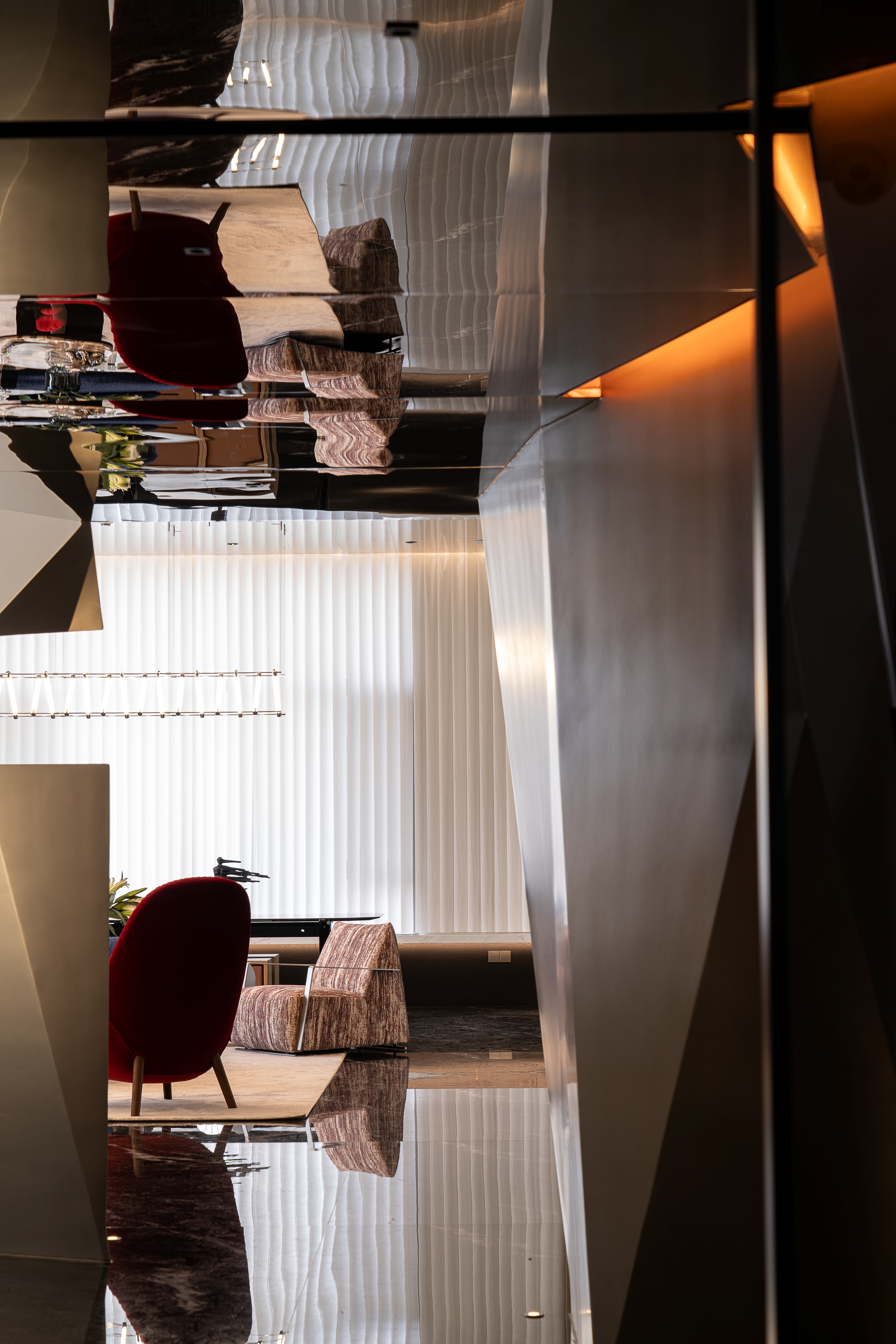 设计选材:通过使用镜面和不锈钢等现代材料,扩大空间感,营造出无限延伸的视觉效果,保持空间的交融与连续性,创造出自由“无界”的氛围。