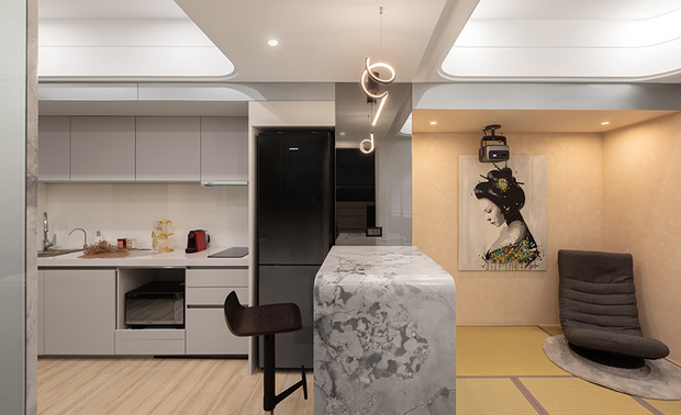 踏进公领域,目光首先被格栅牆面吸引,嵌入的垂直灯带自细密木条间流洩而出,光影层迭交织,为空间铺陈日系沉静的韵律基调;旁侧大理石主牆与吧台旁的灰镜组合,巧妙将有限空间向深处延展,令视线在层层倒影中找到开阔出口,压迫感瞬间消弭无踪;前方,一桌两椅一凳的简约配置,打破传统客厅的沙发印象,让餐区化身为弹性舞台:当电视萤幕投映简报内容,餐桌瞬间转为专业会议场域,当艺术画作斜倚格栅牆面,此处又摇身成为美学品味的展演空间,日常在多重场景间流畅转换,处处蕴藏生活的无限可能。
