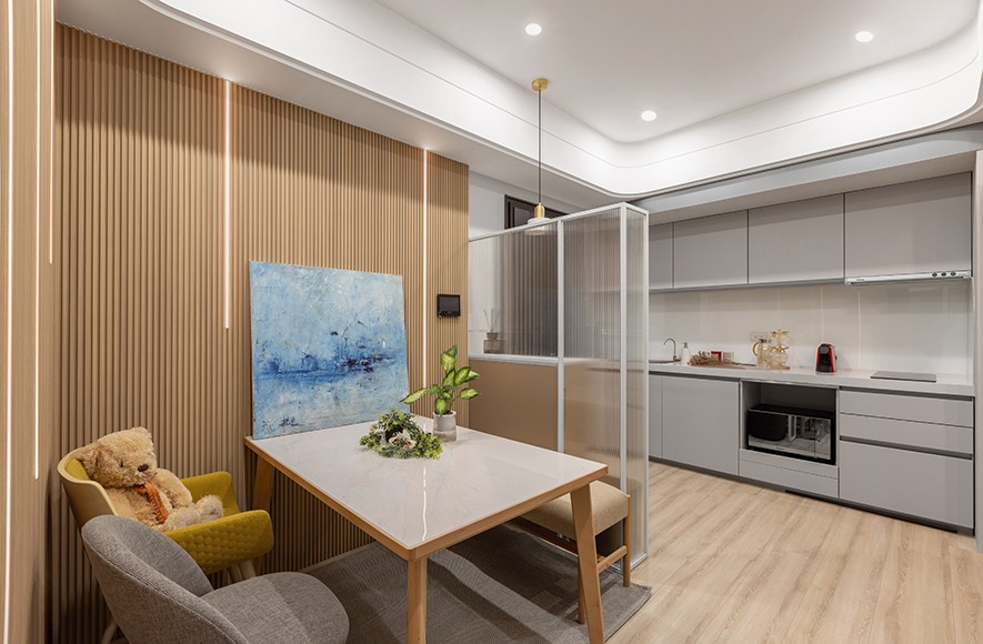 曦光穿透长虹玻璃的朦胧纹理,在空间中缓缓流转,与奶茶色调与温润木质相互依偎,营造柔和宁静氛围;灰镜映照日常光影变幻,将有限空间延展成无垠想像,令视线在虚实之间自由呼吸;空气中飘散着兰草的清雅香气,为每个角落都披上一层诗意的面纱;无论是吧台边独享的晨间咖啡时光、餐桌前沉浸的午后阅读片刻,还是榻榻米上慵懒的黄昏观影时分,所有烦忧都烟消云散,取而代之的,是心灵被温柔包裹的安定感。