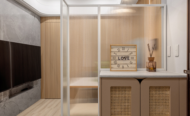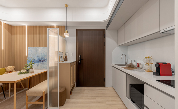 推门而入,右侧长虹玻璃隔屏以半透光影温和划分内外界线,为来访者保留一方视线过渡的馀裕。光线穿过细腻纹理,在奶茶色调的玄关柜体上投映出斑驳光晕,柔和色泽与周遭温润木质相互呼应,为随身物品预留专属归处;左侧则是一字型厨房区域,以相同色系柜体延续明亮基调,白色檯面映衬明淨俐落的料理动线,镜面电器柜嵌入其中,倒映微光,入门视野在实用与美感间和谐共存。在这方寸之间,既是隔绝外界喧嚣的终点,也是归家卸下繁忙的仪式起始。