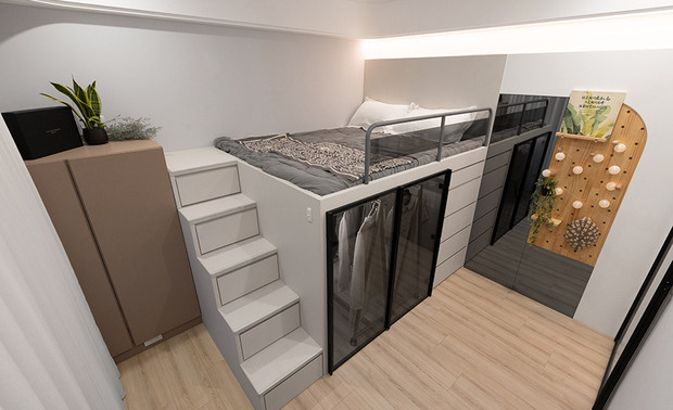 架高床体轻盈托起睡眠区域,保留原始楼高的舒展感;木质楼梯以手工榫接工艺层层铺陈,扎实触感传递温暖质地,床侧护栏确保夜间安眠无忧;床下收纳区井然有序——180度开展的门片轻启,可拉式衣杆顺滑而出,清晨选衣成为从容优雅的日常仪式,形塑精緻而不失温度的私密天地。
