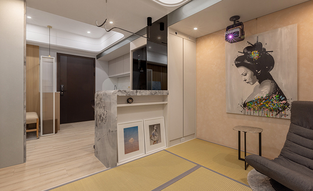 白日裡,光线自窗櫺、透过调光帘的层次筛落,在国宝级老工匠手作铺陈而成的兰草榻榻米席面上描绘光影律动,配合其散发天然纤维的清雅香氛、质朴祥和的触感唤醒内心的平静;夜幕低垂时分,超短焦雷射投影机将影像直射于对面矿物涂料牆面,无需投影布便轻鬆化身私人影院,实现开放通透、承载欢聚、放鬆休憩的复合场域,每一刻停留,都是心灵被温柔包裹的时光。