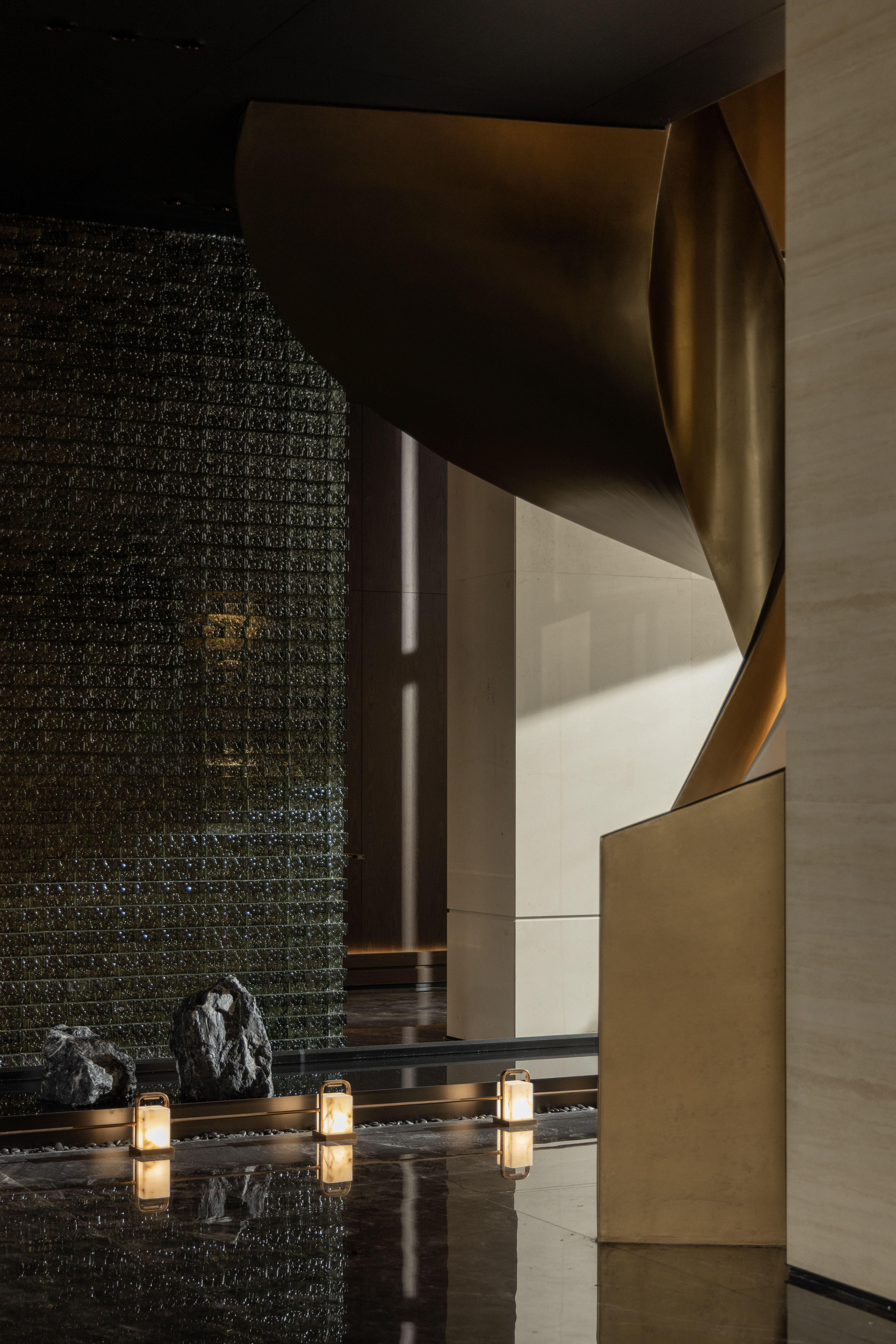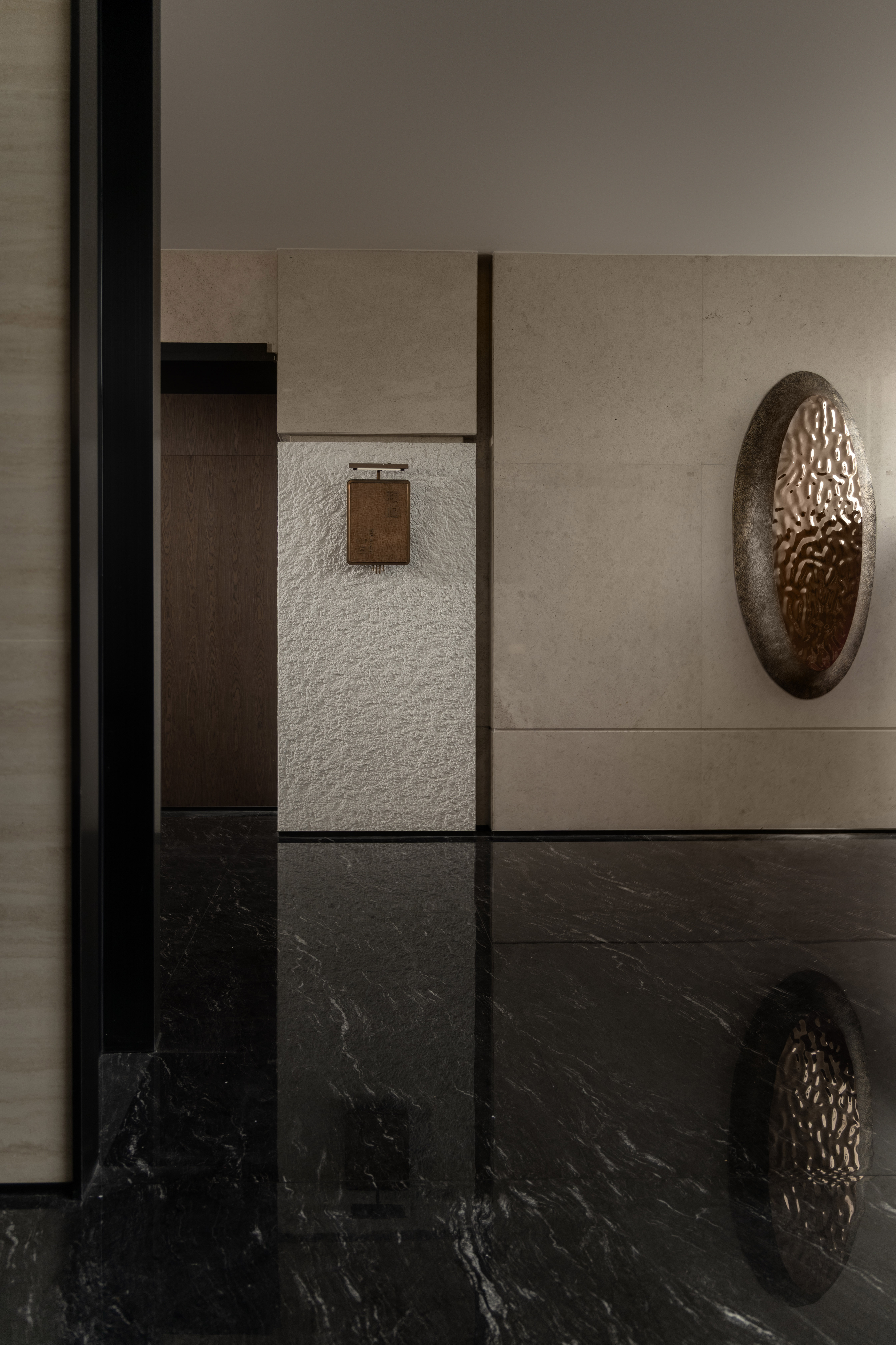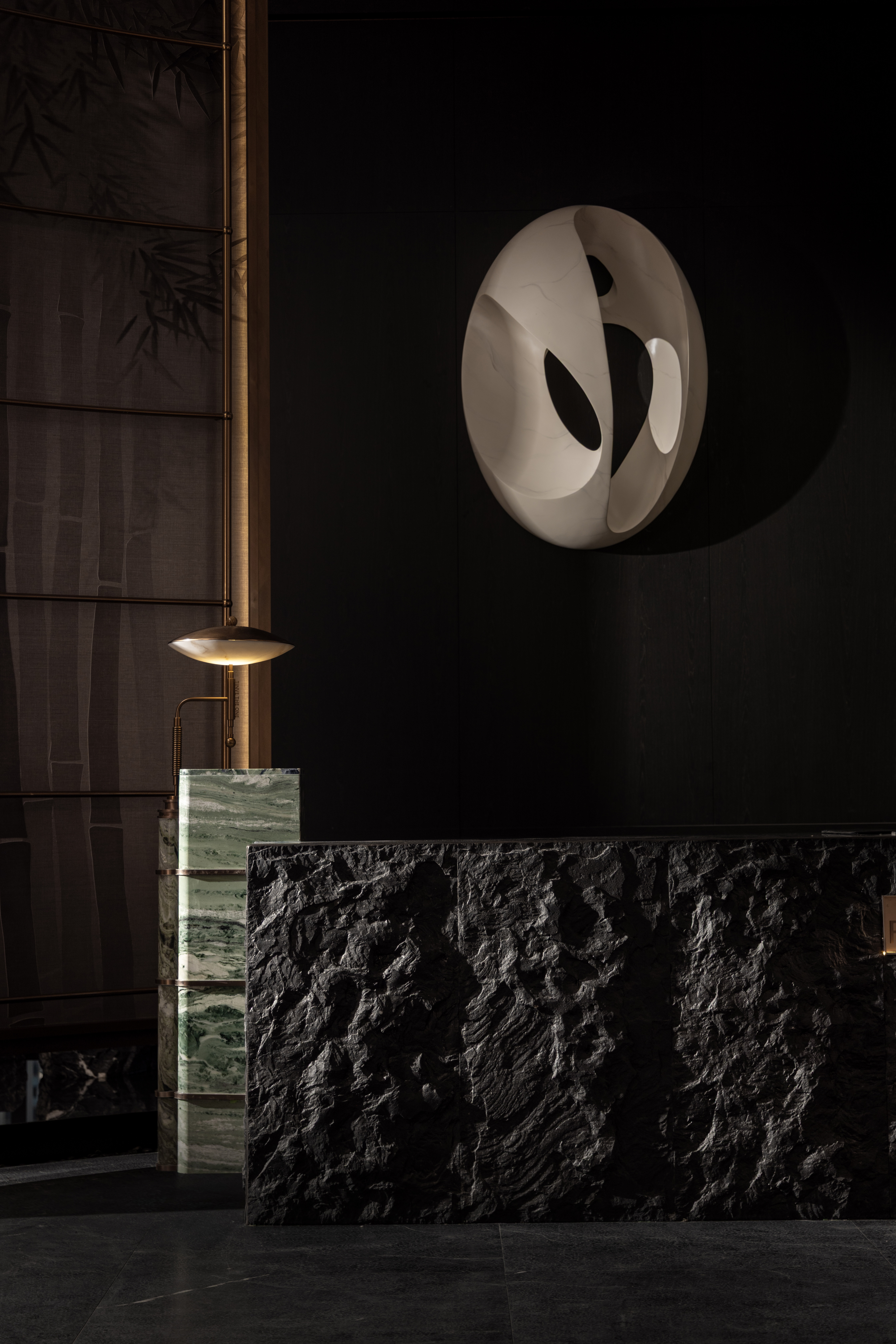 设计选材:选材上注重材质本身的肌理、温度与情感属性,并强调对比与对话的创新运用。例如:绿色琉璃砖远观如山峦叠翠,近抚如古玉温润,赋予墙面内敛的生命力;艺术雕塑《共和之门》以奇石形态成为空间锚点,《疏影流金》运用岩彩与烧箔模仿自然光影,材质成为艺术与情感的载体。在关键节点使用特色材质创造记忆点的同时,大面积采用温润石材、实木饰面、低饱和度织物等经典、耐用且感官舒适的材质,确保了空间的长期品质与耐久性。克制的光影设计不仅营造氛围,也减少了能源消耗,体现了对环境与运营经济性的双重考量。