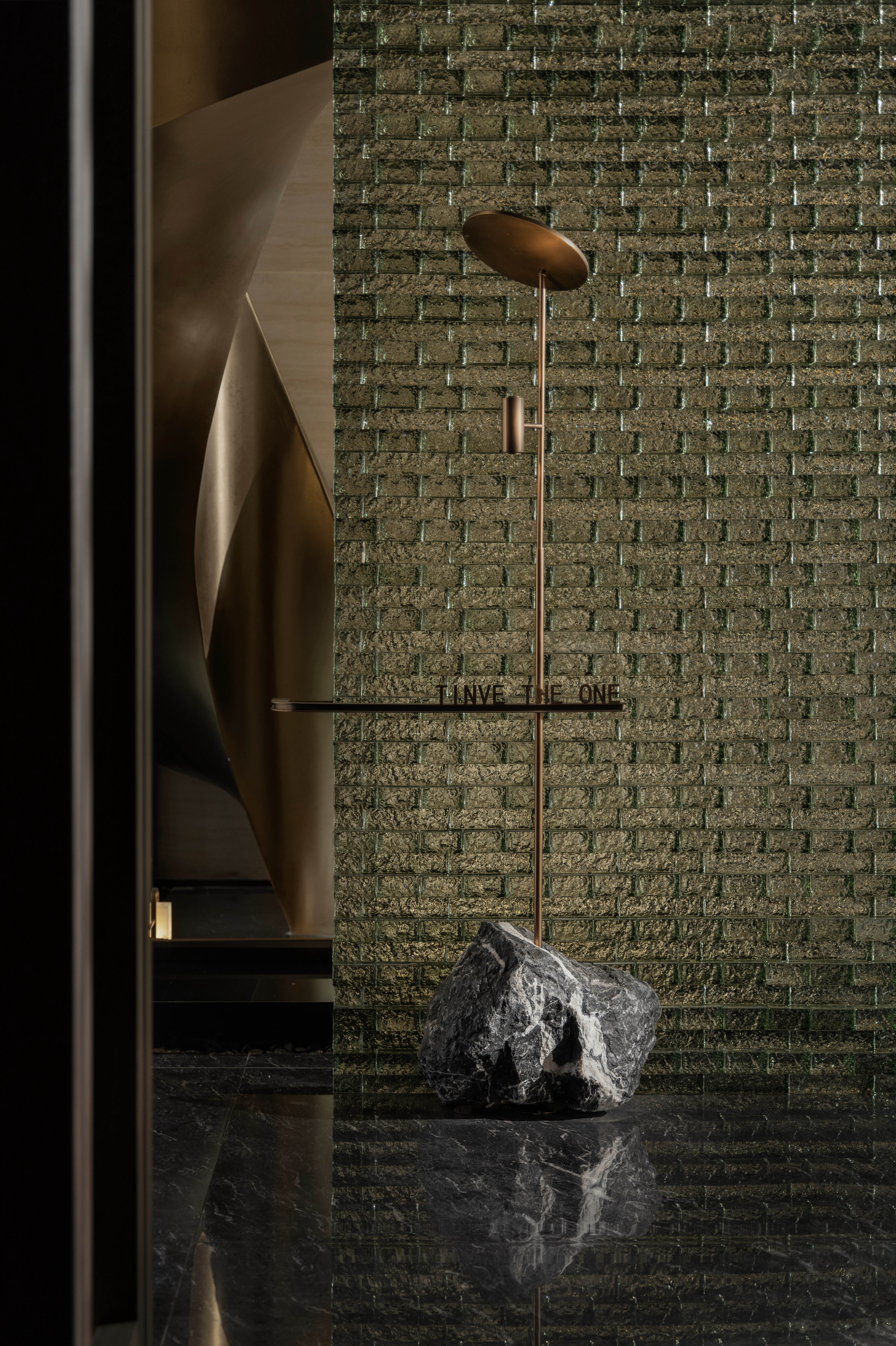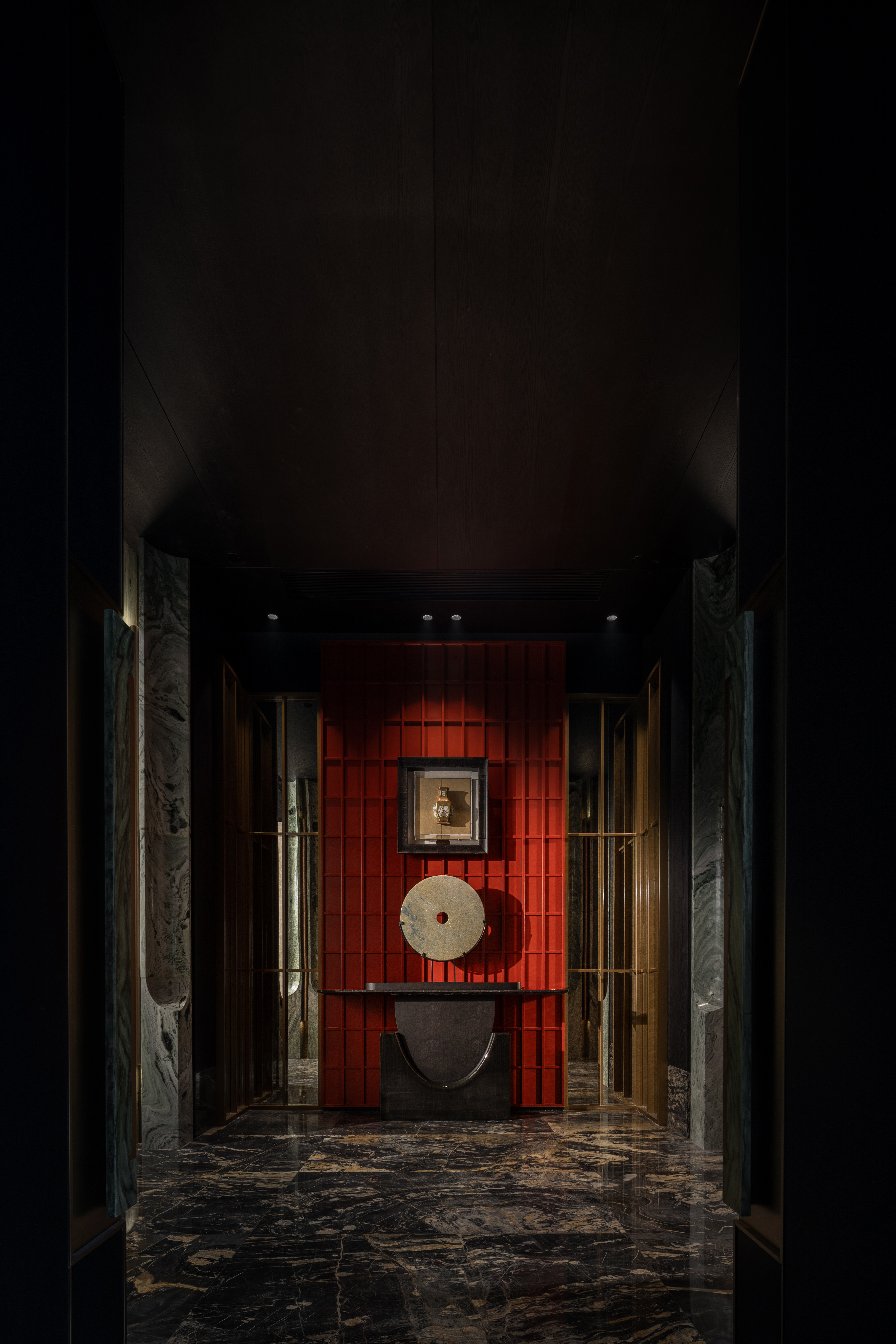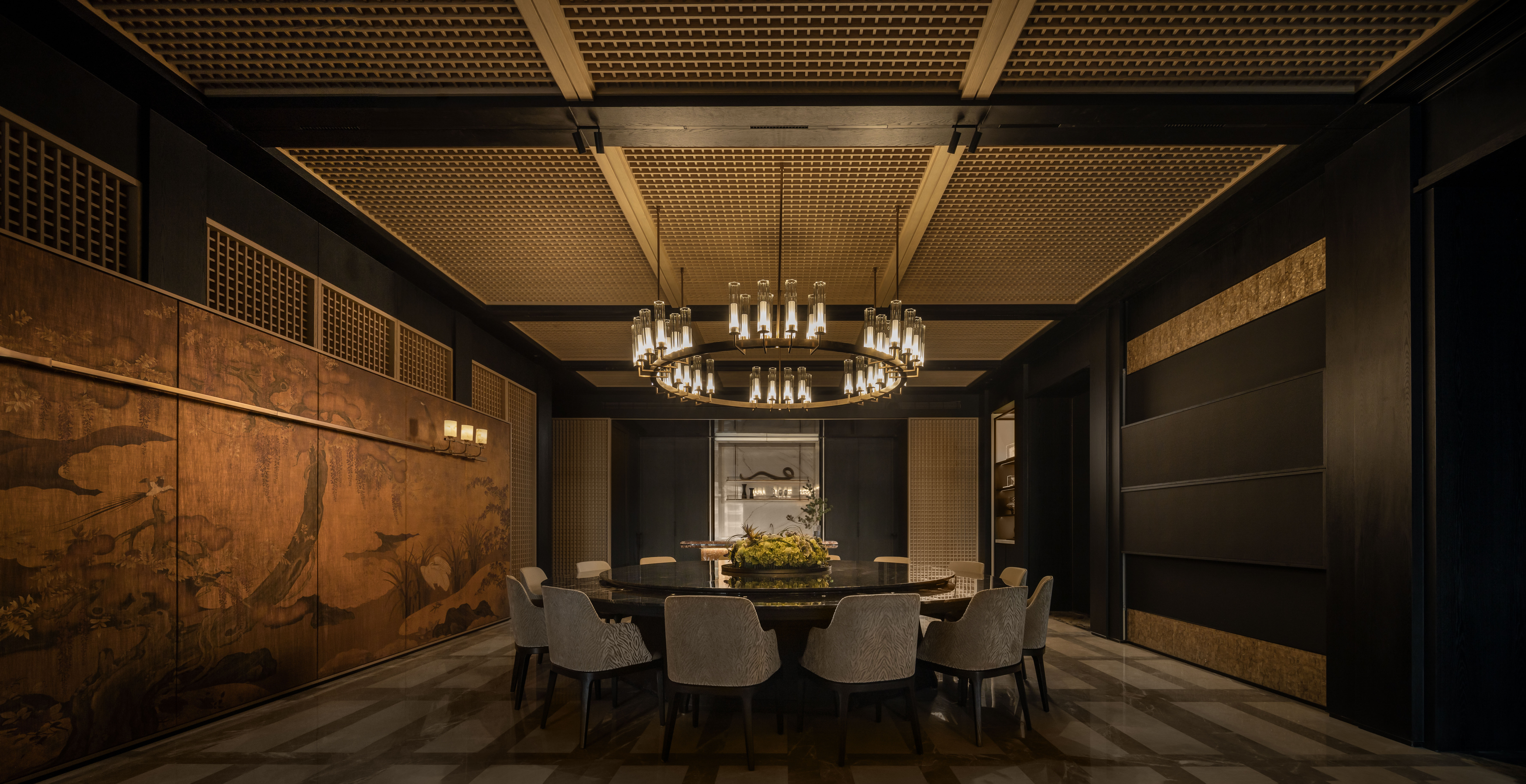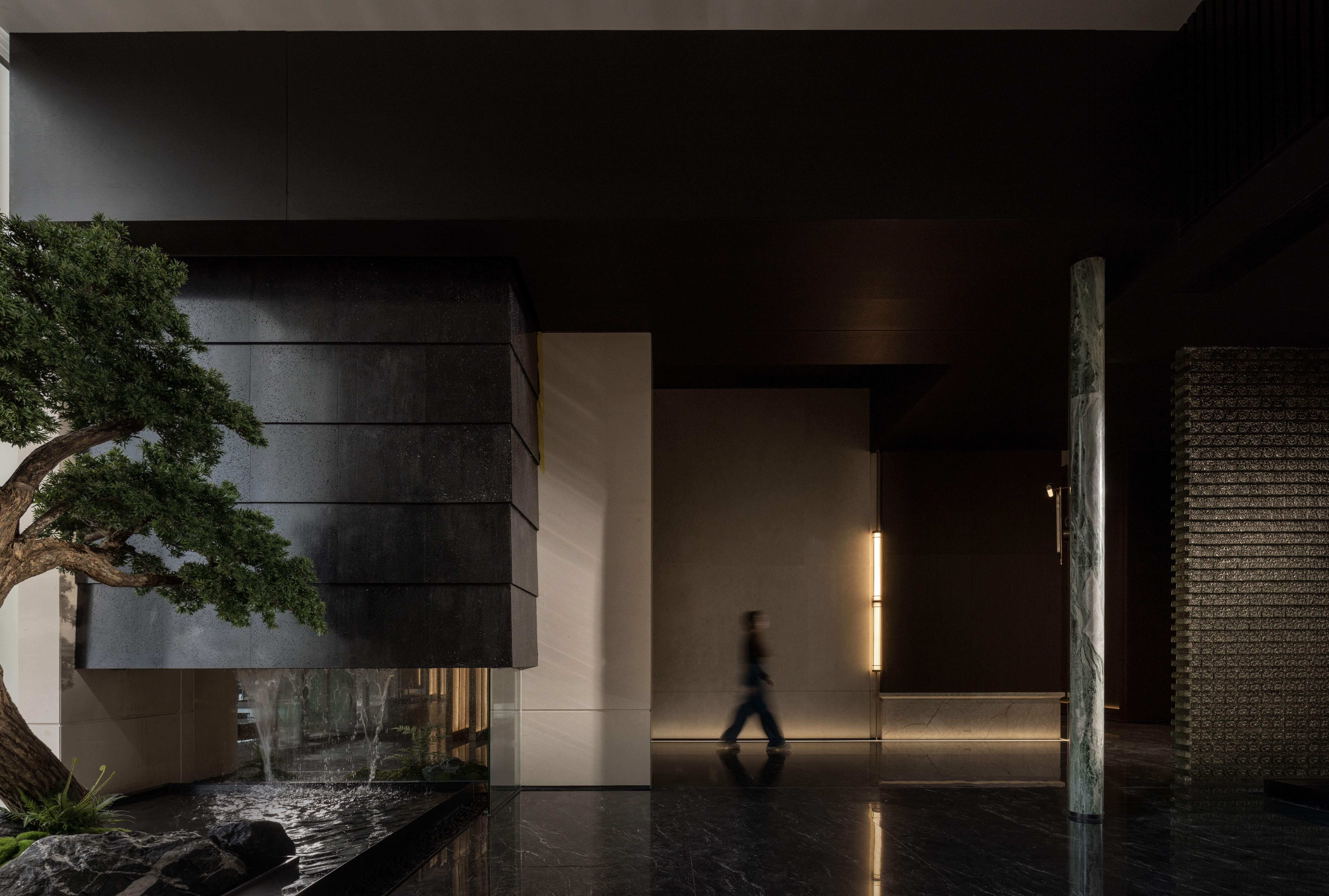 设计选材:选材上注重材质本身的肌理、温度与情感属性,并强调对比与对话的创新运用。例如:绿色琉璃砖远观如山峦叠翠,近抚如古玉温润,赋予墙面内敛的生命力;艺术雕塑《共和之门》以奇石形态成为空间锚点,《疏影流金》运用岩彩与烧箔模仿自然光影,材质成为艺术与情感的载体。在关键节点使用特色材质创造记忆点的同时,大面积采用温润石材、实木饰面、低饱和度织物等经典、耐用且感官舒适的材质,确保了空间的长期品质与耐久性。克制的光影设计不仅营造氛围,也减少了能源消耗,体现了对环境与运营经济性的双重考量。