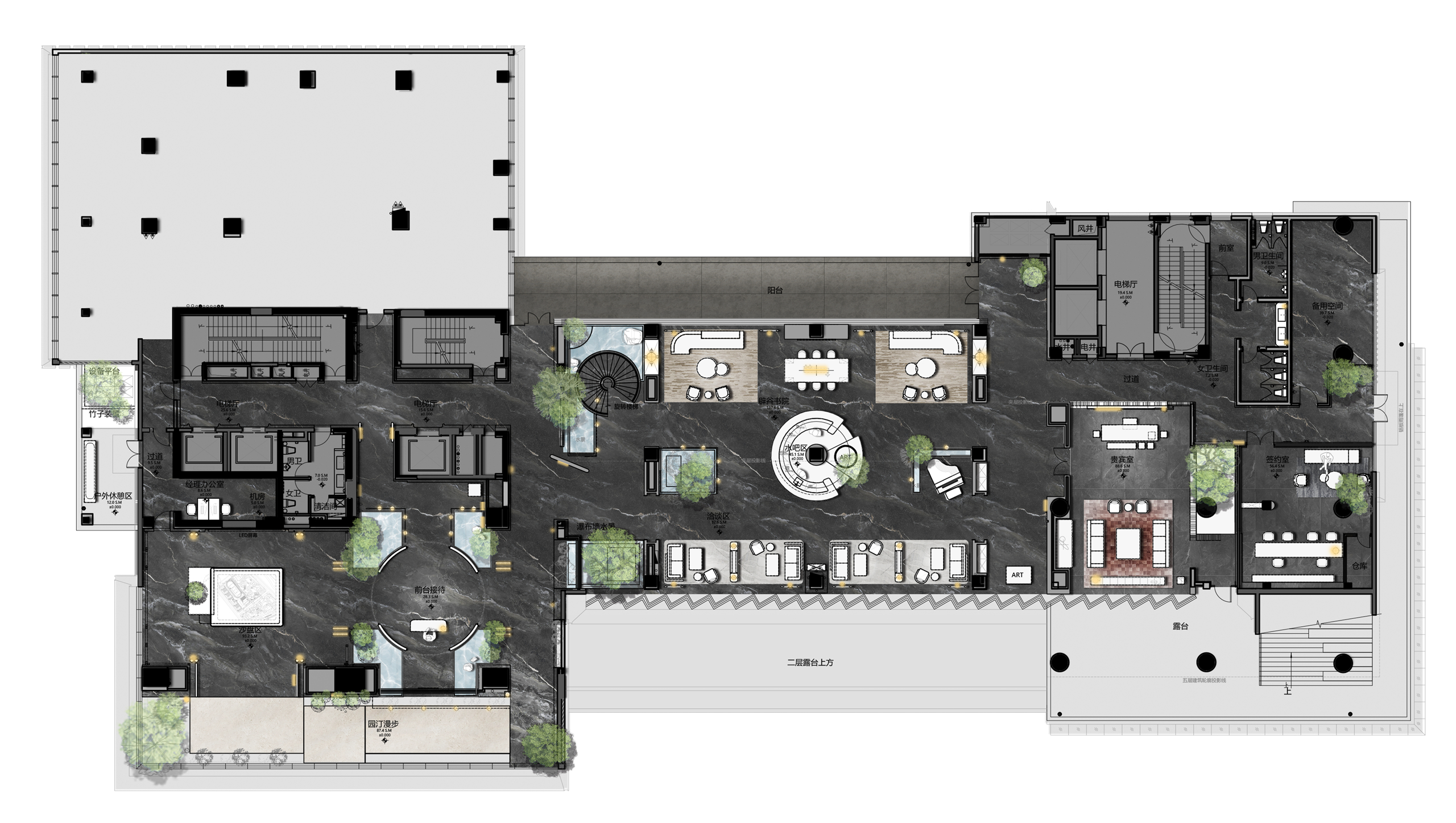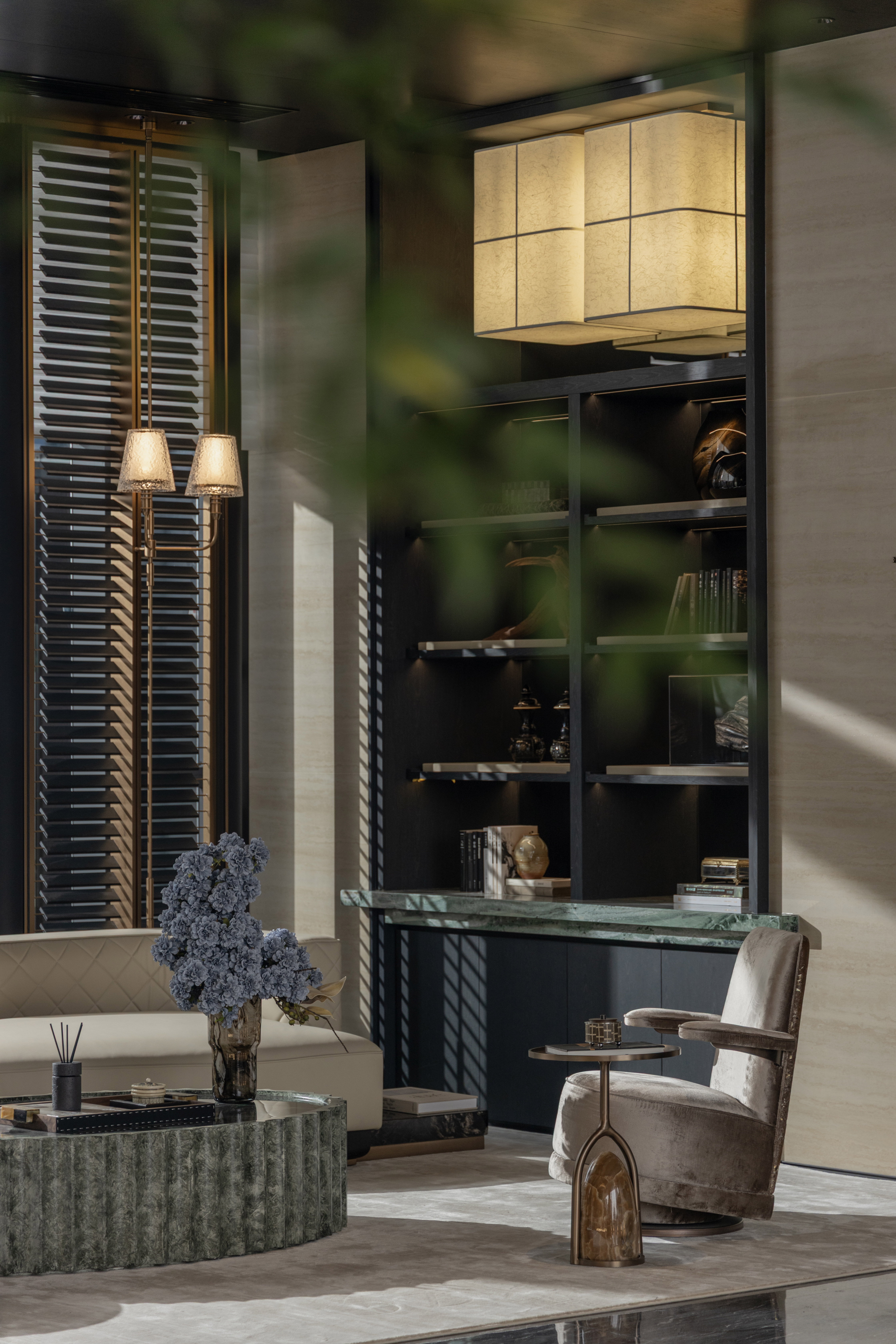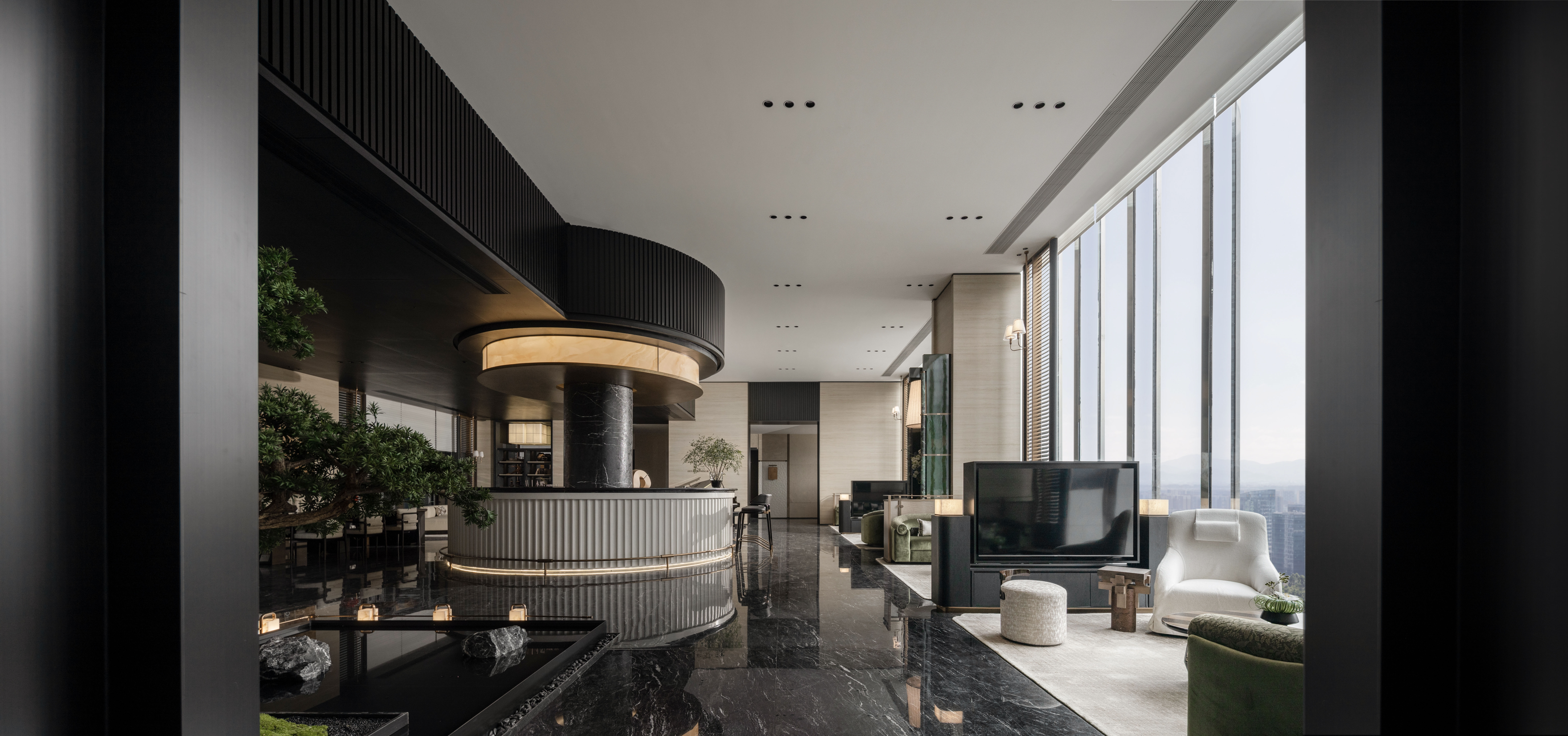 空间意境:在环境风格上,设计并未简单复刻传统符号,而是以现代设计语言转译东方美学精髓。创新性地通过 “光影叙事” 与 “材质诗学” 塑造场景:如电梯厅以克制的光影在金属与琉璃砖上“流转成诗”;池厅以潺潺水声与玉璧雕塑形成的“水中月影”光斑,构建时光静好的感官体验;沙盘区以流线型艺术吊顶摹写“云卷云舒”,将宏大蓝图融入山水长卷的意境。这种手法超越了形式的模仿,在虚与实、光与影、内与外的交融中,创造出具当代感且直指人心的东方意境。