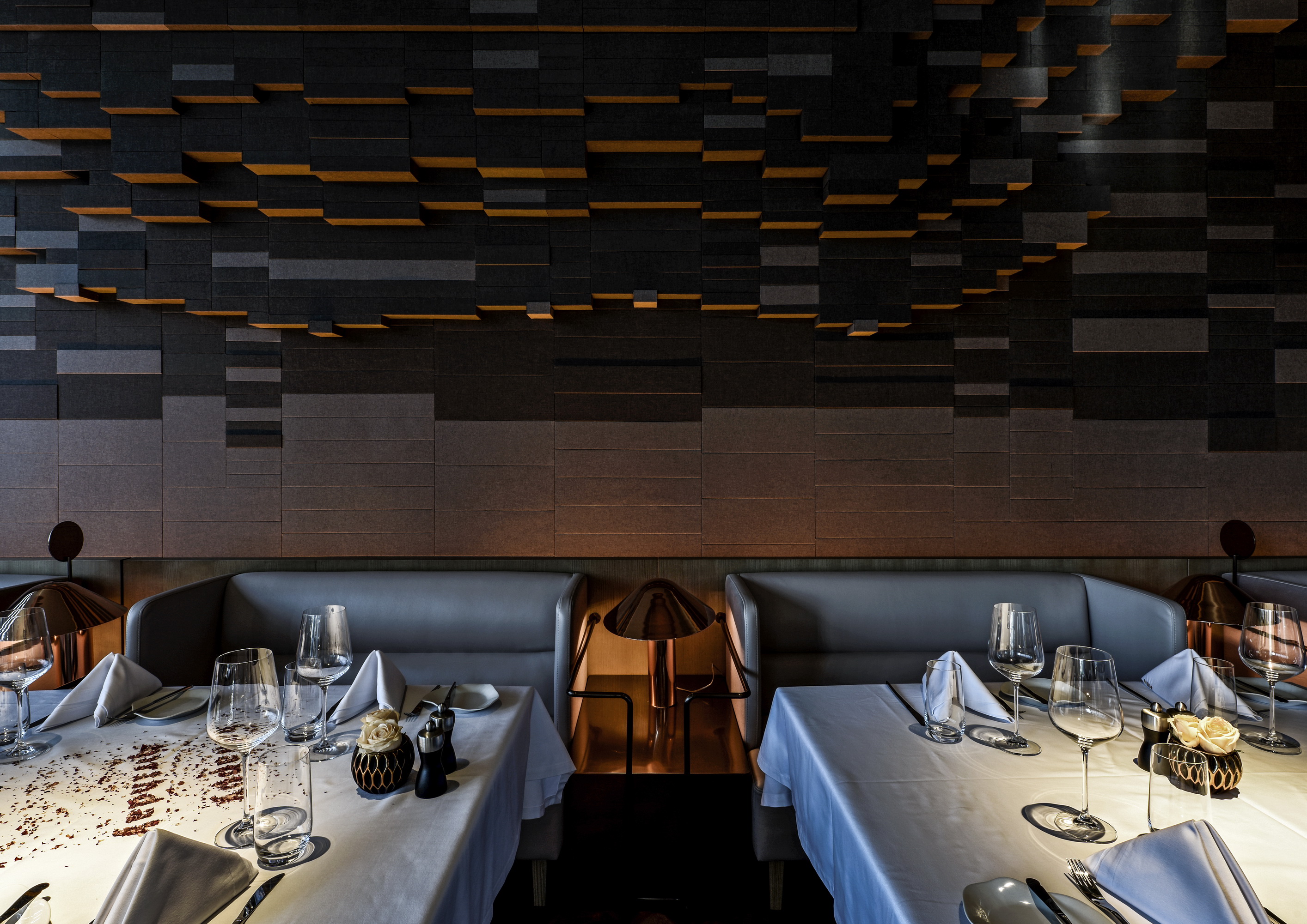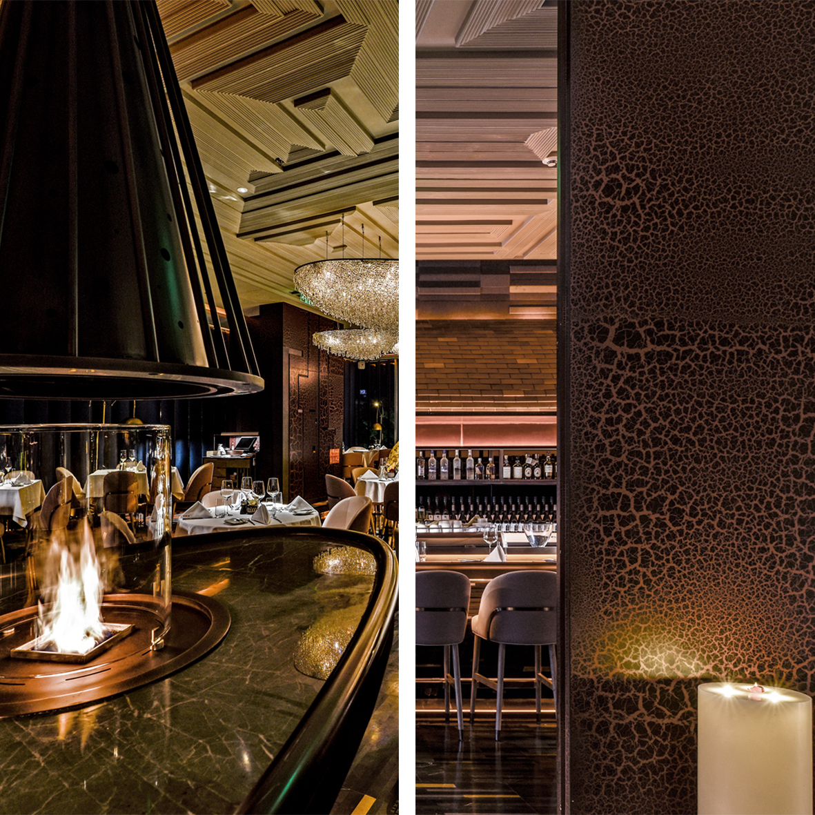 设计选材:青石、紫铜、铜砖、成品金属百叶、红色珠光漆、木饰面龟裂纹漆、麻布