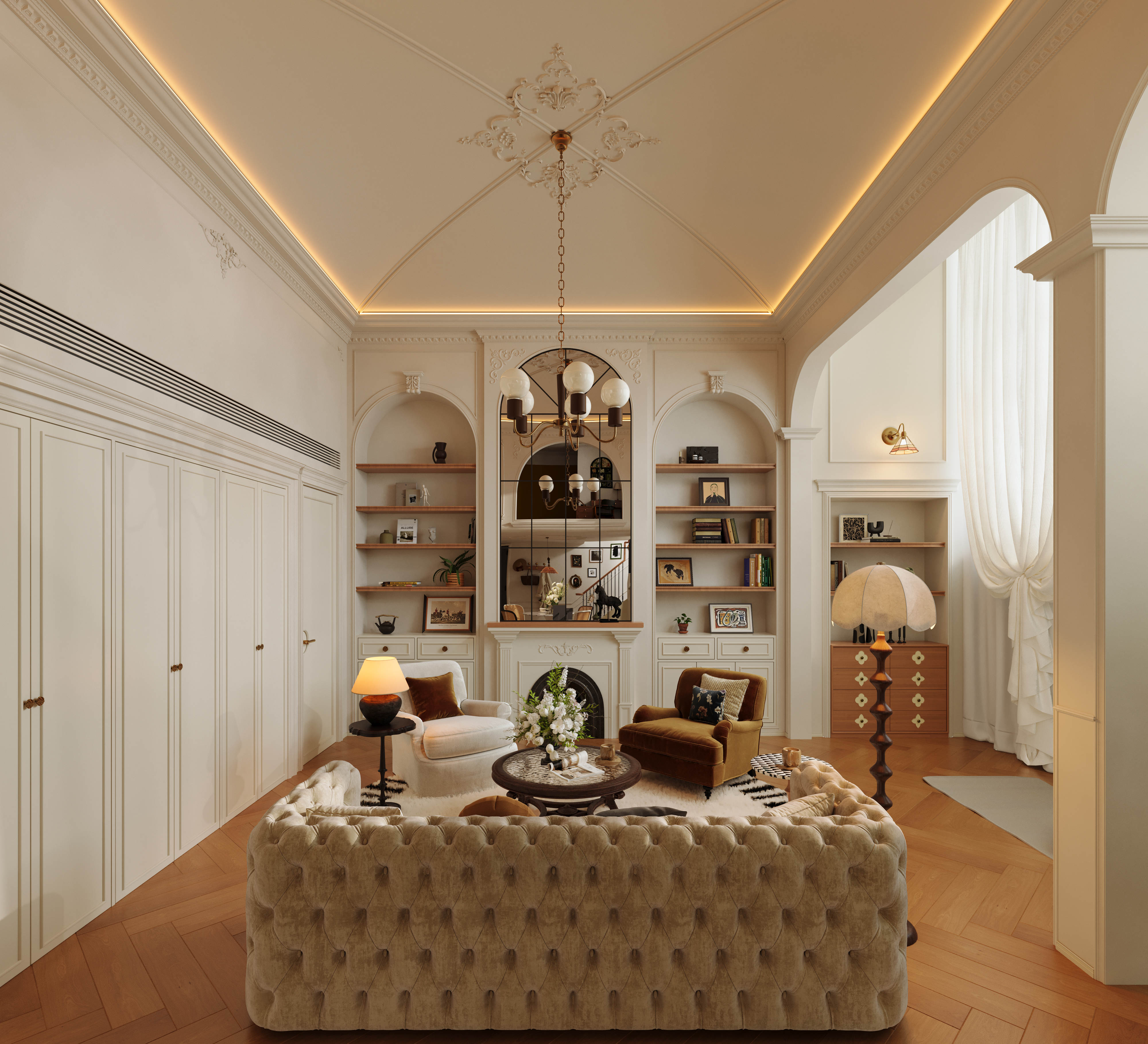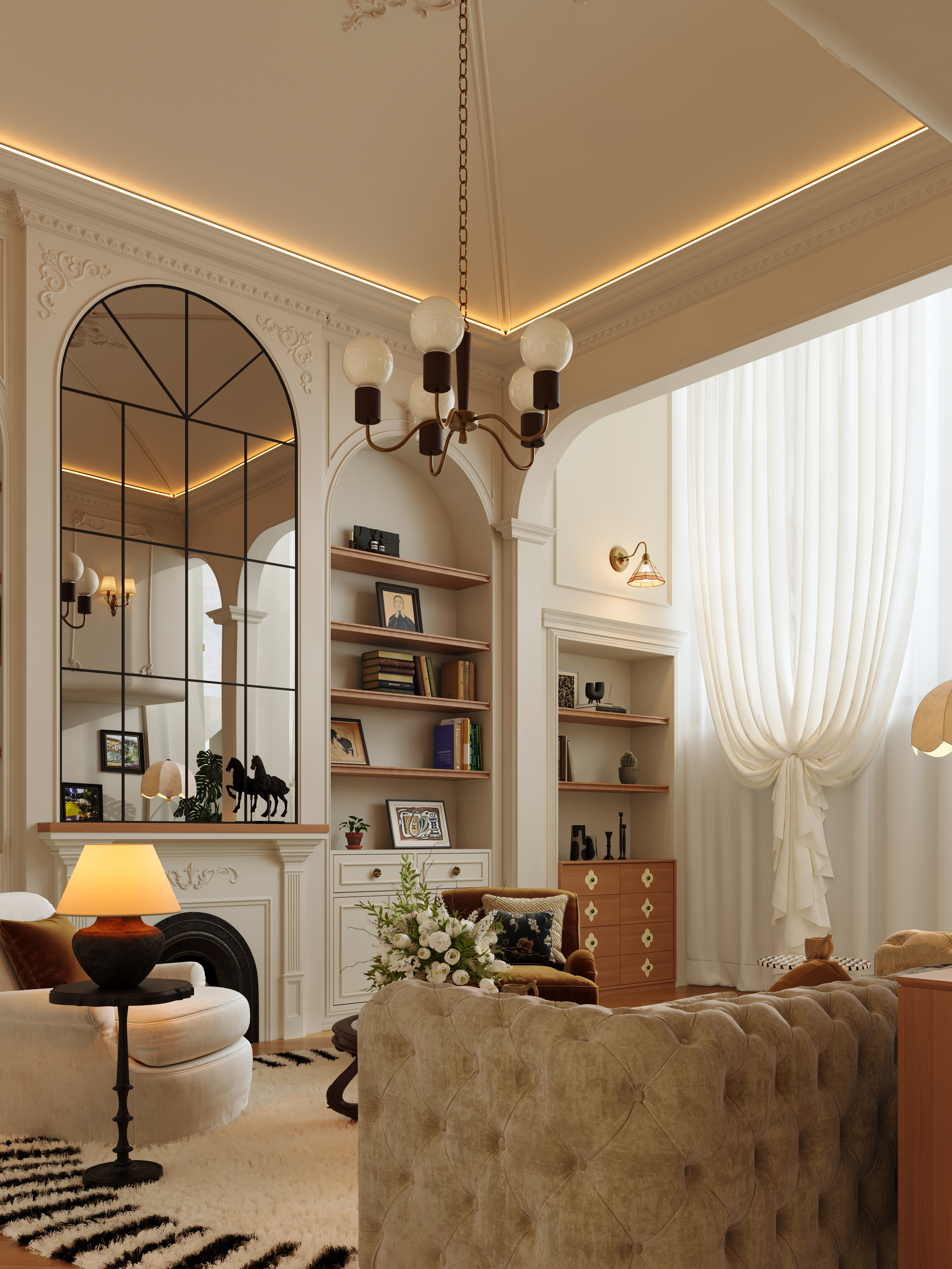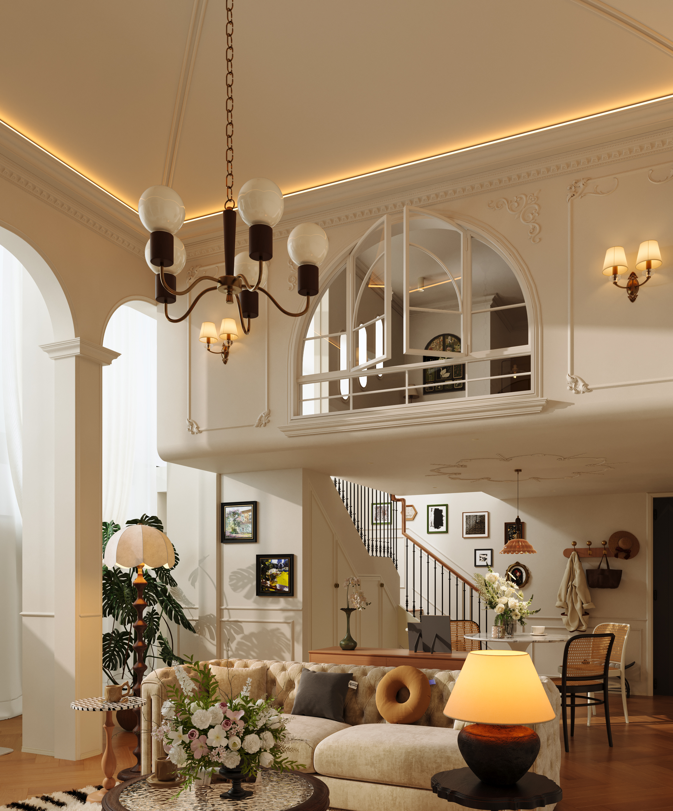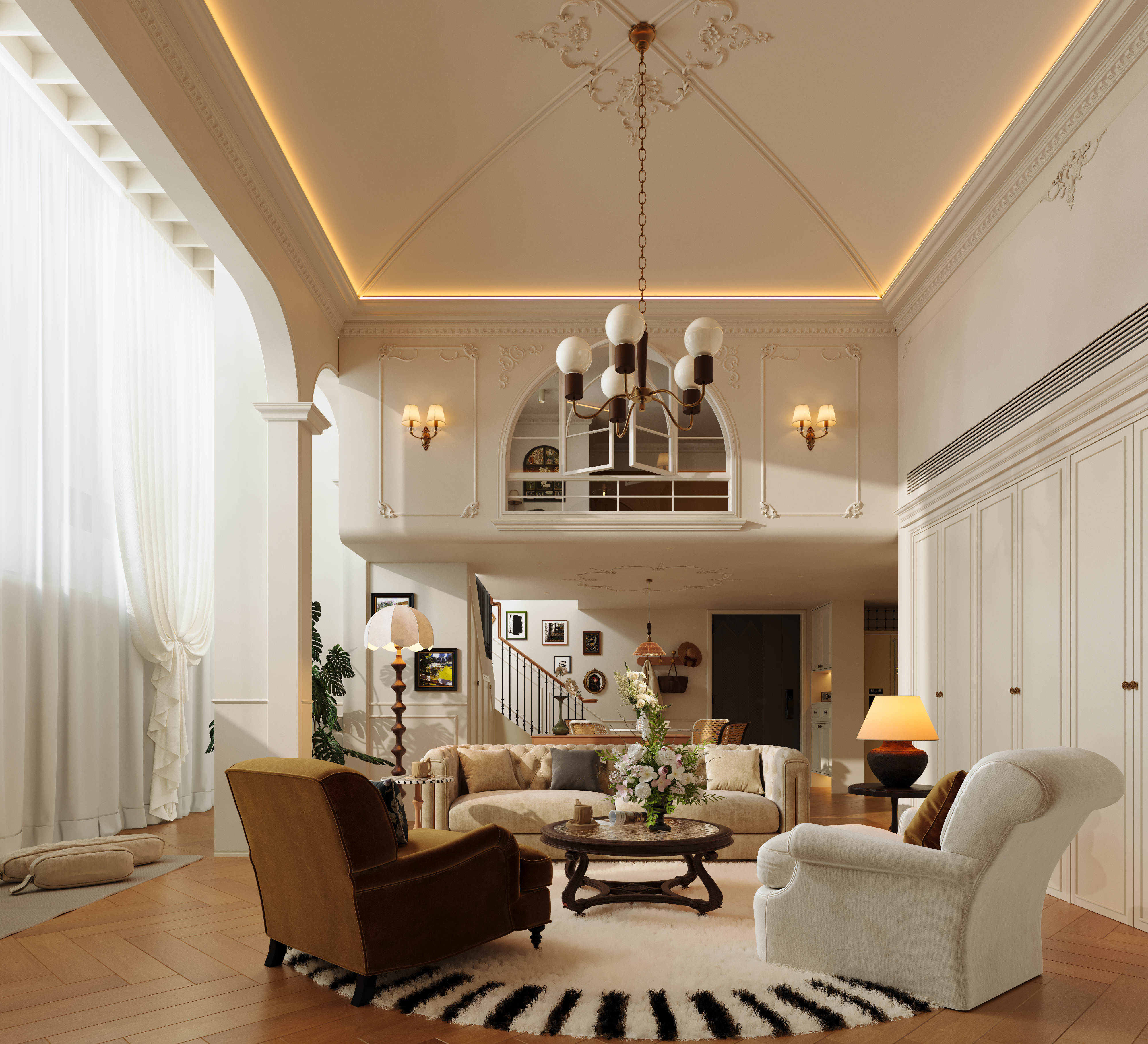 空间意境:剥离传统法式的繁复堆砌感,在保留浪漫优雅内核的基础上,通过材质轻量化、功能复合化、风格跨界化实现与现代生活的适配升级。