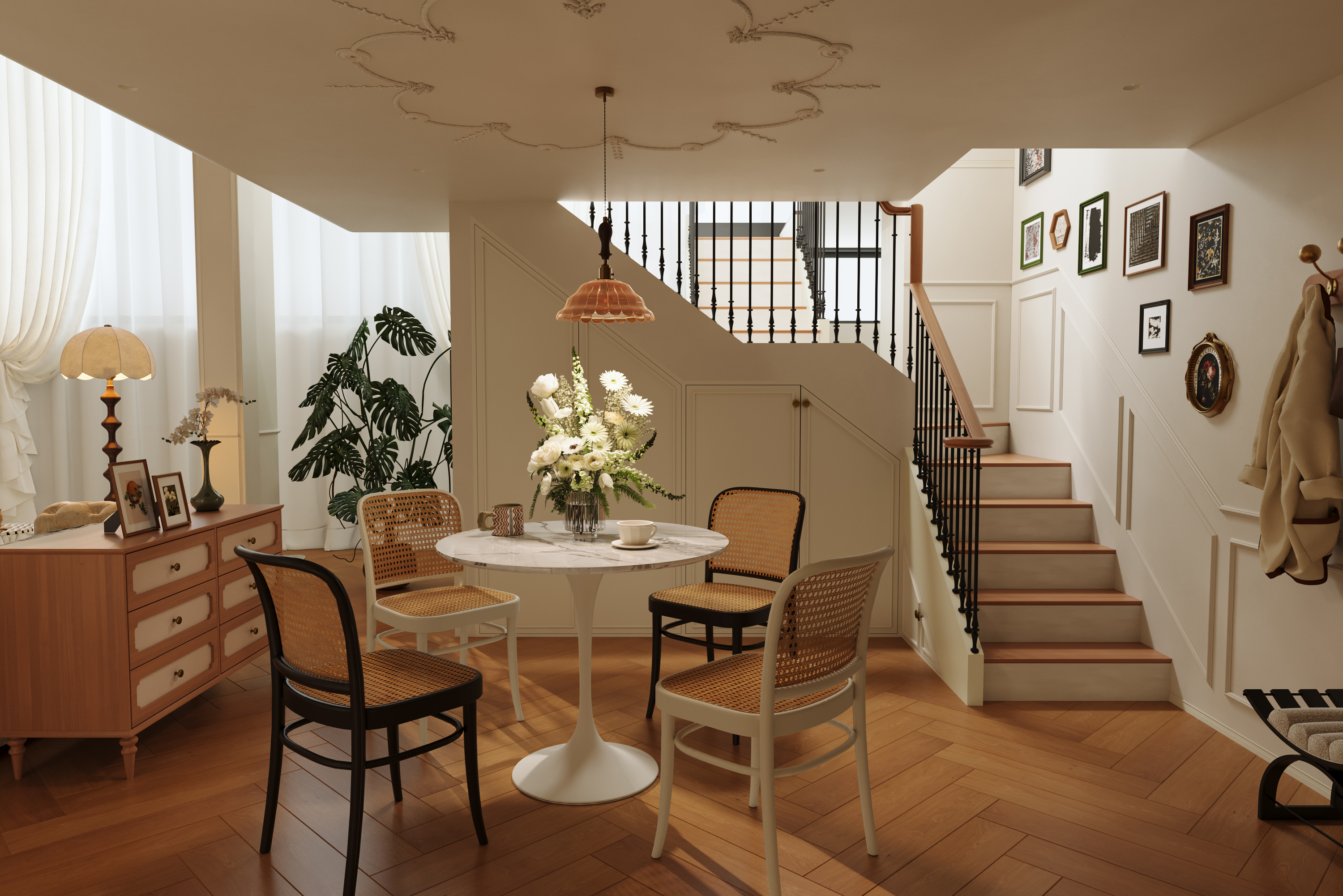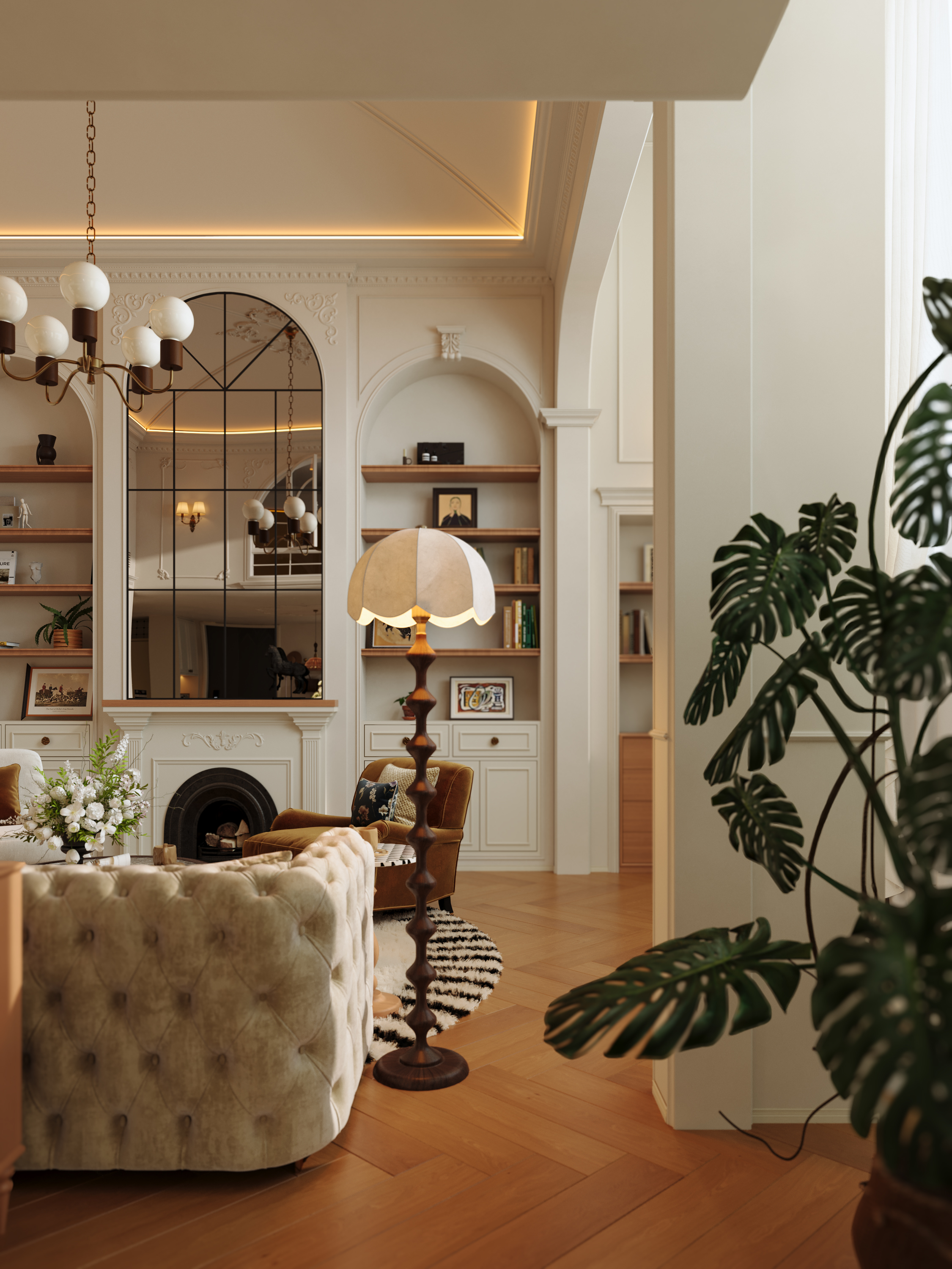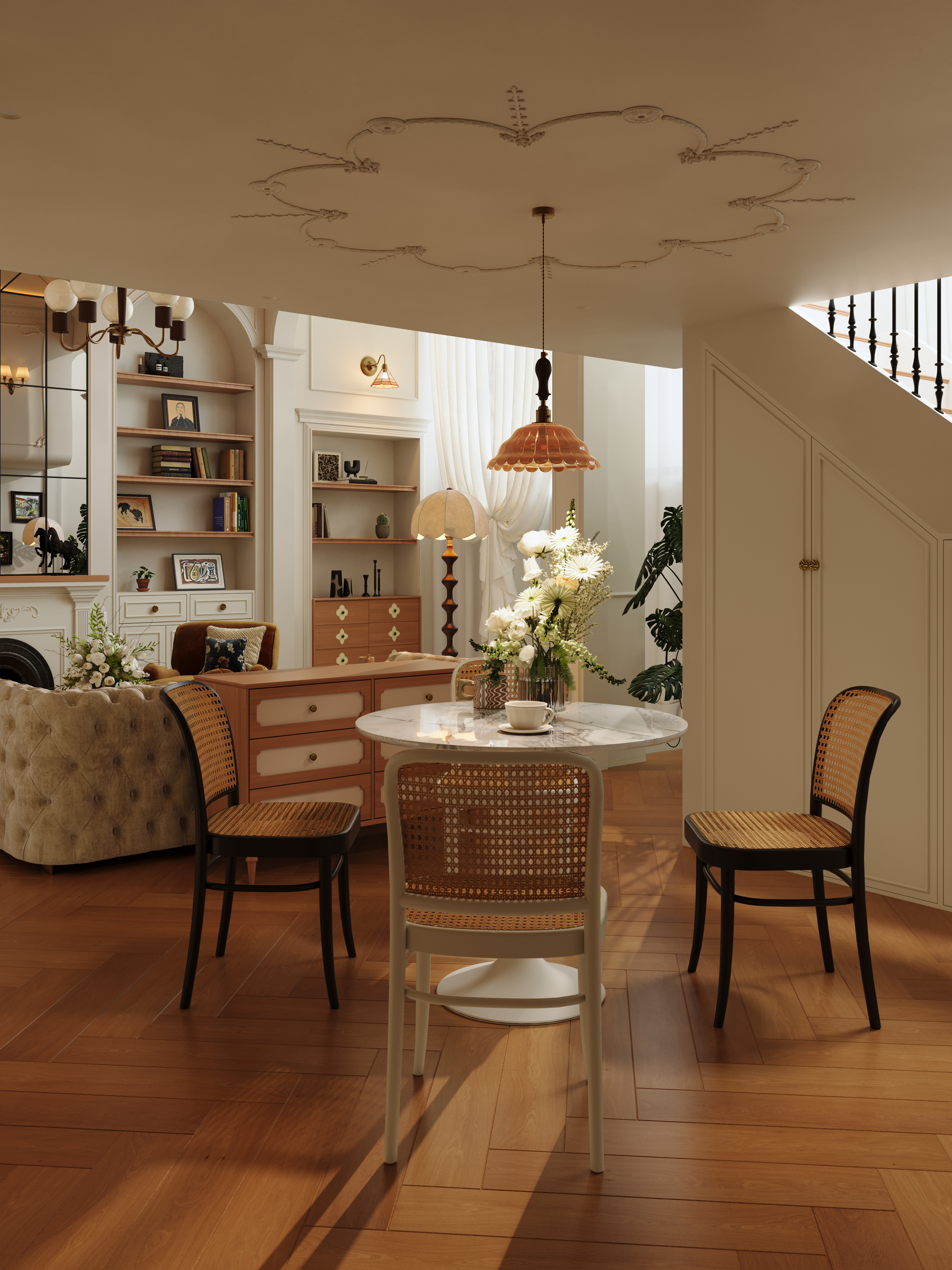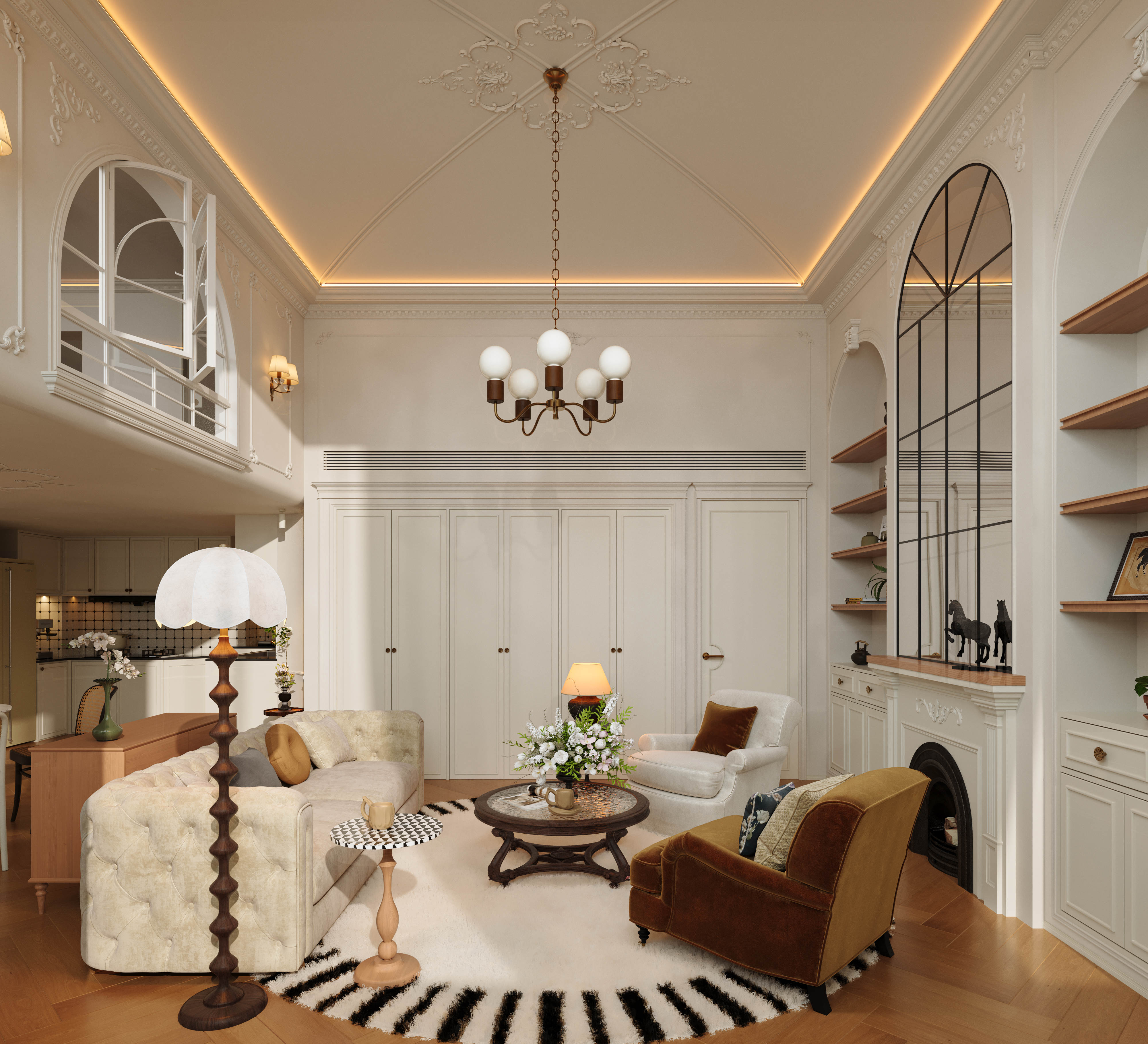 空间意境:剥离传统法式的繁复堆砌感,在保留浪漫优雅内核的基础上,通过材质轻量化、功能复合化、风格跨界化实现与现代生活的适配升级。