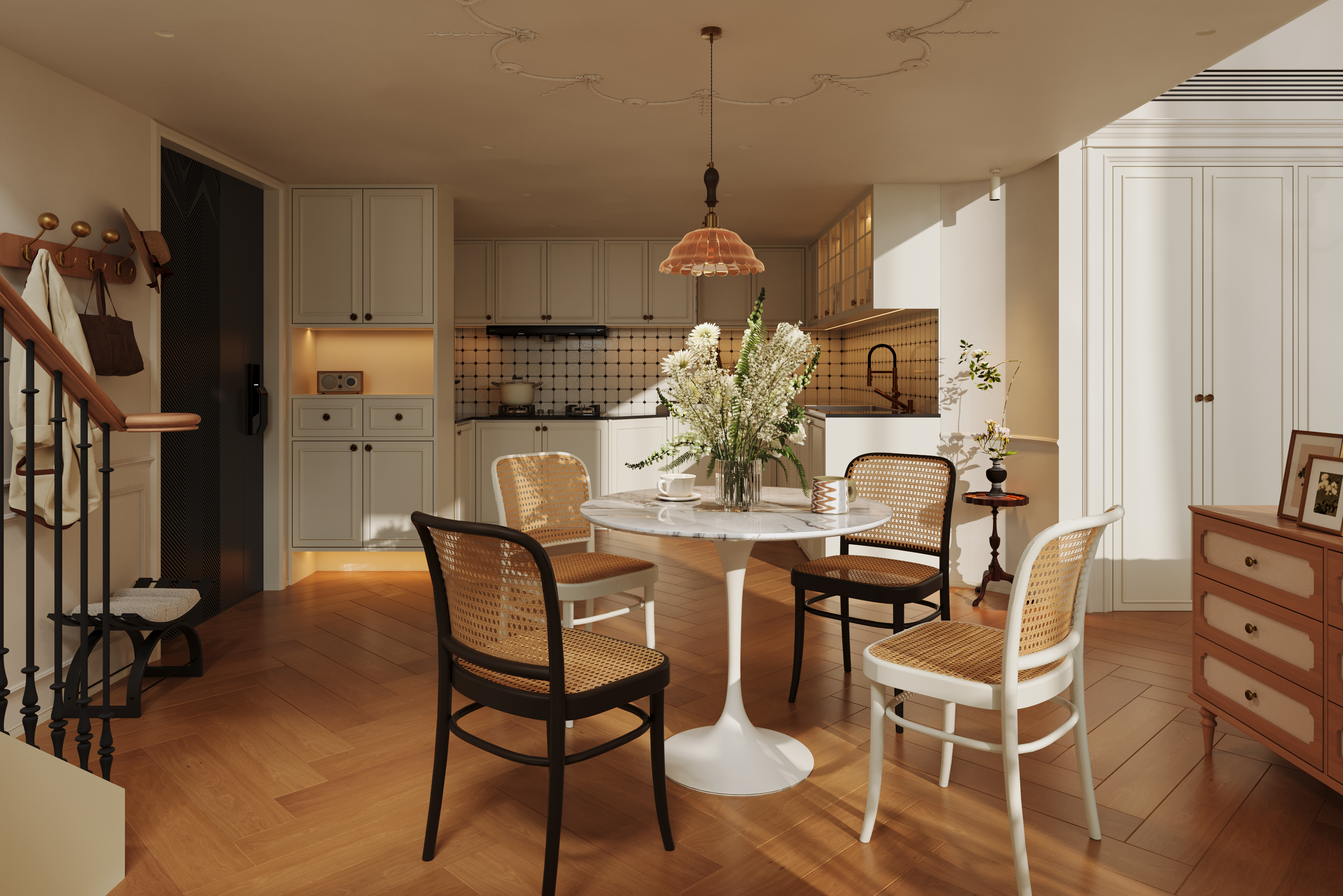 项目定位:法式公寓的设计定位是以浪漫优雅的法式美学为基底,融合现代居住的实用主义,打造兼具复古精致感与舒适烟火气的都市居住空间,适配中小户型公寓。