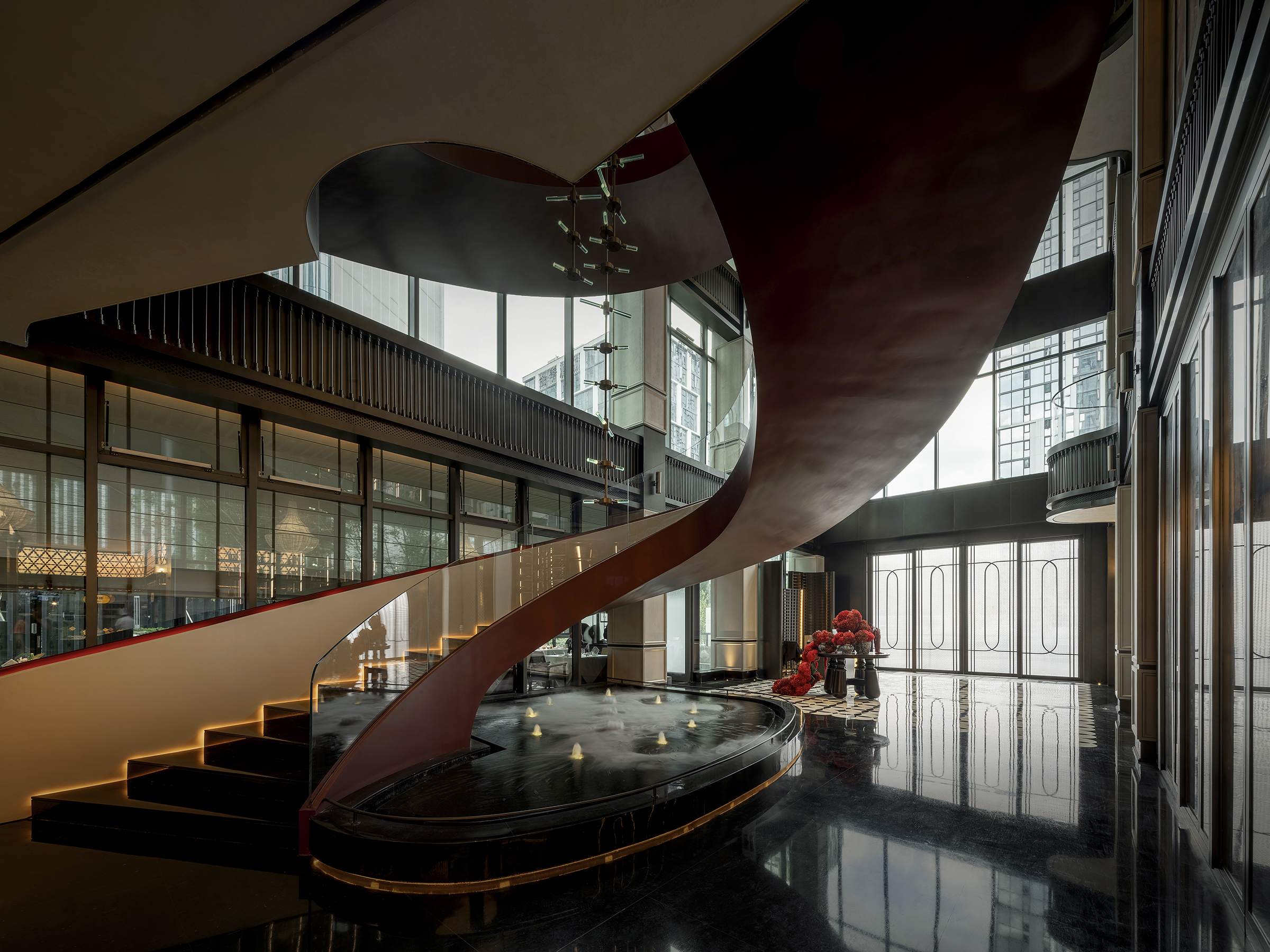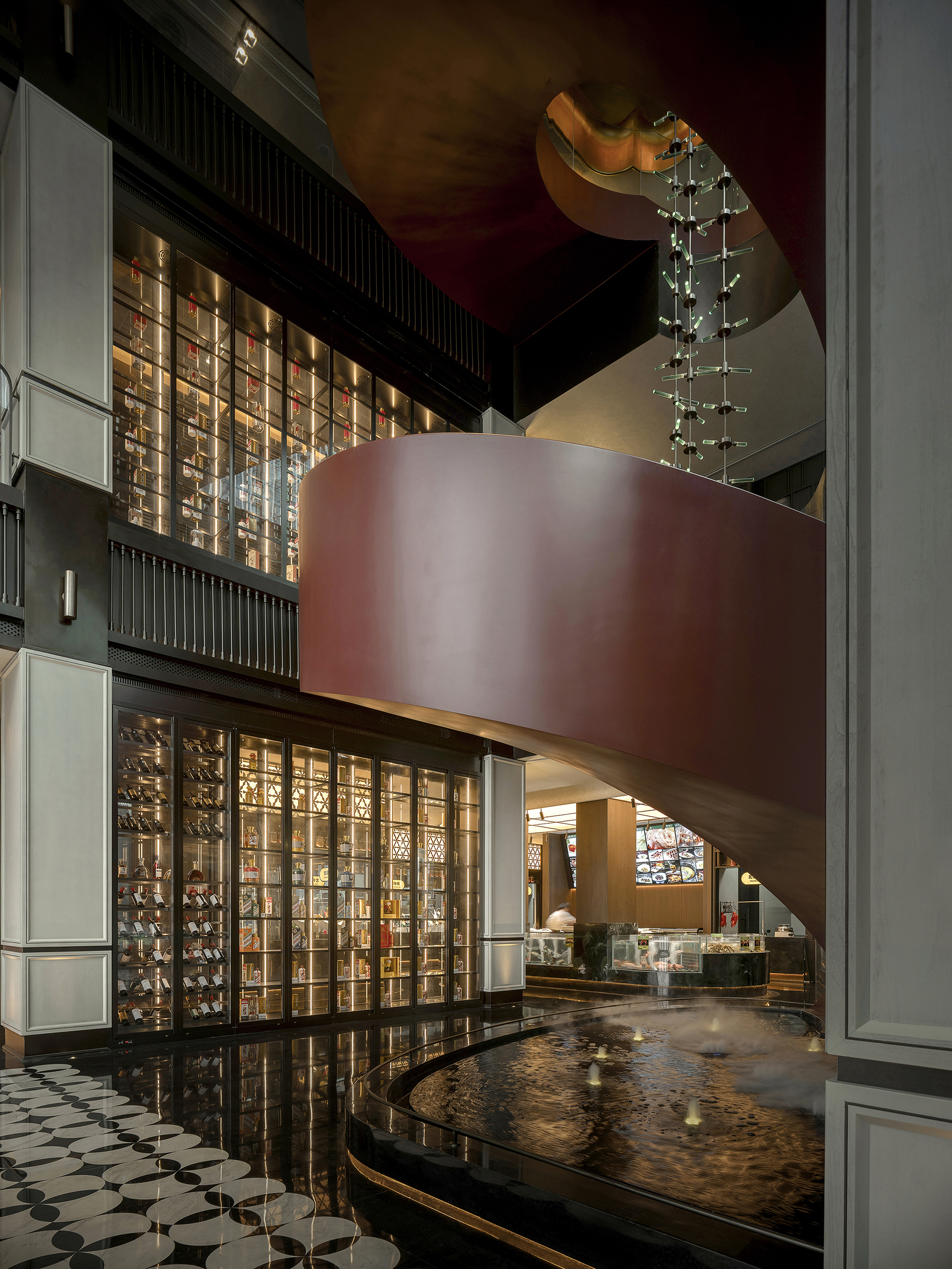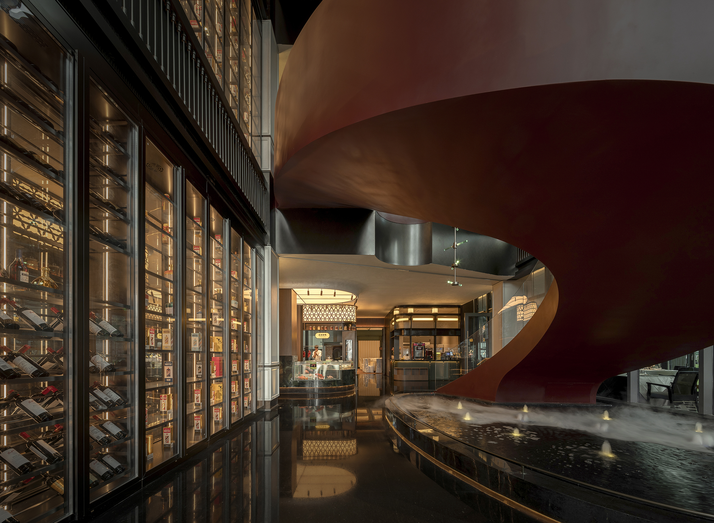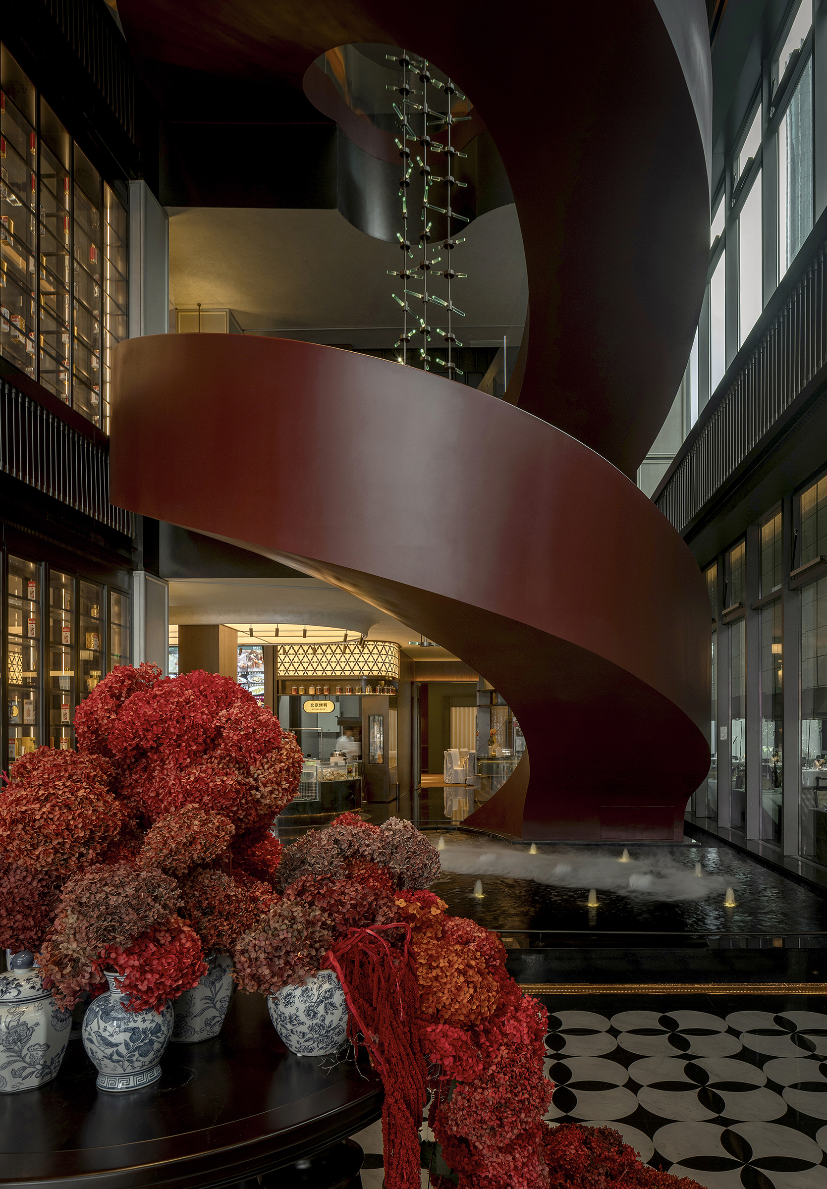 空间意境:空间场景突破传统中式餐厅的符号化表达,以现代艺术装置、几何构成与光影叙事重释东方意境。入口中庭以巨型红色旋转楼梯与垂落雕塑形成强烈视觉锚点,将书画写意的“一笔成势”转化为立体空间语言。水景、花艺、青花瓷等东方意象在镜面与金属材质的映衬下焕发当代气质,形成庄重而灵动、传统而前卫的复合型环境风格。