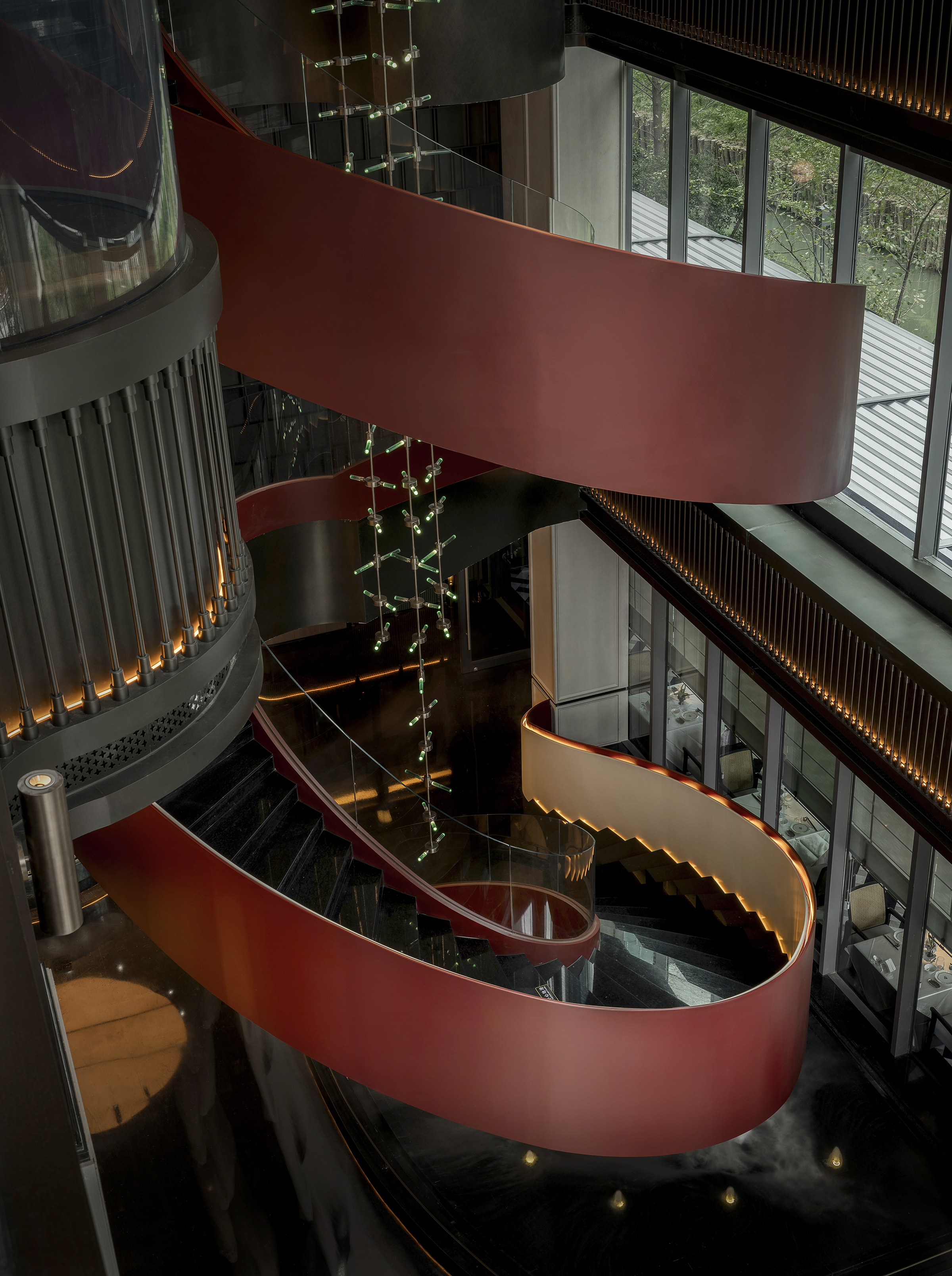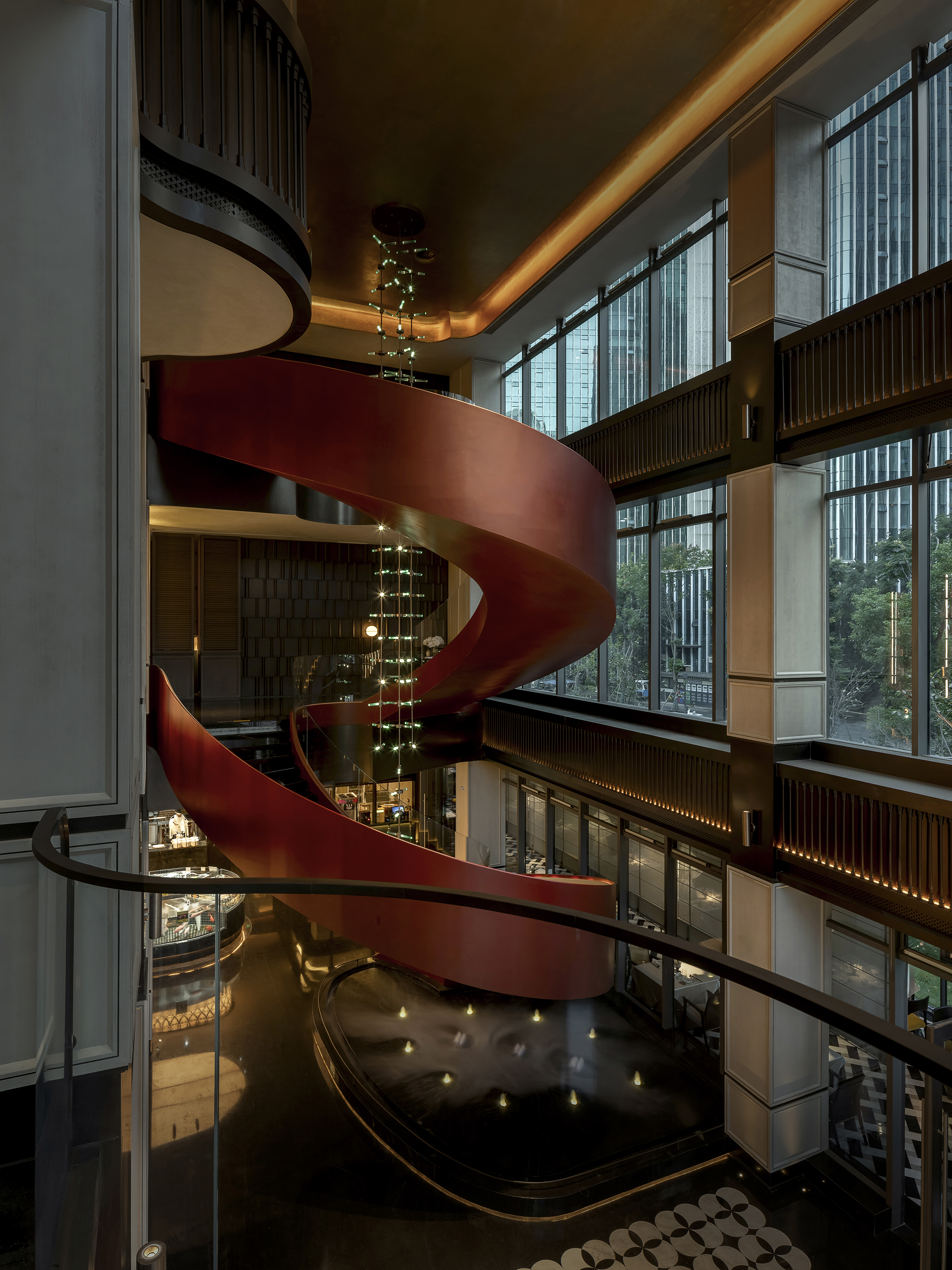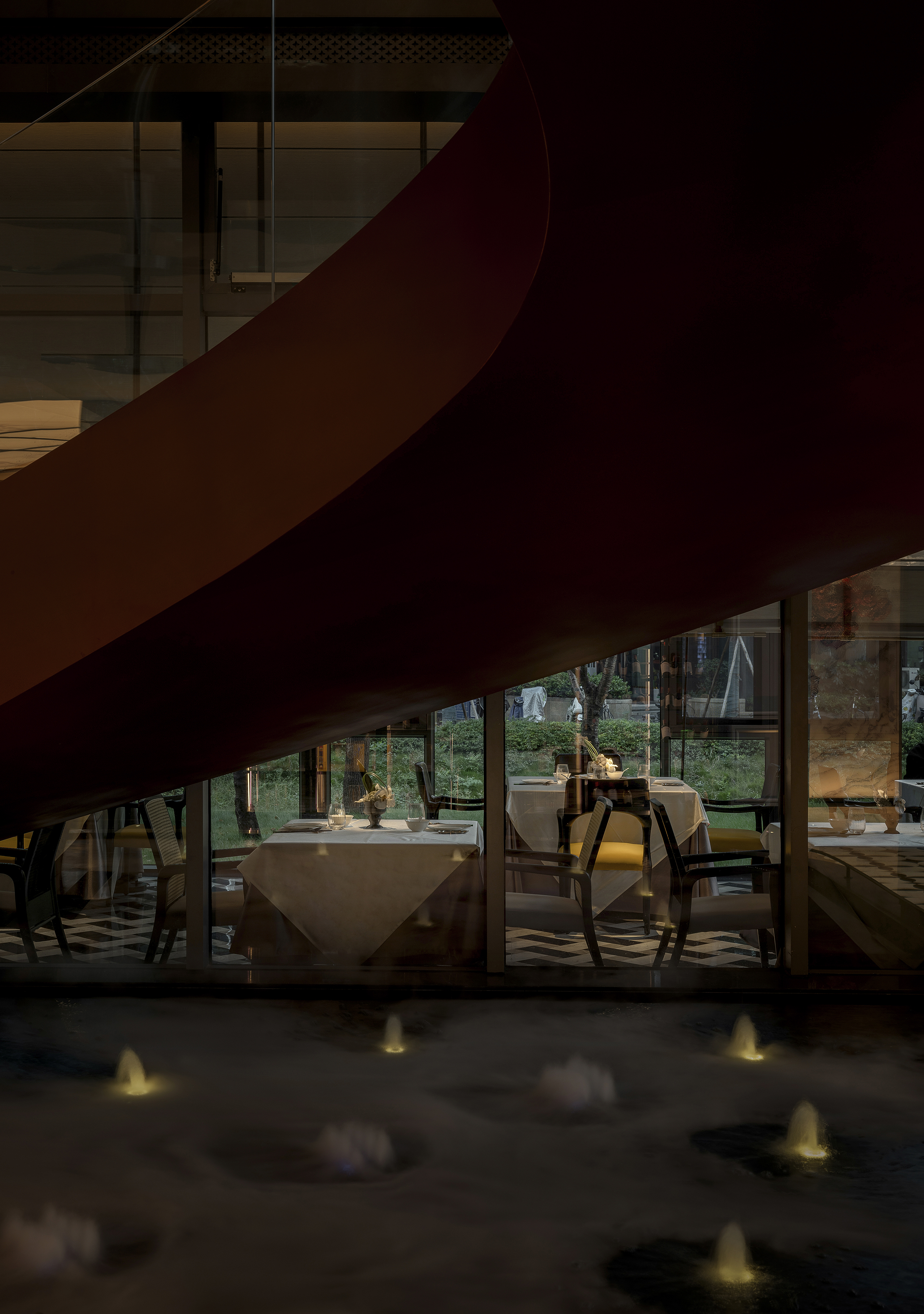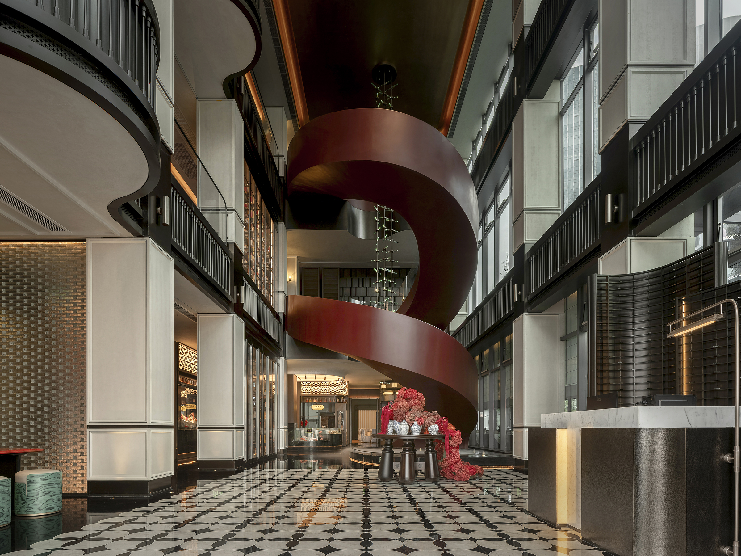 空间意境:空间场景突破传统中式餐厅的符号化表达,以现代艺术装置、几何构成与光影叙事重释东方意境。入口中庭以巨型红色旋转楼梯与垂落雕塑形成强烈视觉锚点,将书画写意的“一笔成势”转化为立体空间语言。水景、花艺、青花瓷等东方意象在镜面与金属材质的映衬下焕发当代气质,形成庄重而灵动、传统而前卫的复合型环境风格。