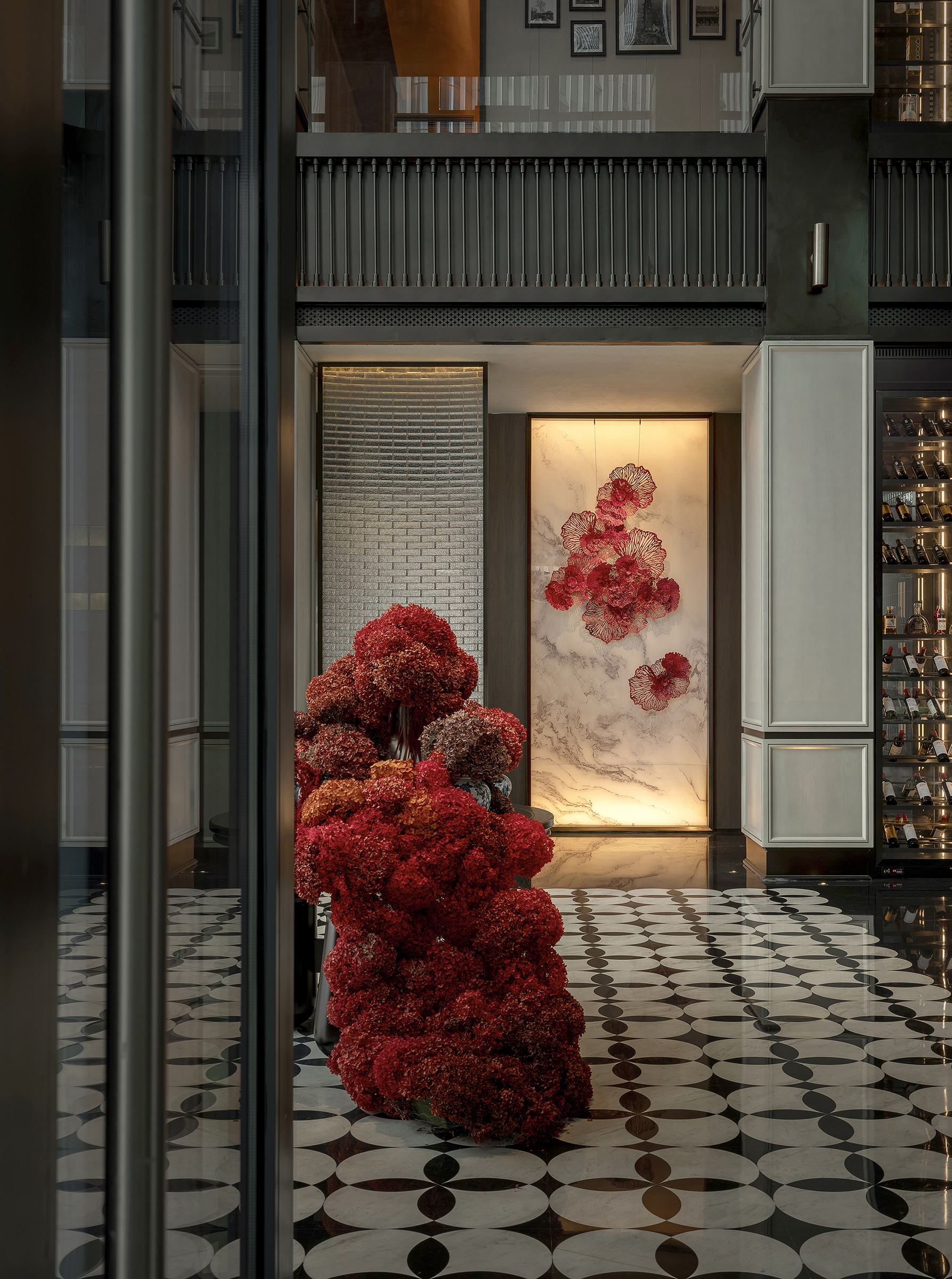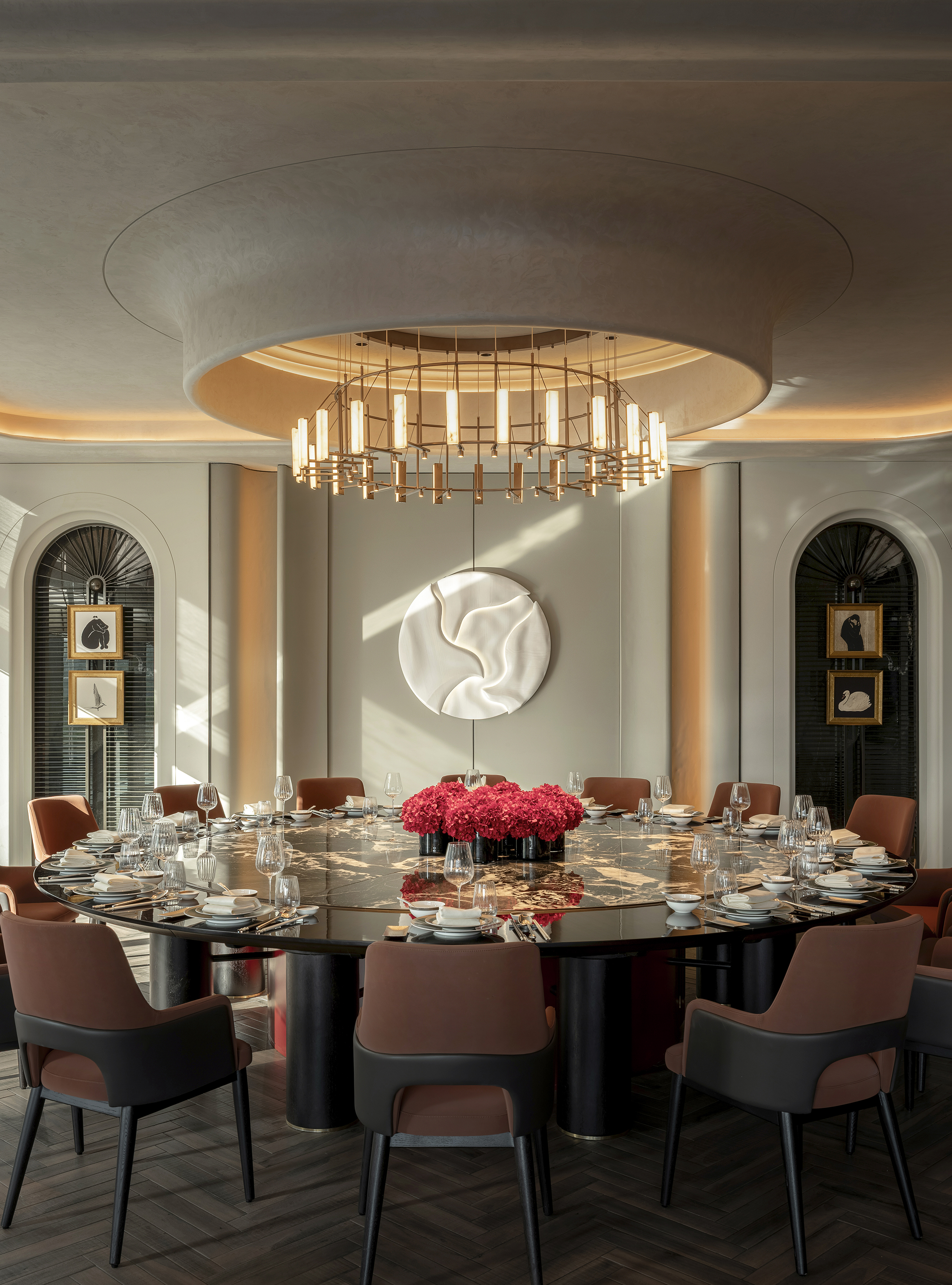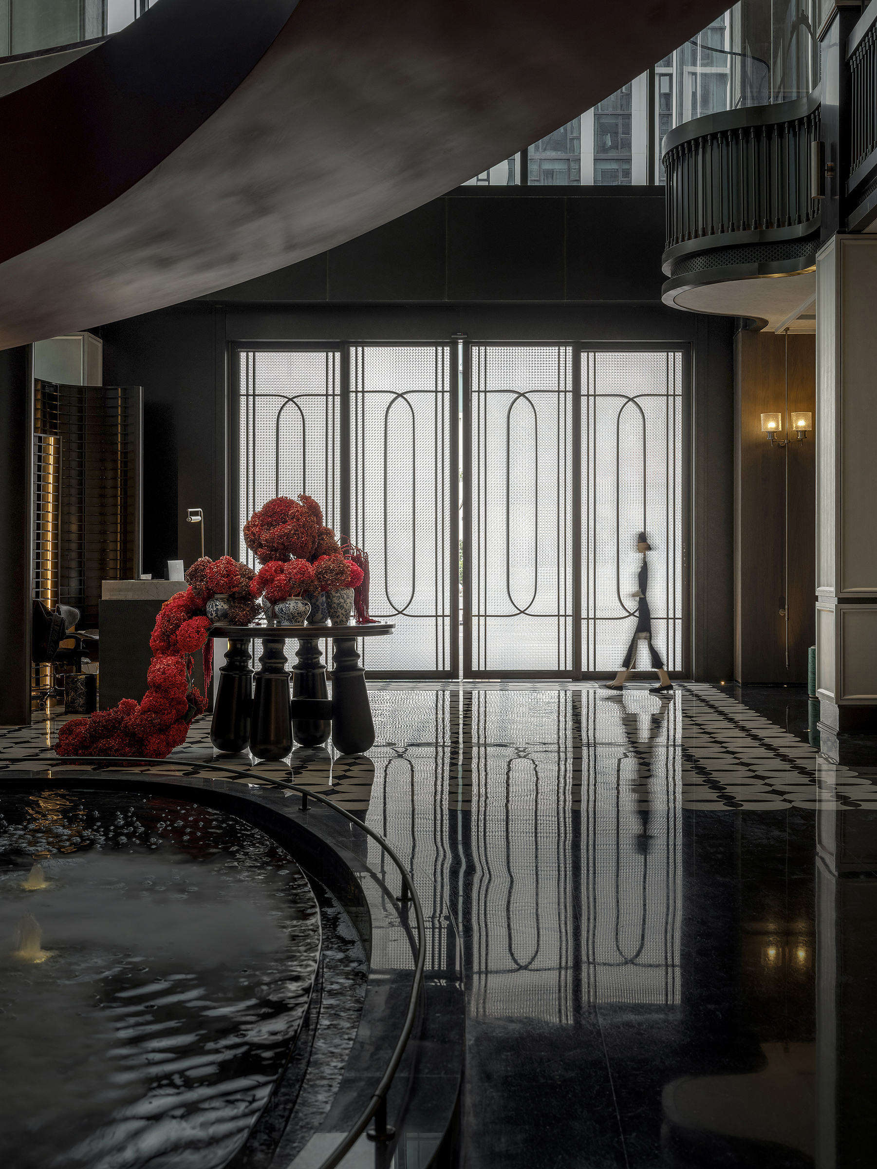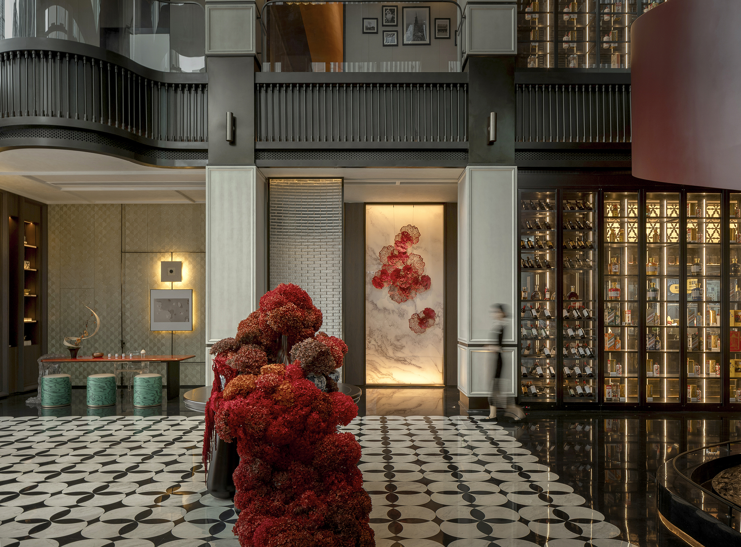 空间意境:空间场景突破传统中式餐厅的符号化表达,以现代艺术装置、几何构成与光影叙事重释东方意境。入口中庭以巨型红色旋转楼梯与垂落雕塑形成强烈视觉锚点,将书画写意的“一笔成势”转化为立体空间语言。水景、花艺、青花瓷等东方意象在镜面与金属材质的映衬下焕发当代气质,形成庄重而灵动、传统而前卫的复合型环境风格。