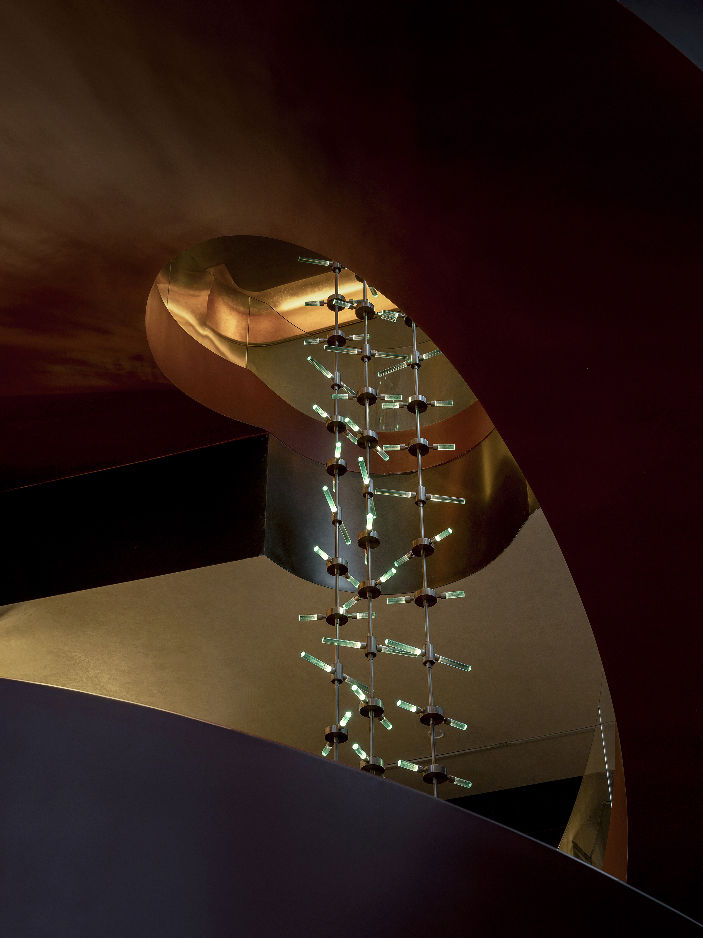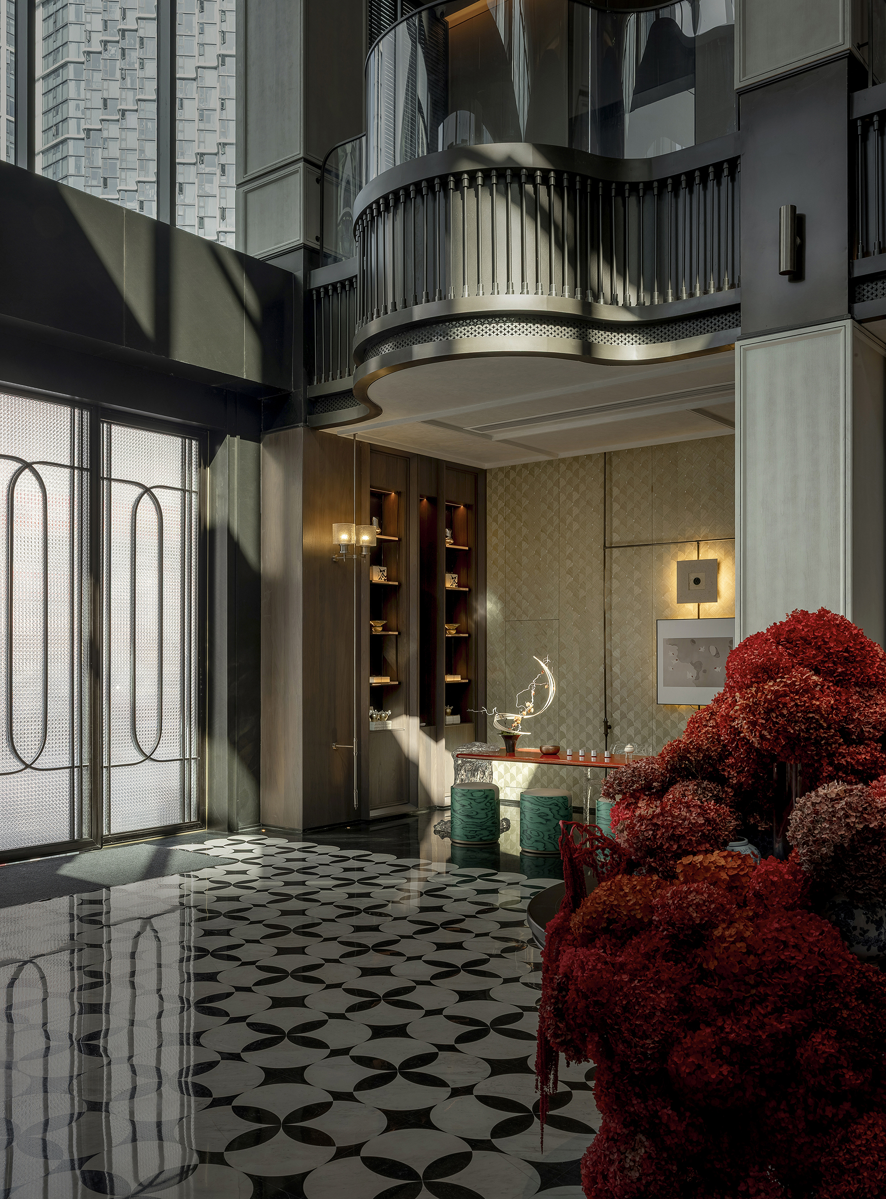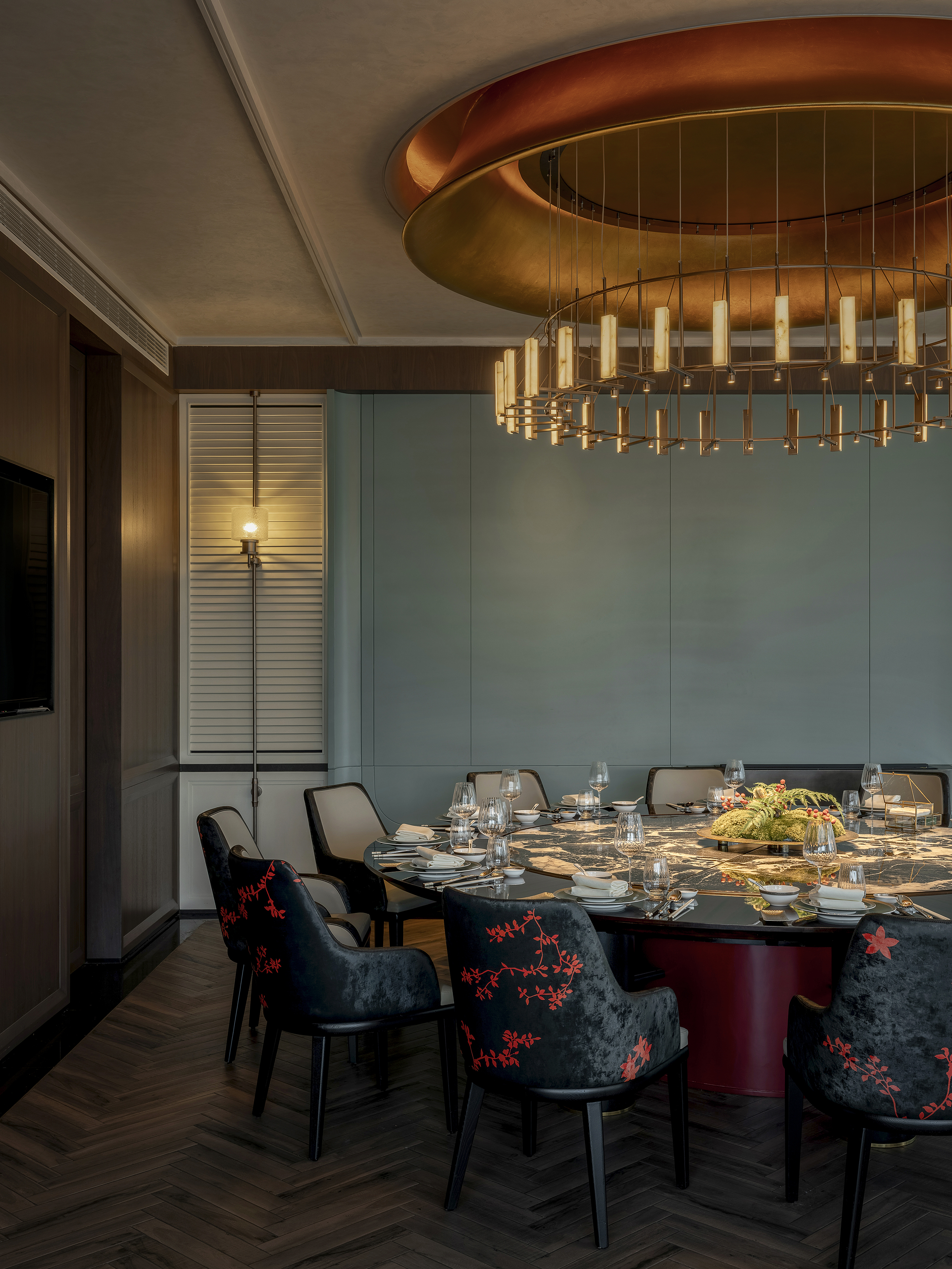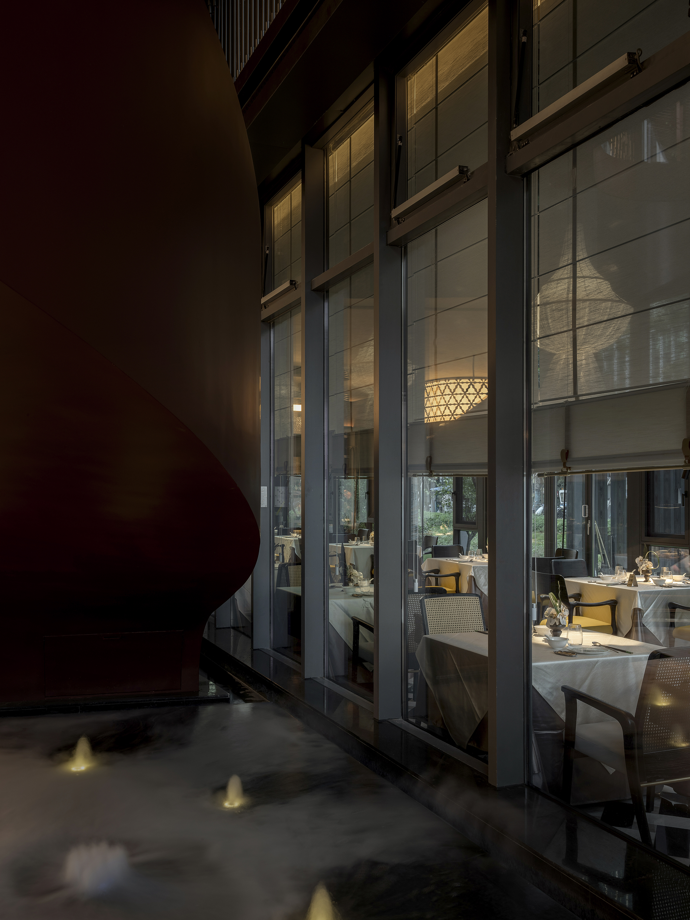 空间意境:空间场景突破传统中式餐厅的符号化表达,以现代艺术装置、几何构成与光影叙事重释东方意境。入口中庭以巨型红色旋转楼梯与垂落雕塑形成强烈视觉锚点,将书画写意的“一笔成势”转化为立体空间语言。水景、花艺、青花瓷等东方意象在镜面与金属材质的映衬下焕发当代气质,形成庄重而灵动、传统而前卫的复合型环境风格。