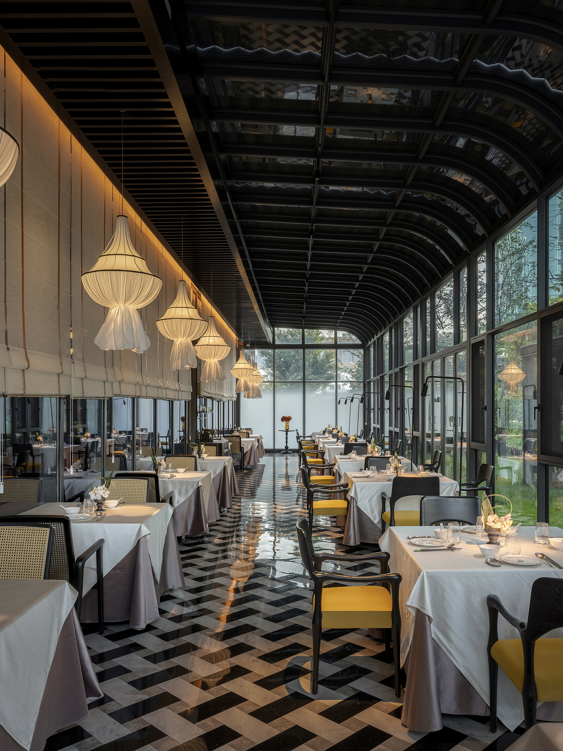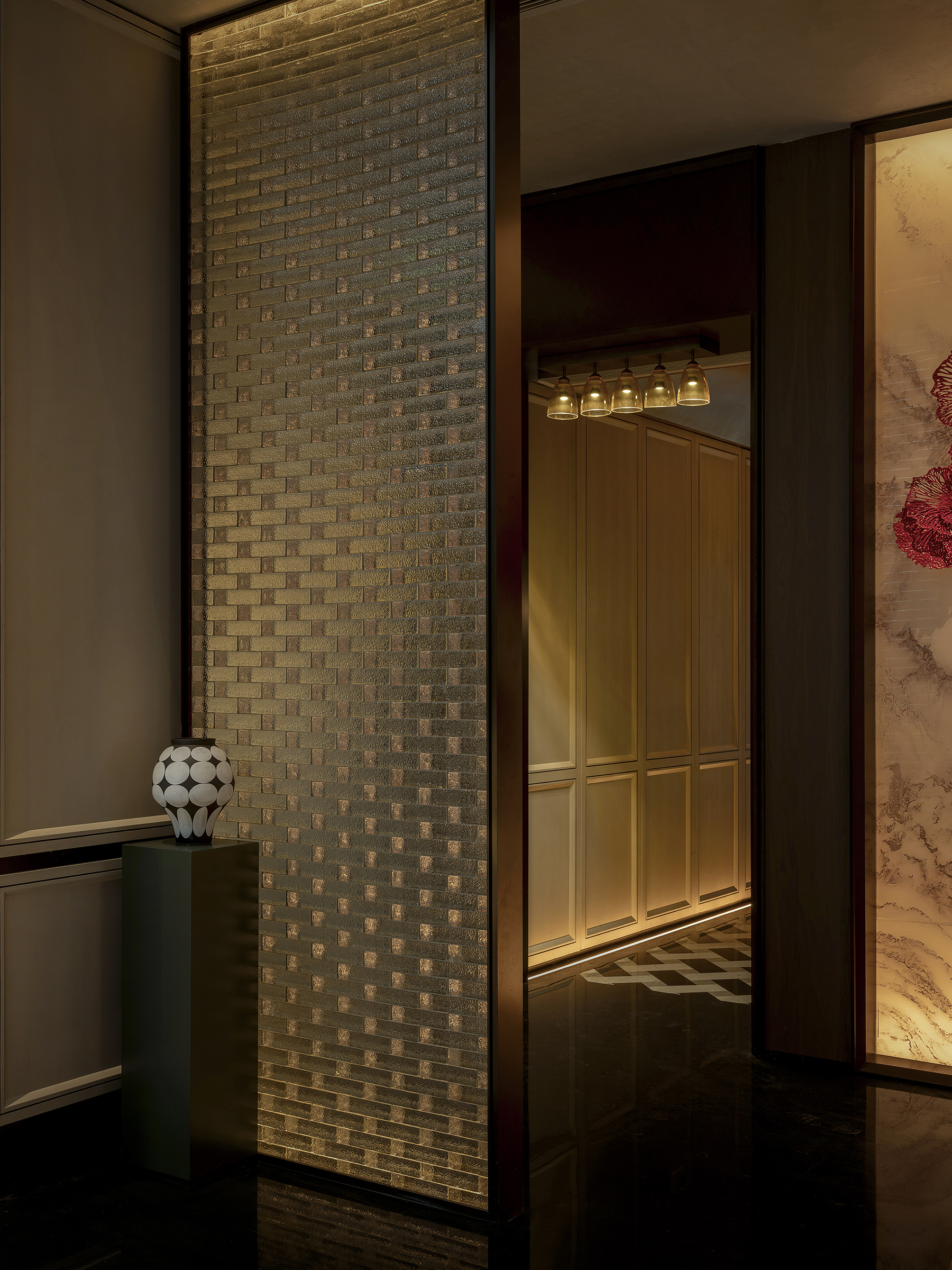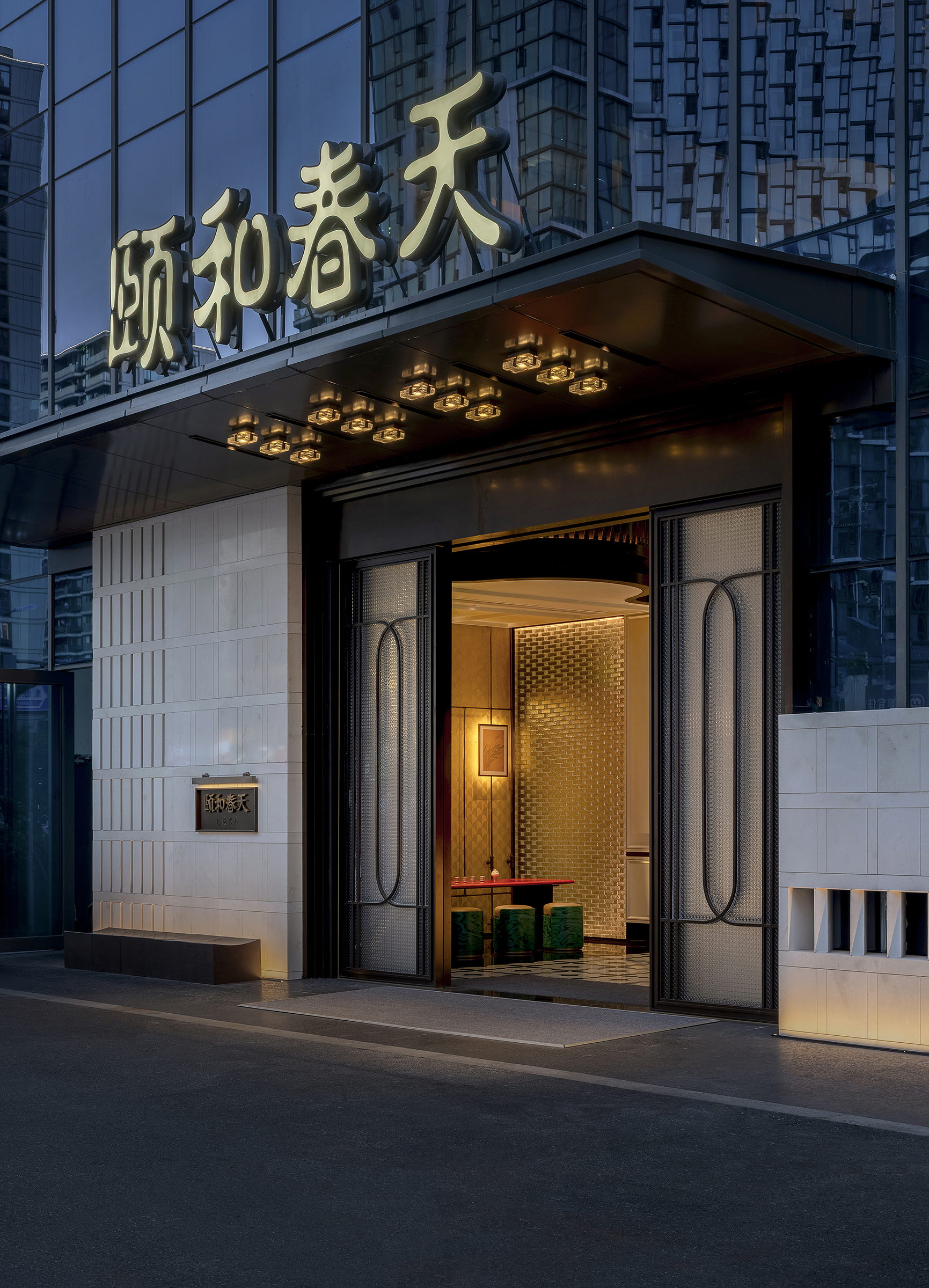 设计选材:设计在选材上注重耐久性与审美长期价值,广泛运用玻璃、金属、石材、黑白瓷砖等经典且易维护的材料体系,通过比例、质感与光影关系完成空间表达,减少对复杂装饰的依赖。屏风式金属格栅与模块化构件在满足东方意象表达的同时,具备良好的施工效率与后期维护经济性,有效控制整体能耗与运营成本。