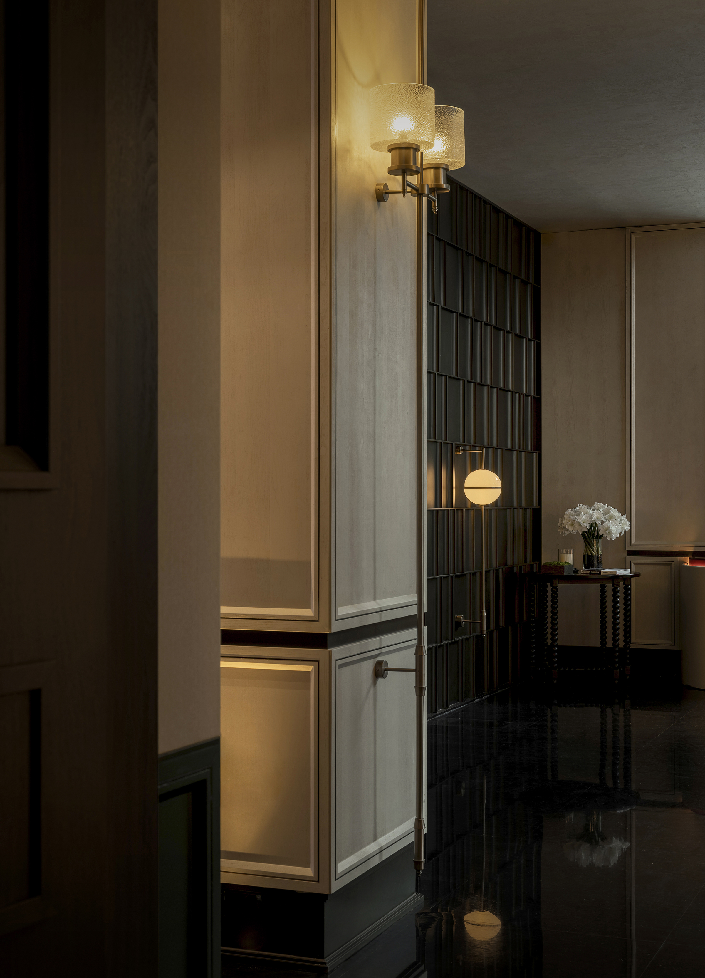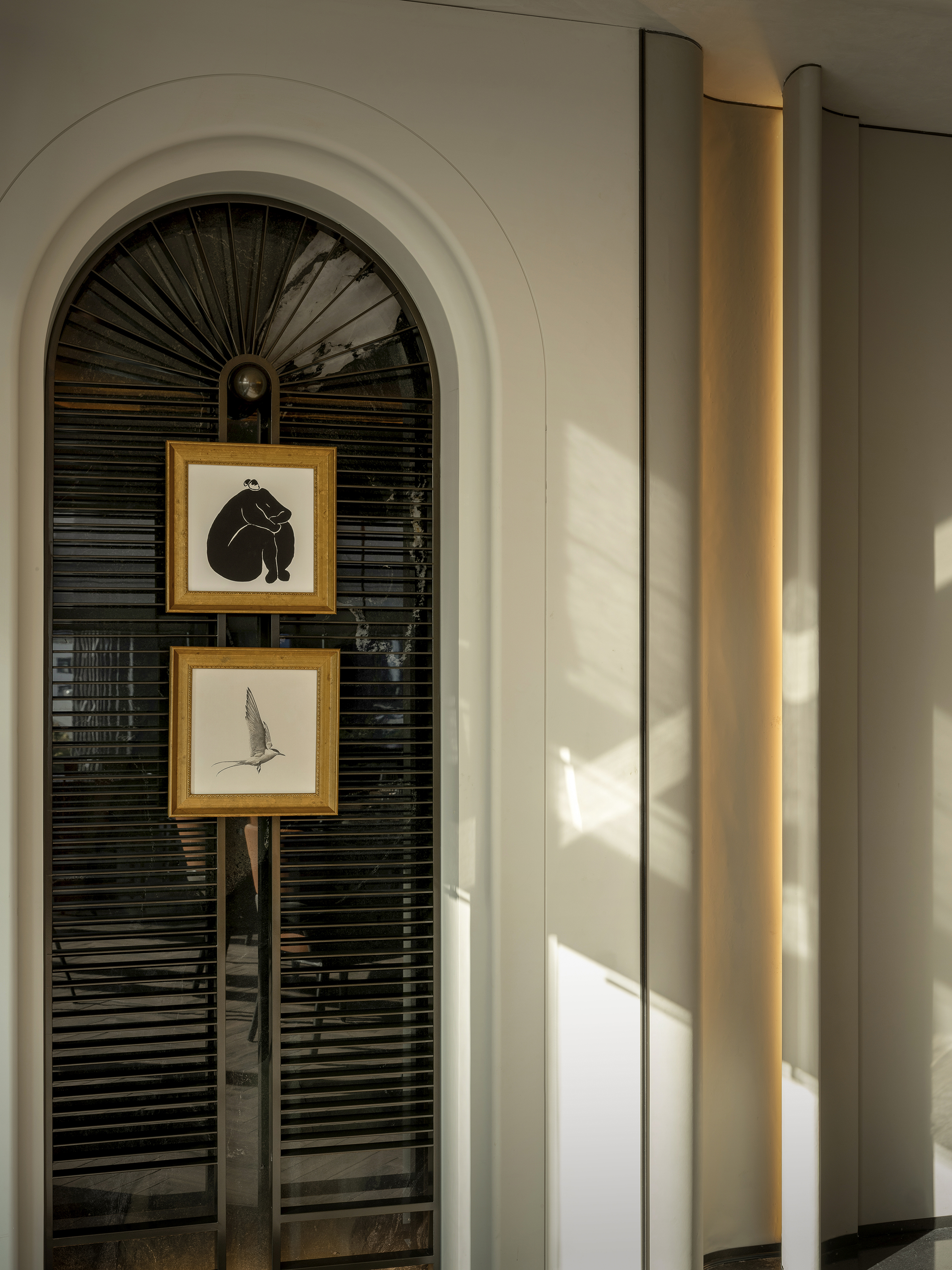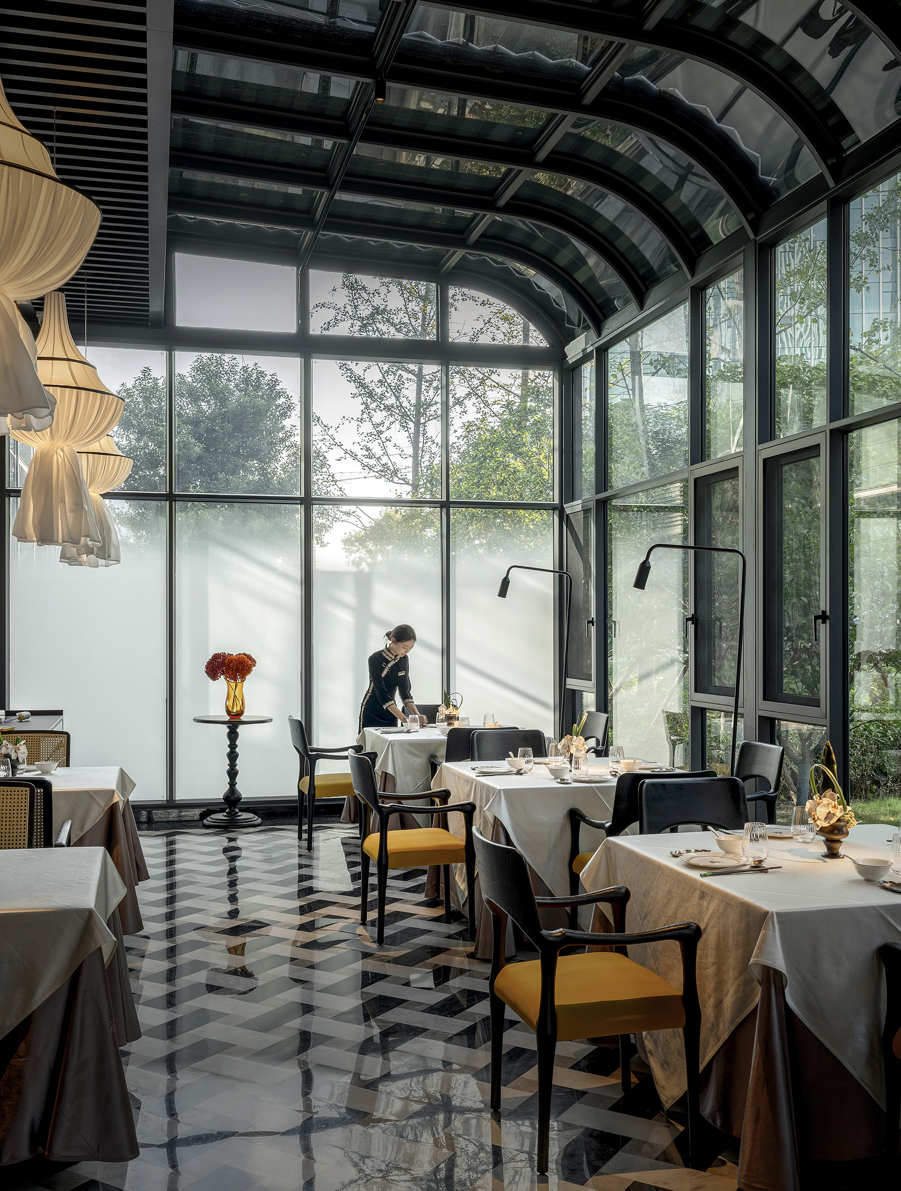 设计选材:设计在选材上注重耐久性与审美长期价值,广泛运用玻璃、金属、石材、黑白瓷砖等经典且易维护的材料体系,通过比例、质感与光影关系完成空间表达,减少对复杂装饰的依赖。屏风式金属格栅与模块化构件在满足东方意象表达的同时,具备良好的施工效率与后期维护经济性,有效控制整体能耗与运营成本。