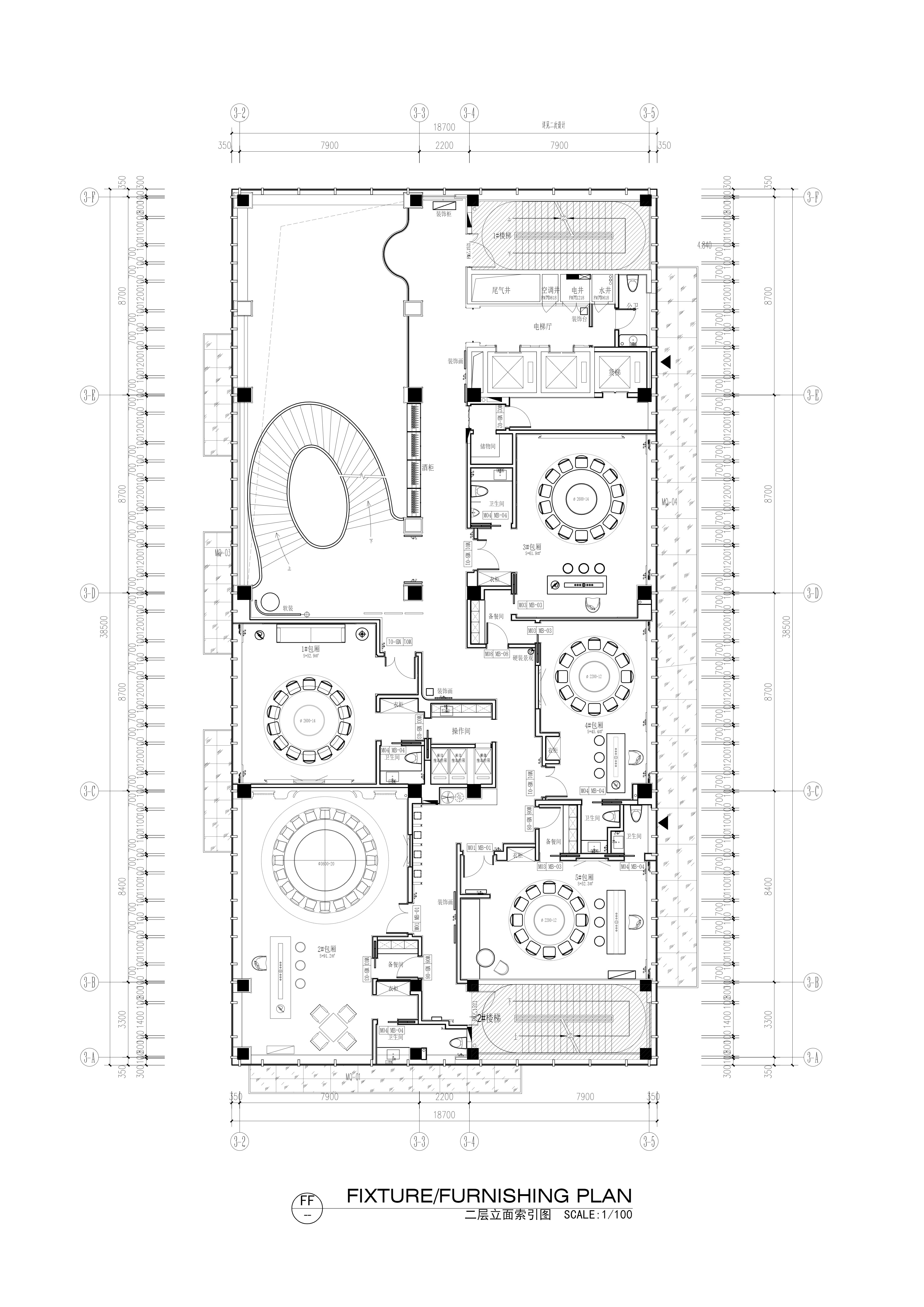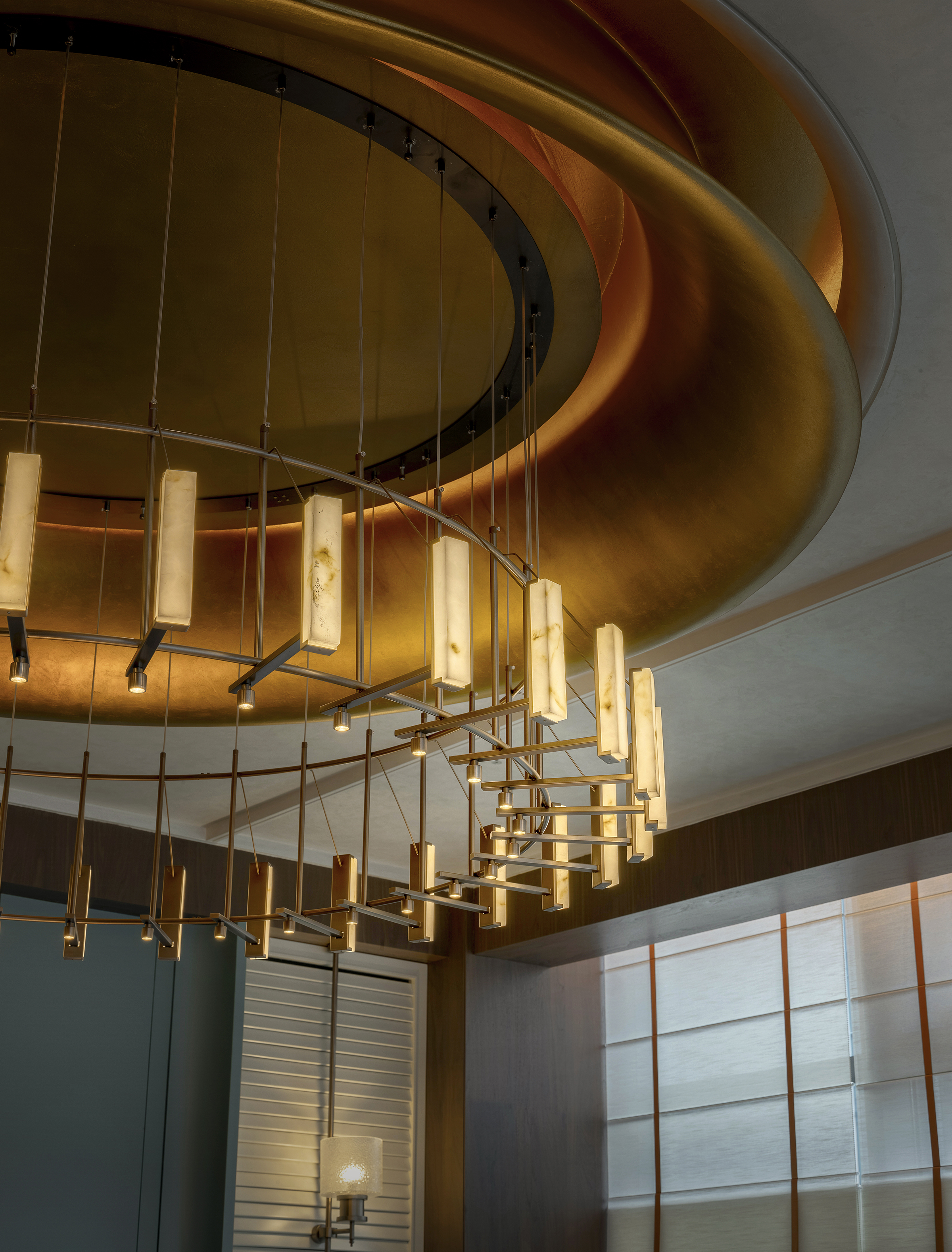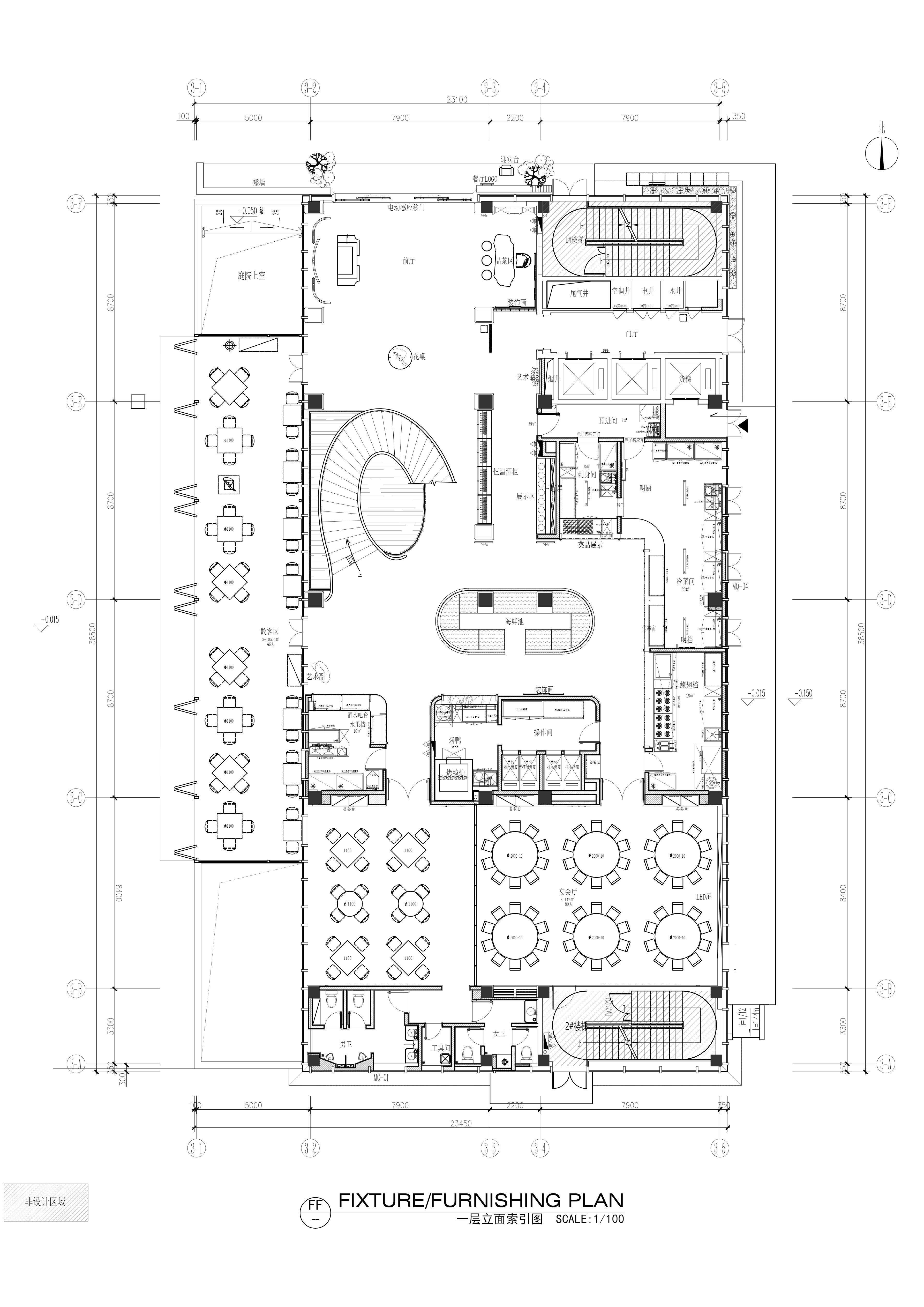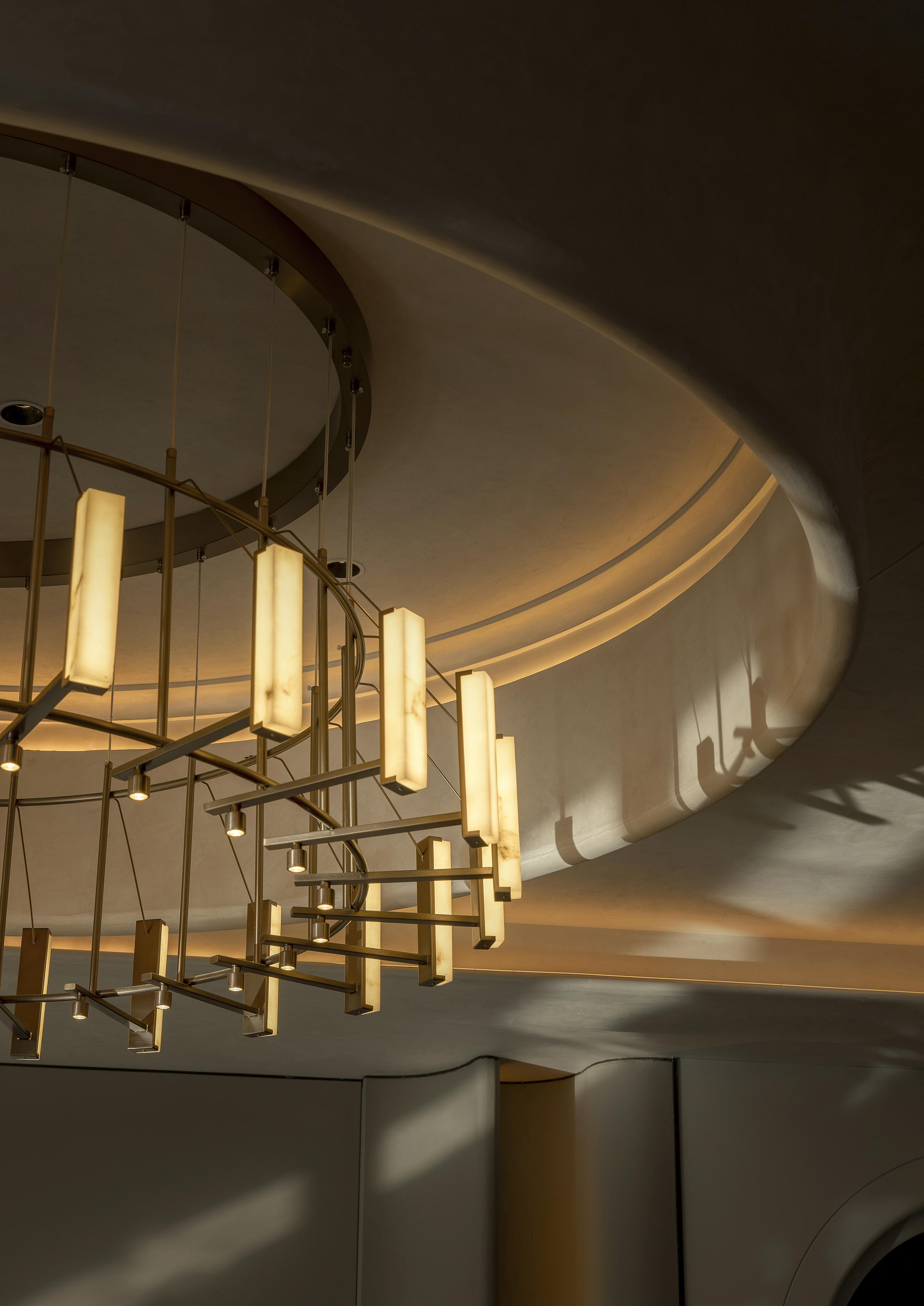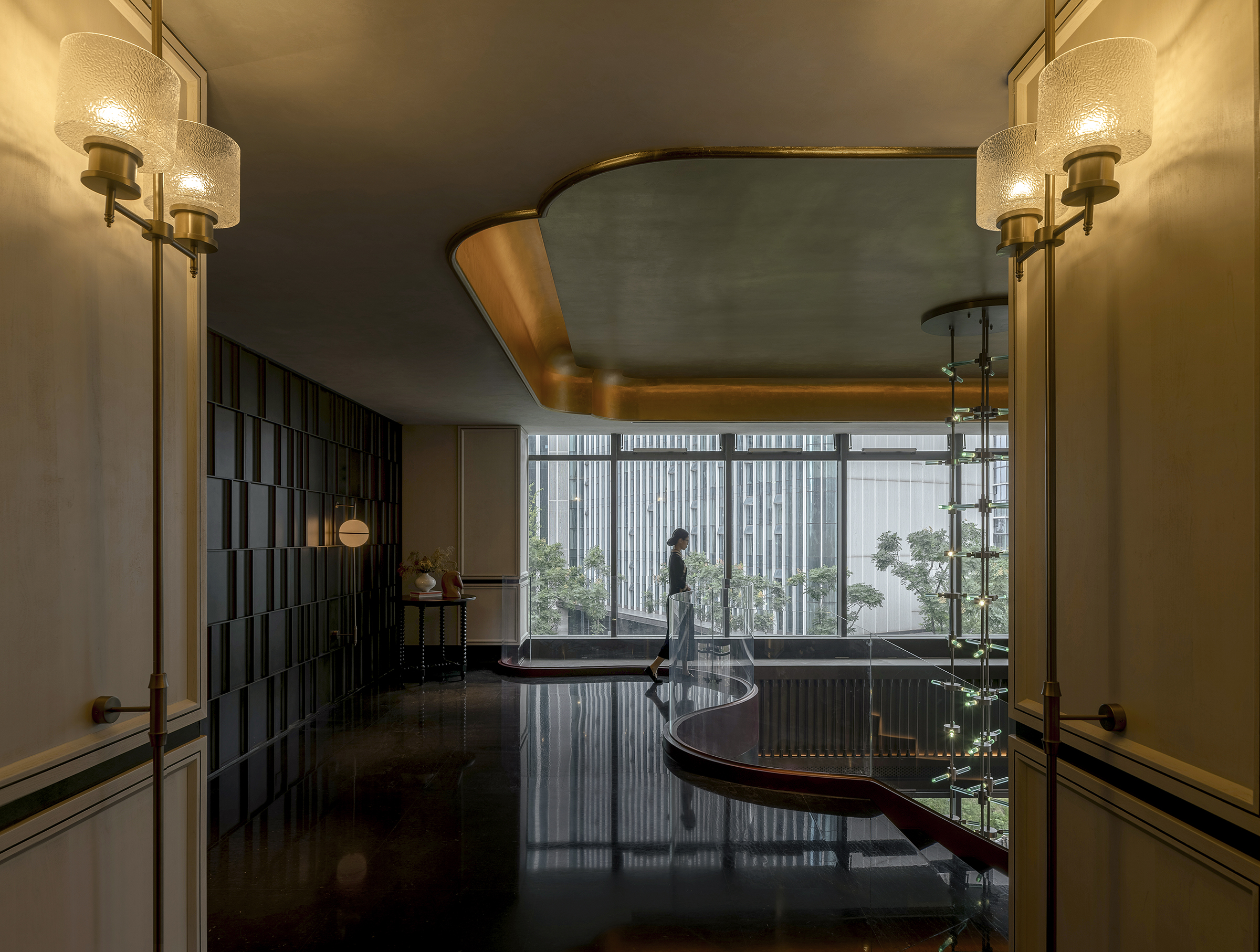 空间布局:空间布局以“空间序列”与“情绪递进”为核心逻辑,通过入口中庭、过渡厅、走廊、包厢及宴会厅的层层展开,引导宾客完成从都市喧嚣到宴饮雅境的心理过渡。旋转楼梯、弧形天花与镜面地面强化纵向与横向的空间张力,打破传统餐饮空间的平铺式布局,使动线本身成为一段具有仪式感与叙事性的空间体验。
