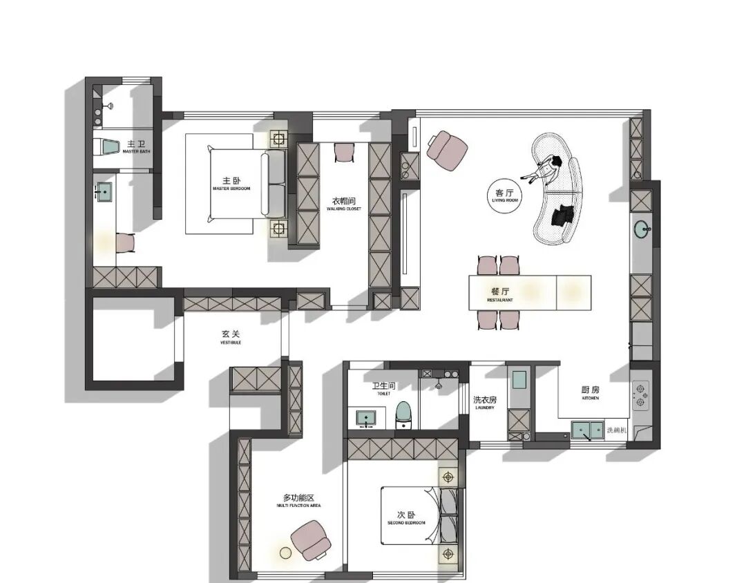 空间布局:客厅作为朋友与家人互动的场所,客餐厅尺寸格局不按常规布置,打开阳台空间,客厅往外扩,形成交互空间,客餐厅都能看电视.厨房全开放,开阔视野,也让这个空间更加整体,餐厅旁增设西厨功能,即实用且美观。主卧以套房形式布局,把两个空间的飘窗拆掉,通过合理的布局让空间储物量提升既满足基础功能,也让居住者有更好的居住体验感。次卧也是大改造,保证隐私的双移门+开放多变的娱乐空间,为空间增设了更多是可能性。