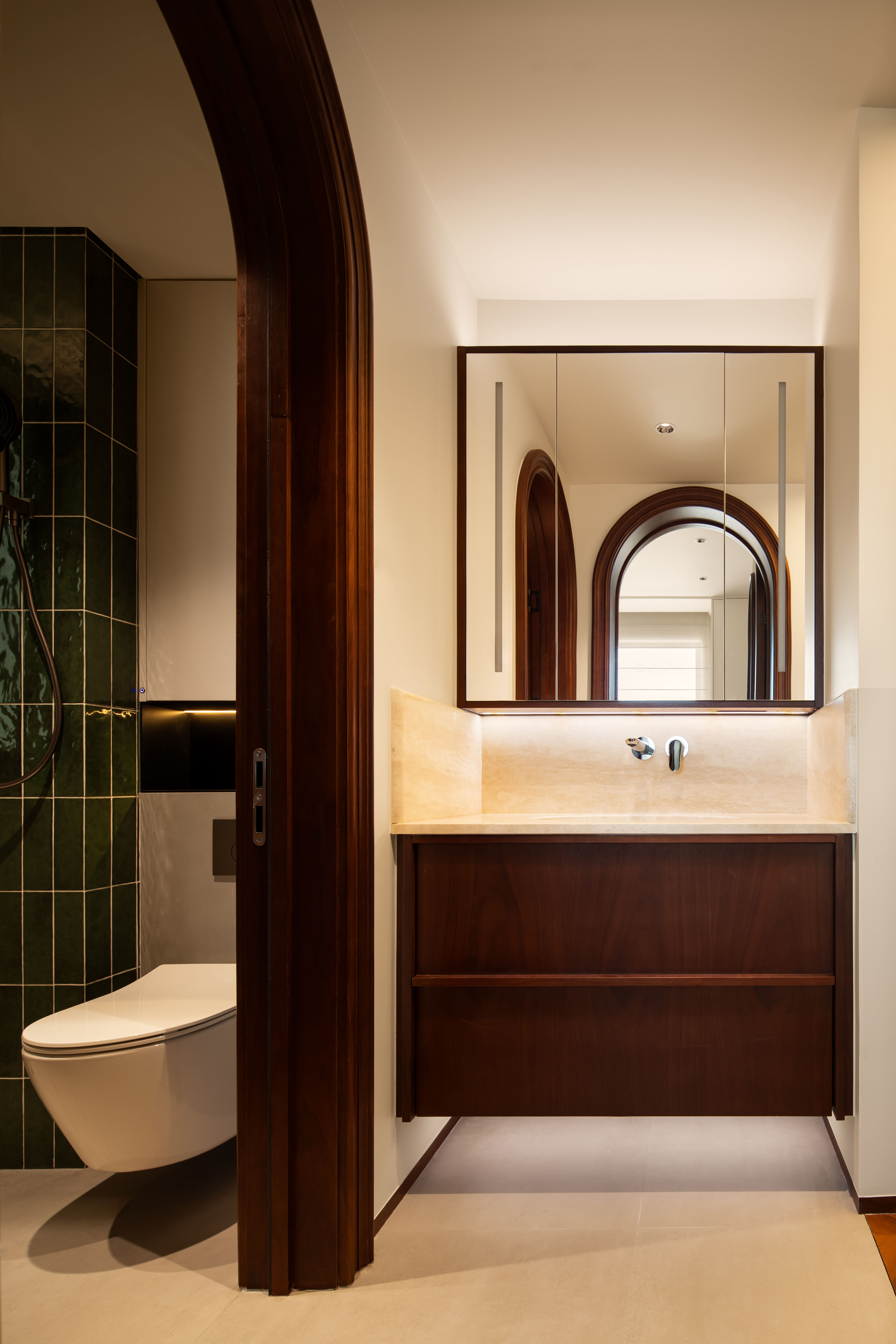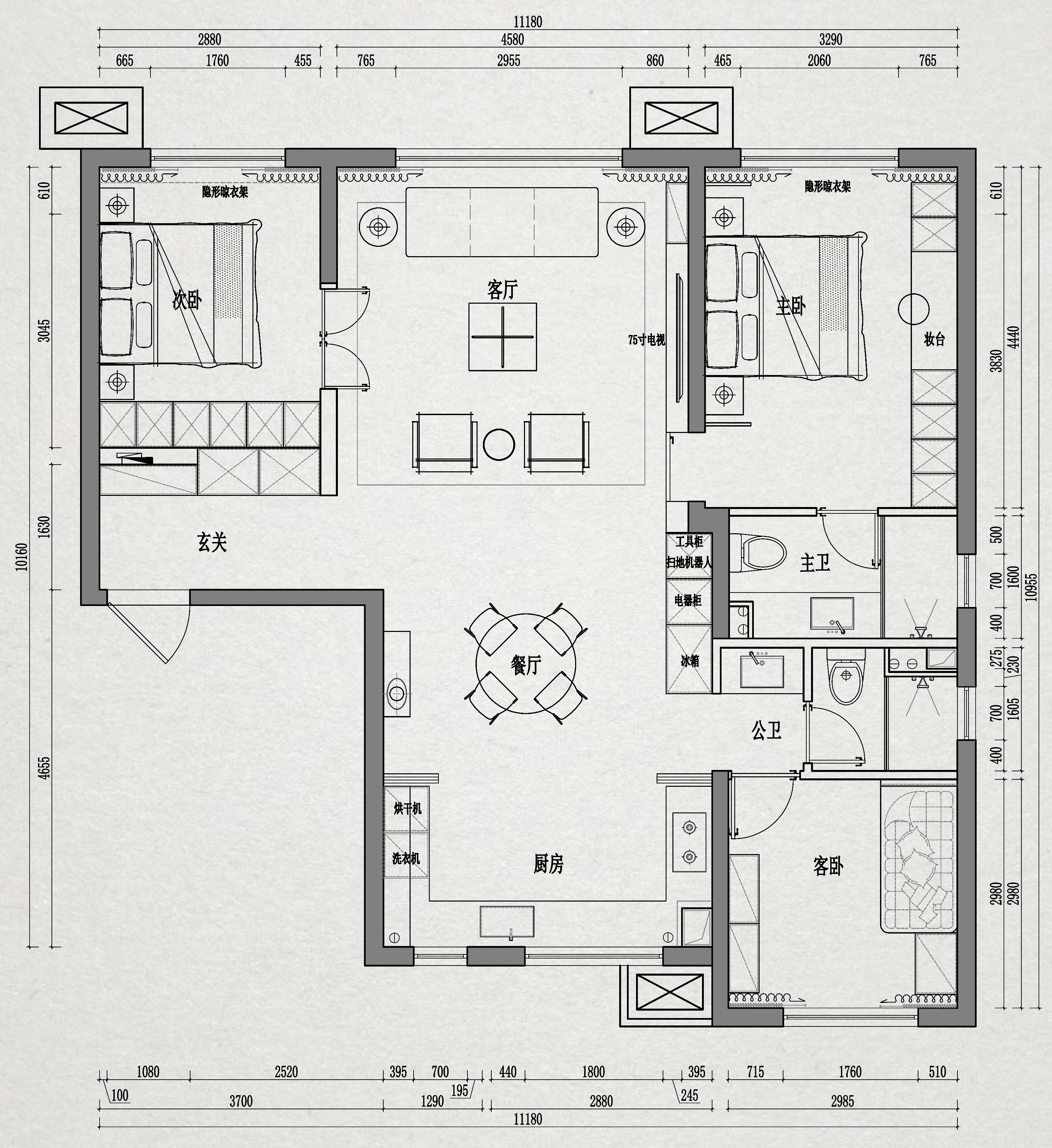 空间布局:客餐厨采用全开放布局,拆除非承重隔墙,保证空间开阔,避免中古大件家具导致的拥挤感;同时用中古家具(如实木餐边柜、复古屏风)作为柔性边界,自然划分功能区域,既不割裂空间,又强化复古层次;