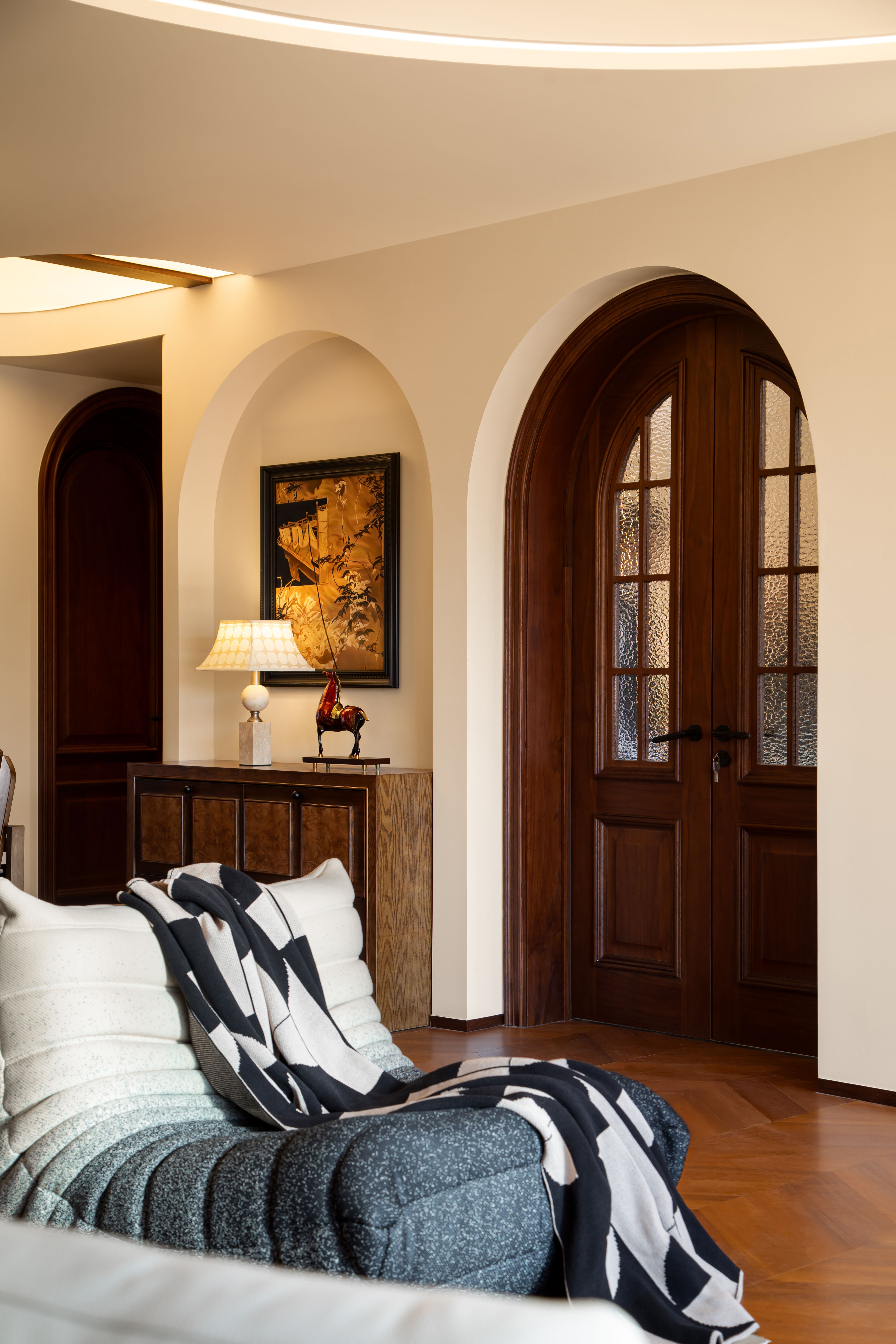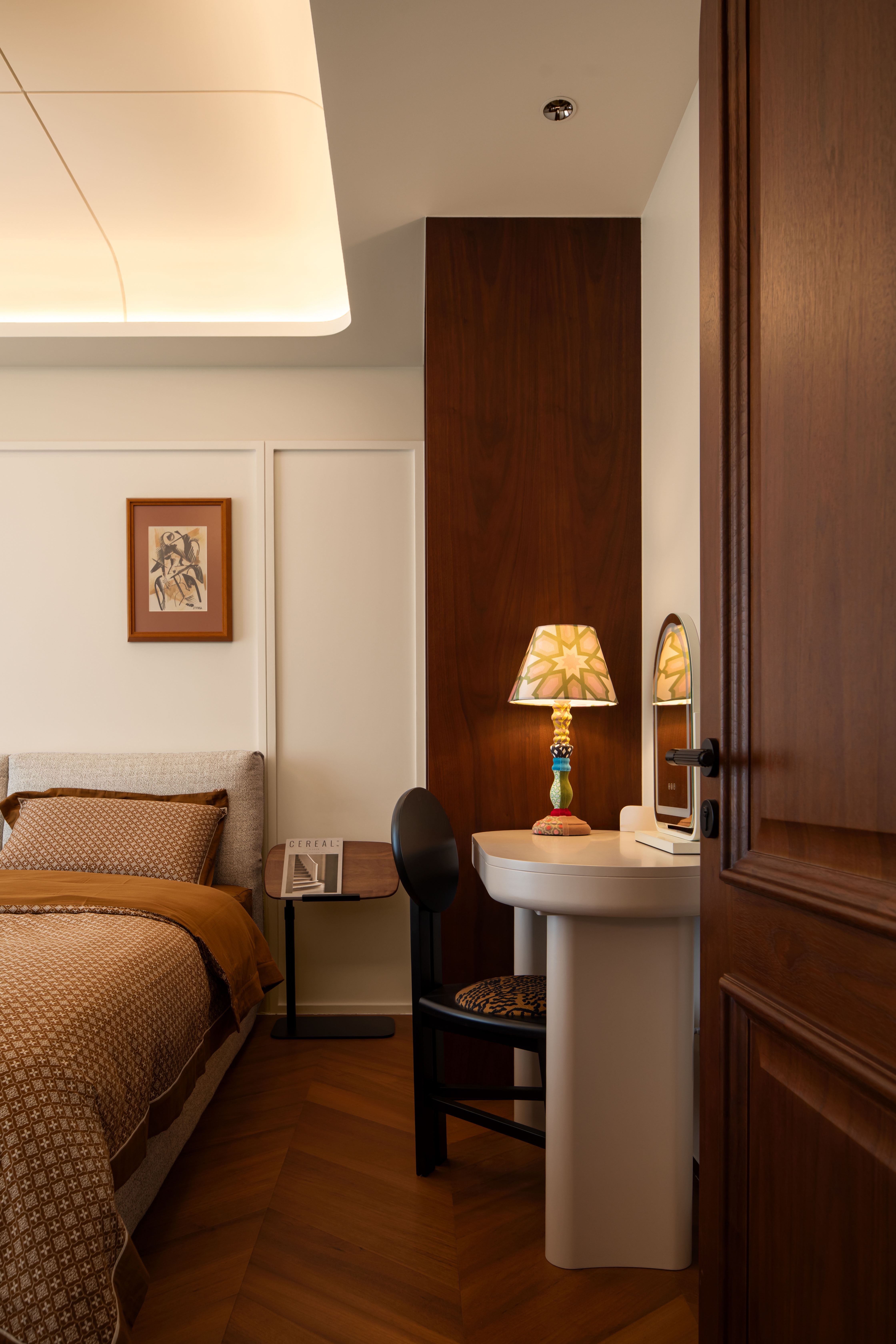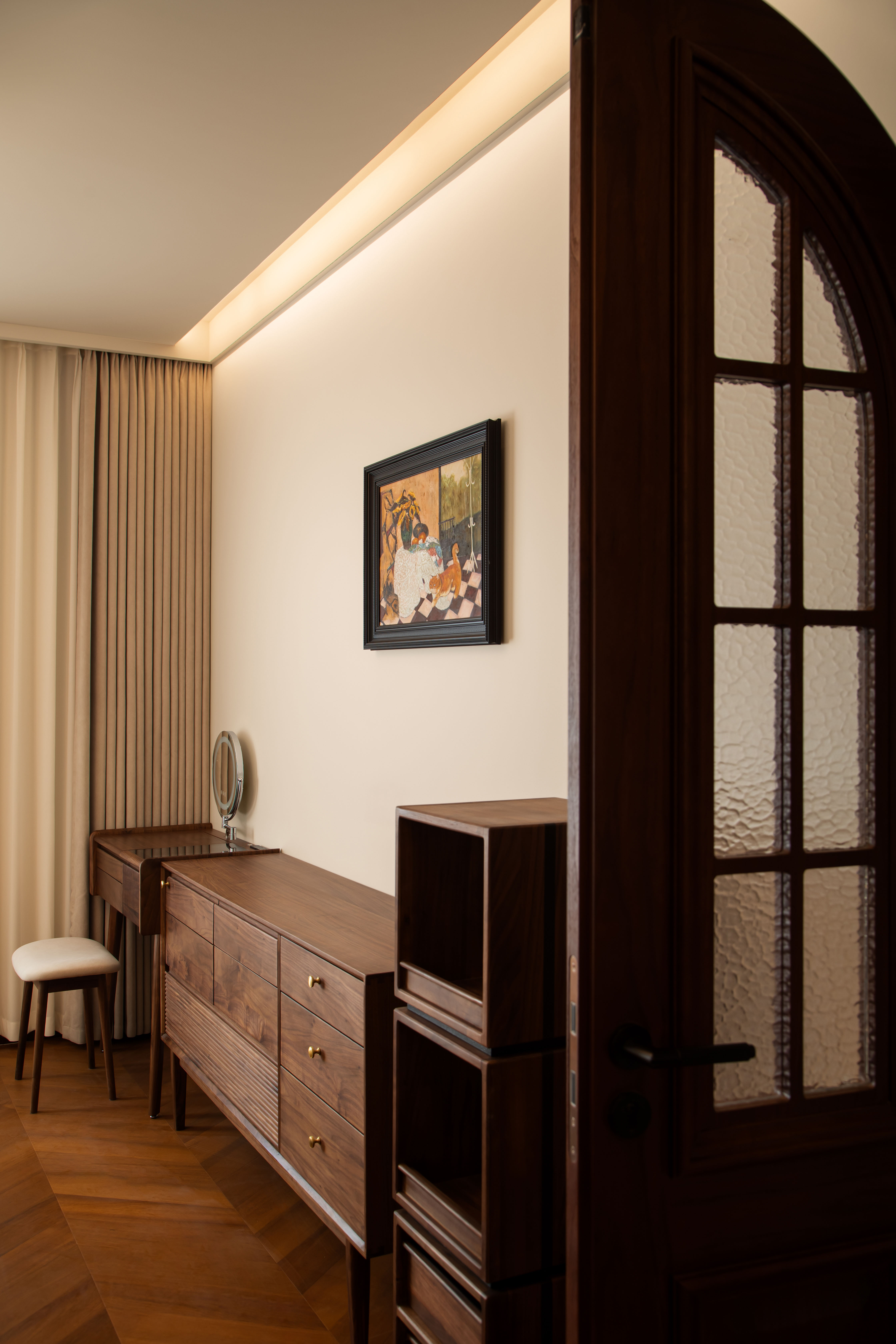 设计选材:墙面以奶咖色、燕麦色、浅棕色等暖调为基底,选用复古肌理漆、木饰面或微水泥,还原中古特有的温润质感
