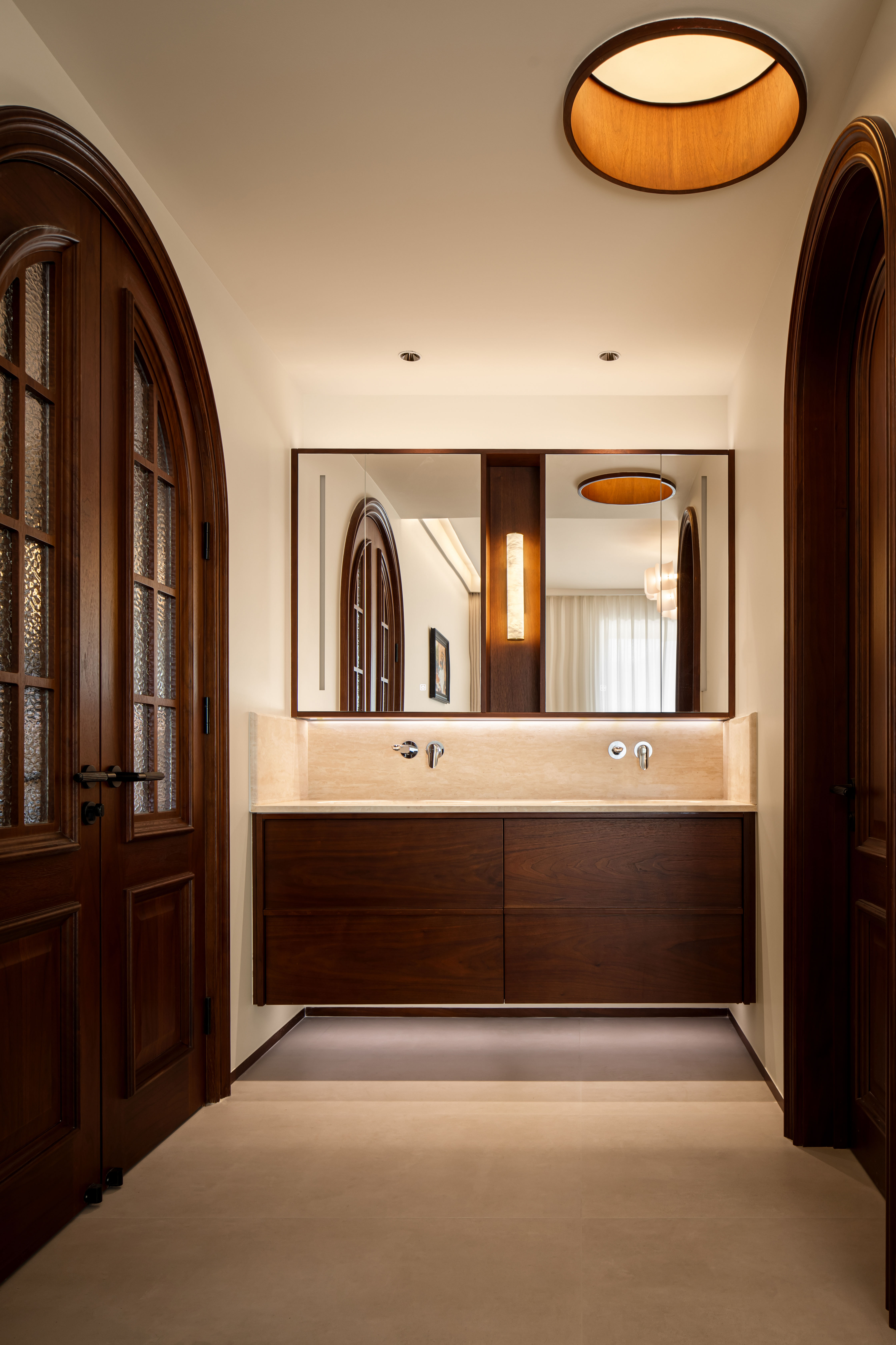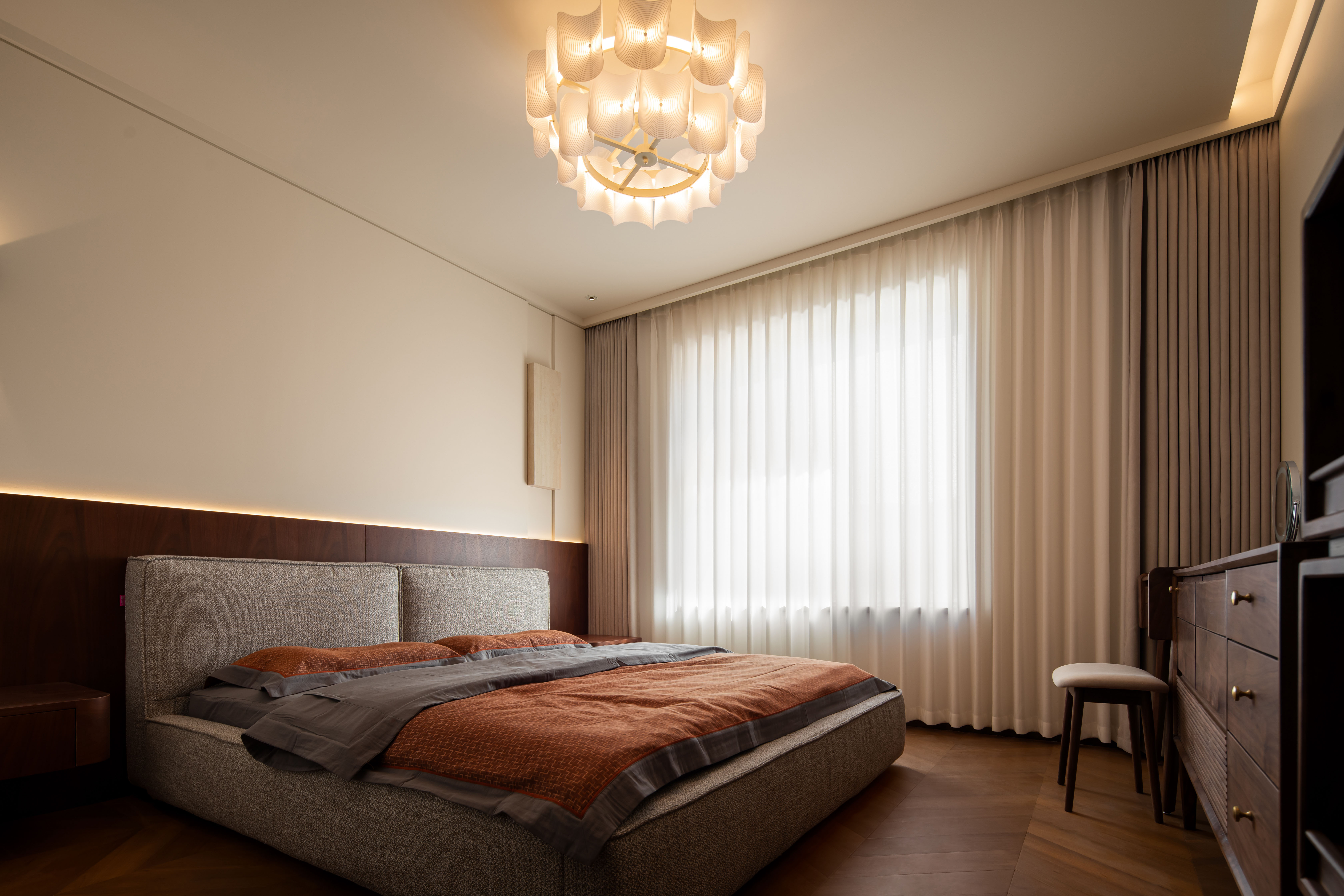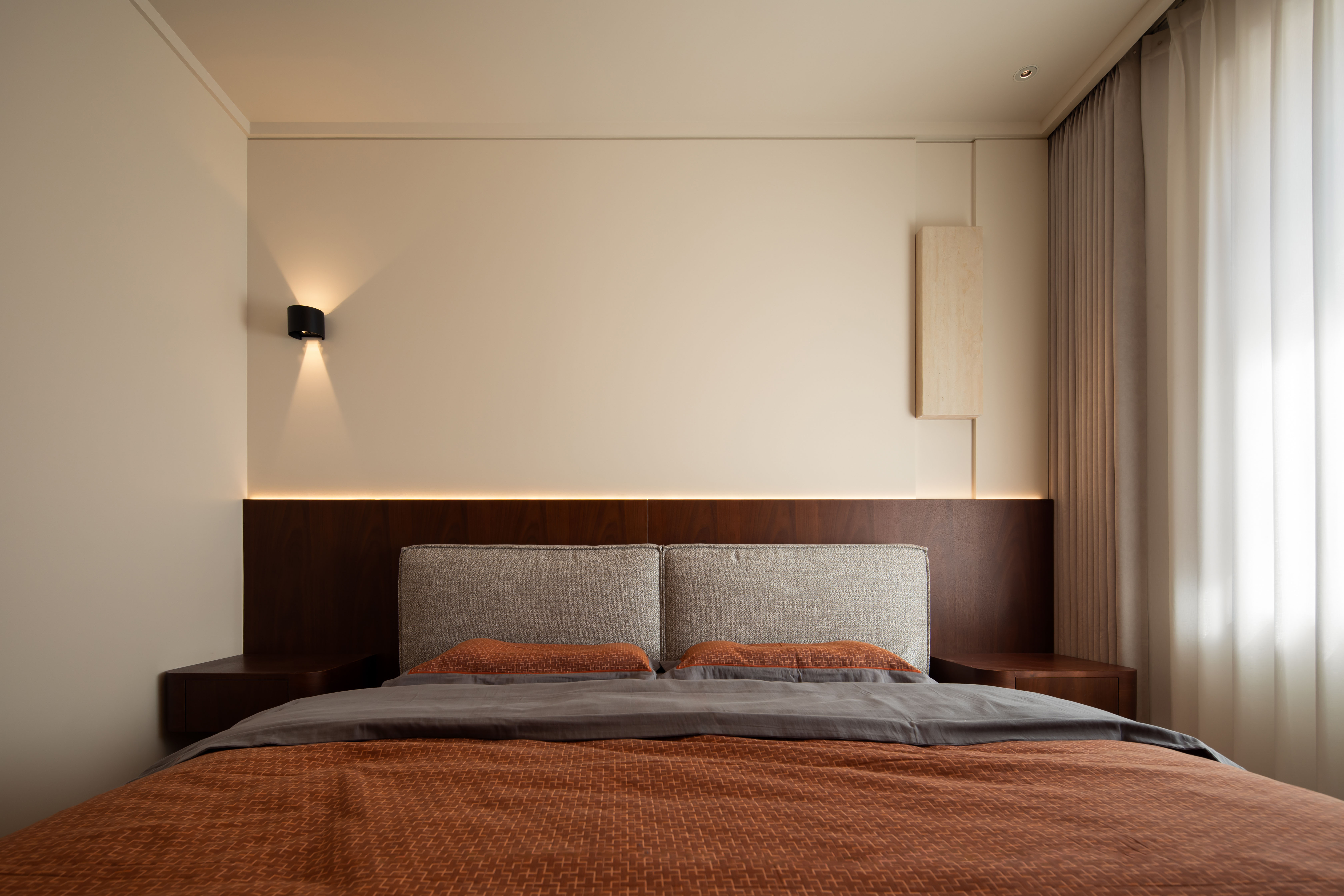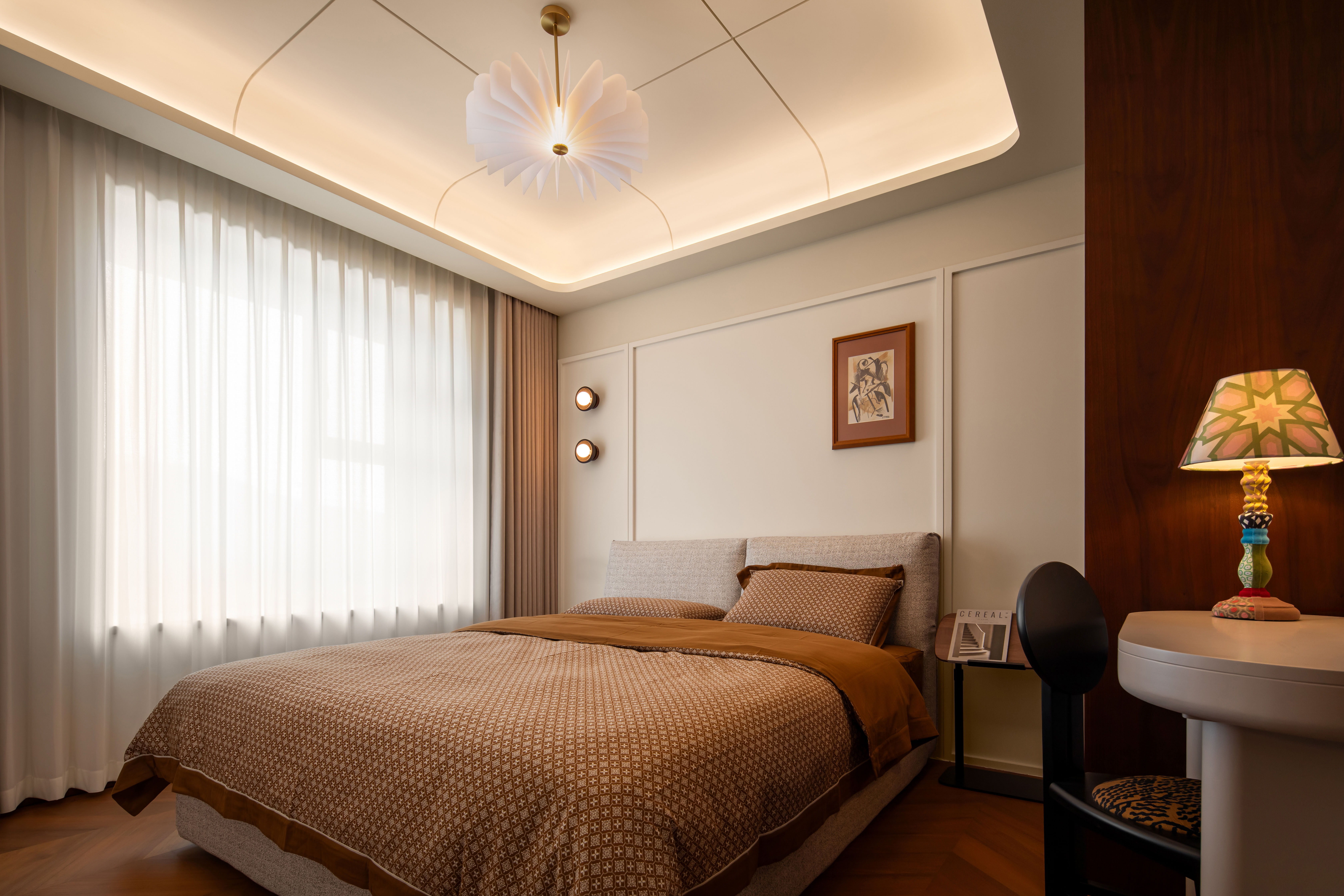 设计选材:墙面以奶咖色、燕麦色、浅棕色等暖调为基底,选用复古肌理漆、木饰面或微水泥,还原中古特有的温润质感