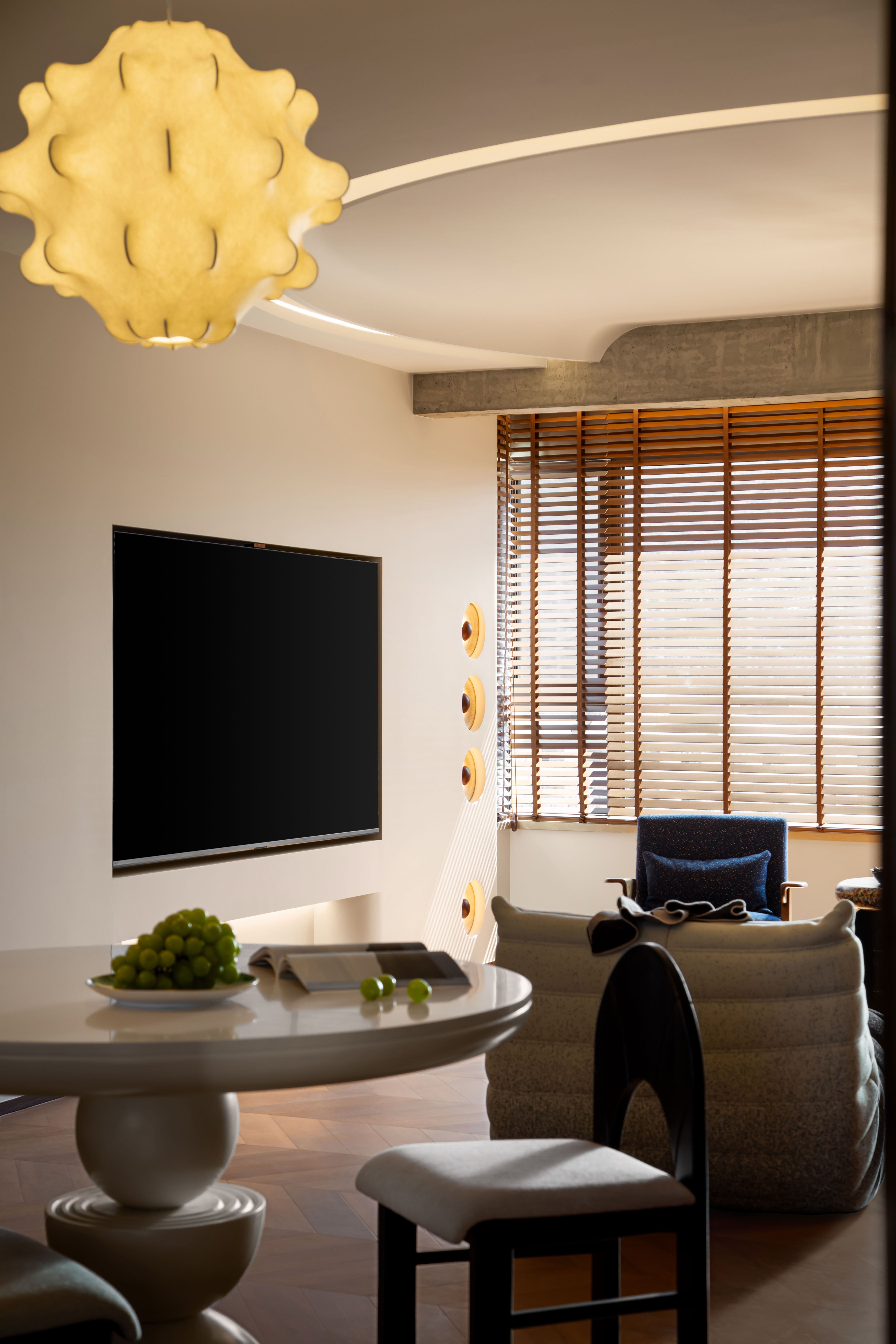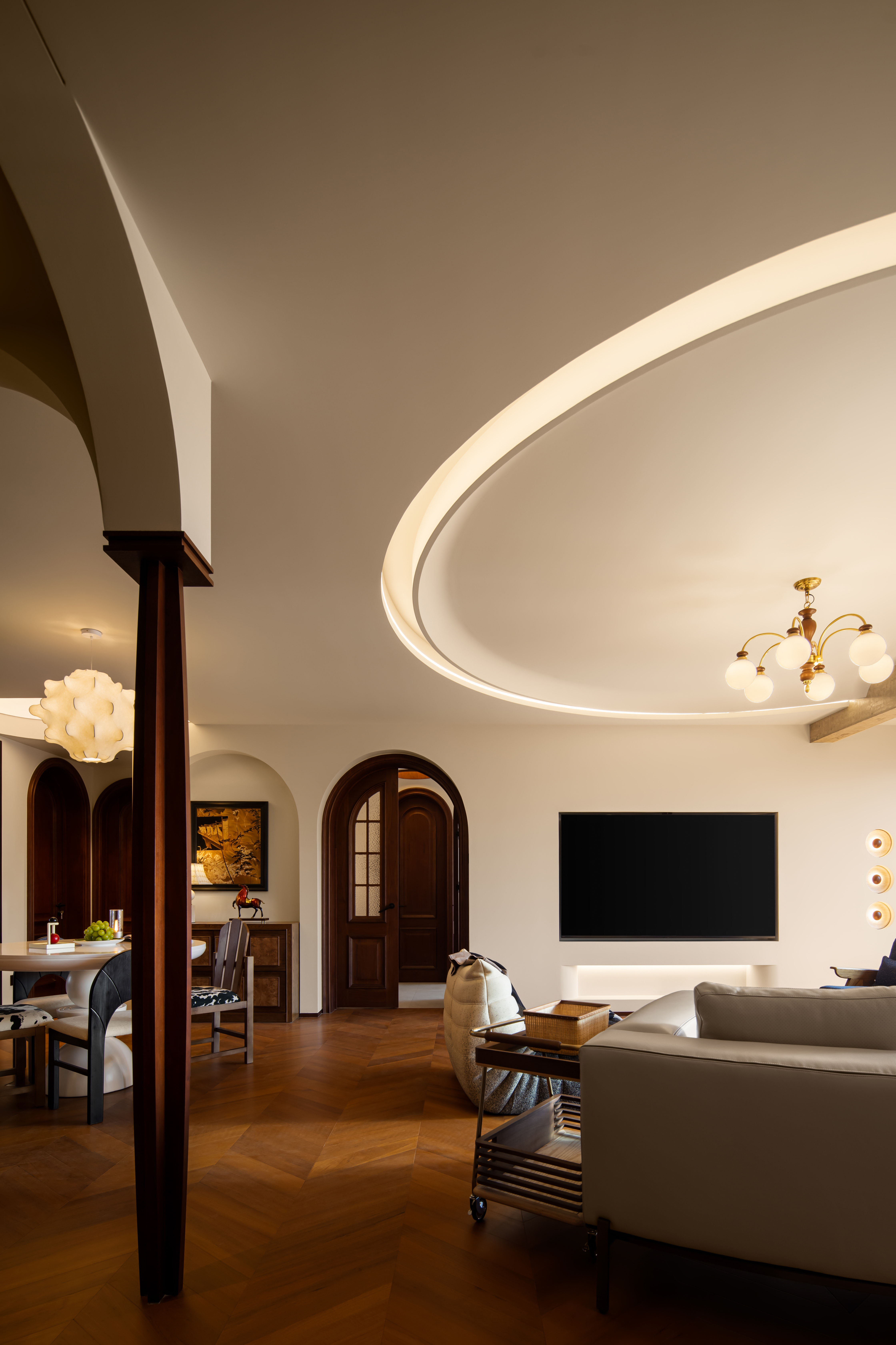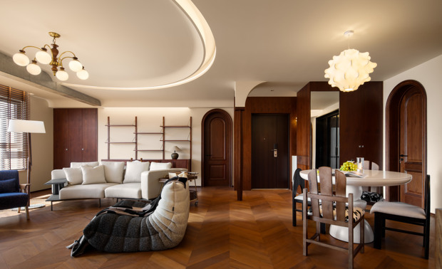 空间意境:客餐一体化区域作为家庭核心,适配日常休闲、好友小聚、亲子互动等场景。中古实木沙发、经典造型餐桌搭配复古肌理墙面,营造 “慵懒不局促” 的聚会氛围,既适合围坐聊天、用餐,也能满足临时办公、阅读、孩子玩耍等多元需求,让复古风格融入日常烟火气;