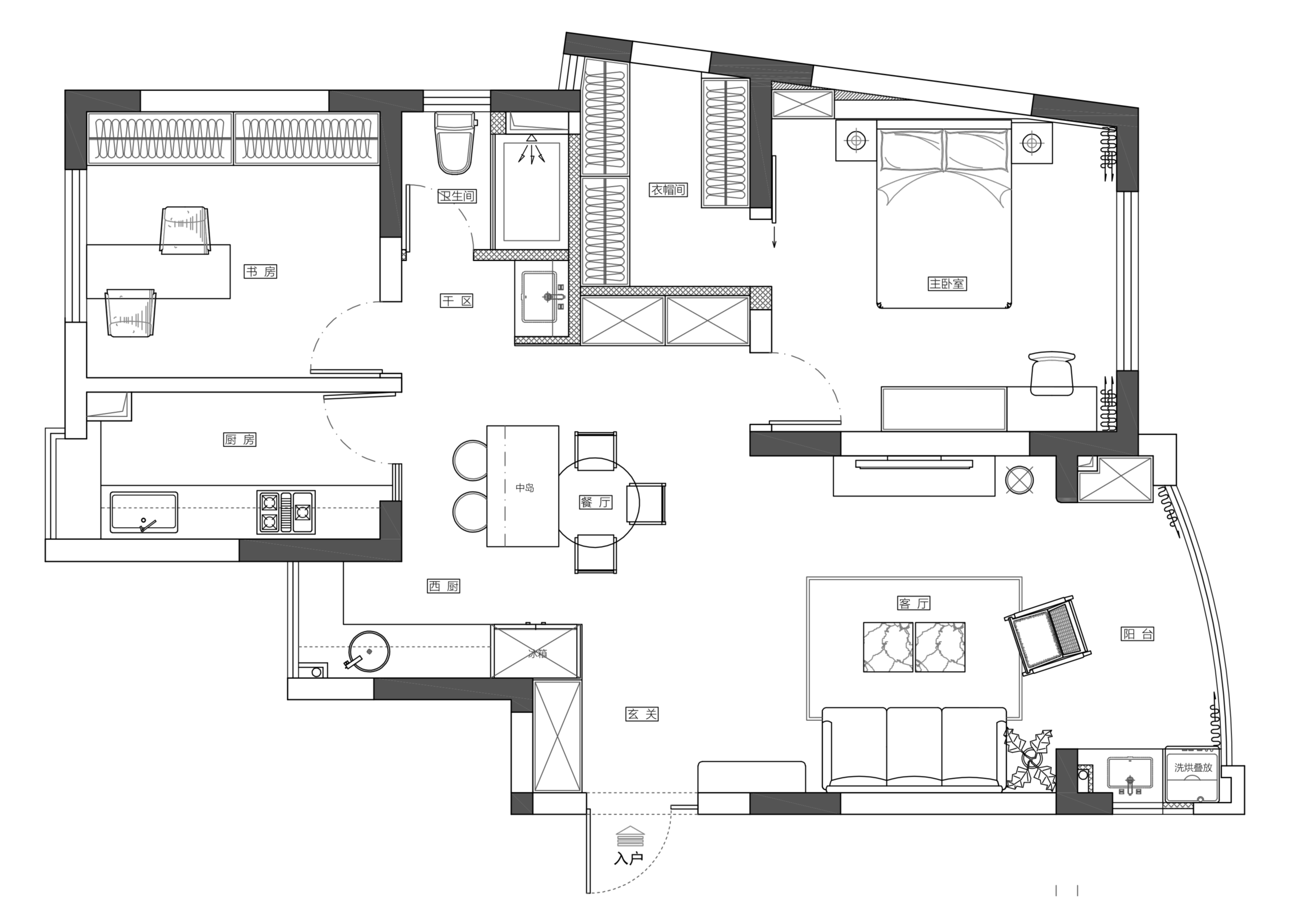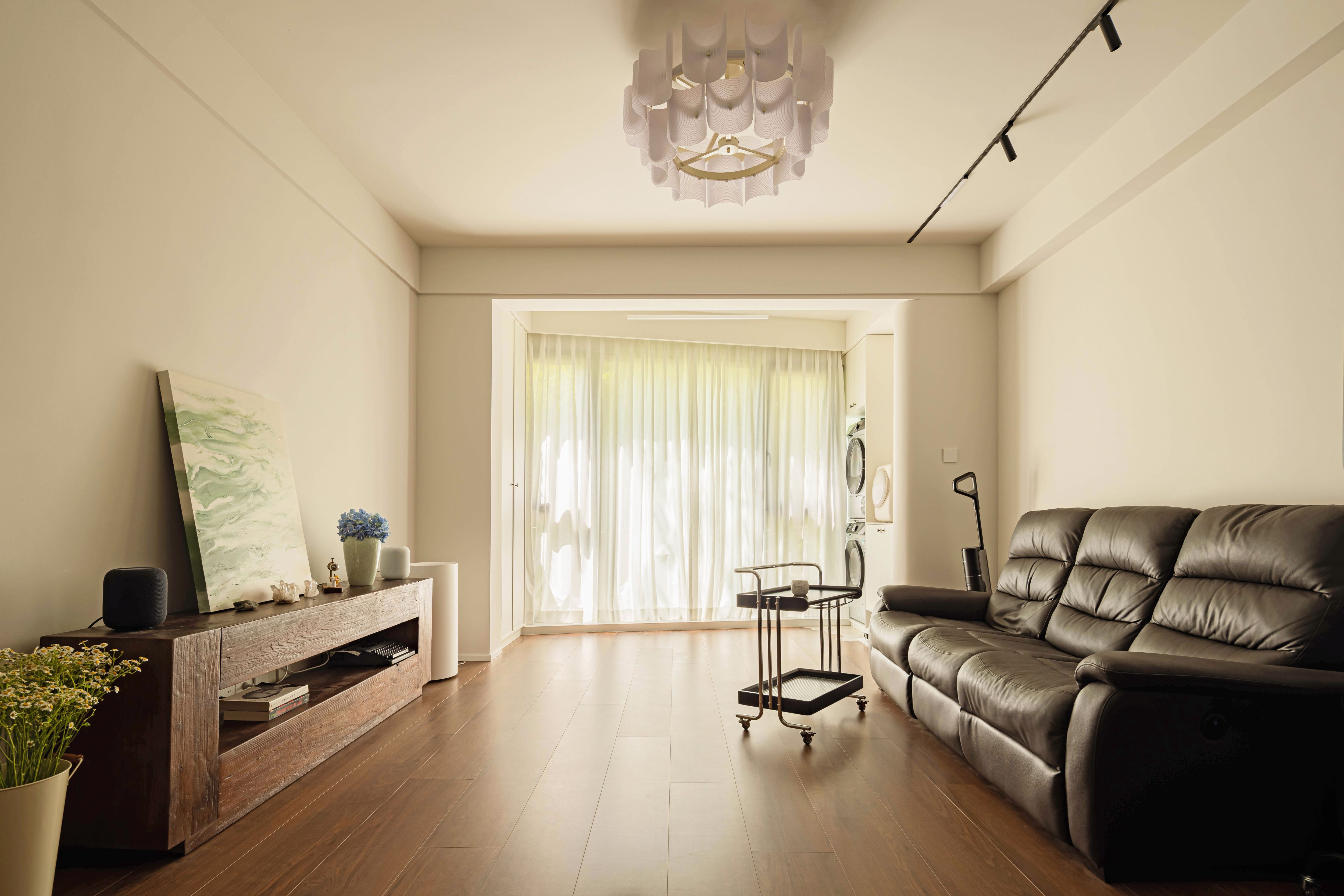 空间布局:本案在空间布局上的创新体现于对功能与灵活性的深度重构。设计师打破传统户型定式,将原次卧改造为集办公、阅读与临时接待于一体的多功能书房,充分契合年轻业主居家办公的生活方式。全屋大量采用定制嵌入式衣柜与多功能家具,在有限面积内最大化收纳效率,同时保持视觉整洁与动线流畅。客厅与书房均围绕大落地窗展开布局,不仅引入充沛自然光,更使两个核心功能区共享窗外景观,增强空间的通透感与连续性。整体布局摒弃冗余隔断,强调开放与互动,既满足日常生活的实用需求,又营造出松弛、自由的居住节奏,实现了小户型住宅在功能复合性与空间体验感上的双重提升。