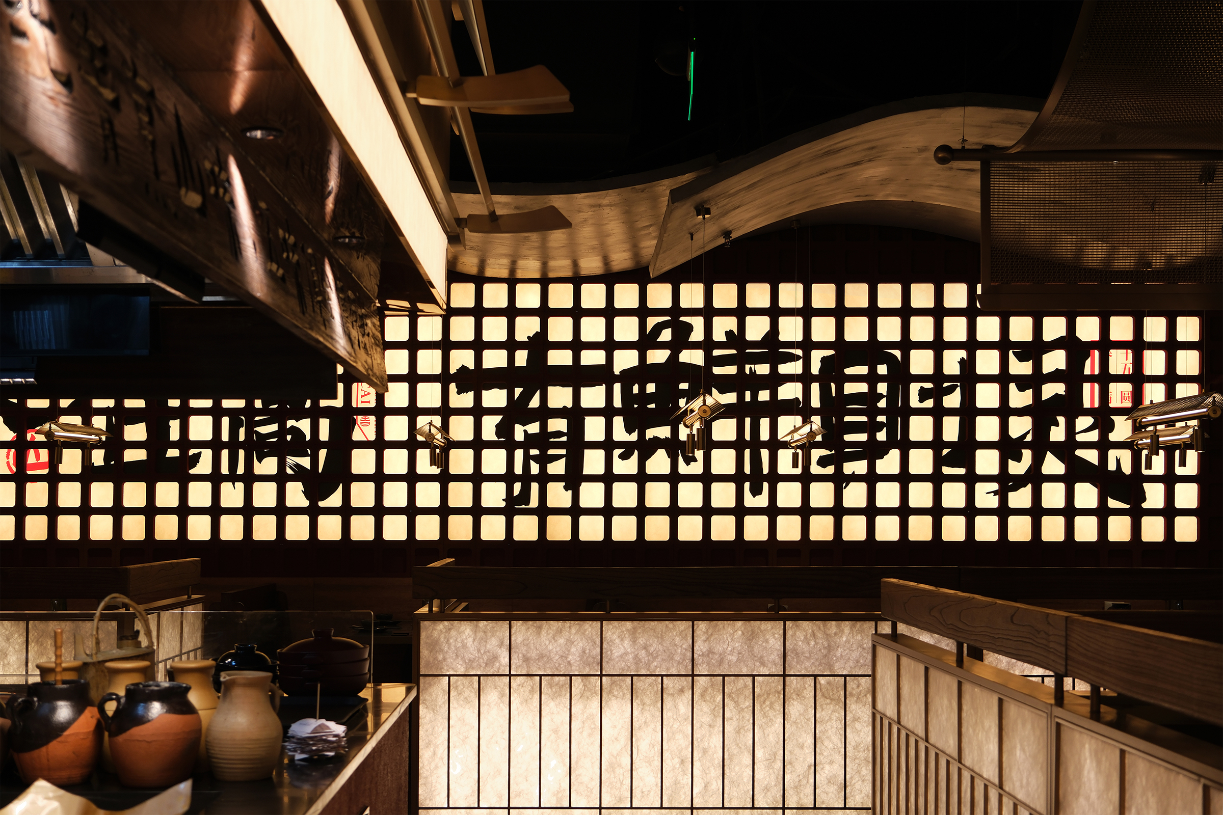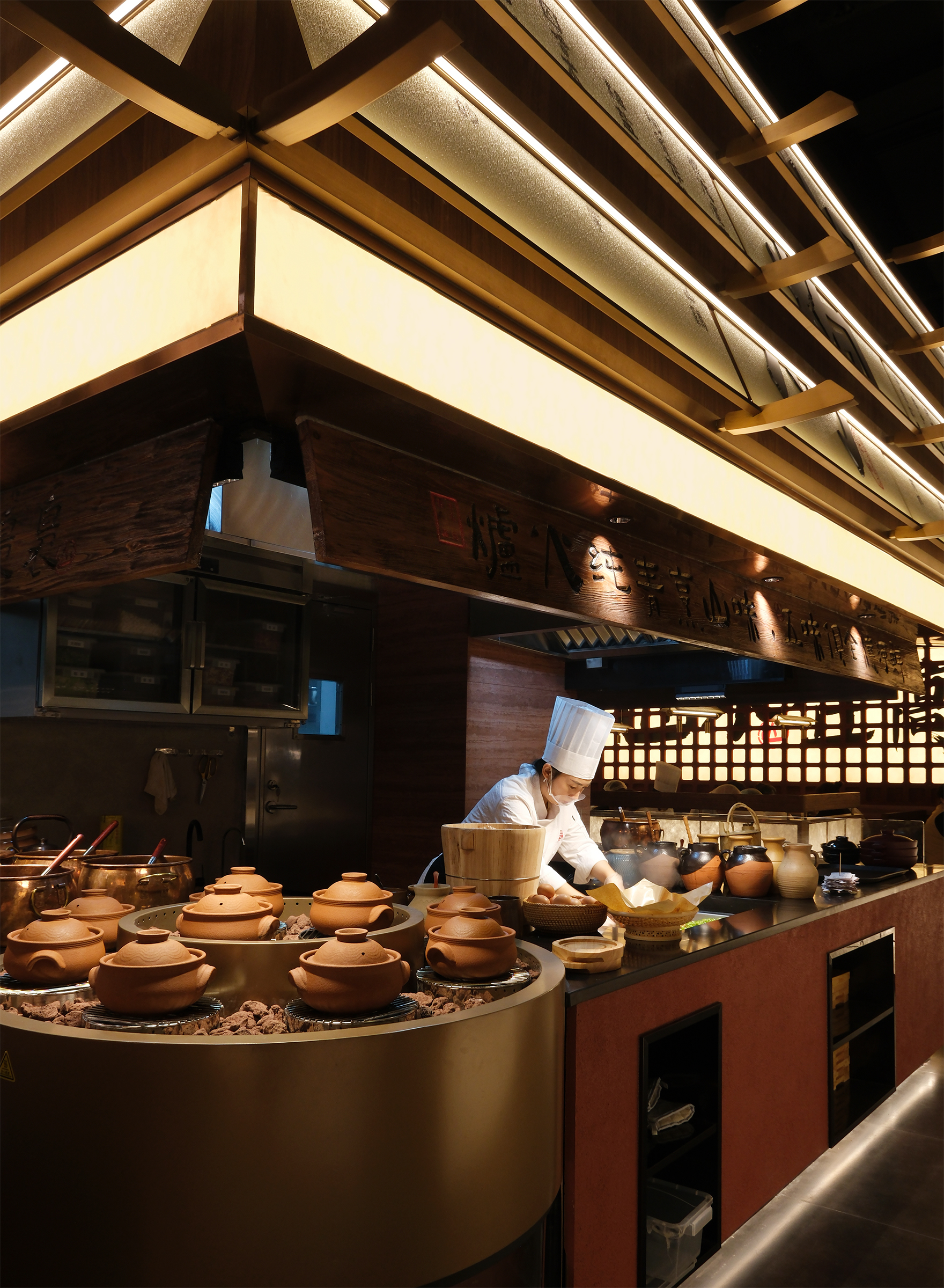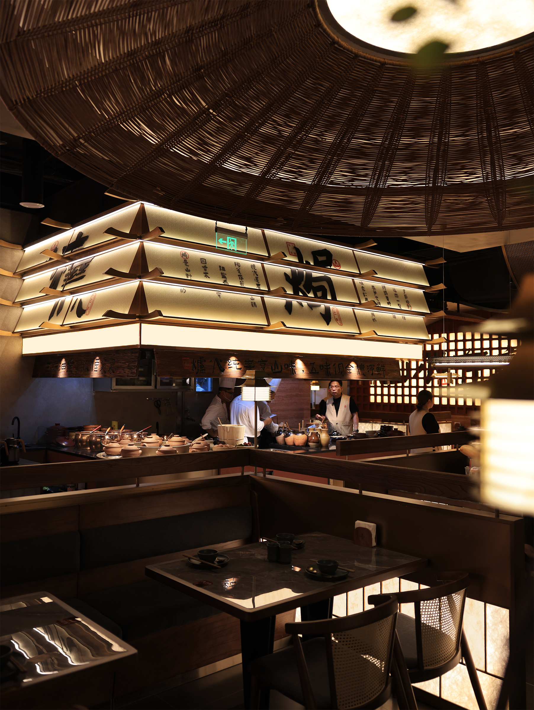 空间布局:空间布局以“进山—入院—围炉而食”的叙事逻辑展开,通过入口、用餐区与明档厨房的层层递进,引导顾客完成从城市到山野的心理转换。以“山野食材研究所”为核心焦点,将明档厨房转化为互动舞台,引入光影竹海与雾森系统,使功能空间同时具备展示性、参与性与情绪引导作用,打破传统餐厅静态布局模式。