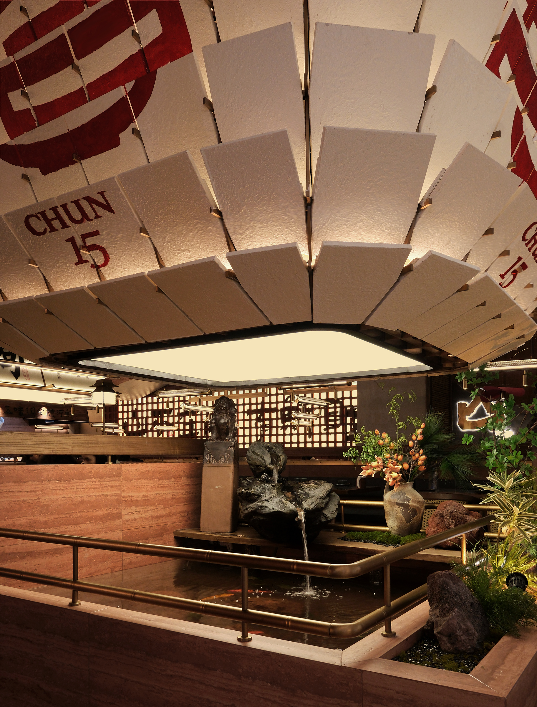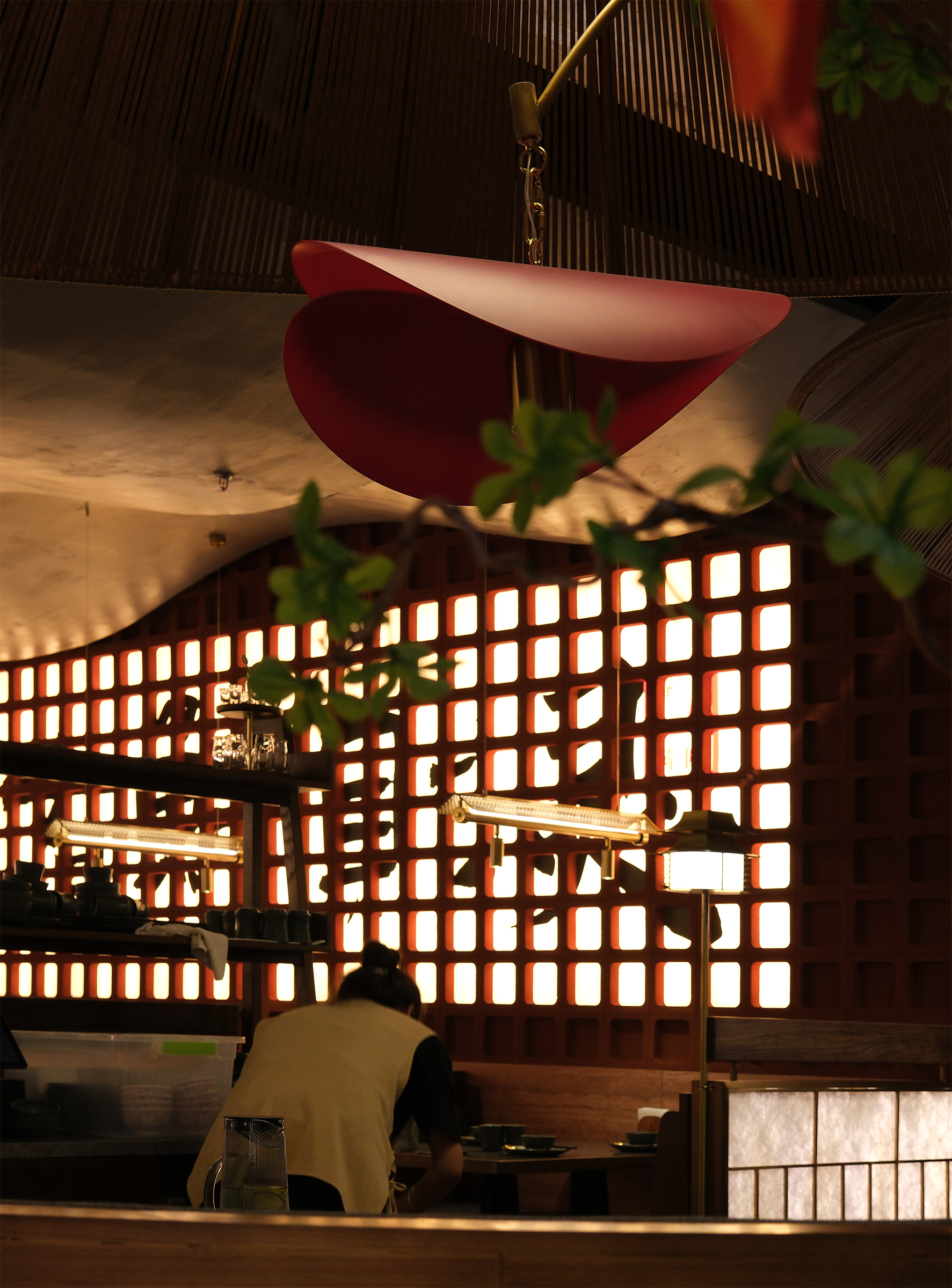 空间意境:空间场景以“月光”为核心叙事线索,将自然意象转译为可感知的空间语言。通过灯笼式入口、编织网灯罩形成的光之穹顶,以及斑驳投射的光影效果,营造出介于室内与山野之间的诗性场域。设计摒弃符号化的传统装饰,而以光影、材质与氛围构建沉浸式体验,使空间呈现出兼具东方浪漫与当代审美的创新餐饮环境。