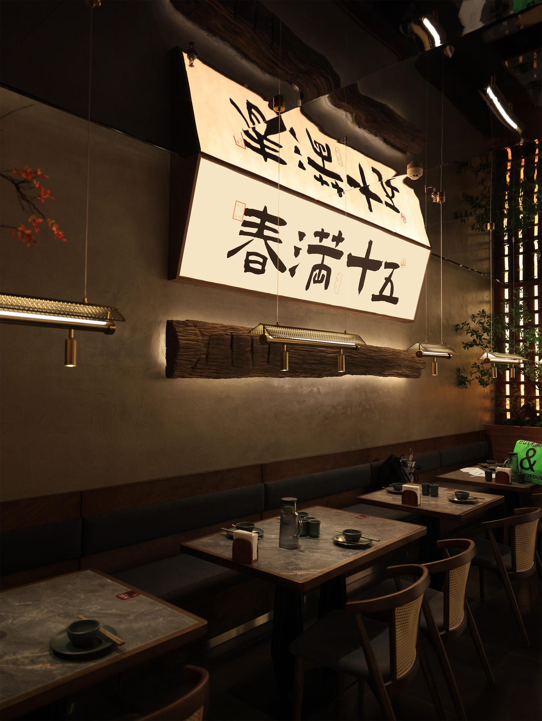 项目定位:本项目定位为一家植根地域文化、以情感叙事为核心的当代餐饮空间。设计以“盛唐长安”与“黄山山野”为双重文化母题,通过“十五小团圆”的生活意象,构建一座连接风土记忆与当代城市生活的情感桥梁。空间不止承载饮食功能,更以设计为媒介,让黄山土菜在西安语境中获得新的文化表达与品牌生命力,成为嵌入城市肌理的温情文化触点。