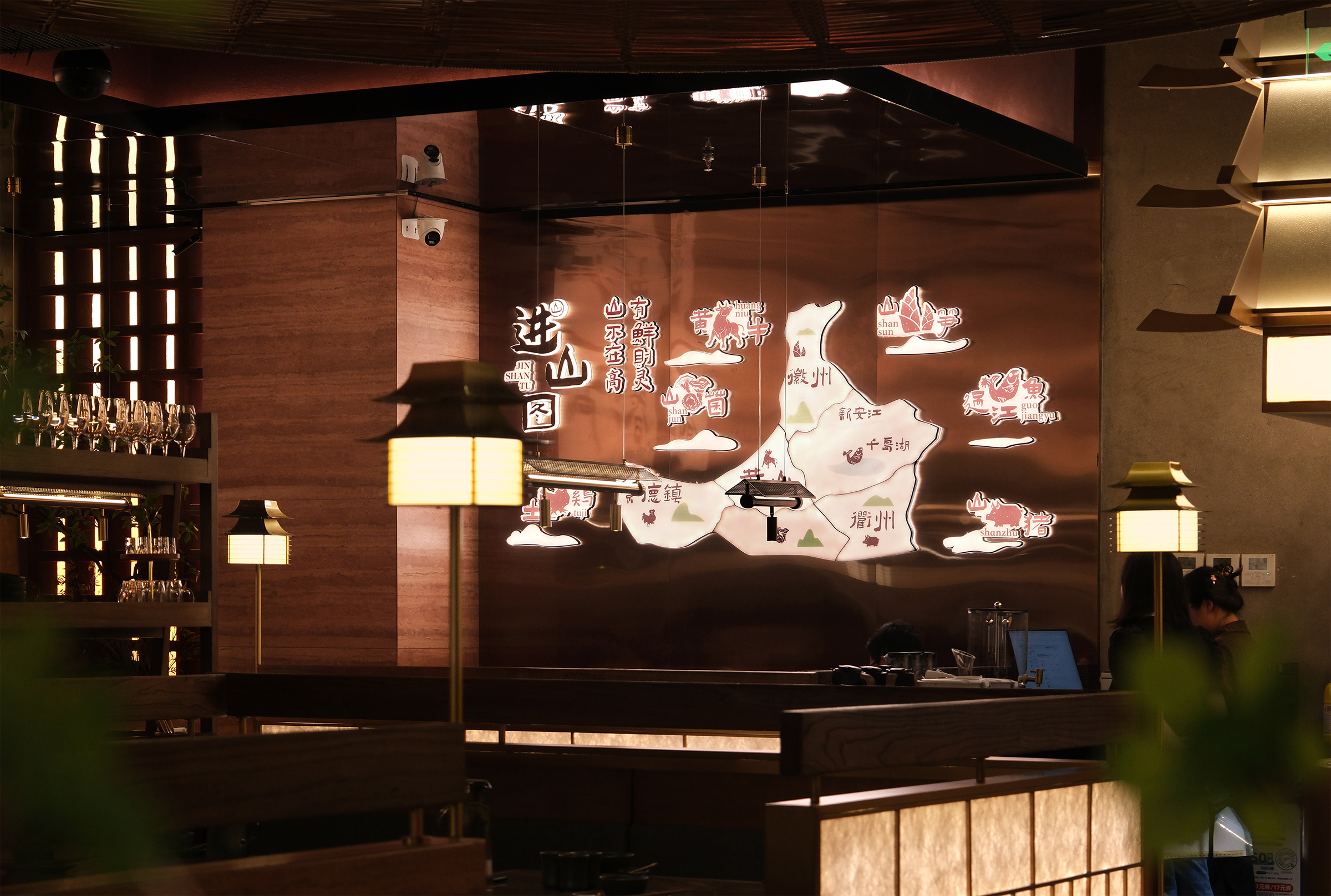 用户体验:空间投入使用后,为顾客营造出强烈而温和的沉浸式用餐体验。柔和的“月光”灯效、雾森与光影系统,使顾客在就餐过程中获得放松与情绪安定感。开放式厨房增强了互动与信任感,强化“进山吃山”的主题认知。整体空间被评价为具有高度记忆点、文化氛围浓厚、适合聚餐与团圆的餐饮场所,成功将饮食体验升华为情感体验。