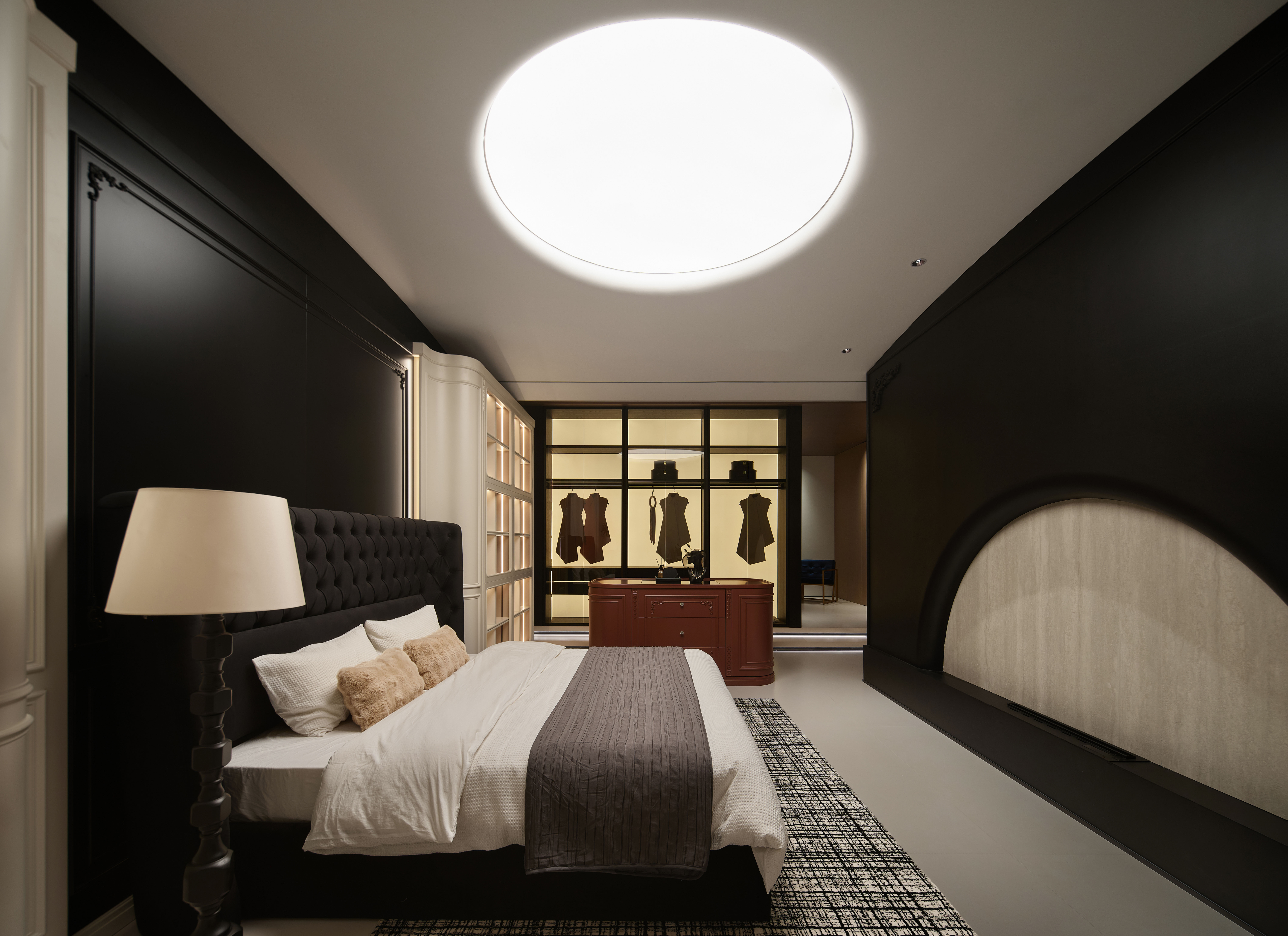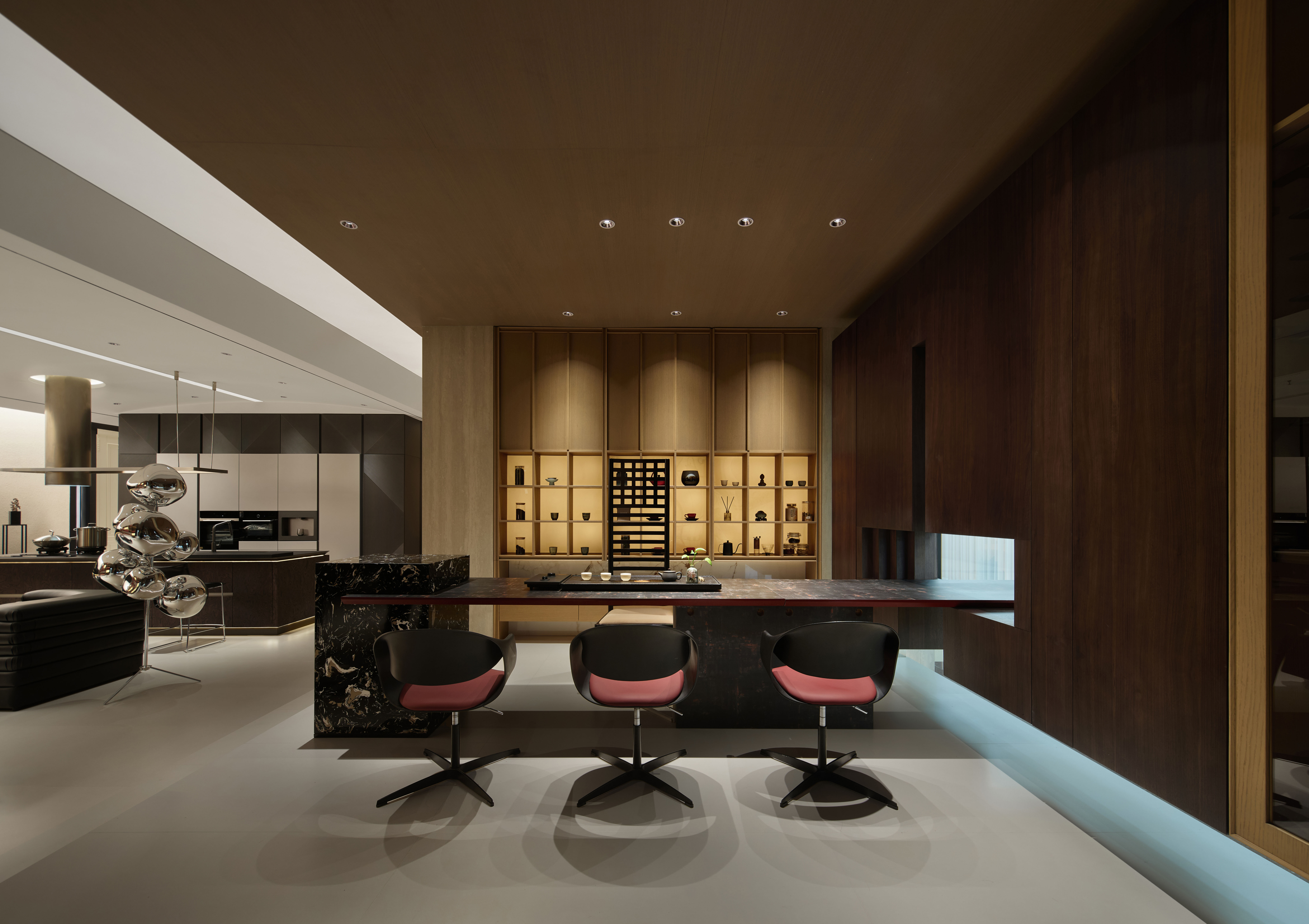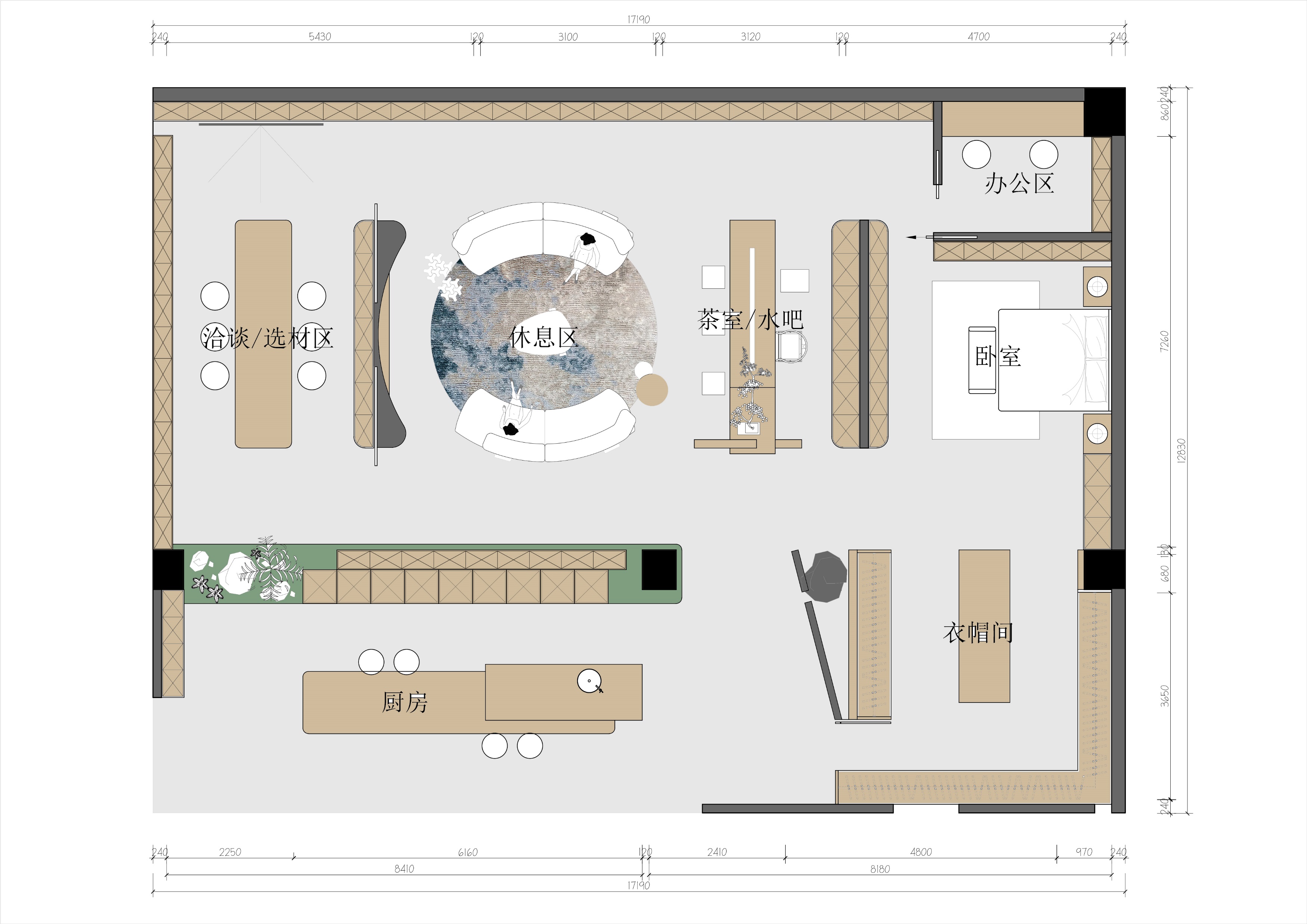 空间布局:打破传统厨电展厅“产品分区陈列”的局限,以厨房区为核心枢纽,联动相邻的休息区、茶室 / 水吧区,形成“烹饪体验 - 休闲互动”的无界生活场景闭环,让华帝烟机、灶具等产品自然嵌入日常使用情境;同时将平面图中的洽谈 / 选材区紧邻厨房体验区布局,实现“产品体验 - 方案沟通 - 选材决策”的近场衔接,解决传统展厅“体验与转化动线割裂”的问题;更突破厨电展厅的空间边界,在平面图中纳入卧室、衣帽间等家居区域,将华帝智能厨电与全屋空间联动(如厨房与卧室的智能温控、烟机与衣帽间的空气联动),实现“厨电 + 全家居场景”的前置适配展示,既呼应华帝“科技赋能全屋生活”的品牌主张,也让空间布局更贴合前装用户的实际需求。