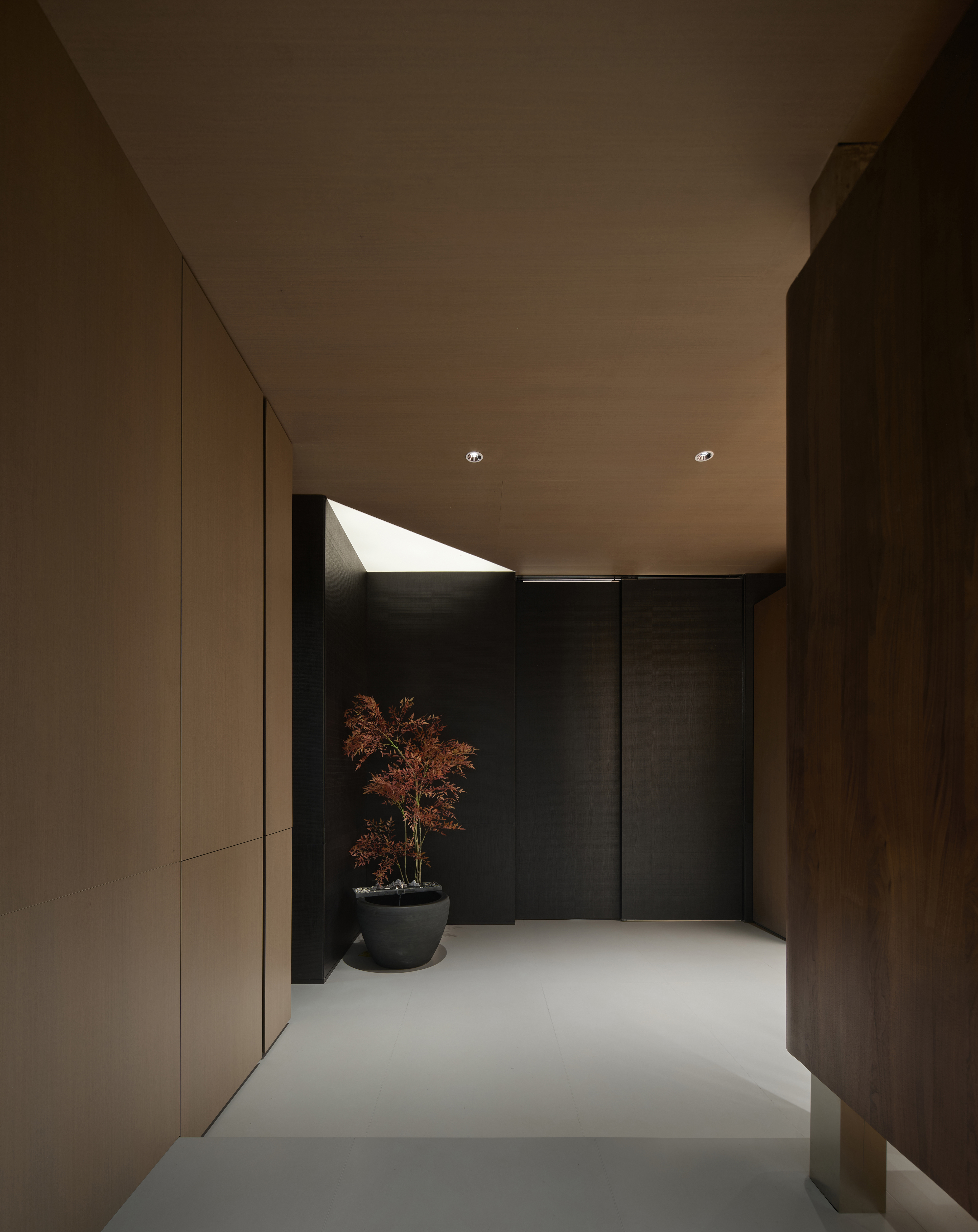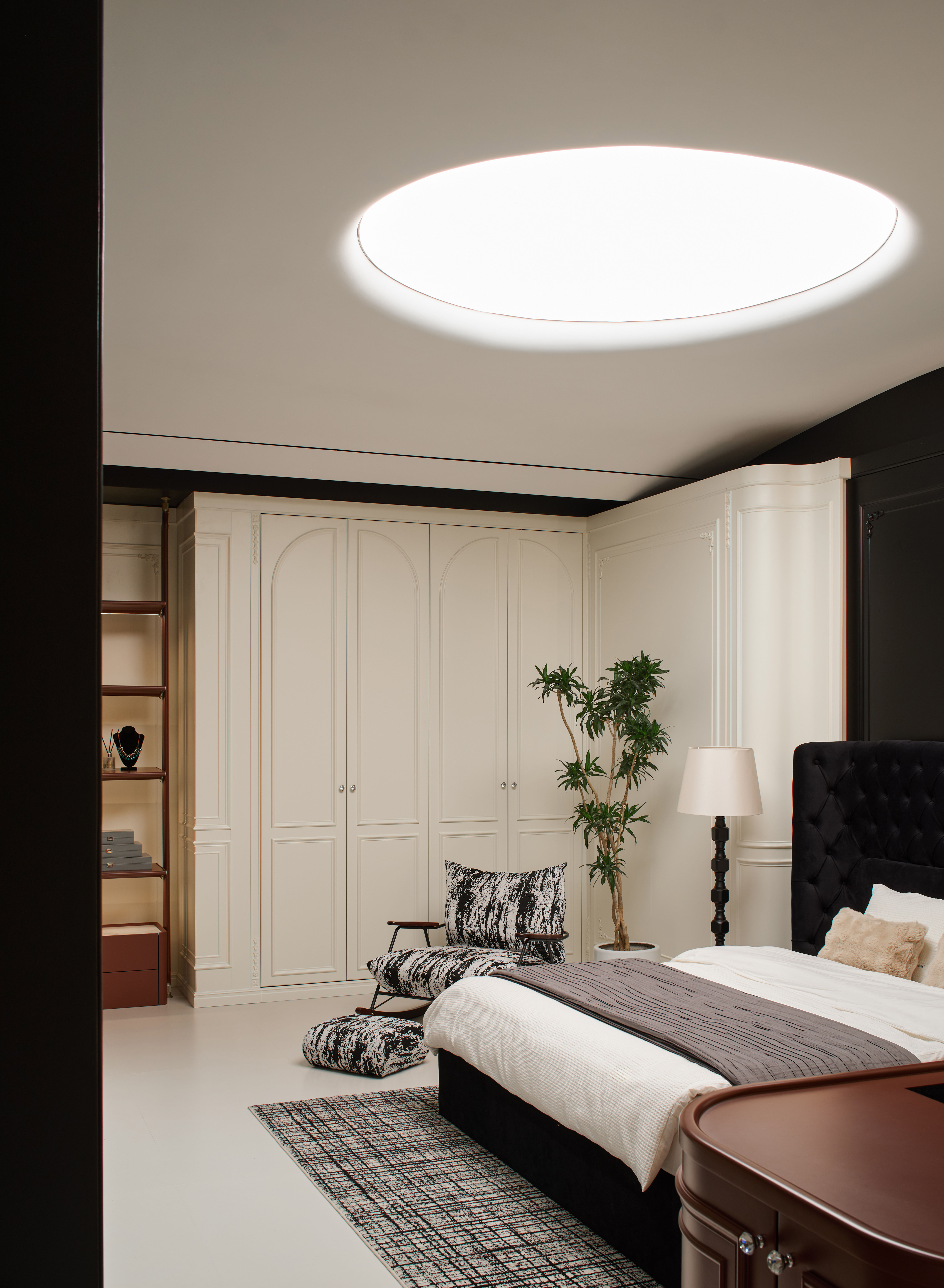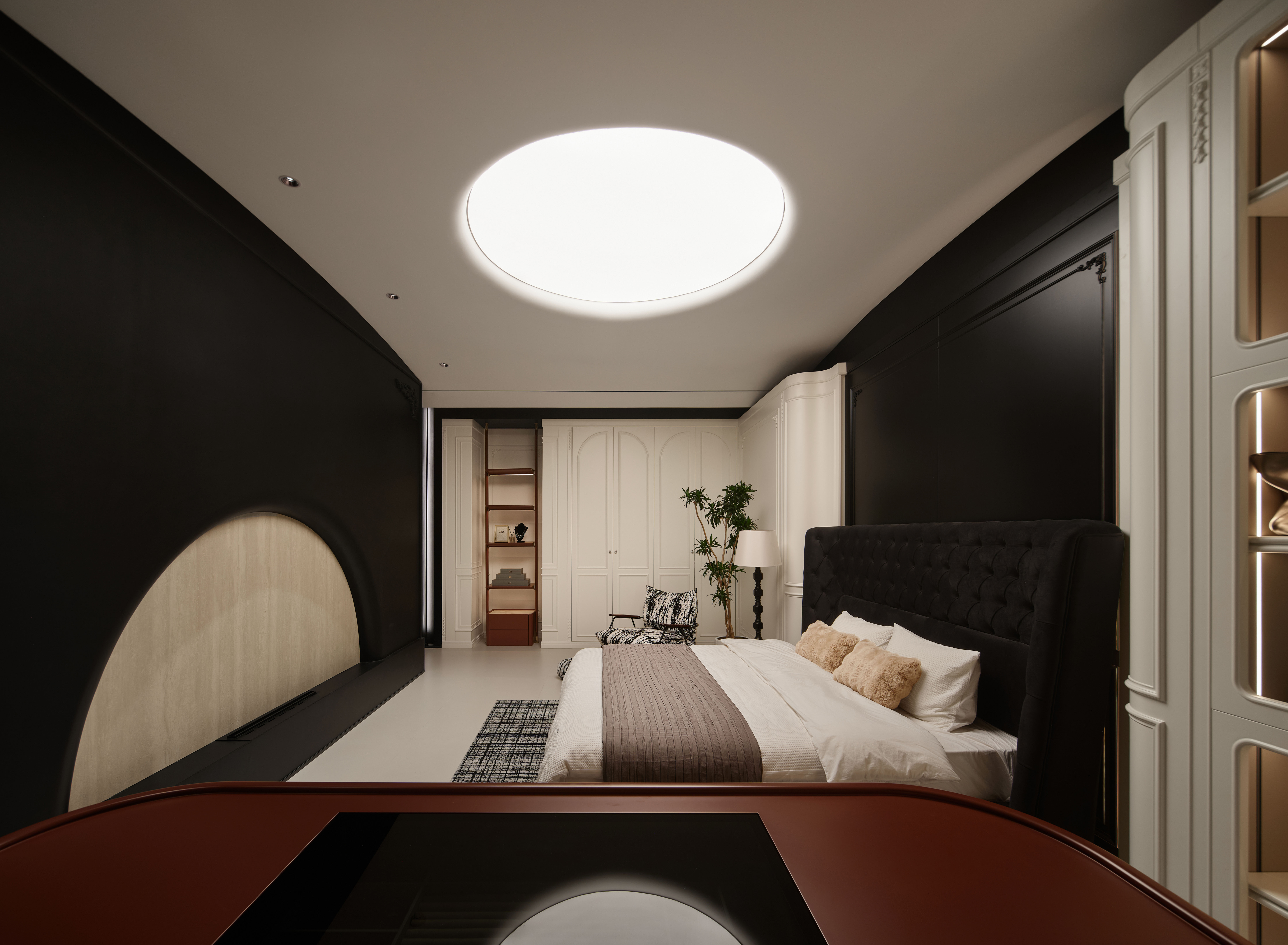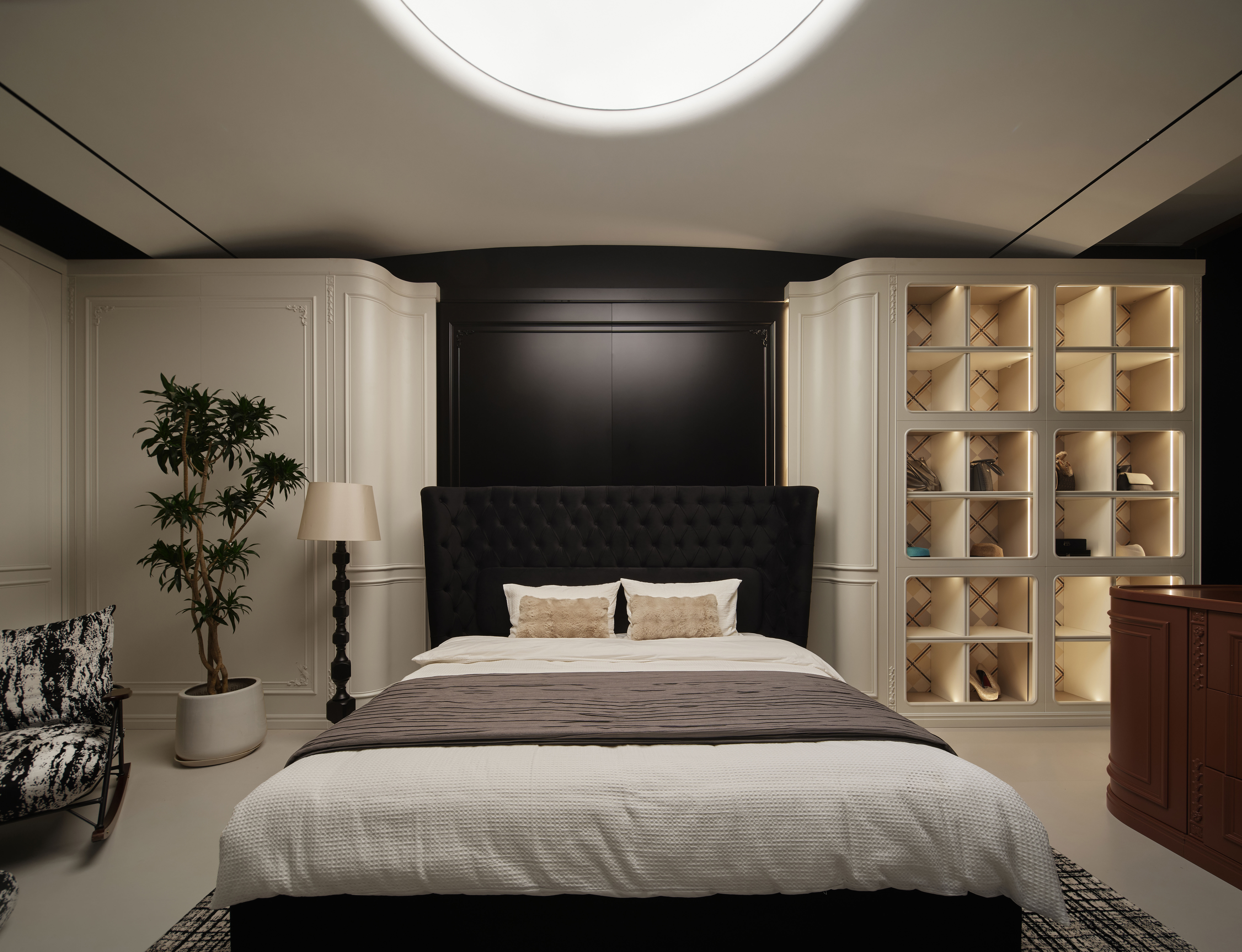 空间布局:打破传统厨电展厅“产品分区陈列”的局限,以厨房区为核心枢纽,联动相邻的休息区、茶室 / 水吧区,形成“烹饪体验 - 休闲互动”的无界生活场景闭环,让华帝烟机、灶具等产品自然嵌入日常使用情境;同时将平面图中的洽谈 / 选材区紧邻厨房体验区布局,实现“产品体验 - 方案沟通 - 选材决策”的近场衔接,解决传统展厅“体验与转化动线割裂”的问题;更突破厨电展厅的空间边界,在平面图中纳入卧室、衣帽间等家居区域,将华帝智能厨电与全屋空间联动(如厨房与卧室的智能温控、烟机与衣帽间的空气联动),实现“厨电 + 全家居场景”的前置适配展示,既呼应华帝“科技赋能全屋生活”的品牌主张,也让空间布局更贴合前装用户的实际需求。