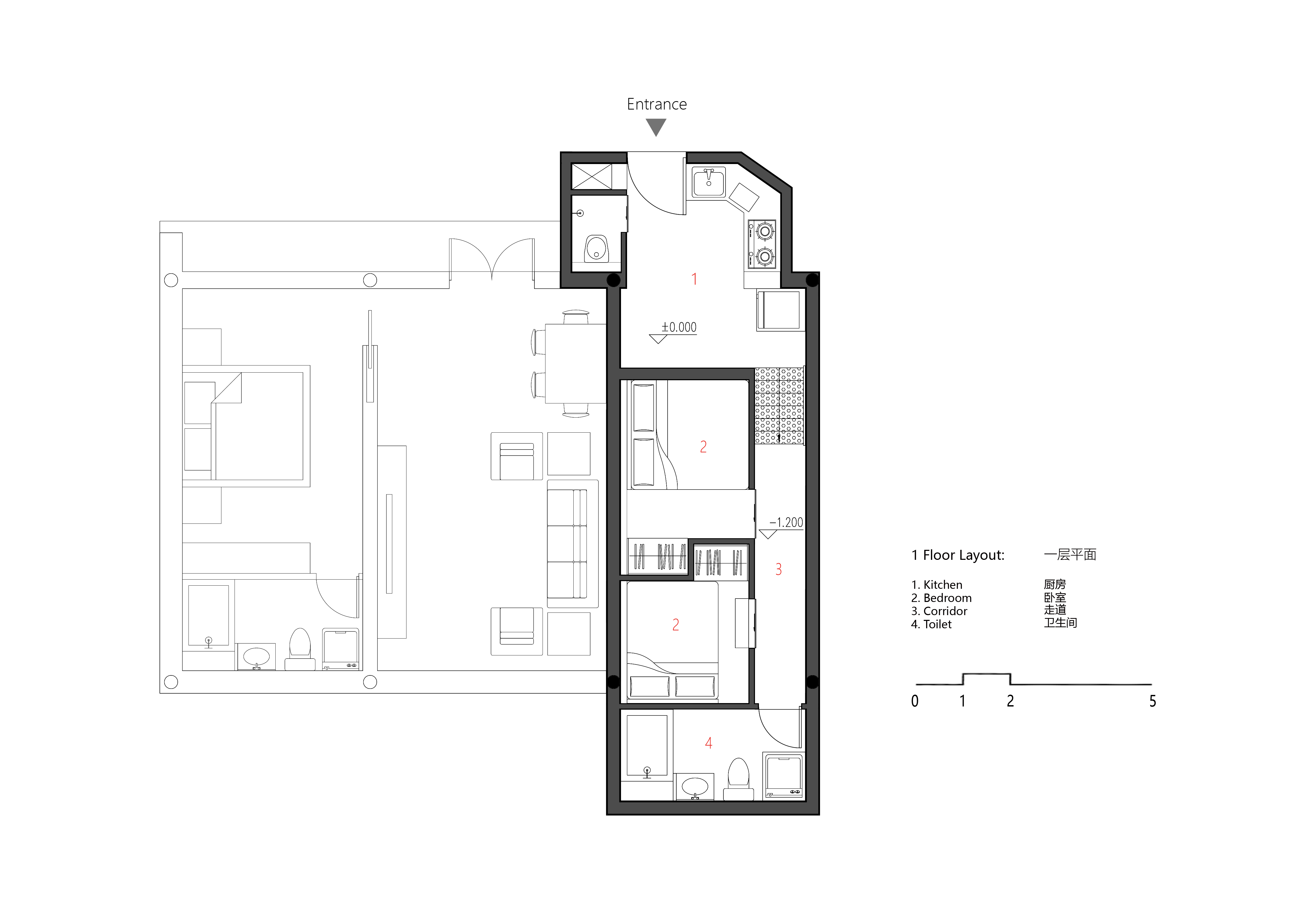 空间布局:原建筑是一个面宽仅3米、进深约10米的狭长空间。除入口一面外,其余三面紧贴邻宅,无立面开窗条件,仅靠一扇小高窗采光。设计任务是在这不足三十平方米的极限范围内,为年轻父母、两个孩子及两位老人共六口之家,规划出容纳四间卧室、两个卫生间、客厅及厨房的居住空间,同时确保每位家庭成员的尊严、隐私与代际和谐,并提供儿童成长所需的私密空间及家庭社交的公共区域。面对窄面宽条件下传统走廊布局会进一步压缩可用宽度的困境,设计团队摒弃了传统走廊布局水平扩展思路,转向垂直分层策略,于高度中挖掘潜力,最终塑造出惊人的五层立体空间
