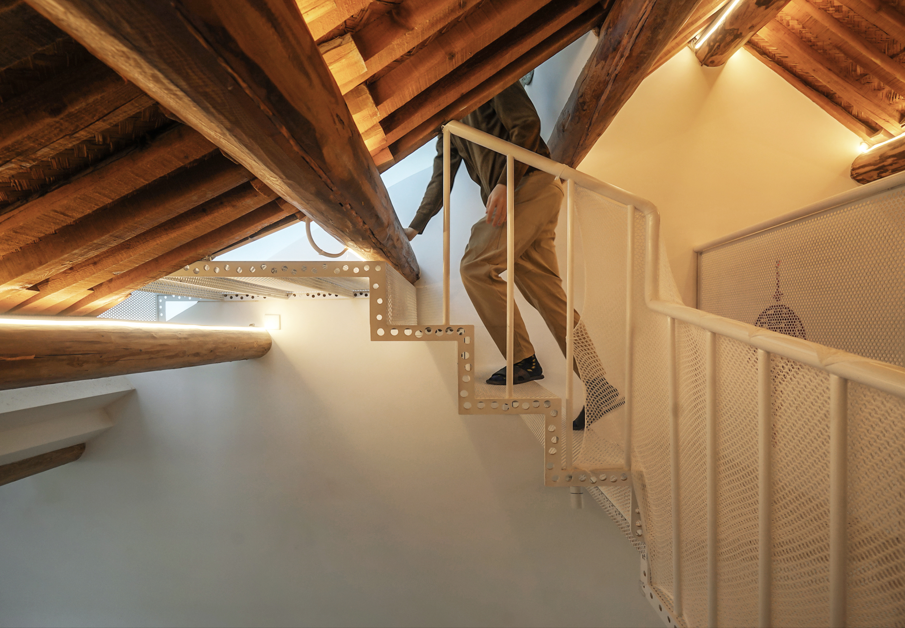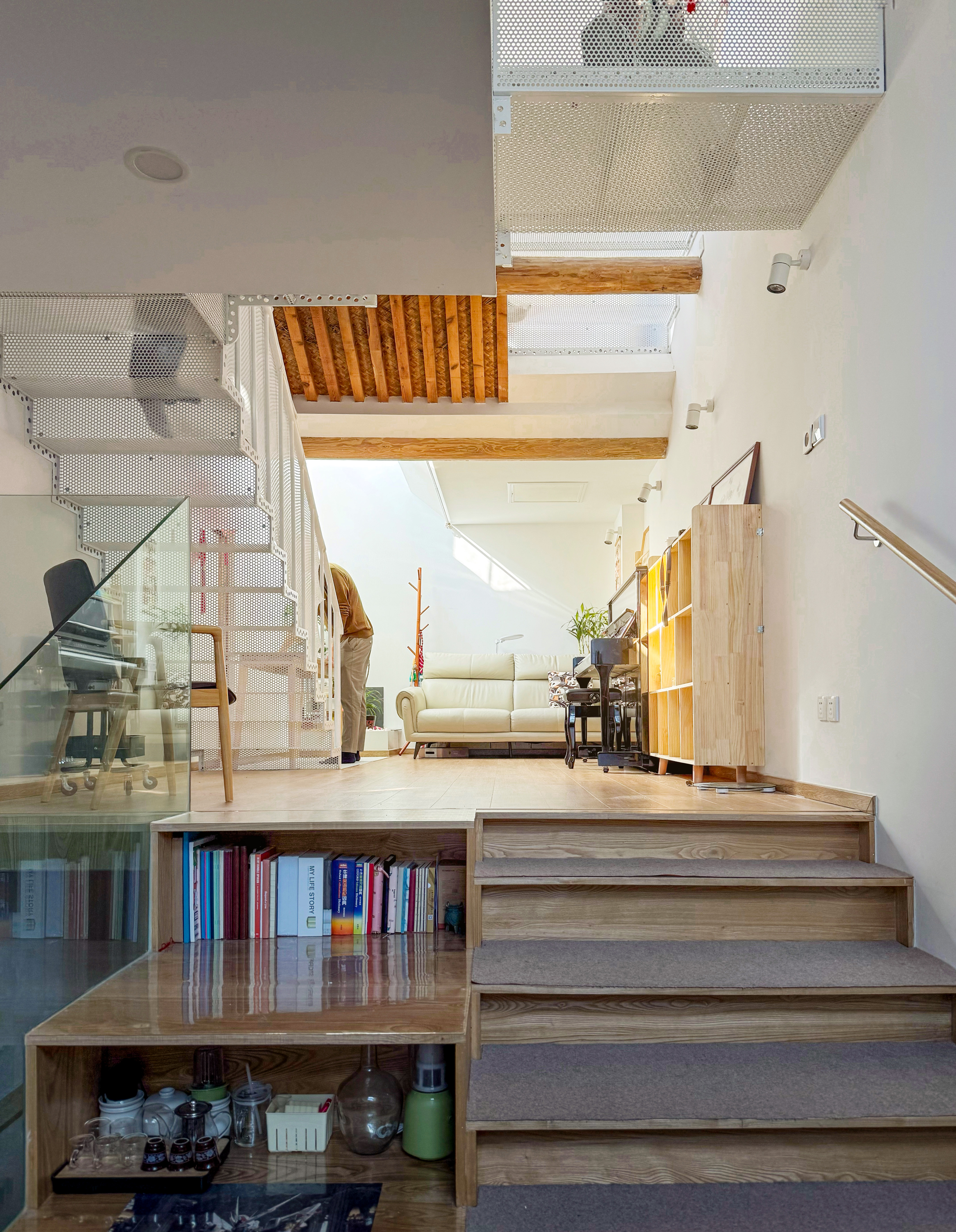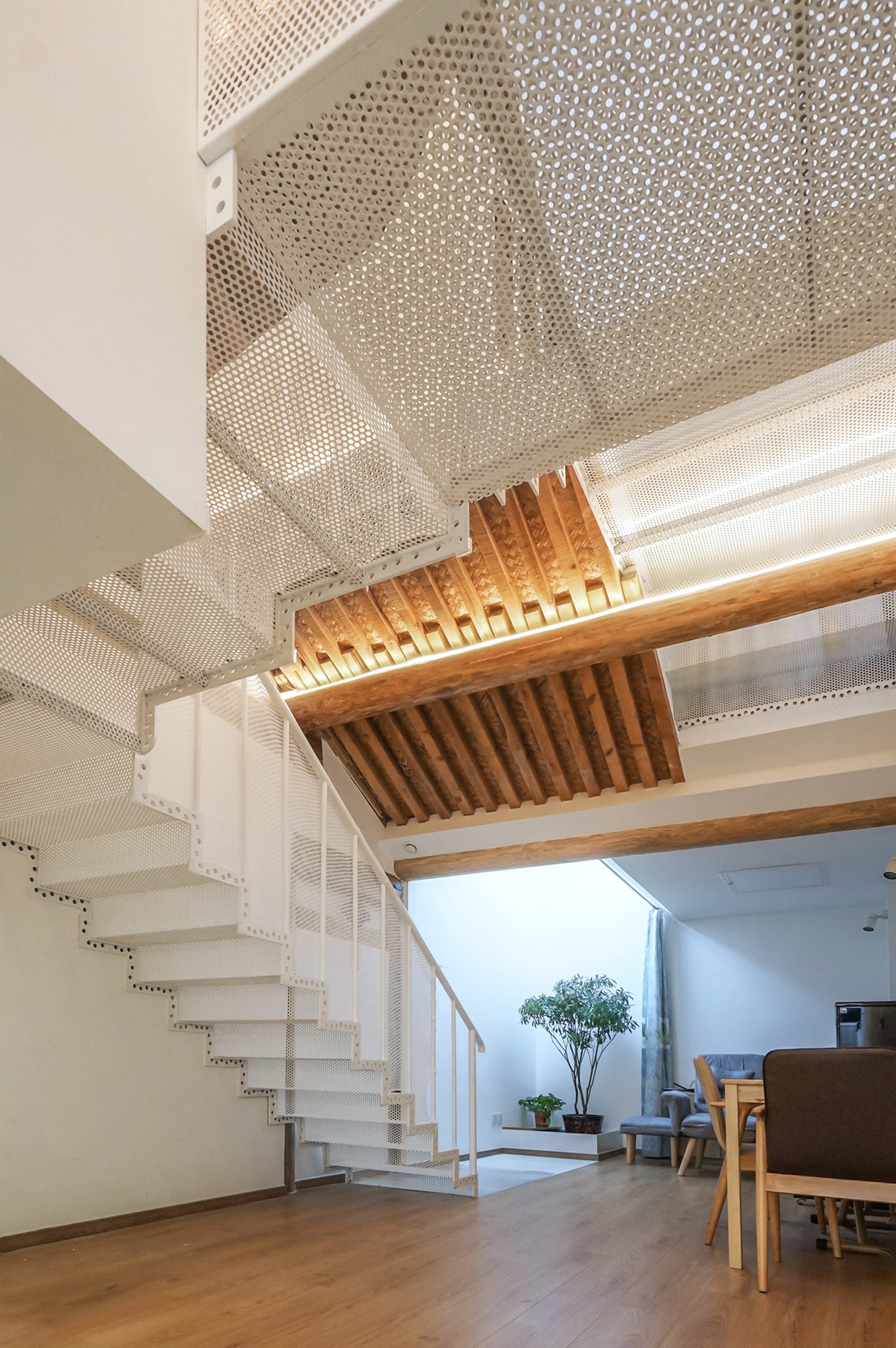 建筑的整个面宽完整的给了客厅空间,加上与玄关厨房的空间视线贯通,在客厅空间并不会感到压抑或是局促。楼梯采用穿孔板材质,以架空的形式存在于整个空间。 客厅的上空保留有原古建的屋顶与房梁,木建屋顶则只保留一半,另一半为穿孔板走道,减轻了木材的厚重感,增加了透气感,也间接增高了客厅层高的空间感知。