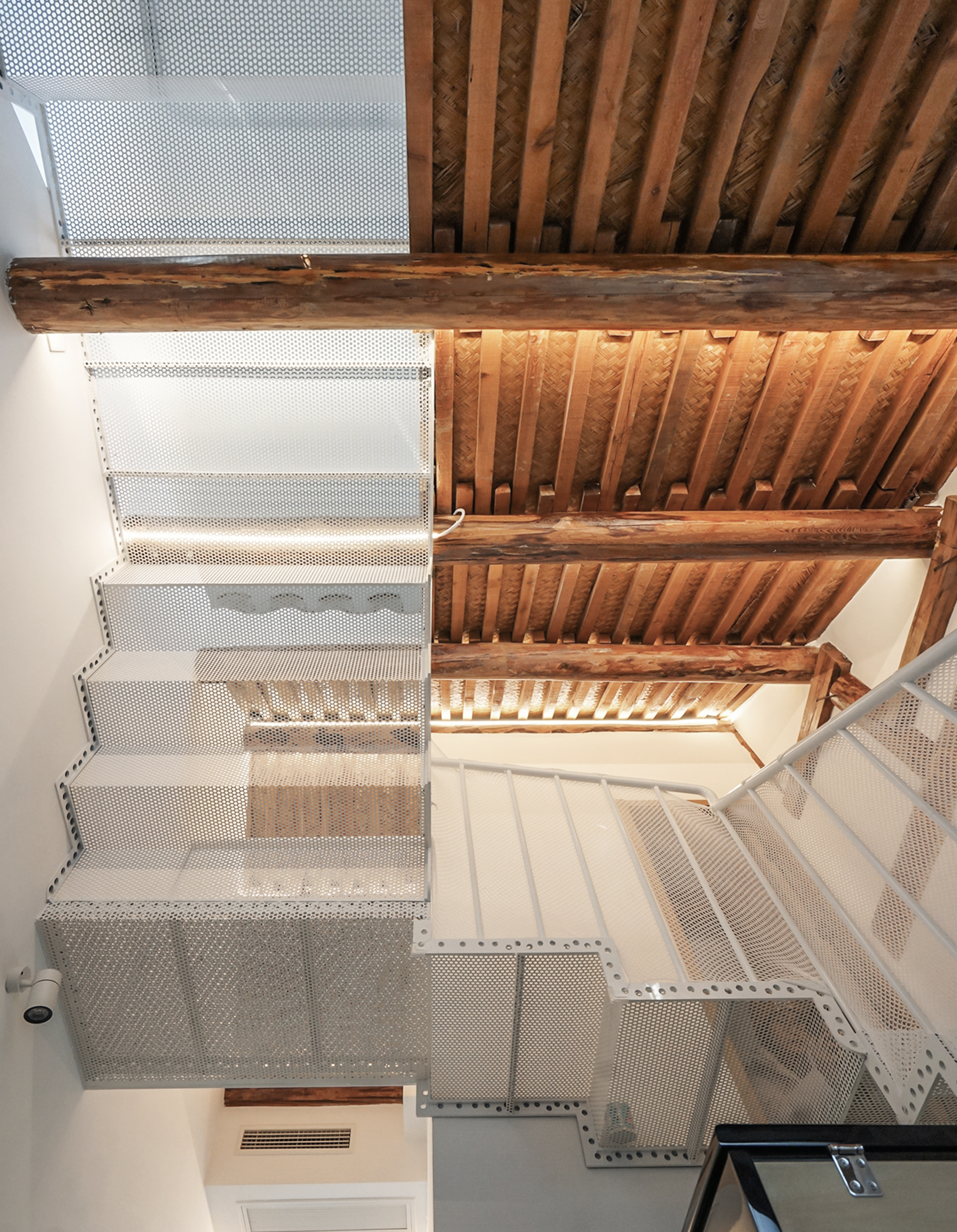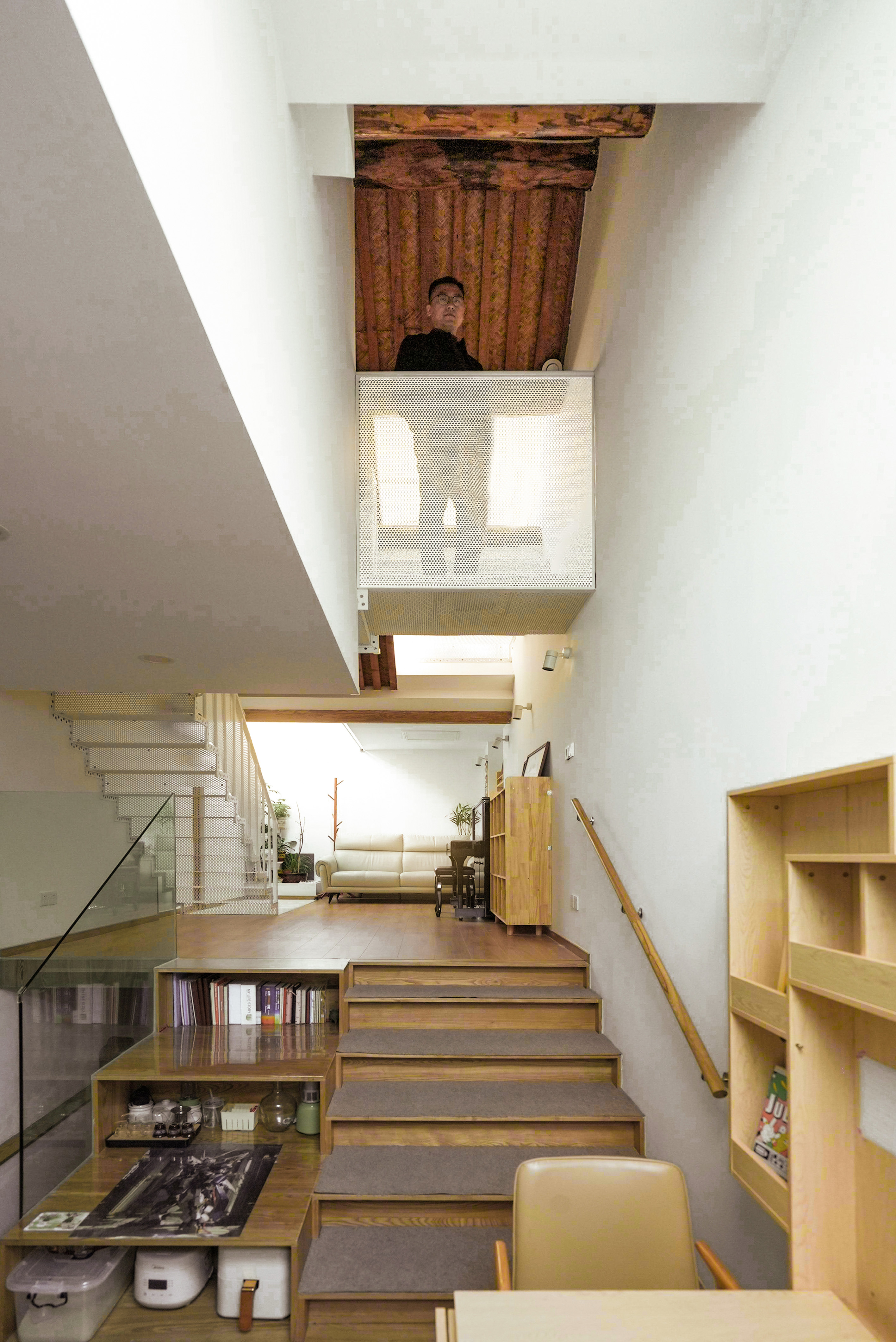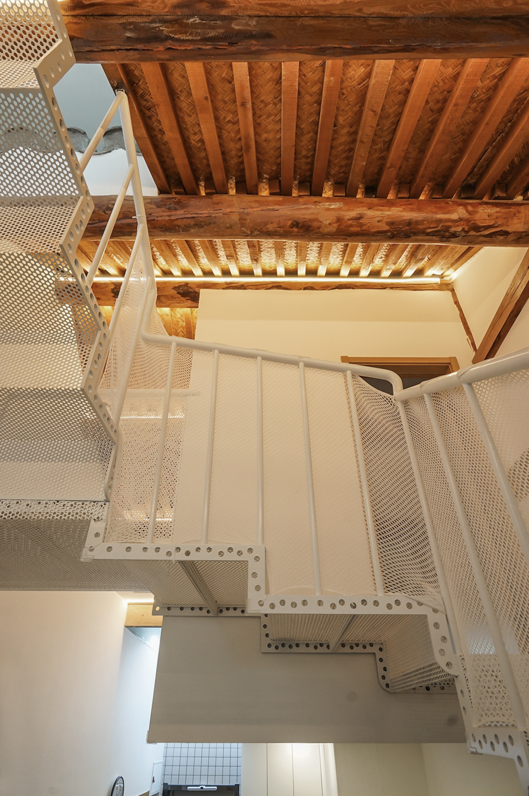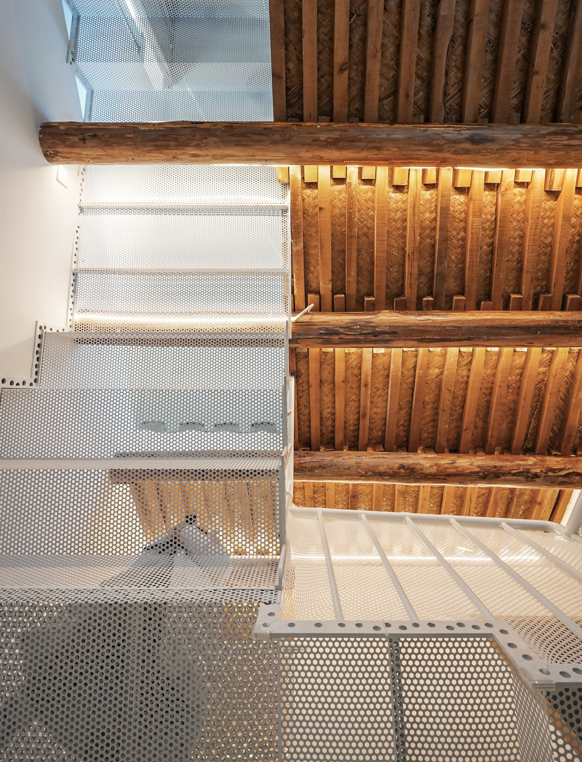 建筑的整个面宽完整的给了客厅空间,加上与玄关厨房的空间视线贯通,在客厅空间并不会感到压抑或是局促。楼梯采用穿孔板材质,以架空的形式存在于整个空间。 客厅的上空保留有原古建的屋顶与房梁,木建屋顶则只保留一半,另一半为穿孔板走道,减轻了木材的厚重感,增加了透气感,也间接增高了客厅层高的空间感知。