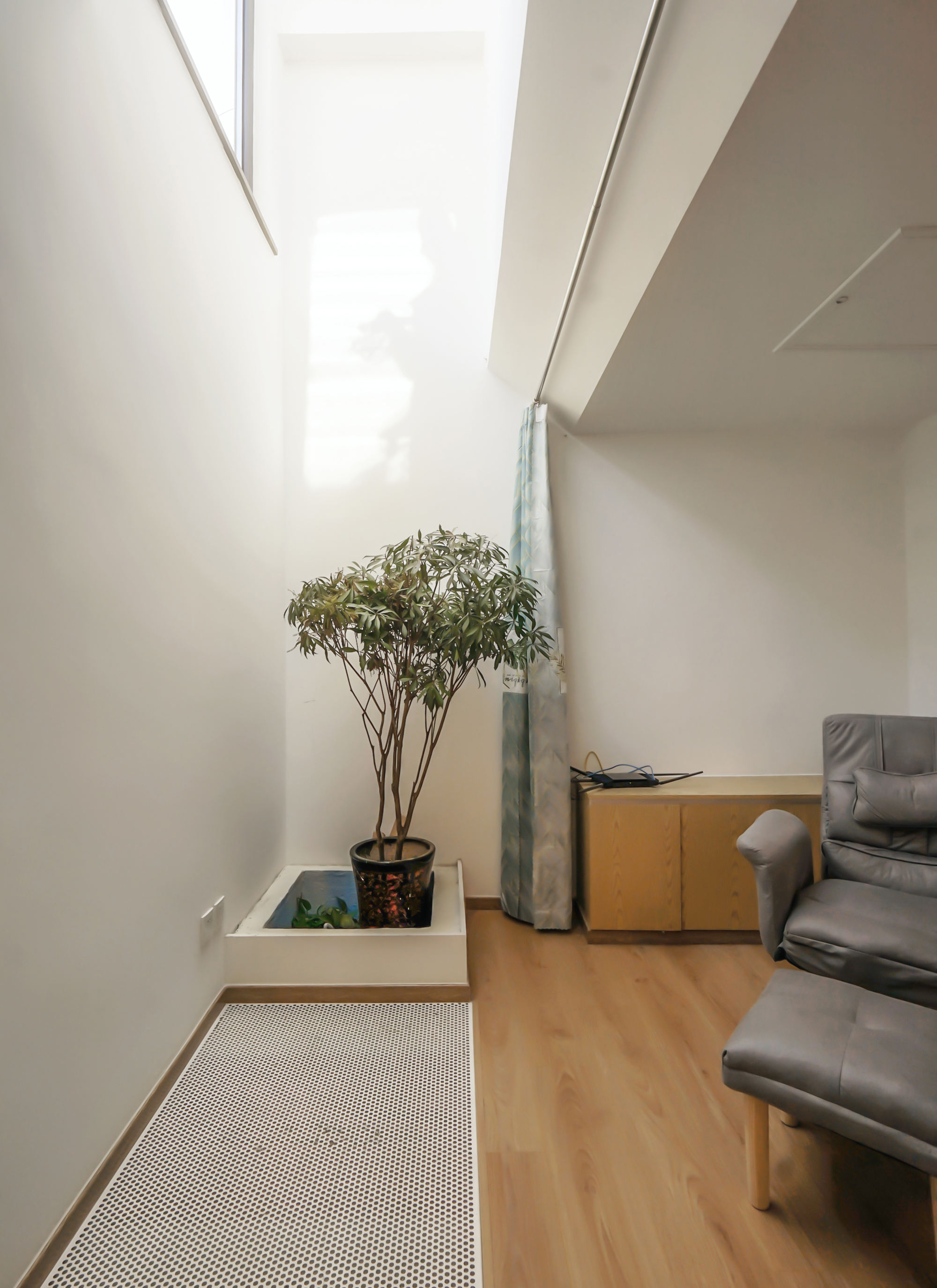 设计利用原有地基下沉空间,形成半下沉式的卧室和卫生间。此举不仅增加了空间,其厚重的热质效应还有助于保持室内气候稳定。部分走廊和卫生间的顶板用穿孔板代替,这样不仅增加了空气对流也为半地下的空间引入了自然光线。