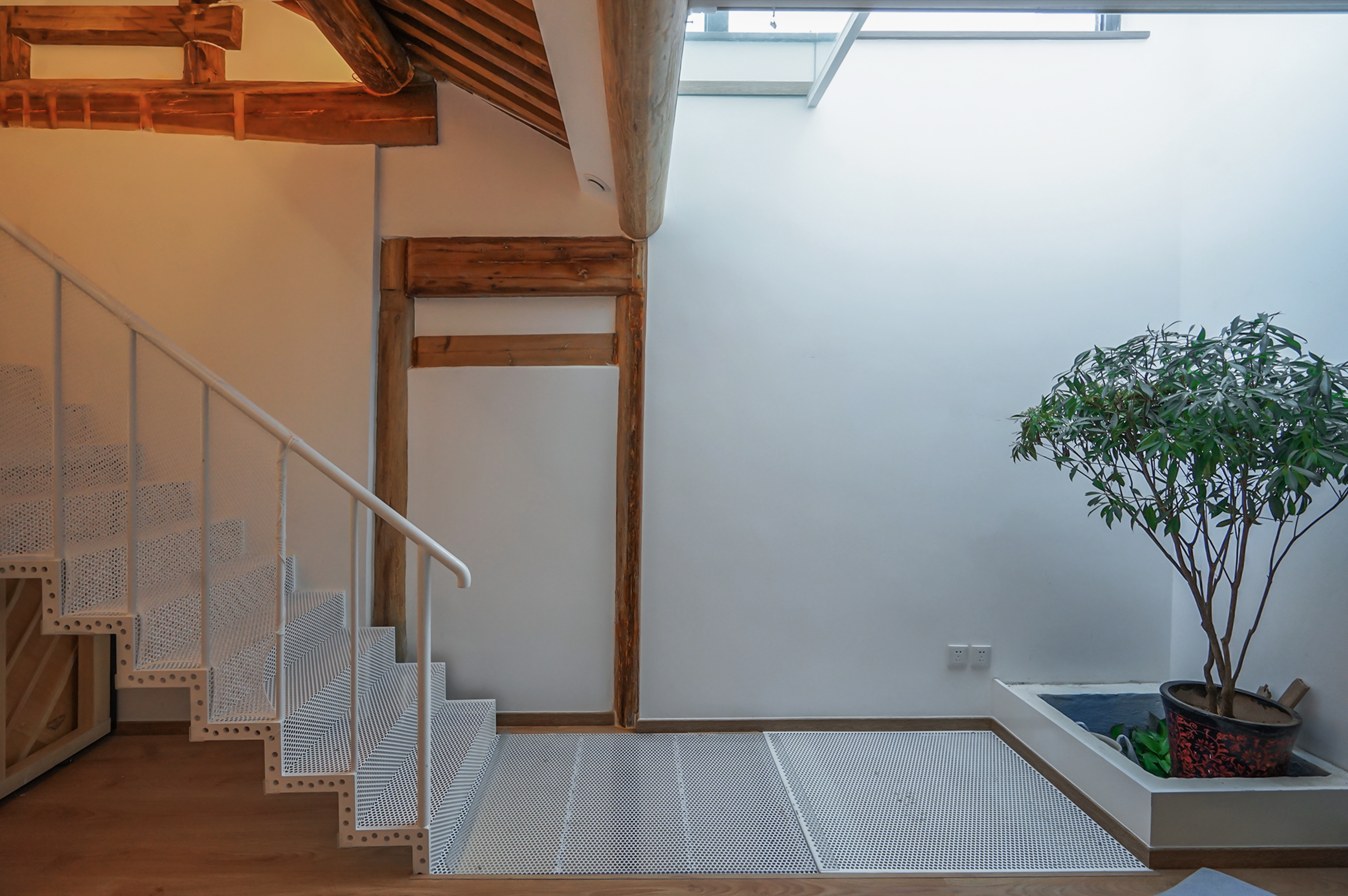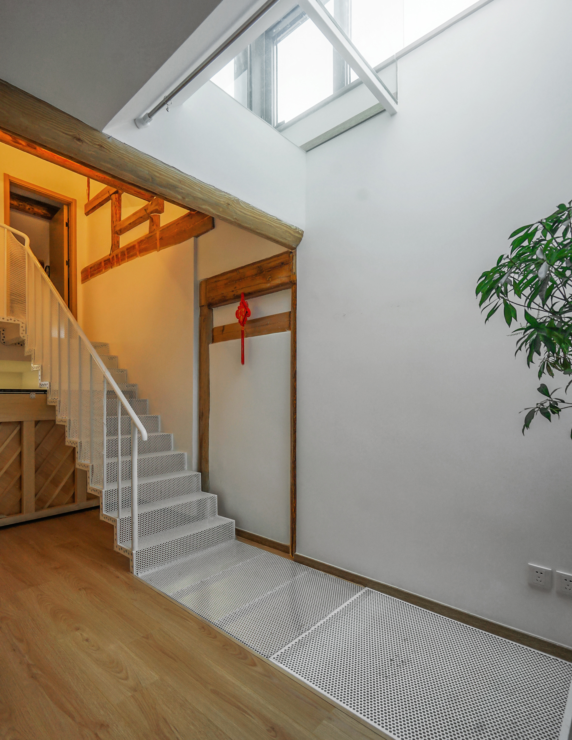 空间意境:建筑的整个面宽完整的给了客厅空间,加上与玄关厨房的空间视线贯通,在客厅空间并不会感到压抑或是局促。楼梯采用穿孔板材质,以架空的形式存在于整个空间。 客厅的上空保留有原古建的屋顶与房梁,木建屋顶则只保留一半,另一半为穿孔板走道,减轻了木材的厚重感,增加了透气感,也间接增高了客厅层高的空间感知。再与另外一开间的隔墙一侧,设计保留了原建筑的木质结构。由于抬高了原有标高的原因, 客厅空间与原有的木梁椽子这些传统木构架更近了,甚至顺着楼梯向上走可以清晰的观看与抚摸这些具有年代感的建筑体量。 整个建筑变成了触摸式的古建博物馆,我甚至有点羡慕能在这里长大的小朋友。现在出生的小朋友,都是在钢筋混凝土的盒子里长大,居住空间被各种工业体系定义成了各种风格,陪在他们左右的装饰的材料也是像瓷砖,墙板这种无机的工业制成品。在我看来,它们都少了点温度,看似定制化很高的居住体验但却和自然切断了联系。
