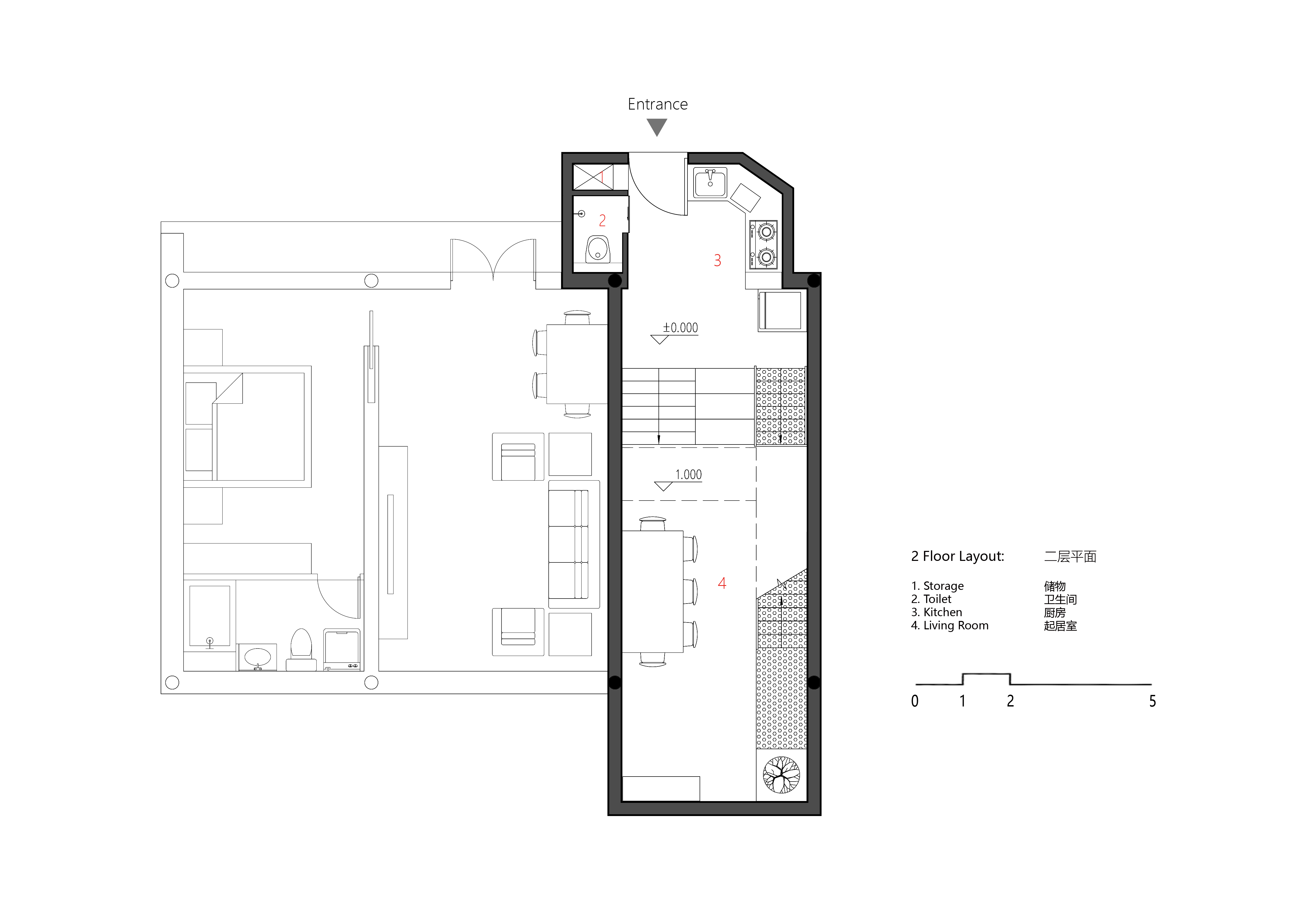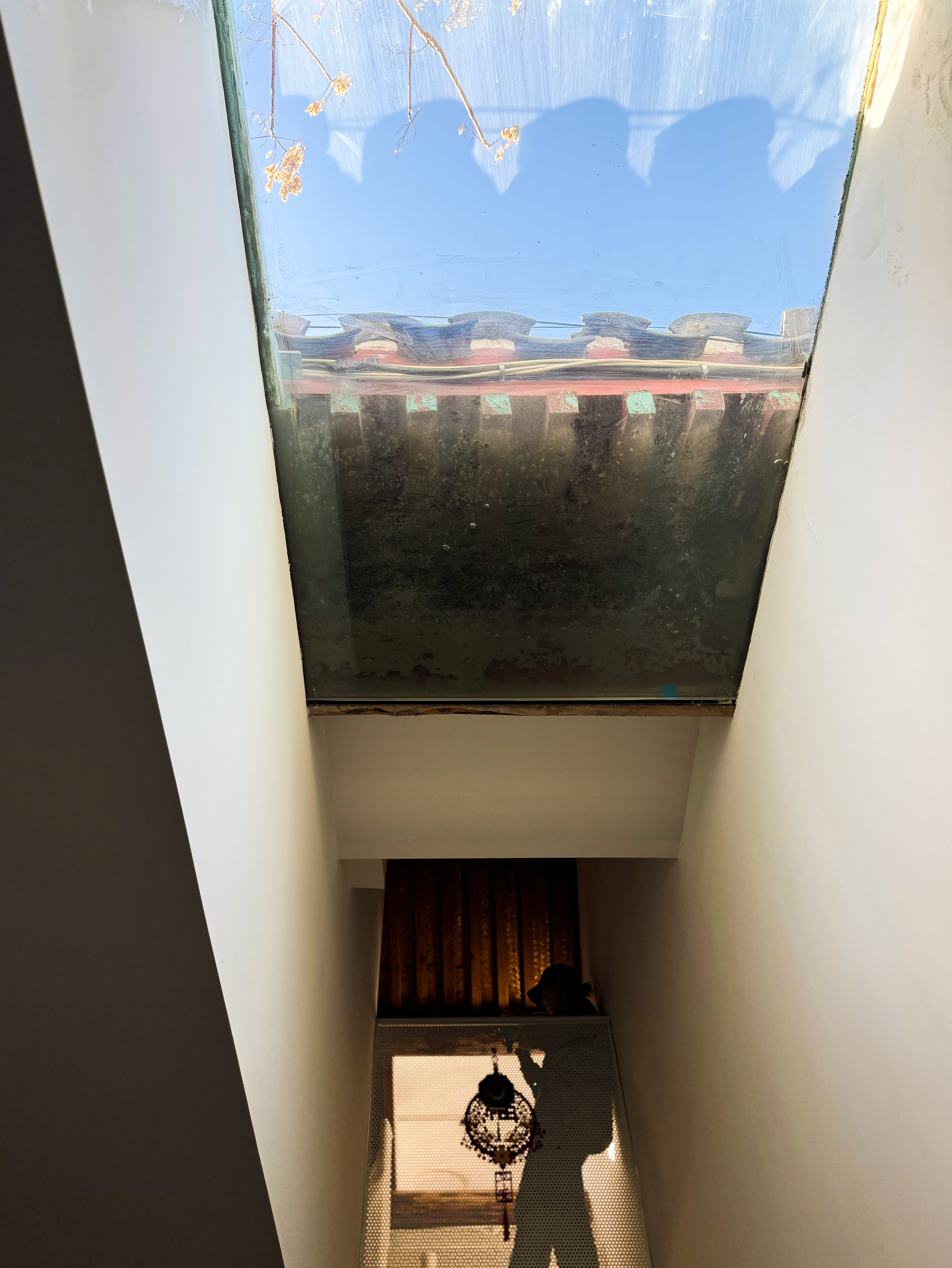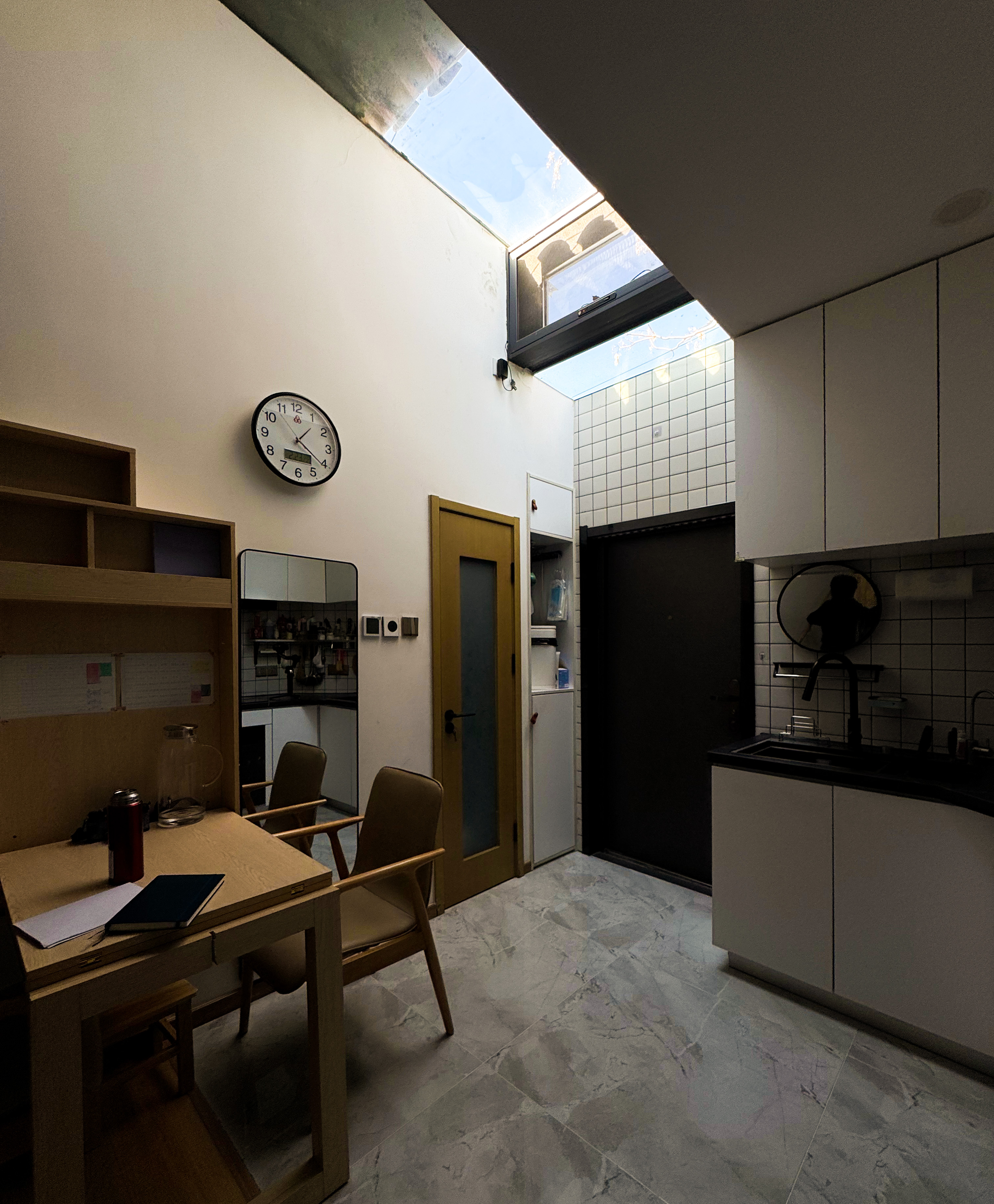 推开大门,刚进入一间宅,入口玄关与厨房结合形成复合空间。基于两者使用时段的不重合性,此设计通过时空维度叠加实现了空间高效利用。此处保留了八十年代加建痕迹,破除原有彩钢屋顶,从而可以完整清晰的看清原有四合院建筑的屋檐和瓦当。形成的天窗和高窗连城一体,同时引入自然光线和通风 。