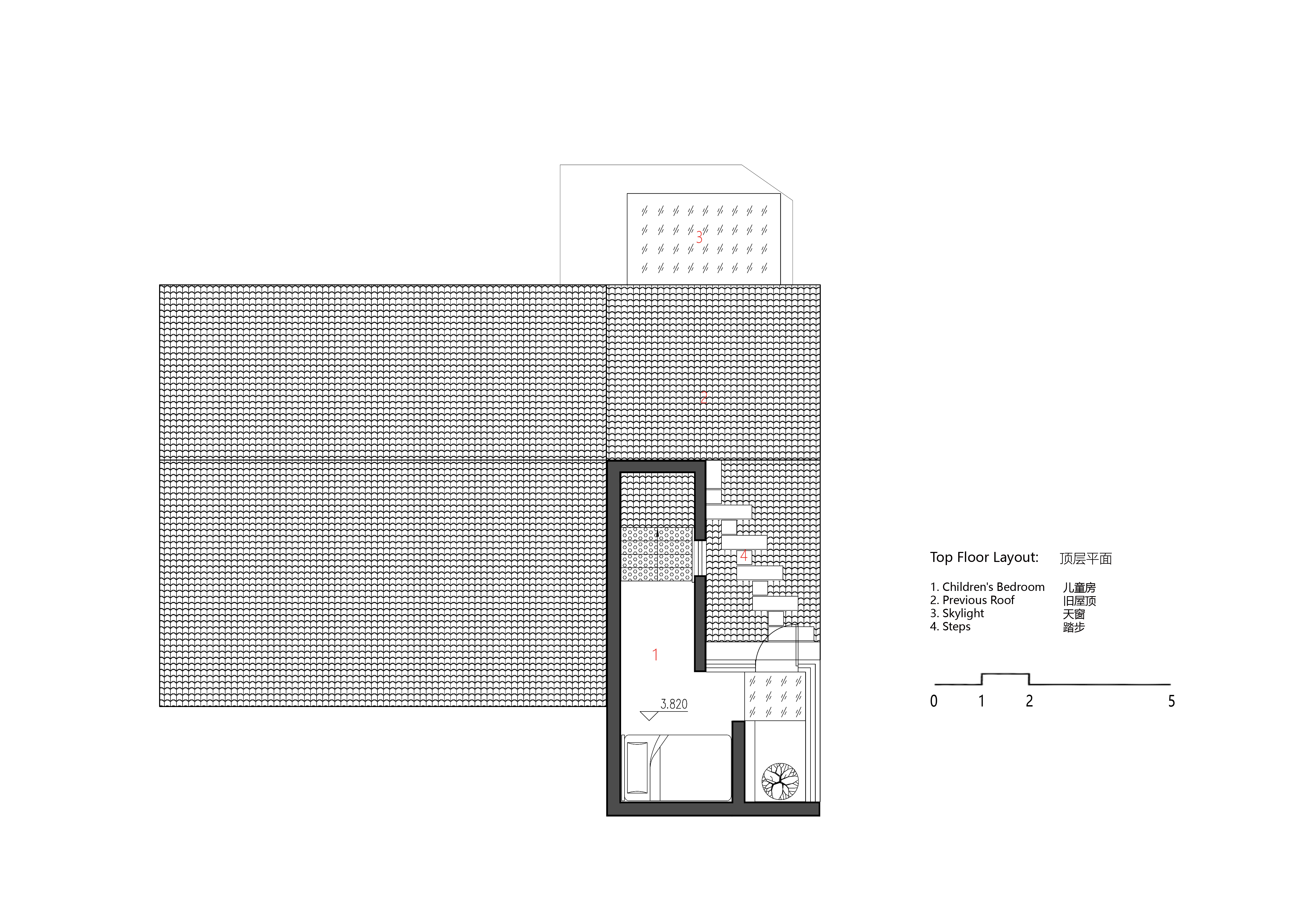 设计选材:漂浮的楼梯并没有停滞在夹层的房间,而是继续盘旋上升,从两根梁直接的空间穿过冲破了原有的建筑的椽子和望板,到了建筑的青瓦屋面,与一个轻质增建部分结合,在原始屋顶之上形成了一个新的卧室。小儿子的卧室是真正意义上的坐落在瓦端之上的,设计甚至把一部分室外的屋顶封进了室内。 这个“破顶而出”的房间极大地激发了孩子们的想象力。北京有句老话,叫“三天不打,上房揭瓦”,这种状态反而就是小朋友的天性,不愿意在一个小小的封闭的空间里生活,而是有一种原始的冲动,希望去冲破这个空间。让他们在“上房”的过程中,去获得和寻找自己对天空、对室外、对自然的向往。